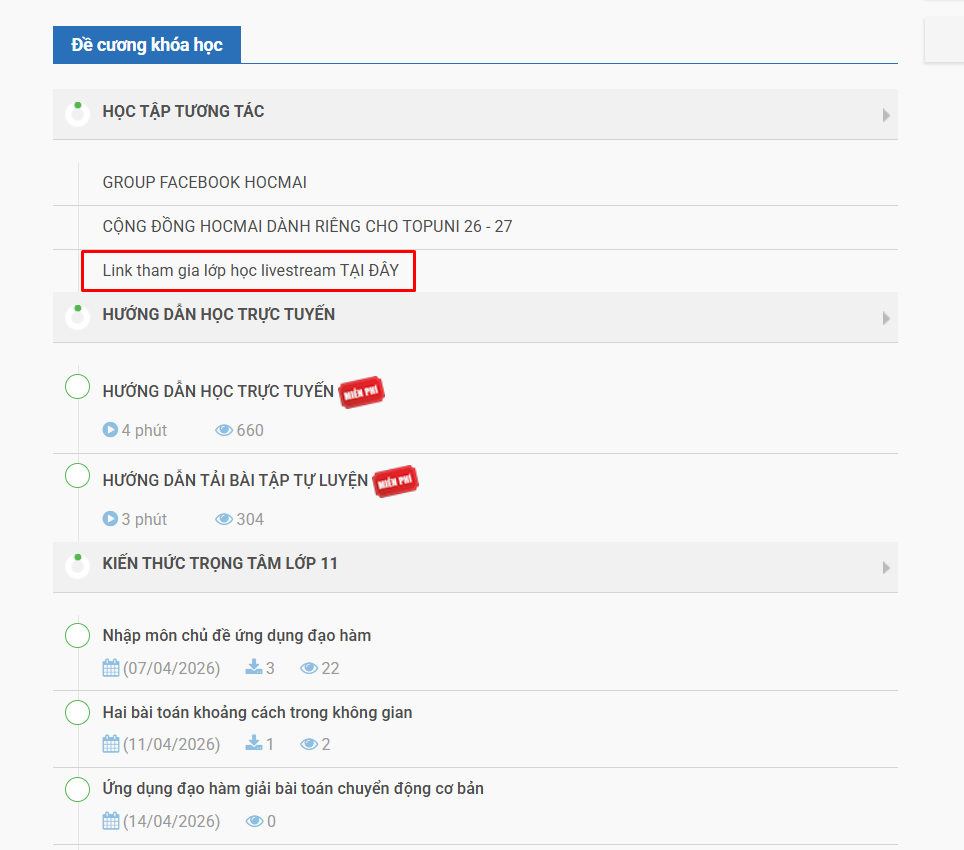 - Nếu bạn không tham gia được buổi học Livestream, hay xem lại video ghi hình trên khóa học mình đã đăng kí sau khi tất cả các buổi live của nội dung đó đã kết thúc nhé