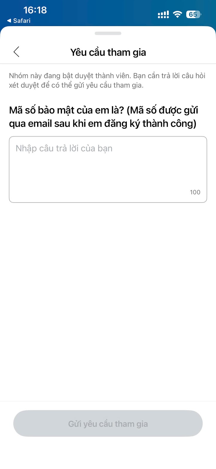 Click vào đường link tham gia nhóm lớp trên điện thoại để mở ứng dụng Zalo, copy mã bảo mật để trả lời câu hỏi bảo mật.