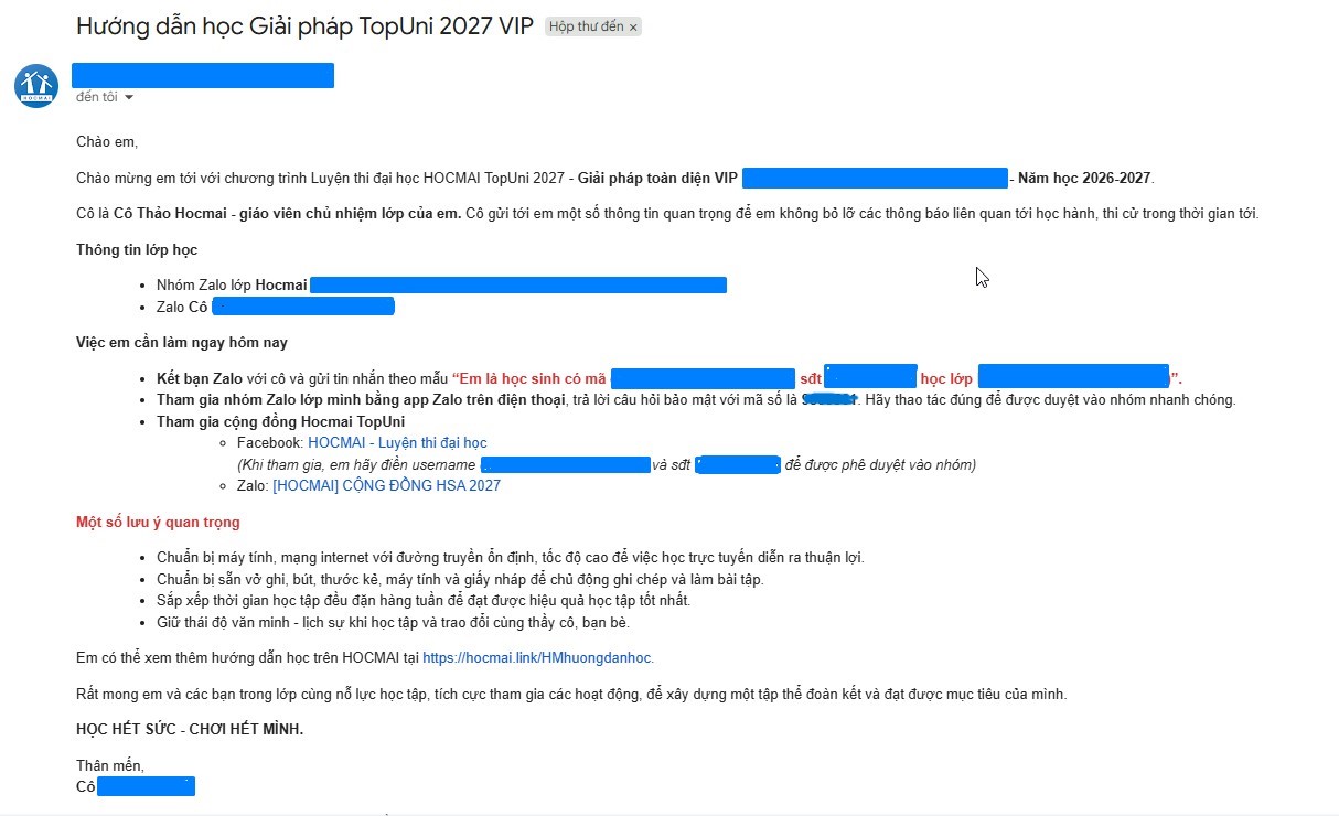 HOCMAI sẽ gửi email “Hướng dẫn học Giải pháp TopUni 2027 VIP” trong vòng 1 giờ ngay sau khi học sinh đăng ký, PH/HS cần đảm bảo cập nhật chính xác email tại tài khoản Hocmai.vn để đảm bảo nhận được thông báo mới nhất.
