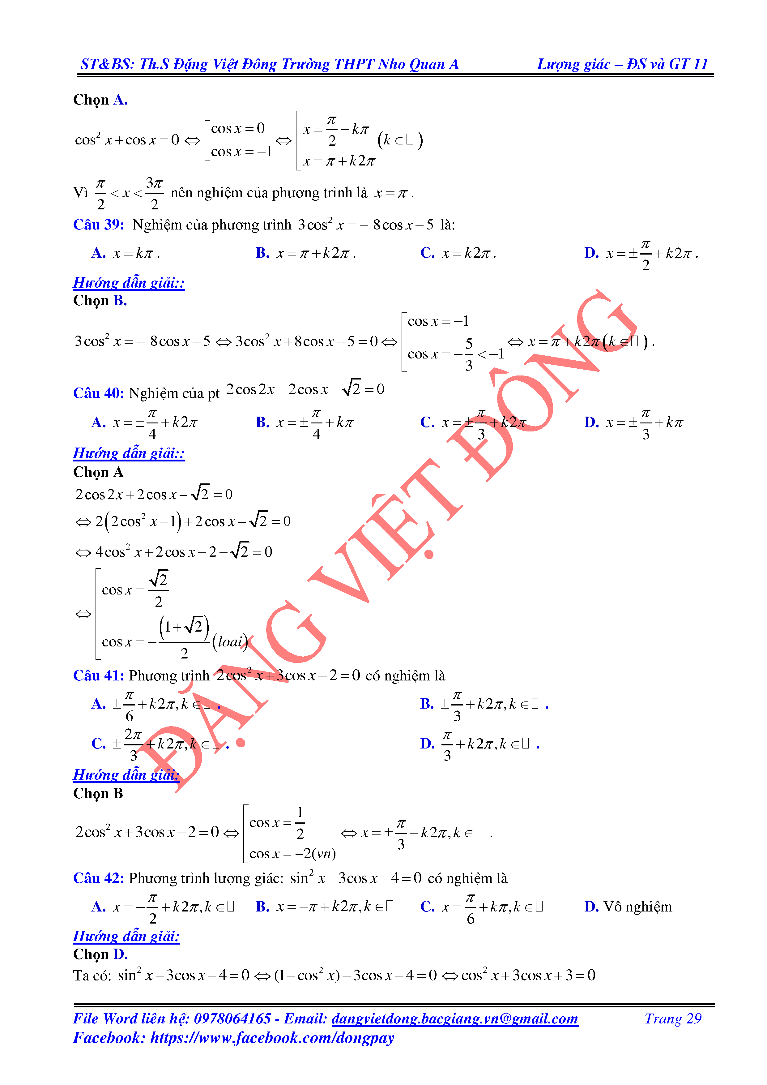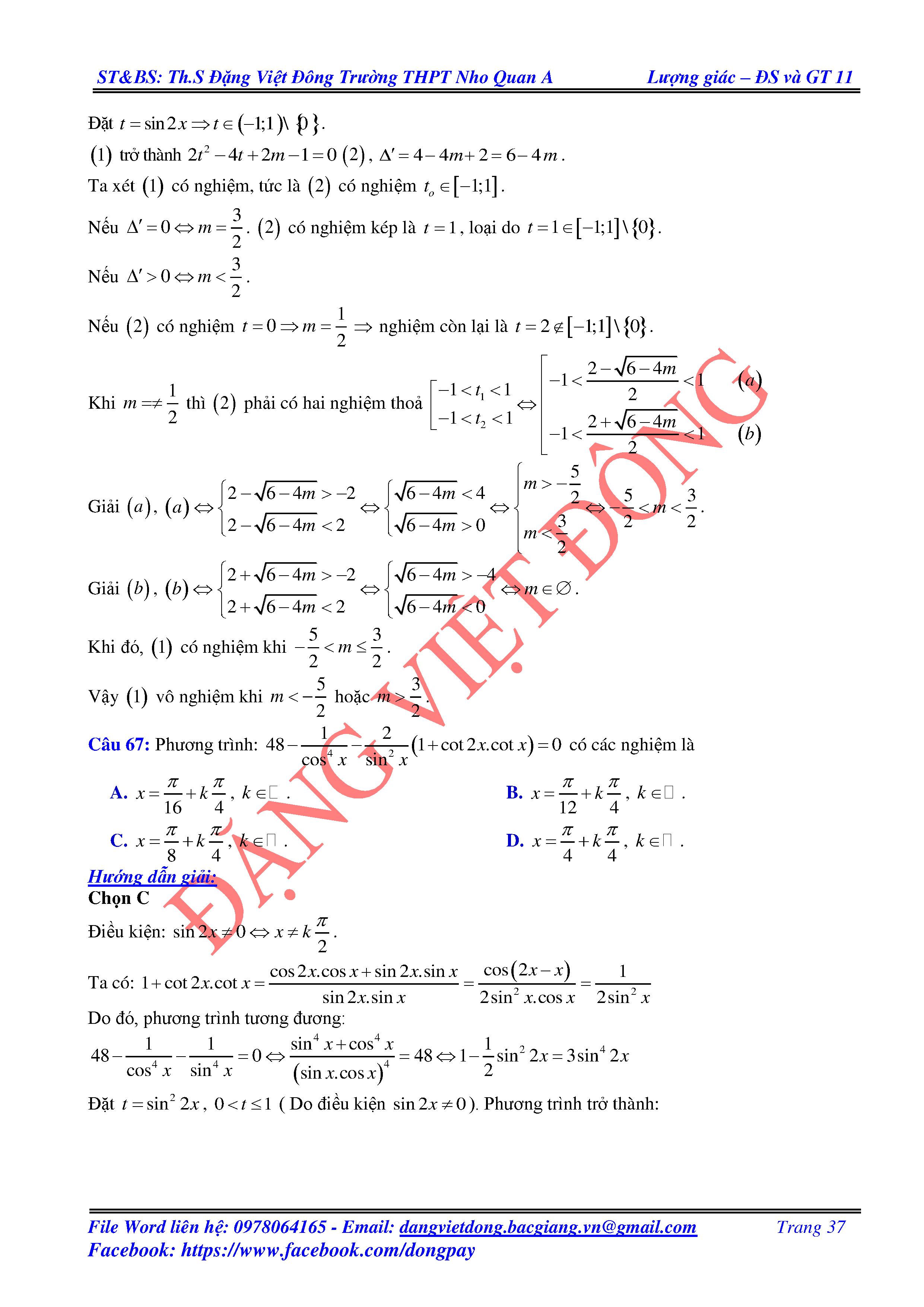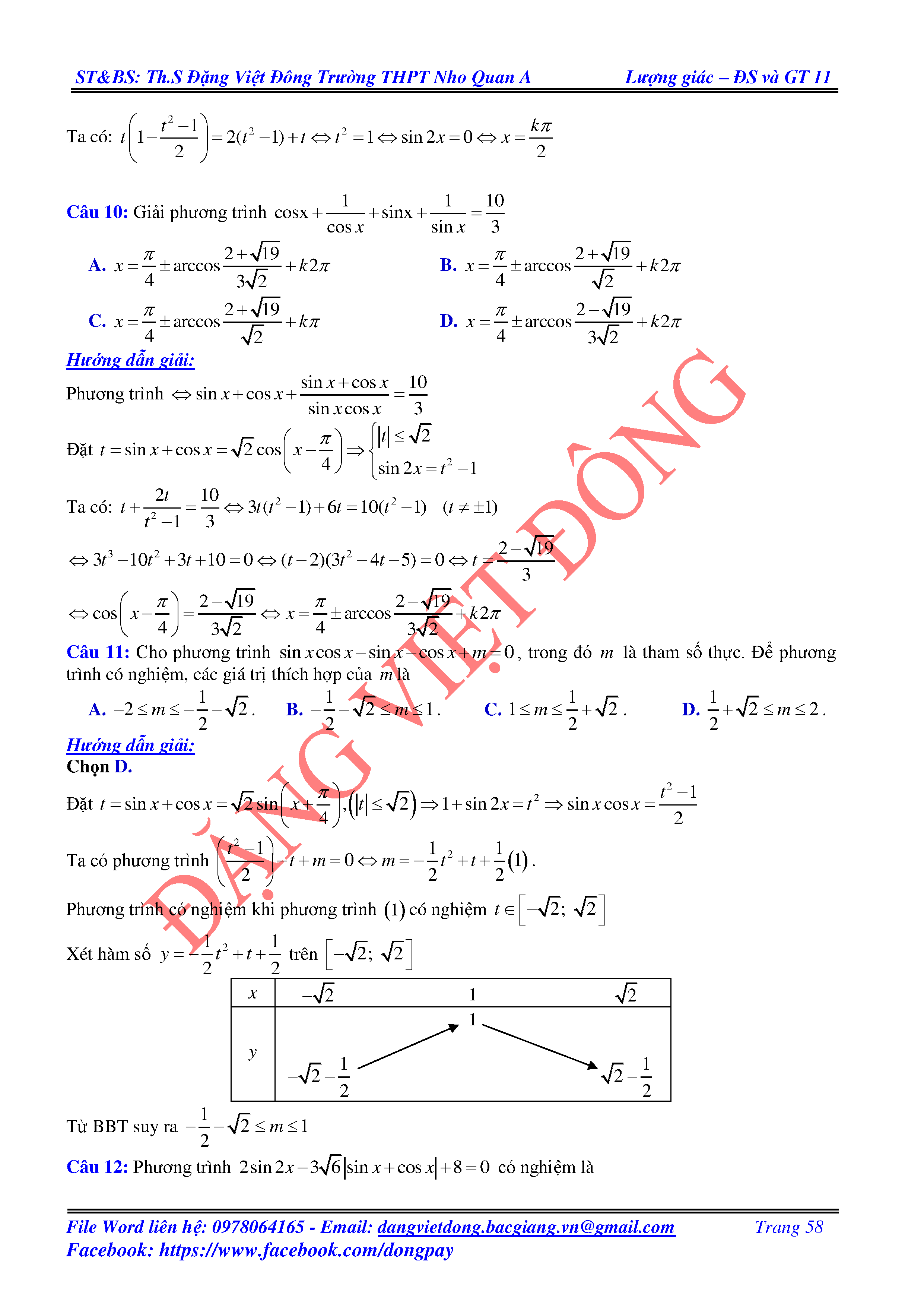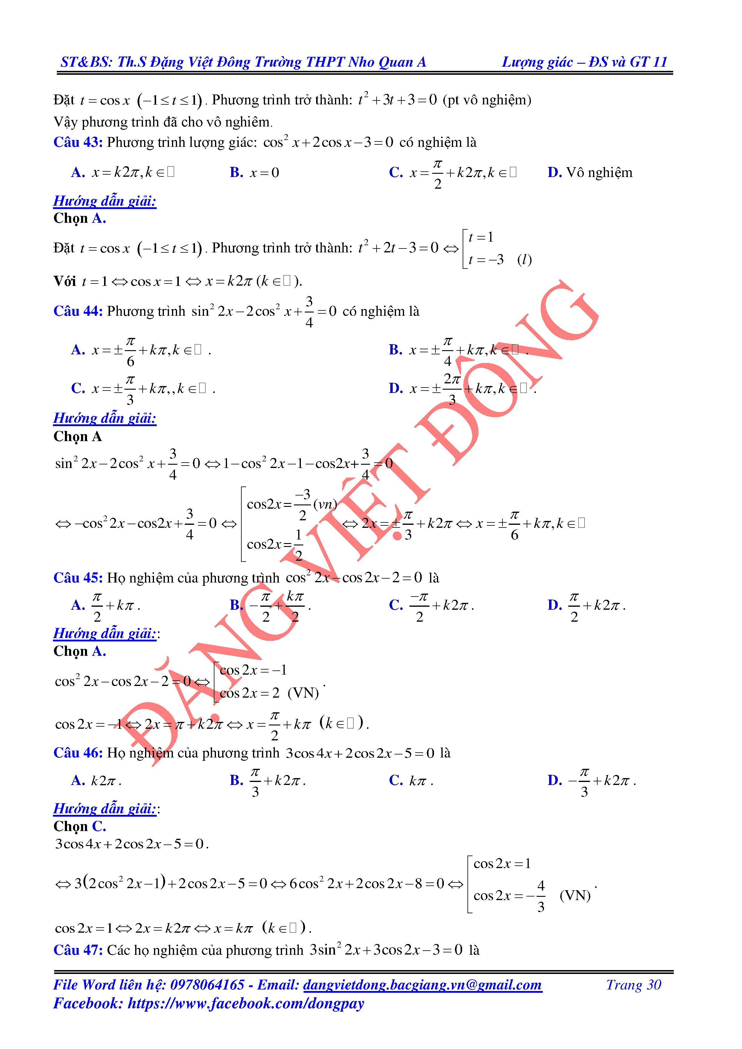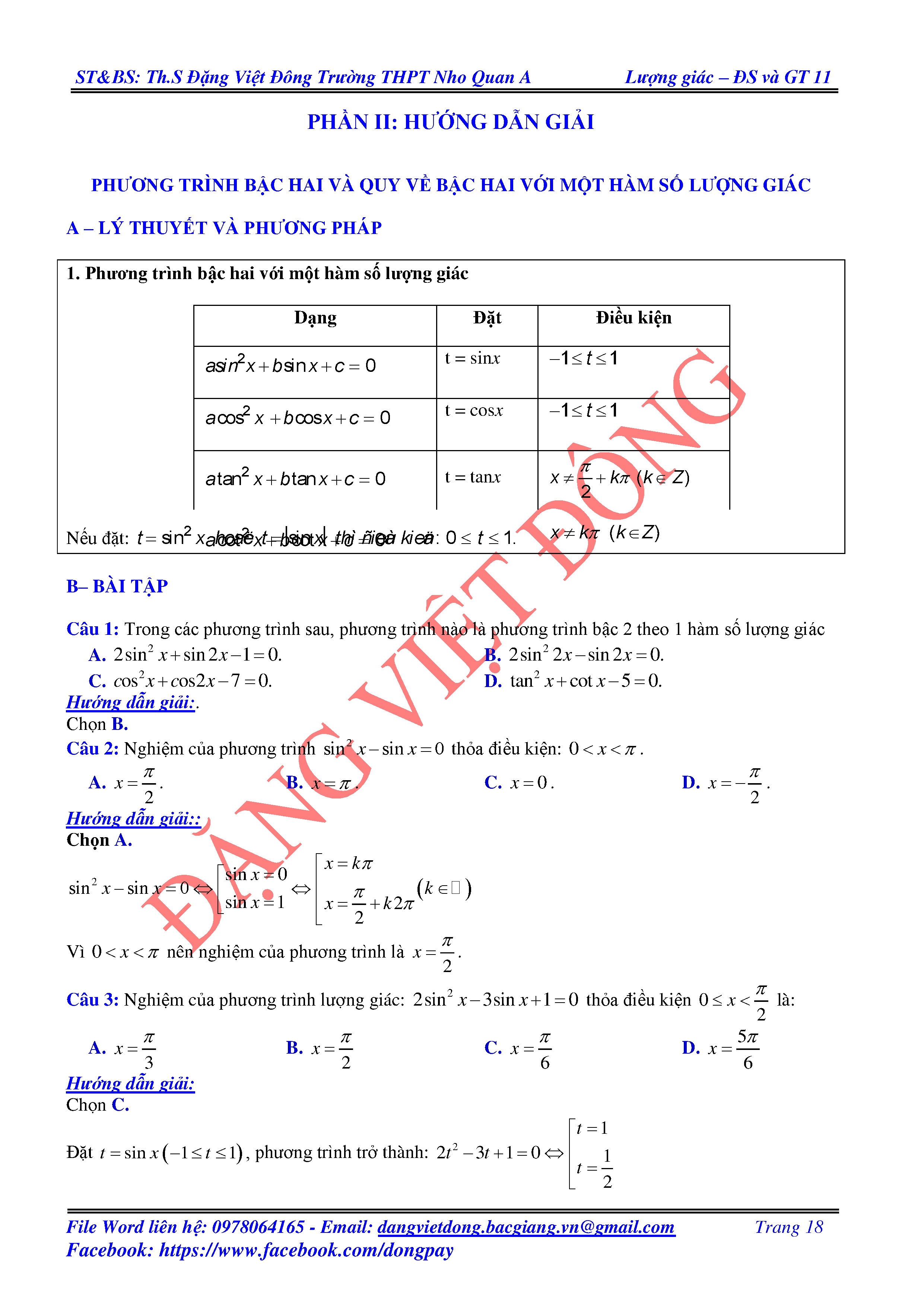 PHƯƠNG TRÌNH BẬC HAI VÀ QUY VỀ BẬC HAI VỚI MỘT HÀM SỐ LƯỢNG GIÁC - ĐẠI SỐ, GIẢI TÍCH 11