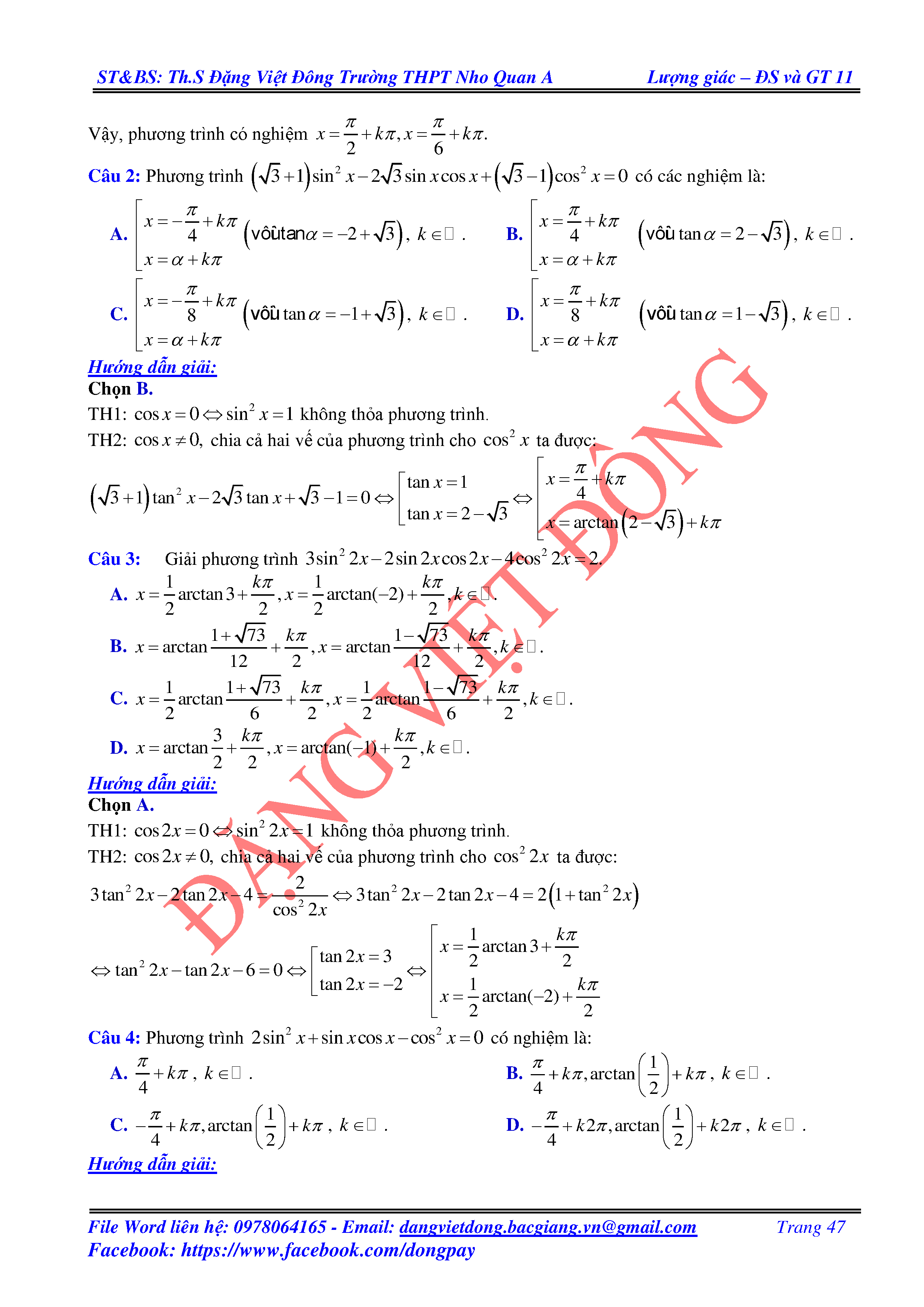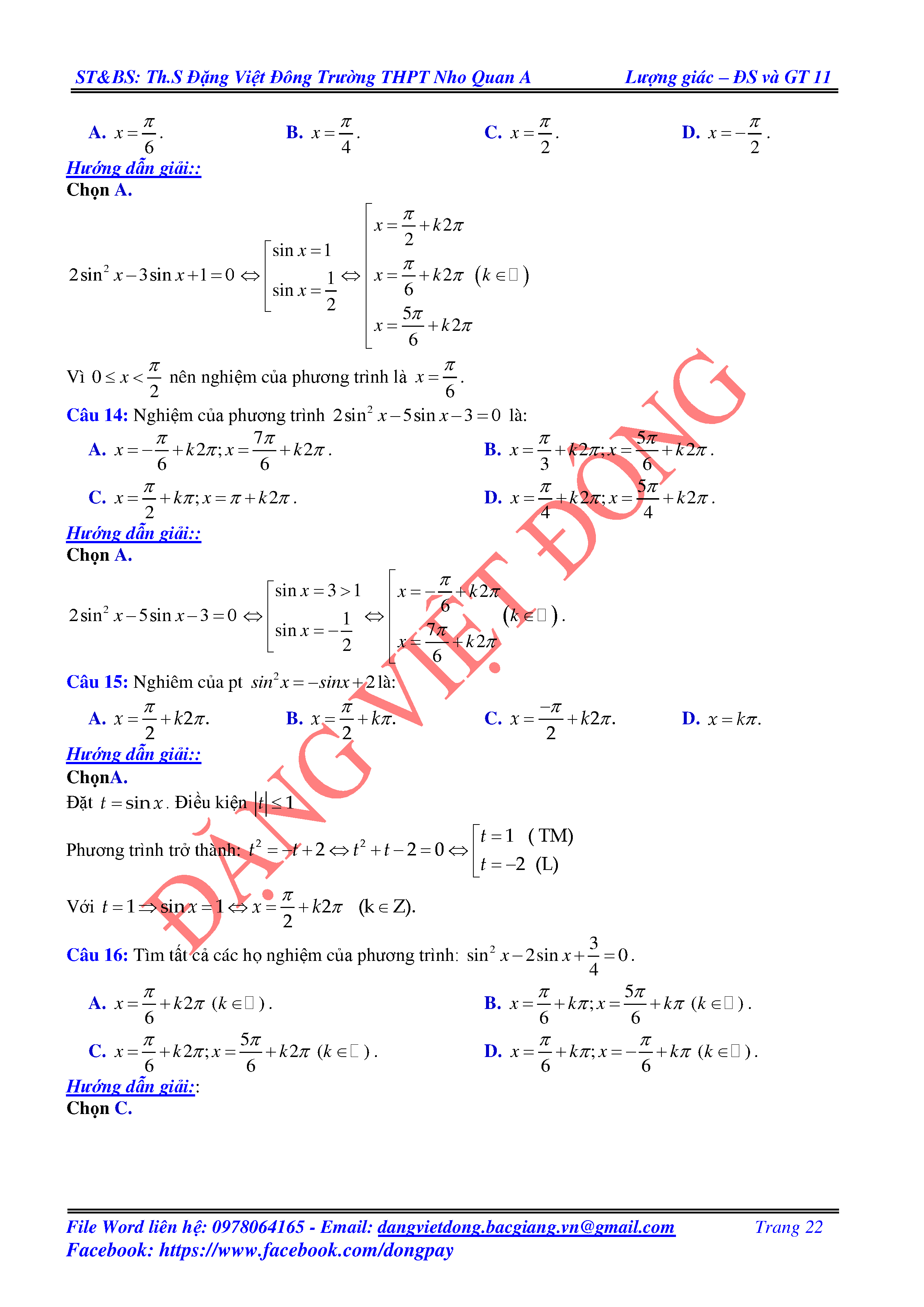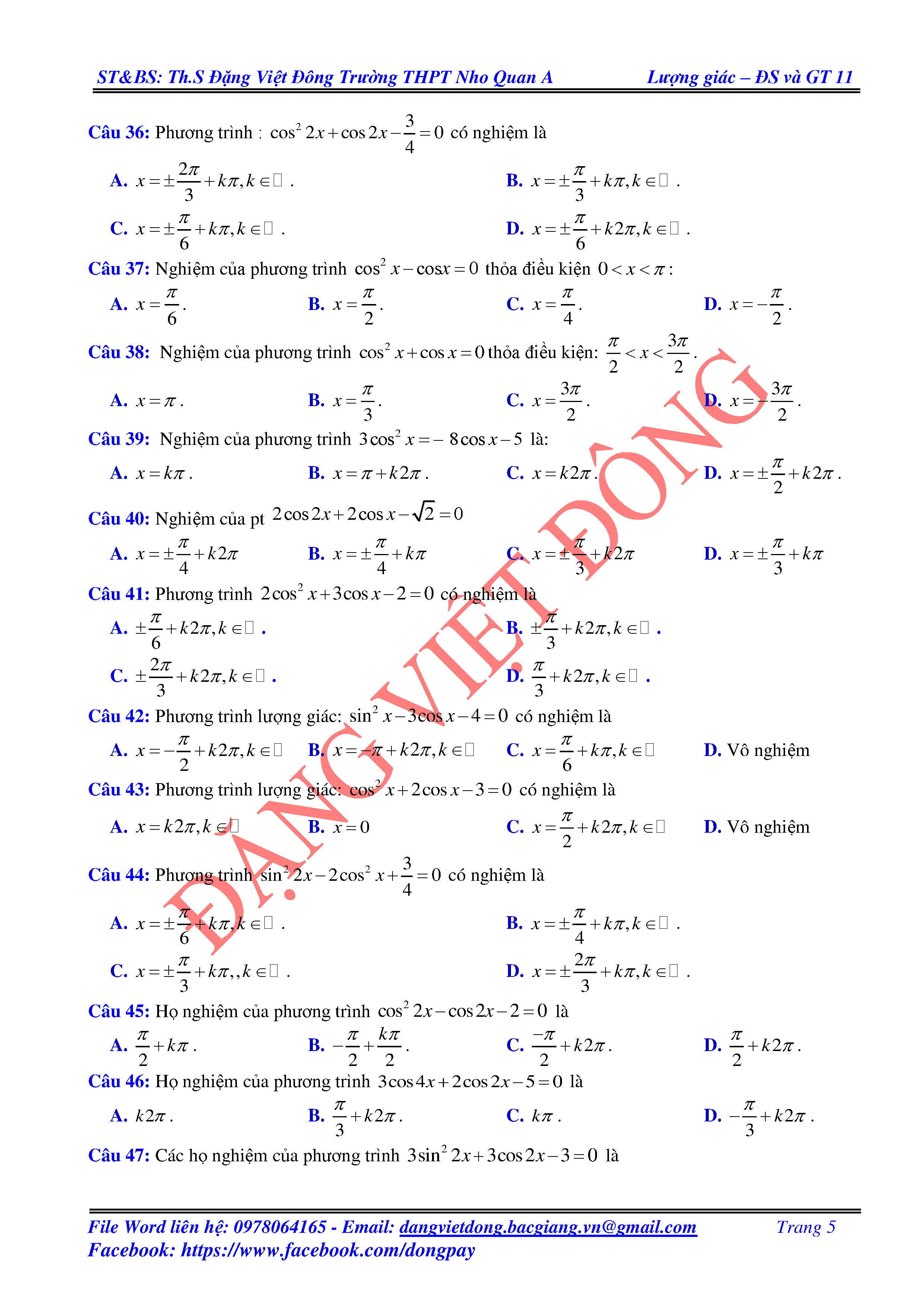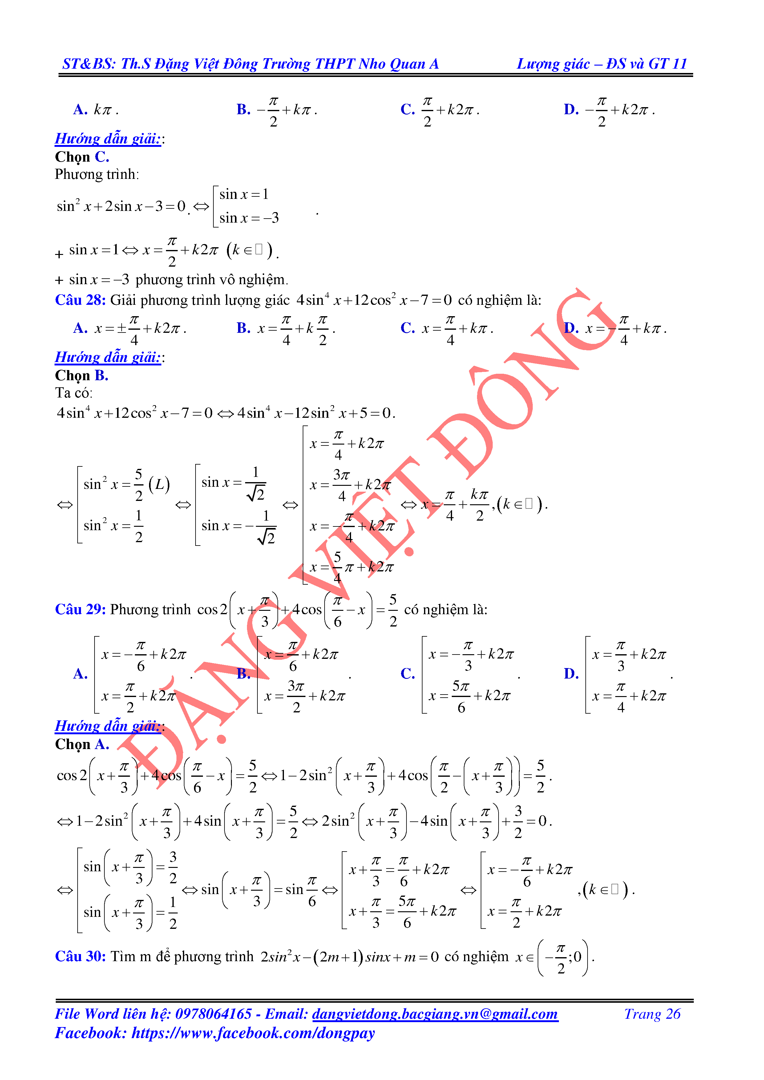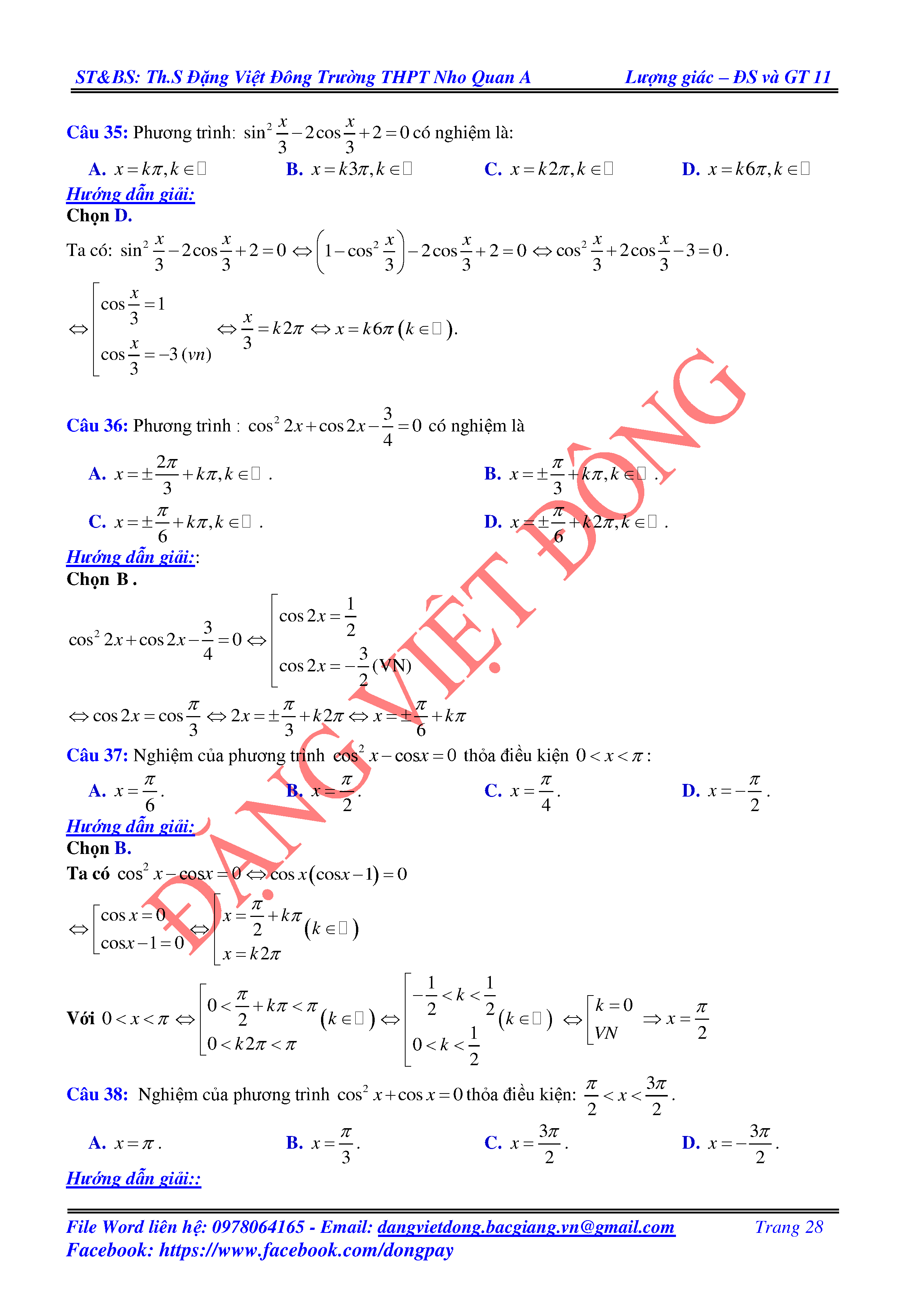 PHƯƠNG TRÌNH BẬC HAI VÀ QUY VỀ BẬC HAI VỚI MỘT HÀM SỐ LƯỢNG GIÁC - ĐẠI SỐ, GIẢI TÍCH 11