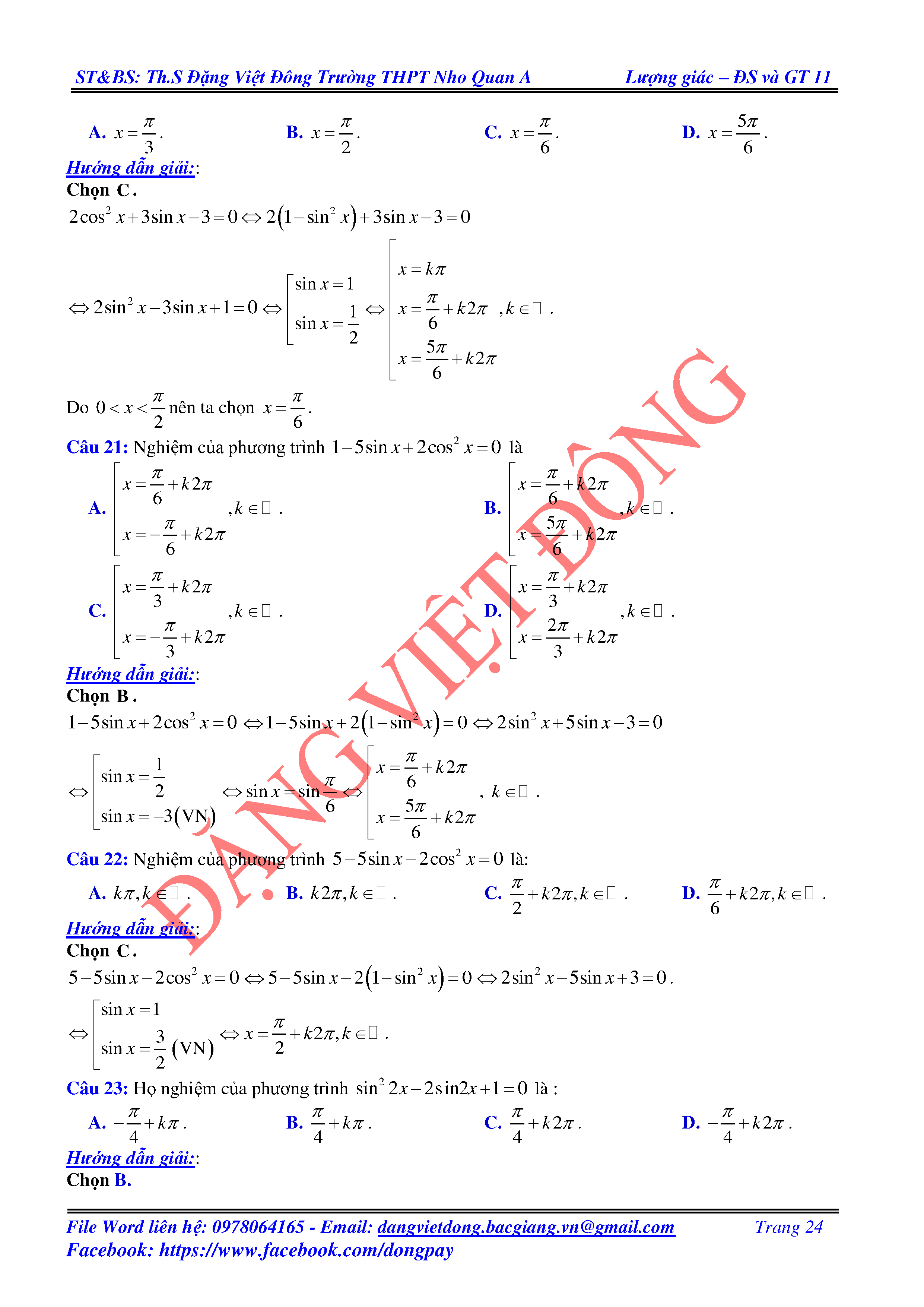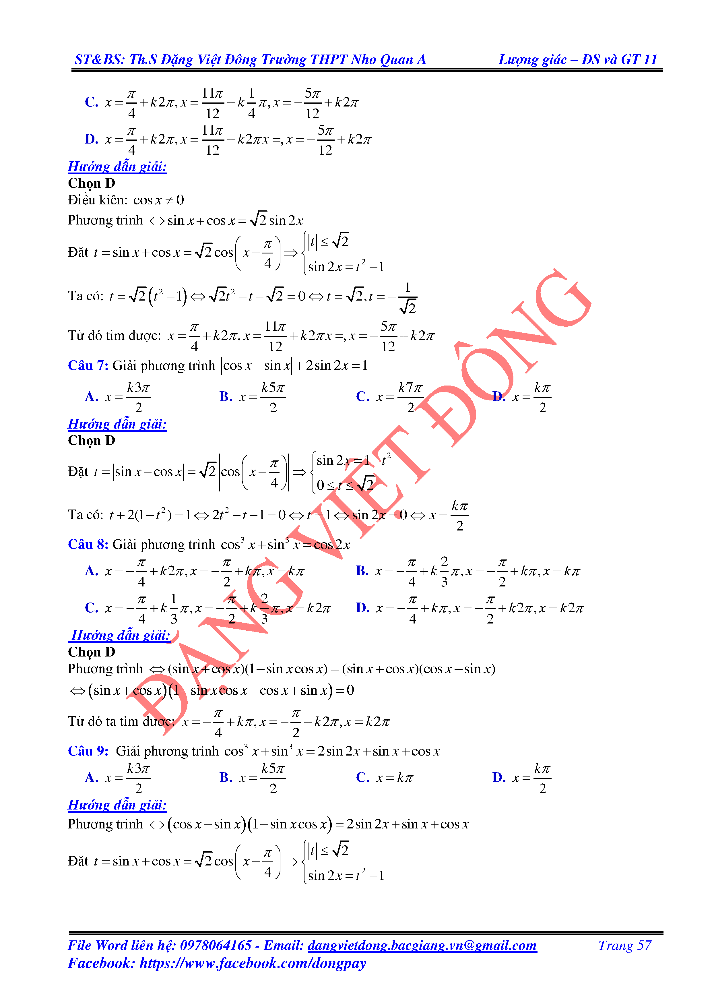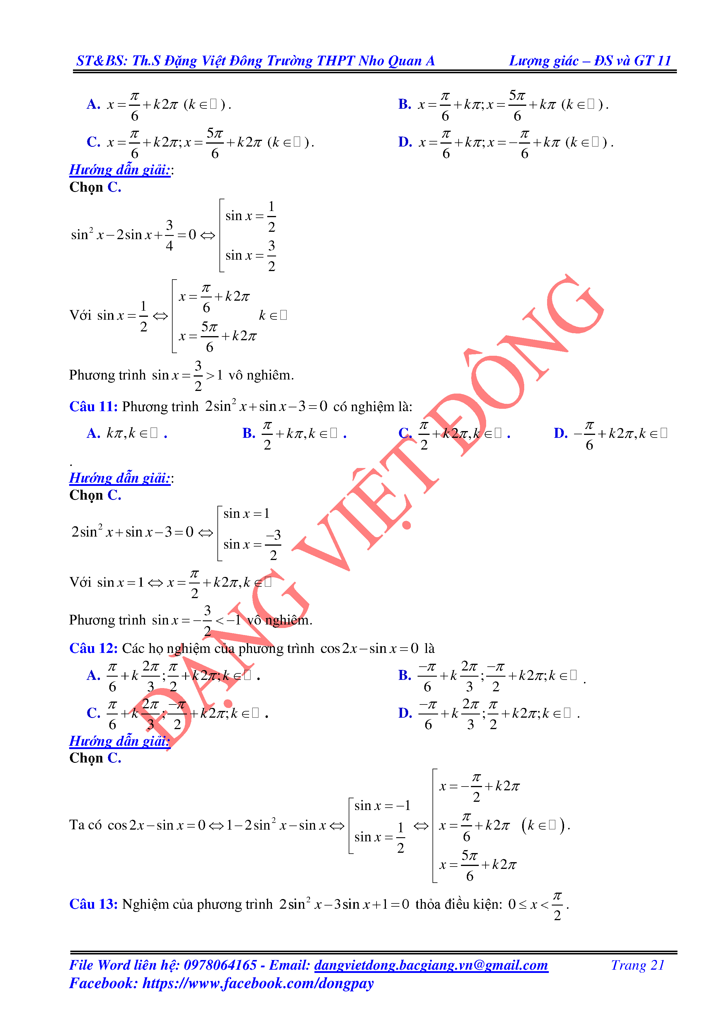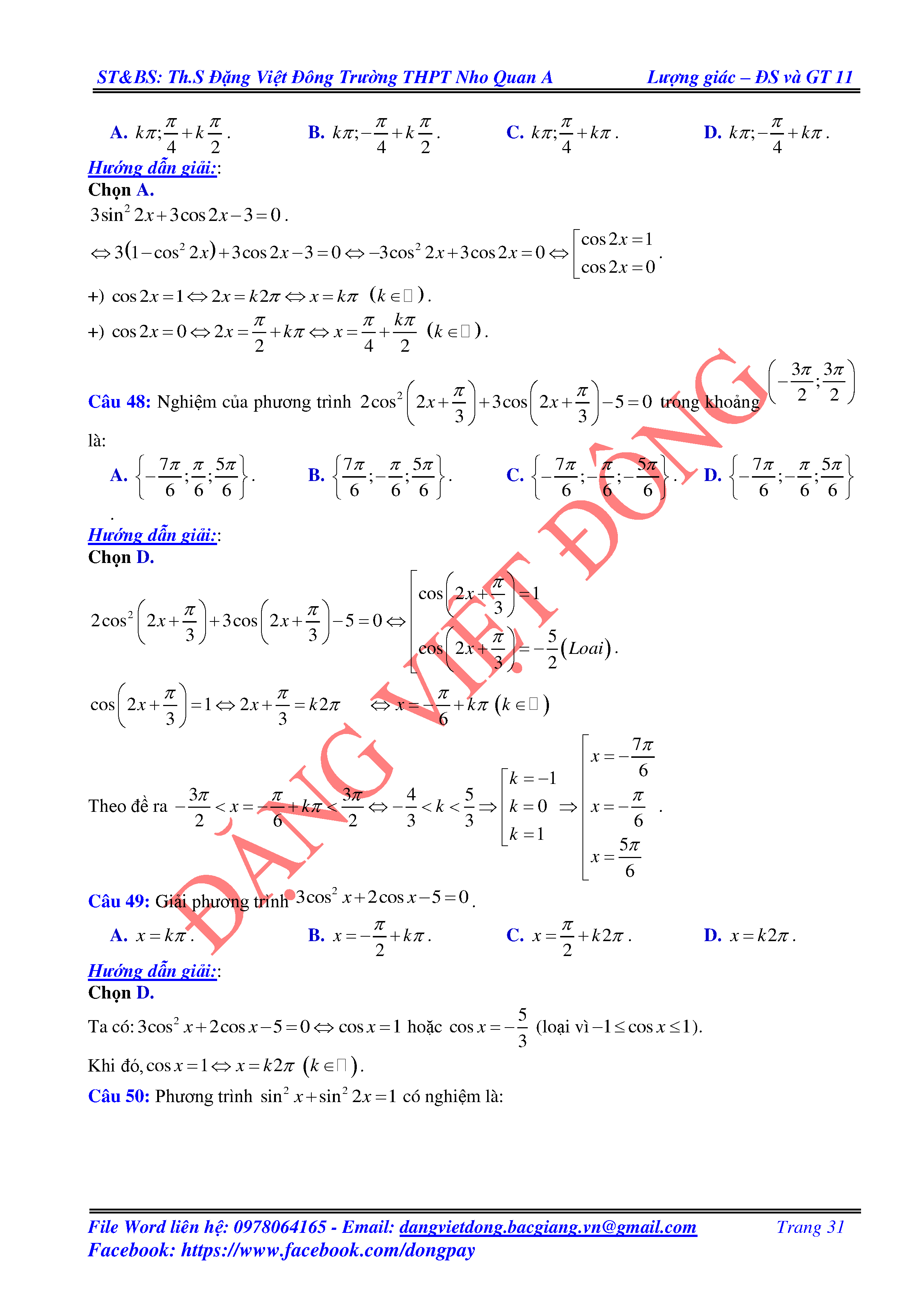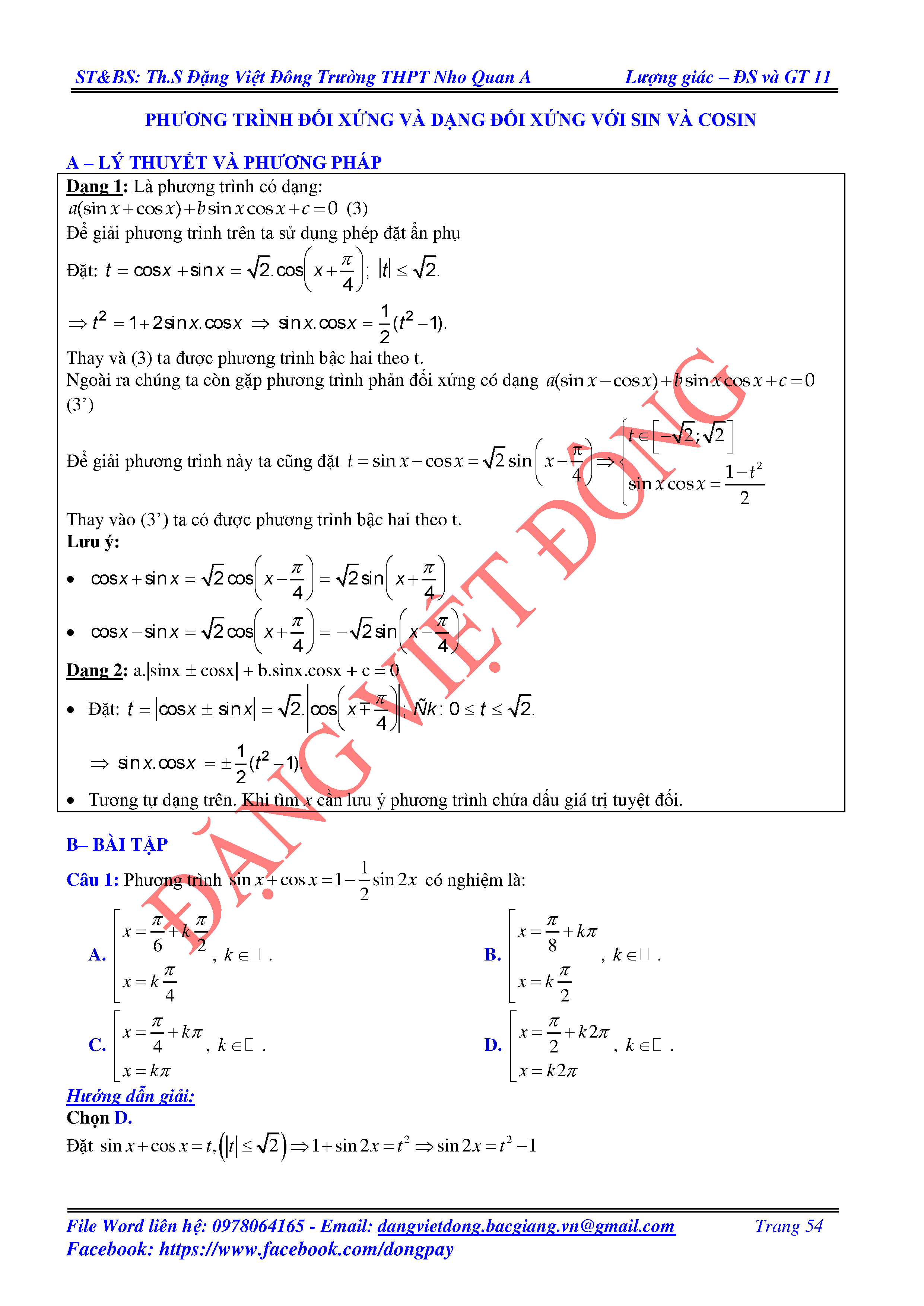 PHƯƠNG TRÌNH BẬC HAI VÀ QUY VỀ BẬC HAI VỚI MỘT HÀM SỐ LƯỢNG GIÁC - ĐẠI SỐ, GIẢI TÍCH 11
