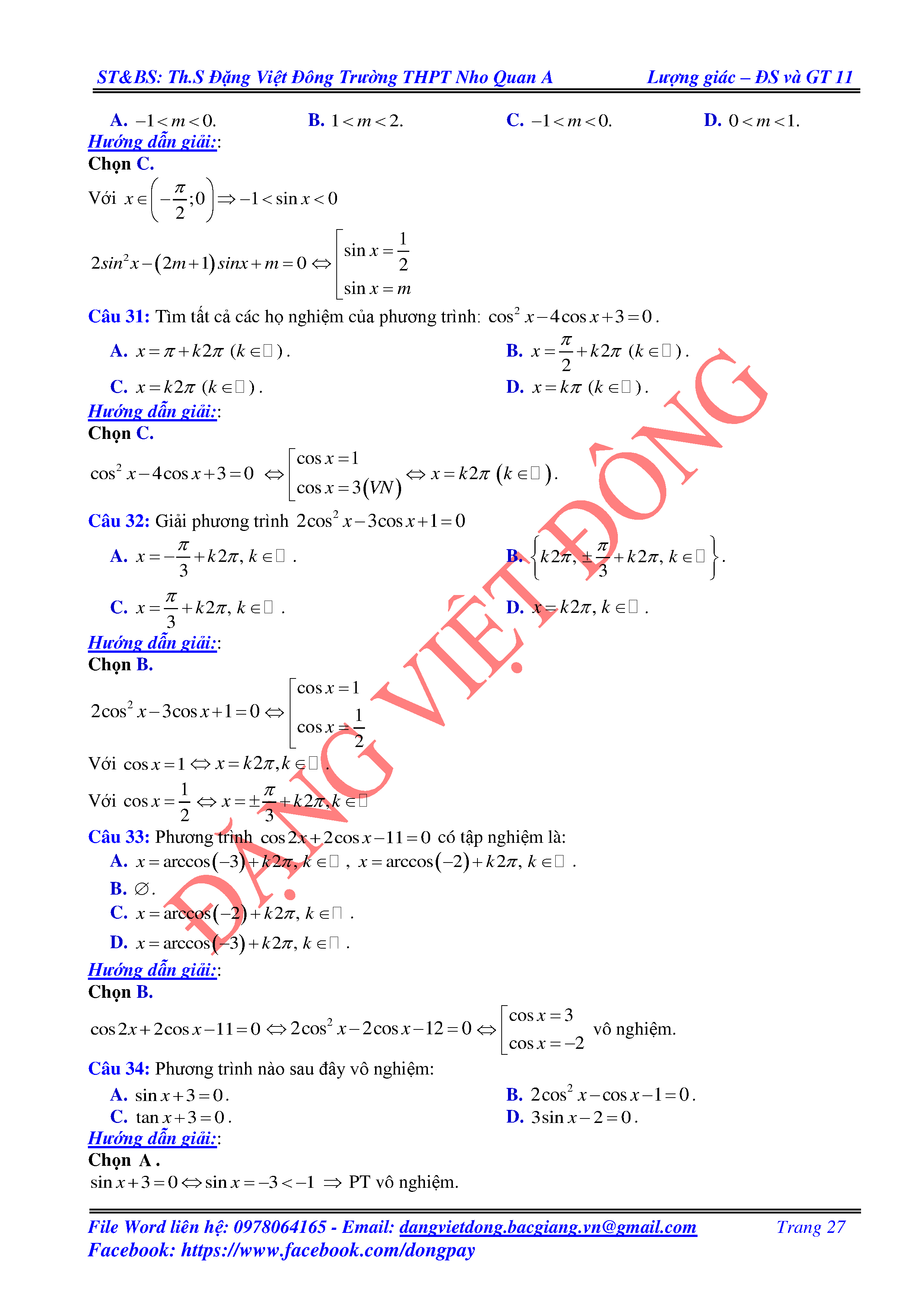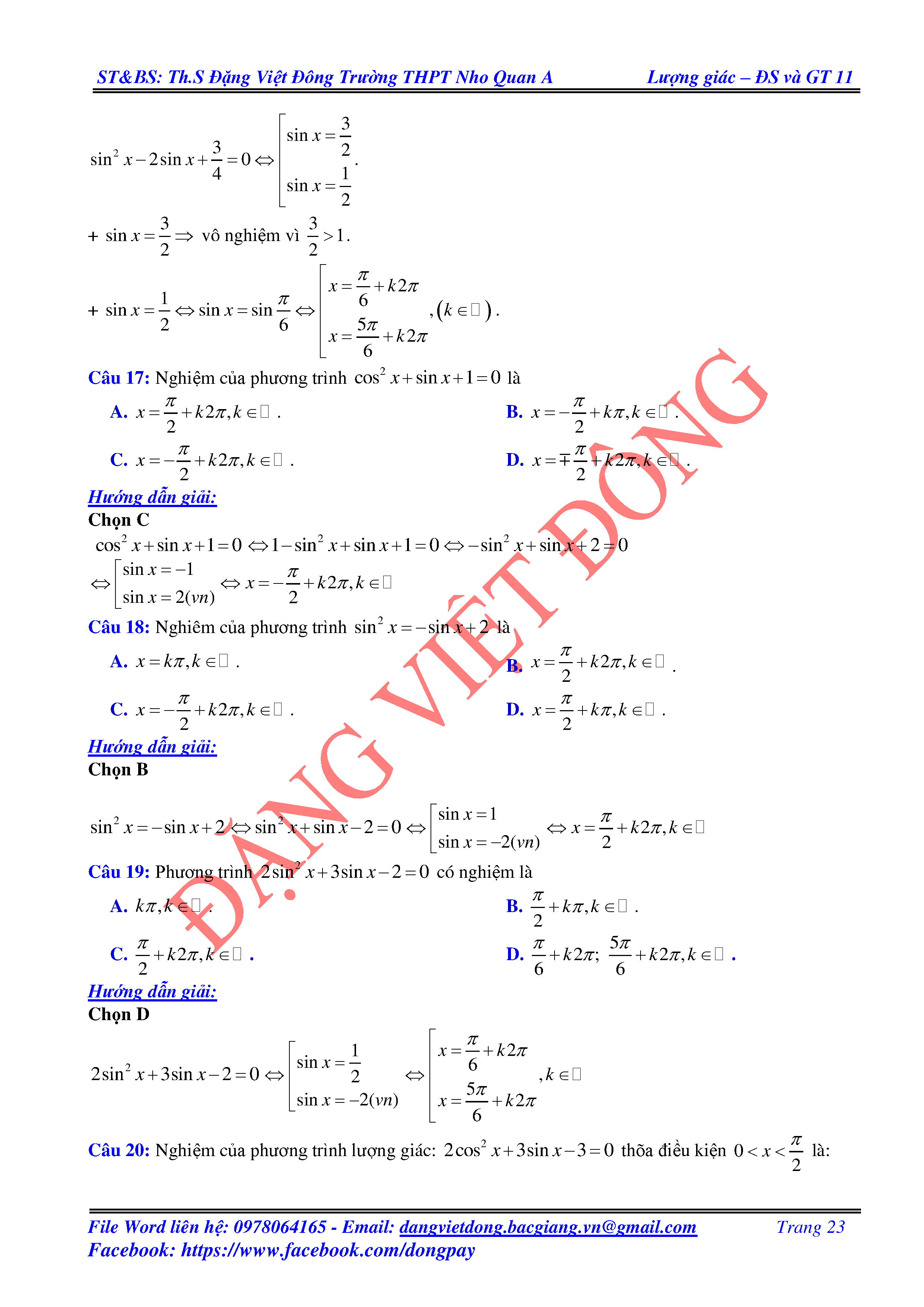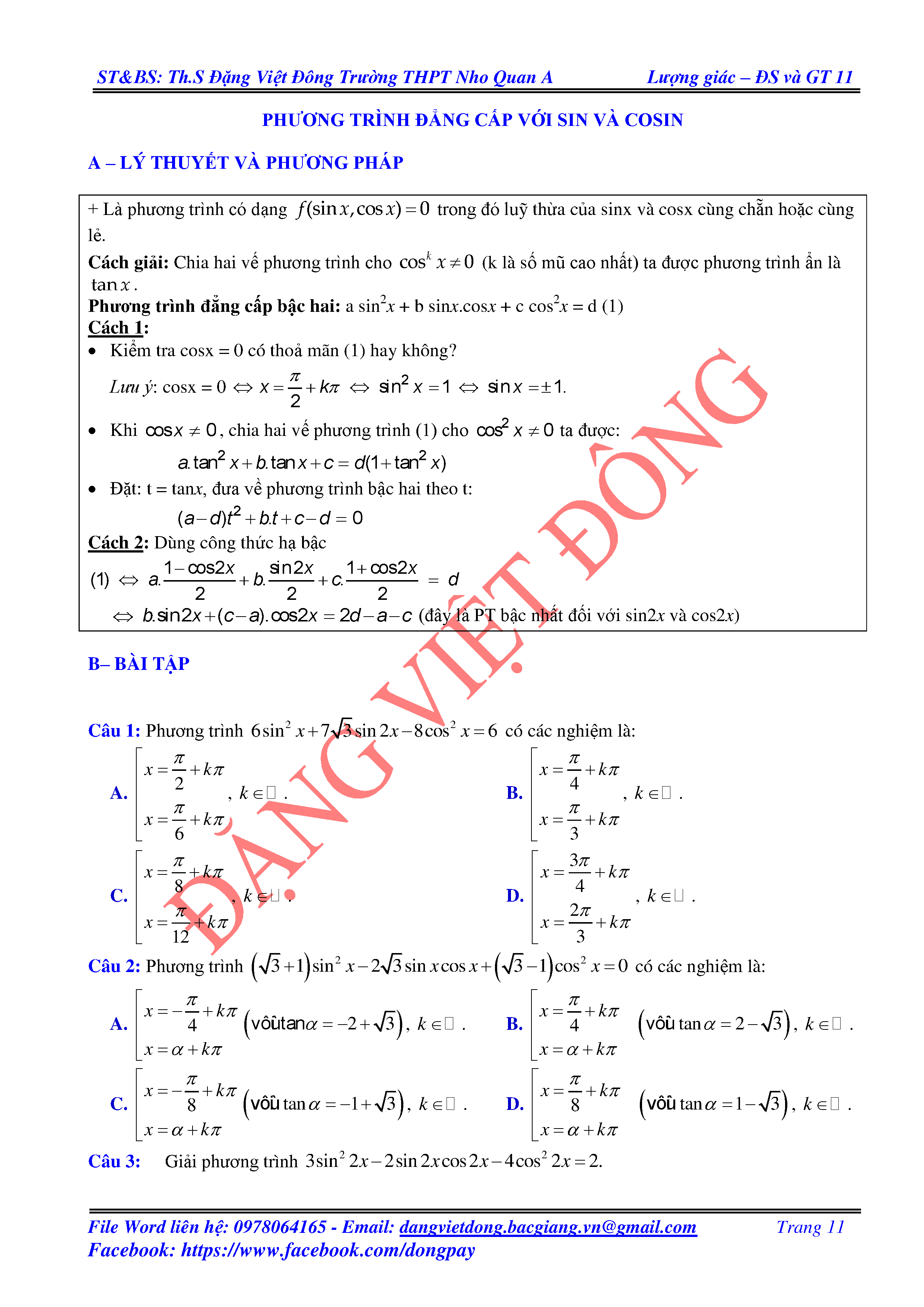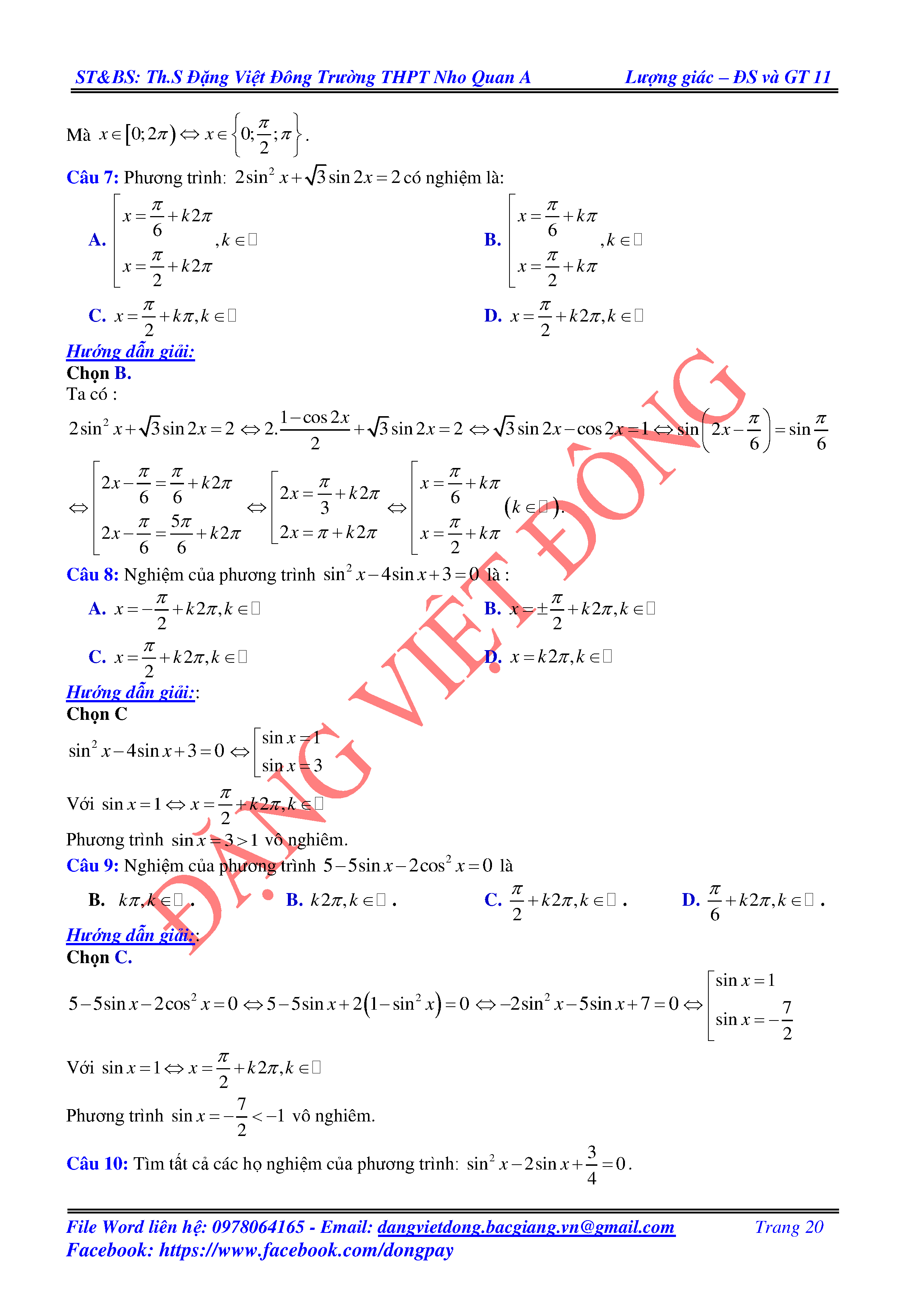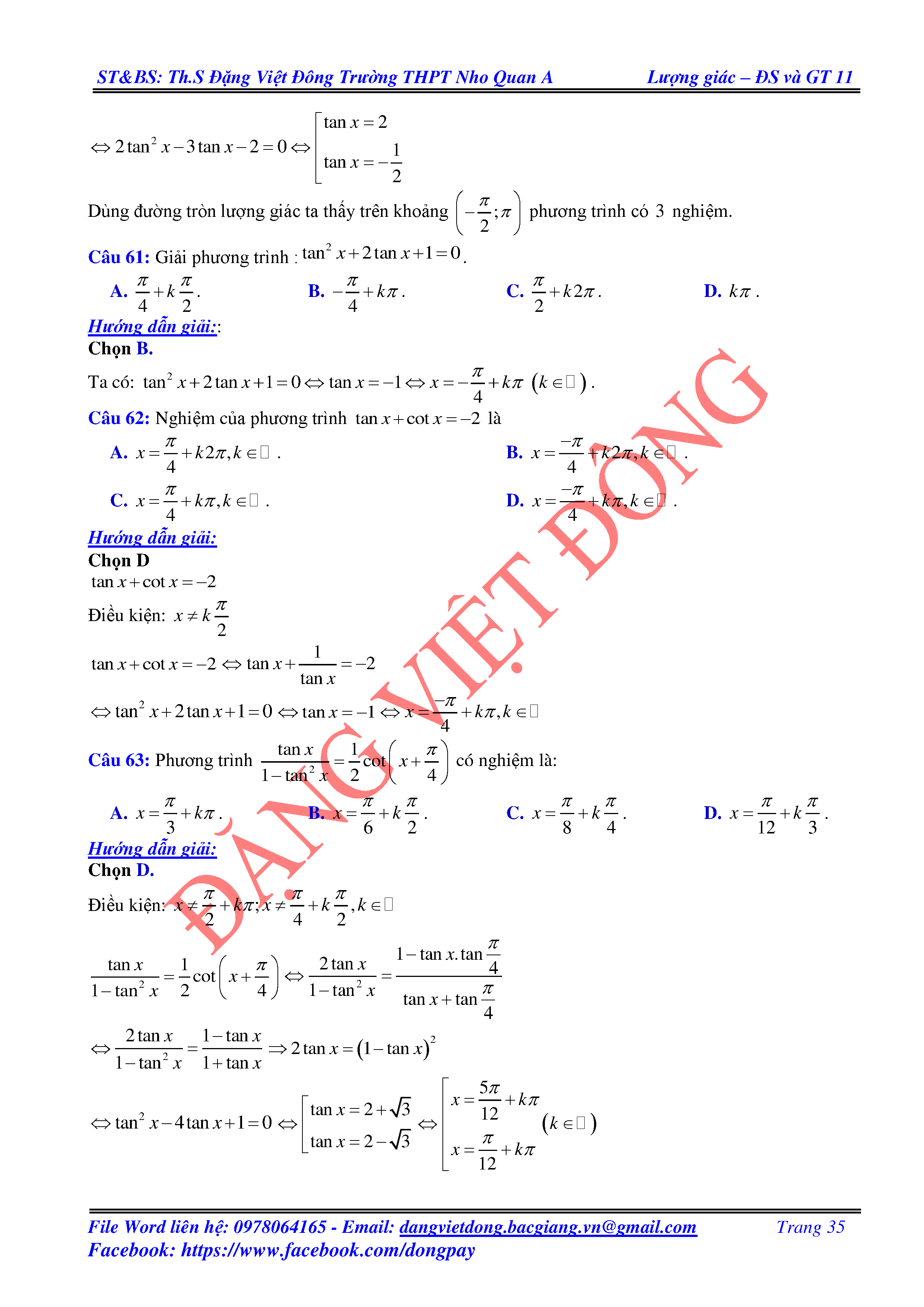 PHƯƠNG TRÌNH BẬC HAI VÀ QUY VỀ BẬC HAI VỚI MỘT HÀM SỐ LƯỢNG GIÁC - ĐẠI SỐ, GIẢI TÍCH 11