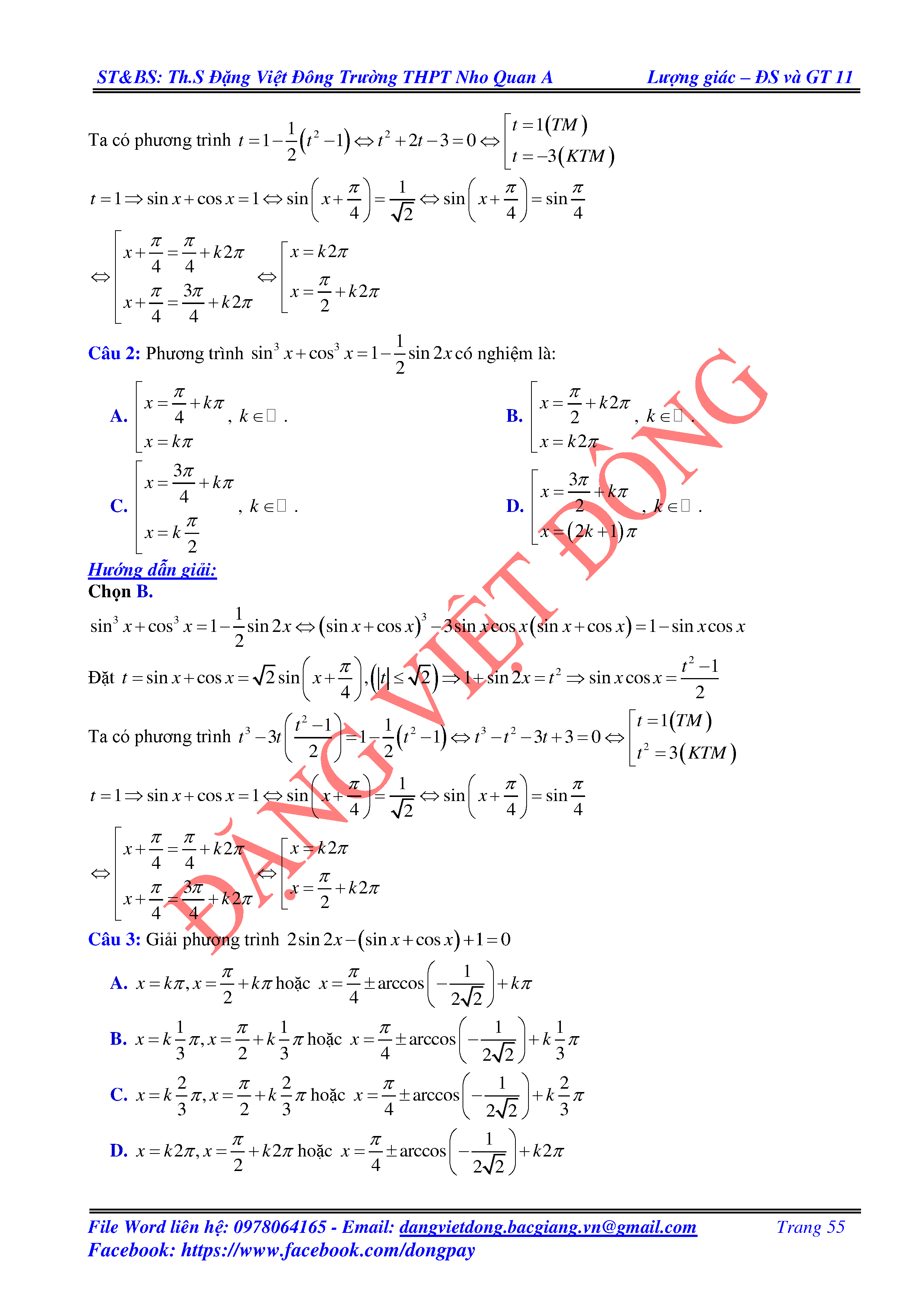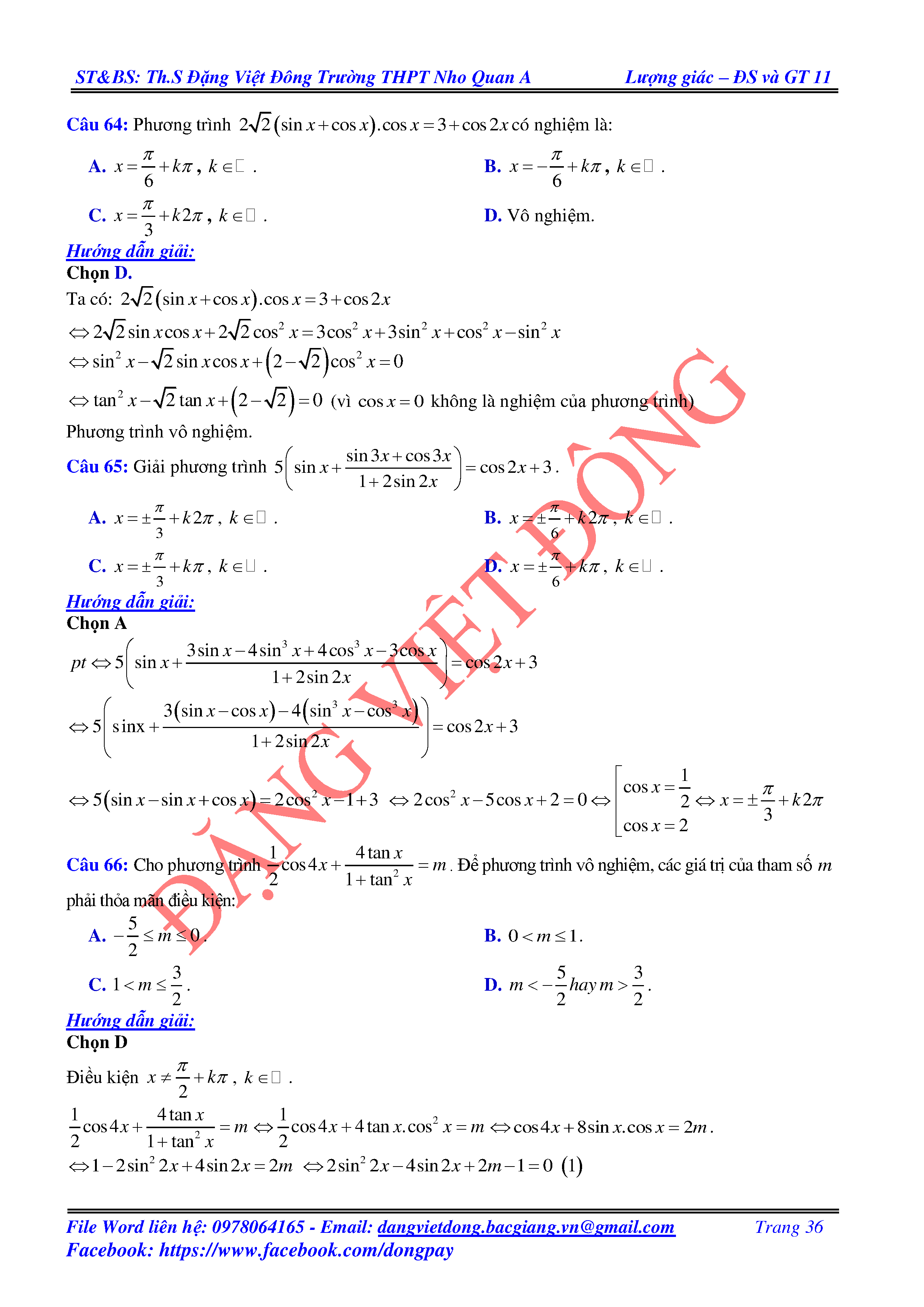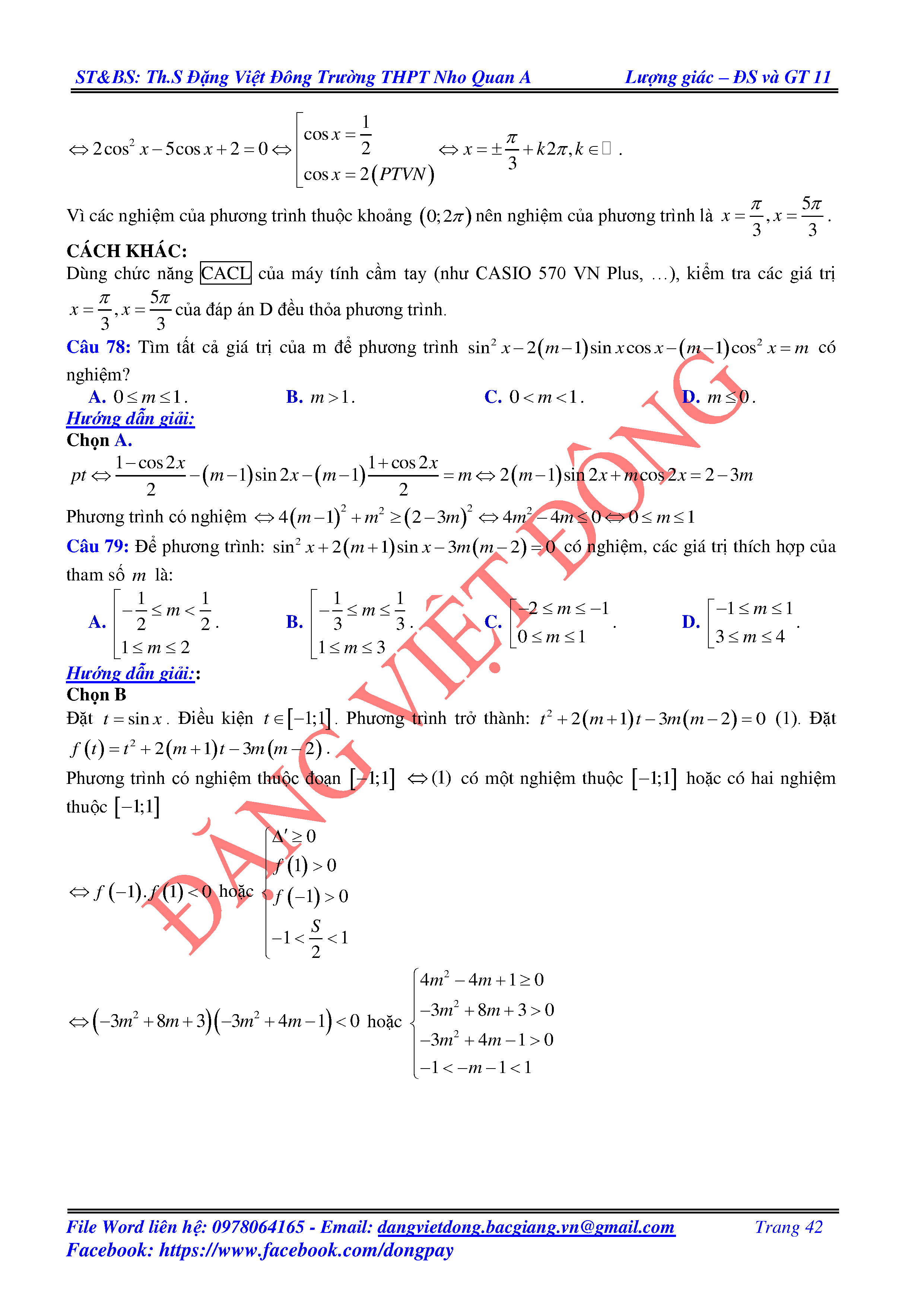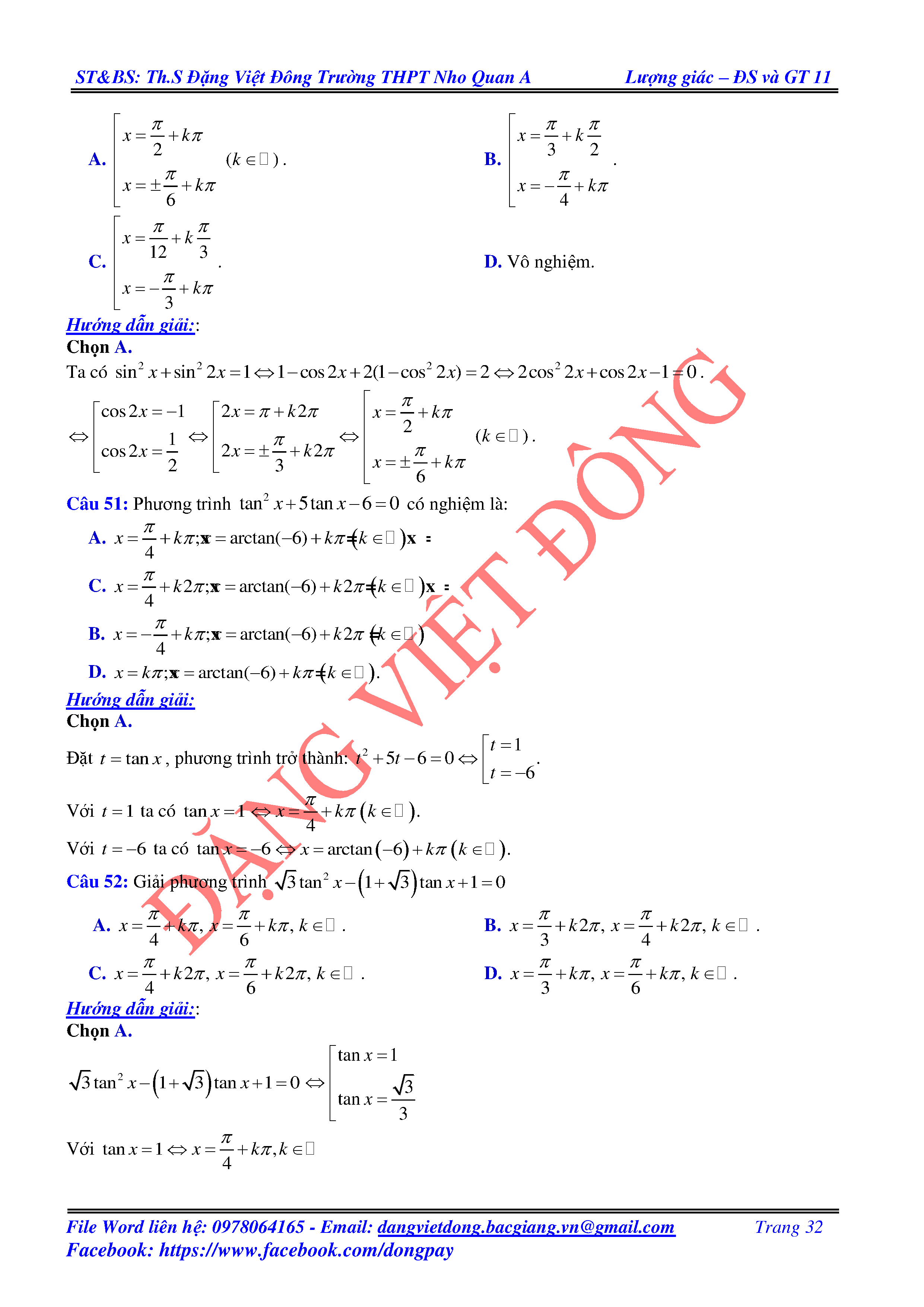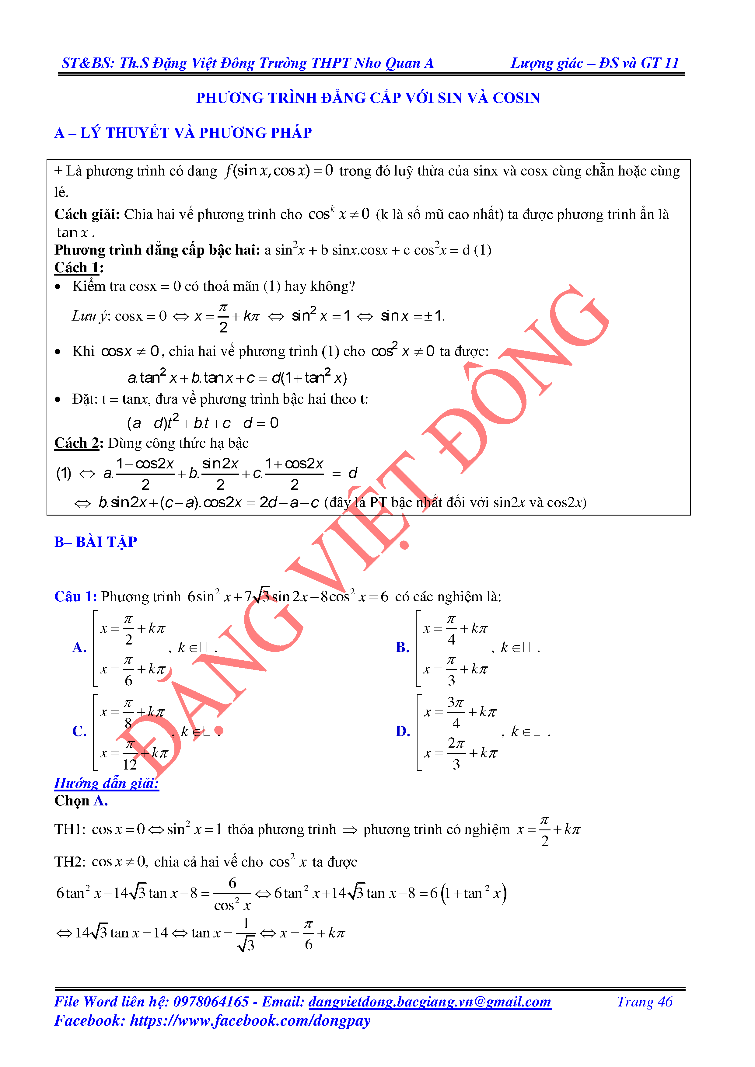PHƯƠNG TRÌNH BẬC HAI VÀ QUY VỀ BẬC HAI VỚI MỘT HÀM SỐ LƯỢNG GIÁC - ĐẠI SỐ, GIẢI TÍCH 11