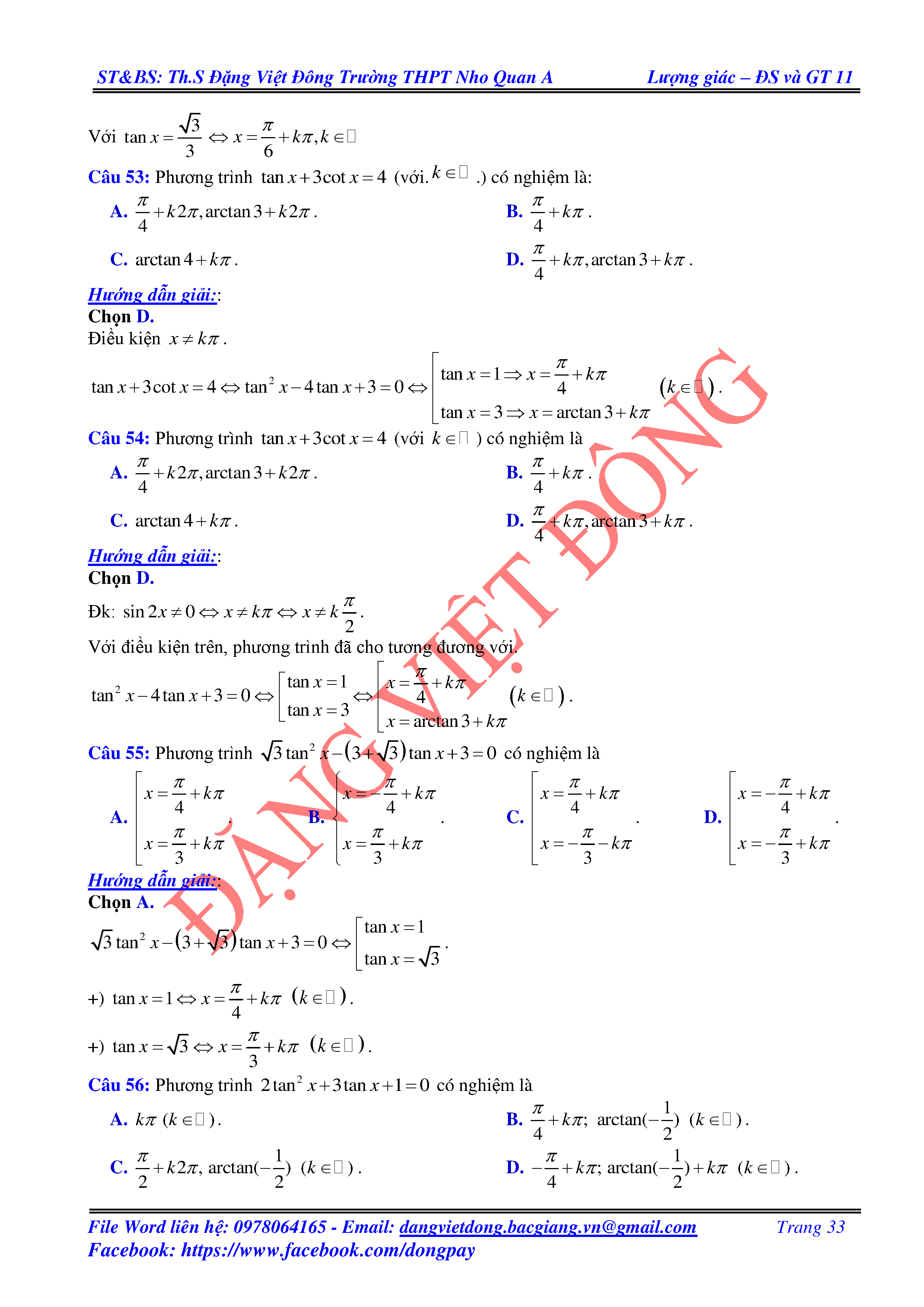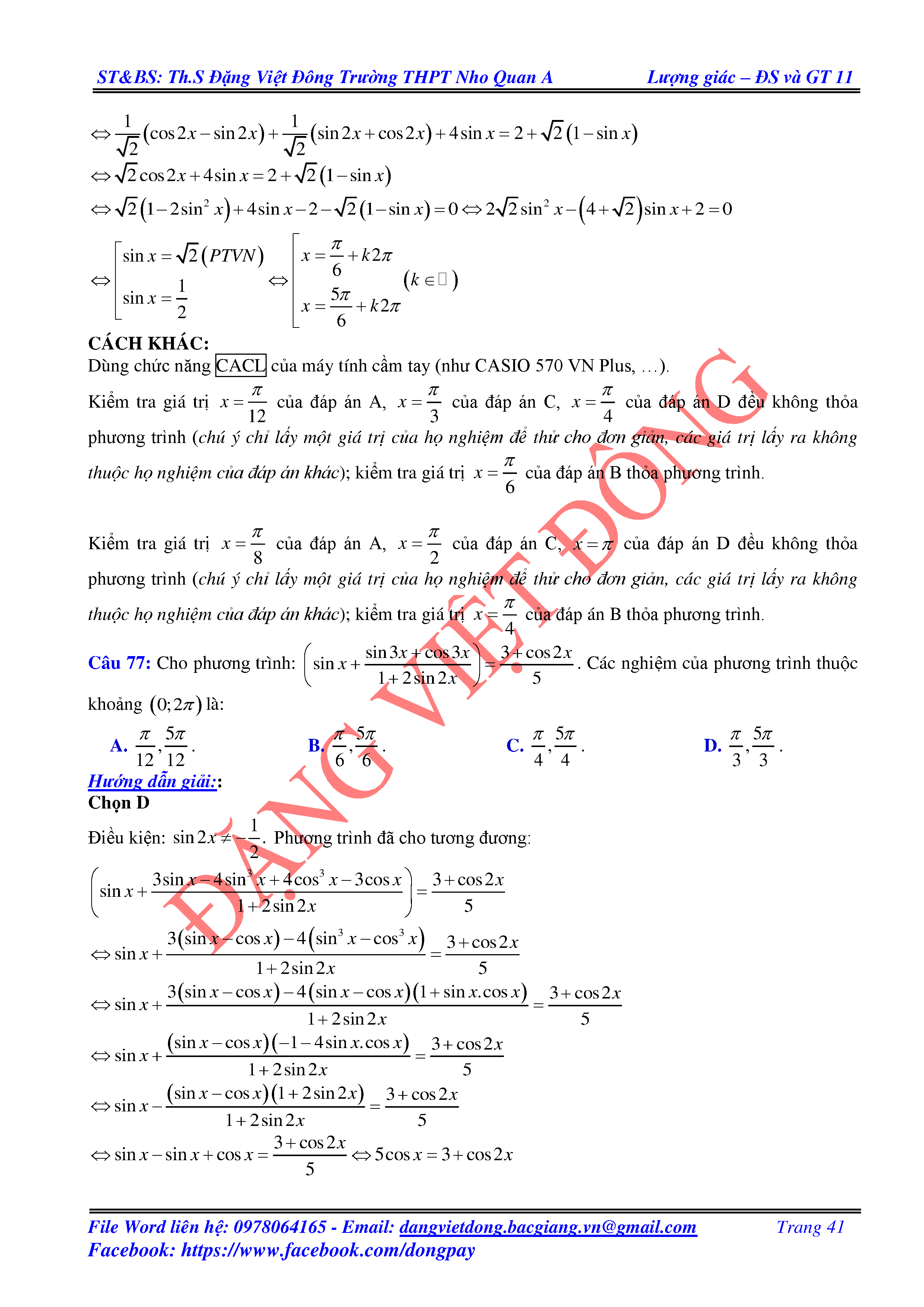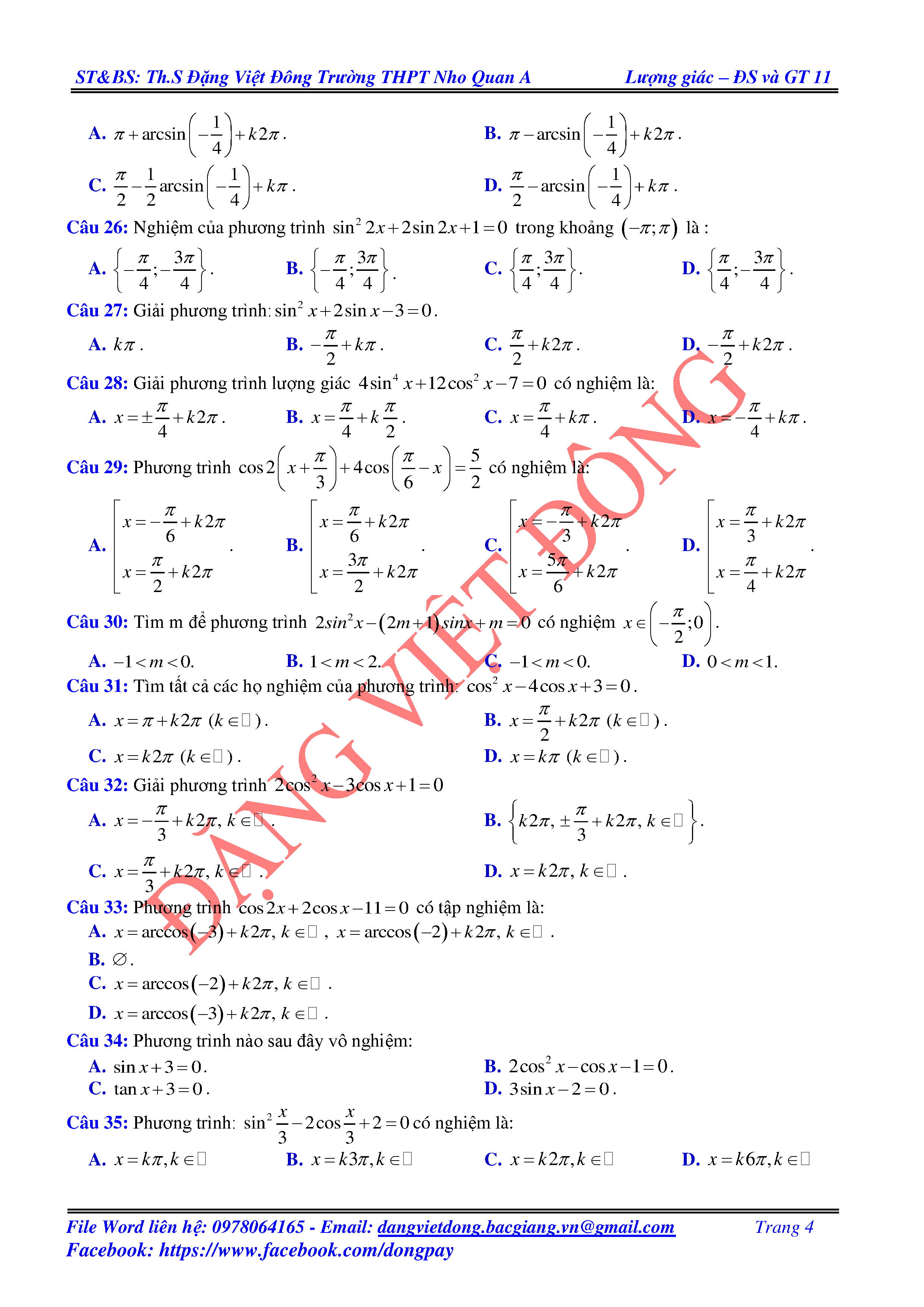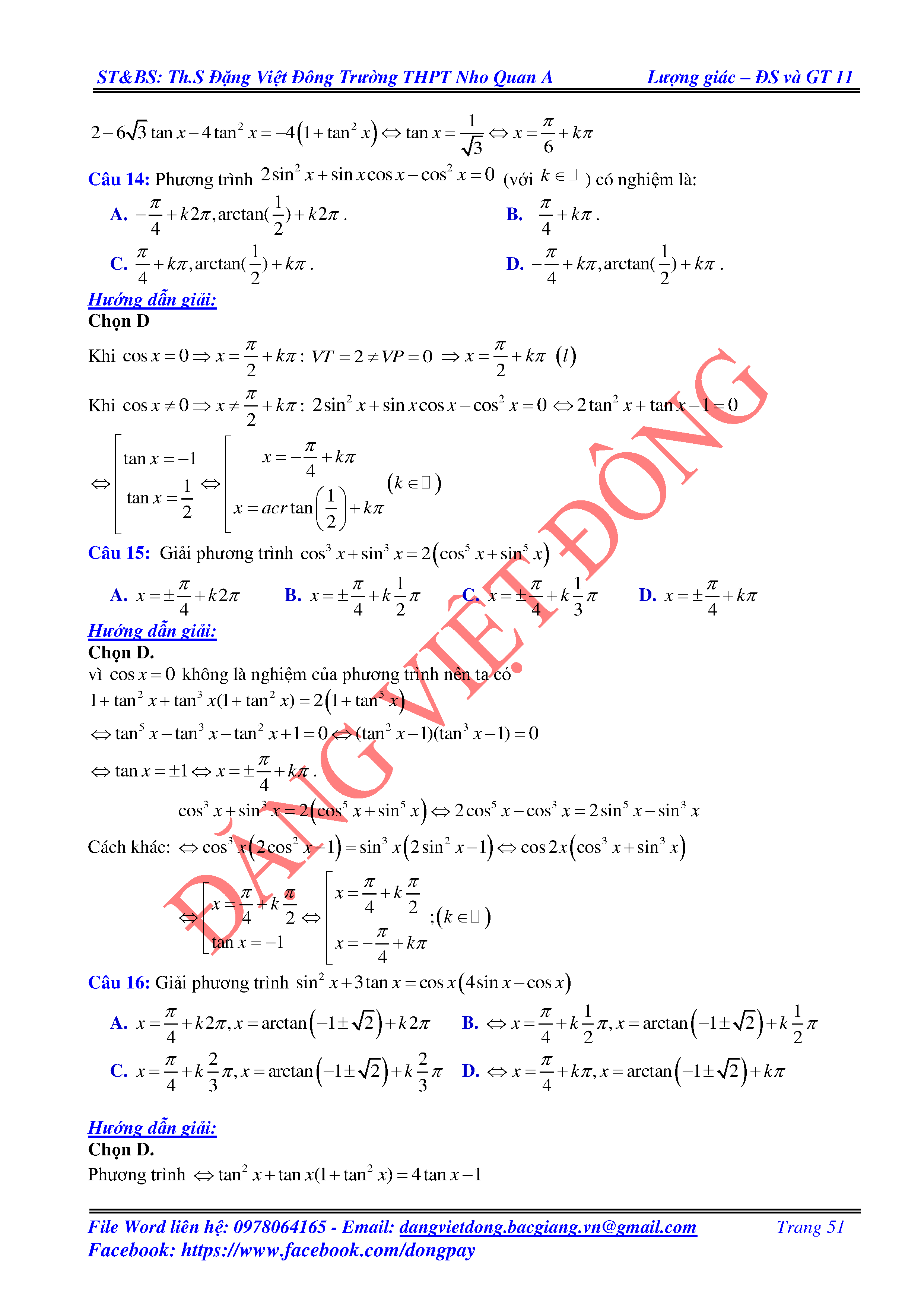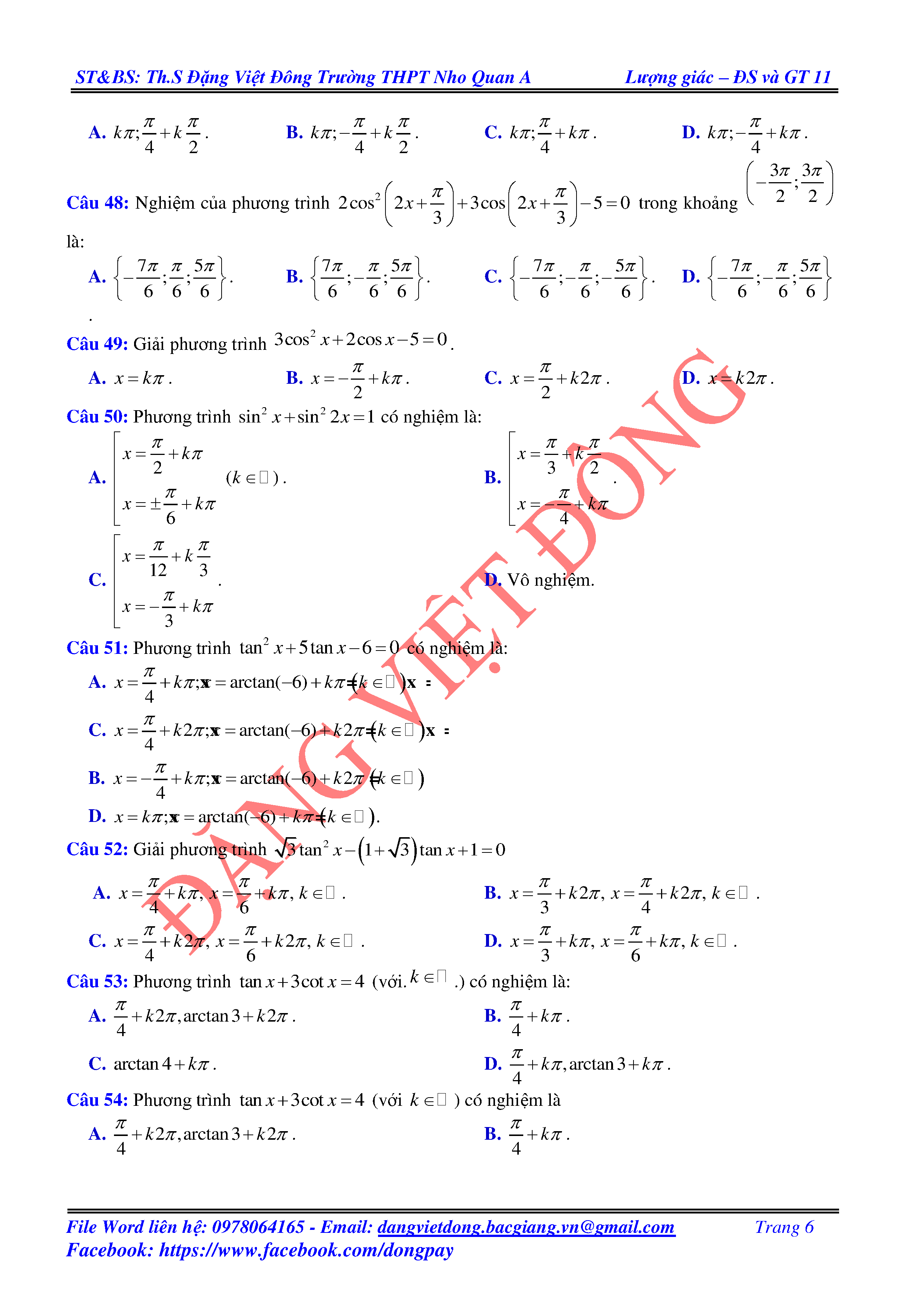 PHƯƠNG TRÌNH BẬC HAI VÀ QUY VỀ BẬC HAI VỚI MỘT HÀM SỐ LƯỢNG GIÁC - ĐẠI SỐ, GIẢI TÍCH 11