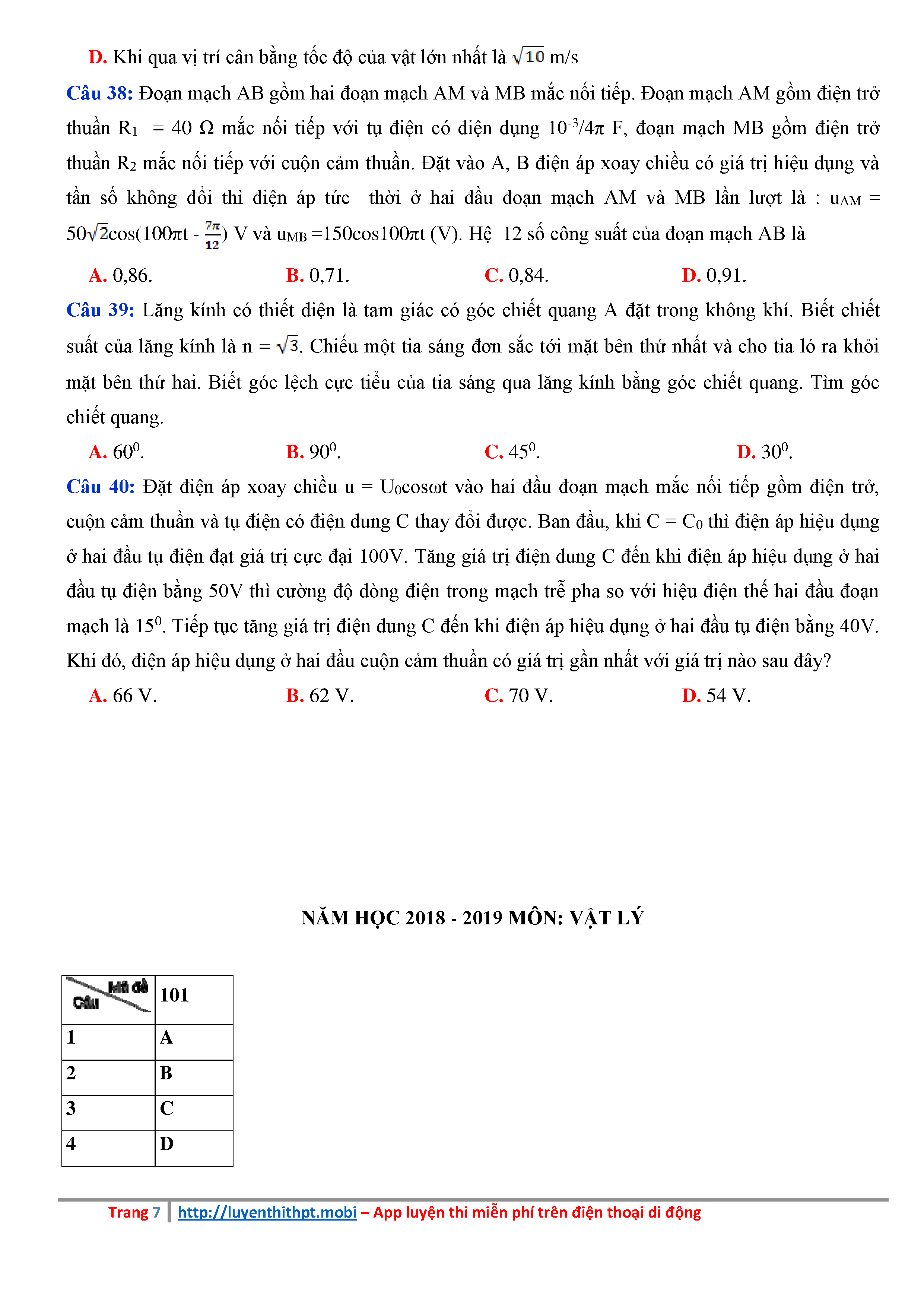 Đề thi thử THPTQG năm 2019 Vật Lý - THPT Chuyên Bắc Ninh - Lần 1 - có lời giải