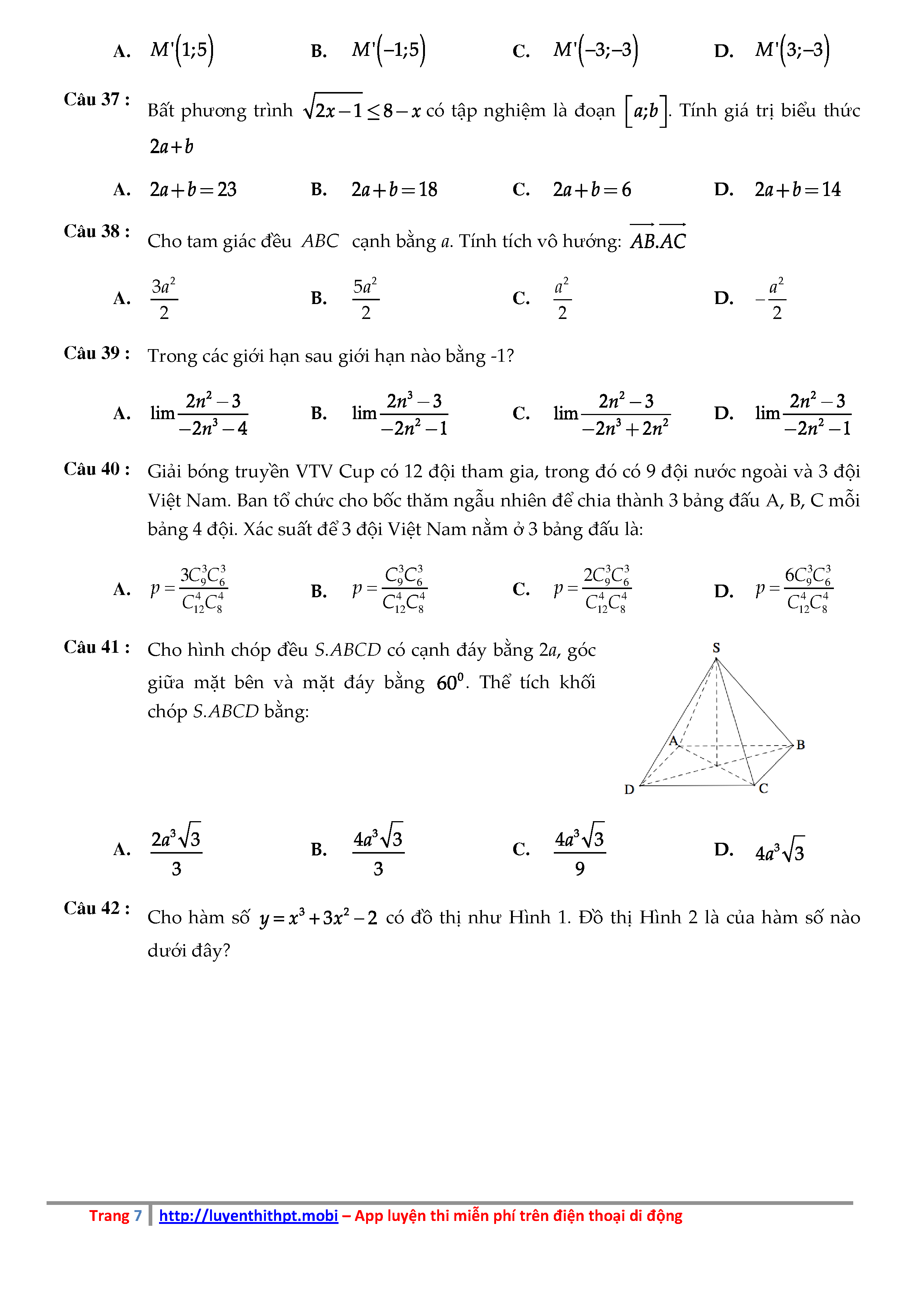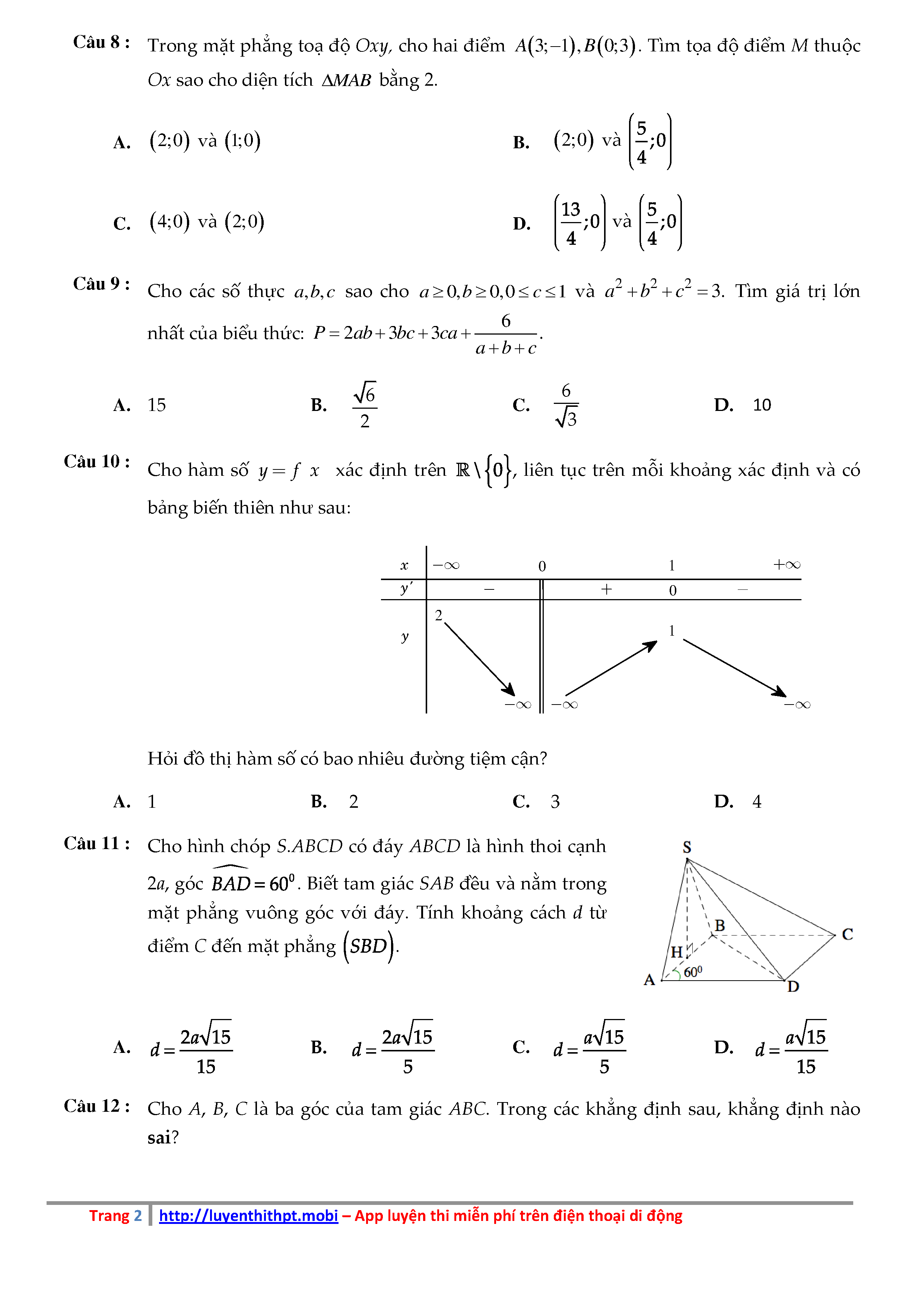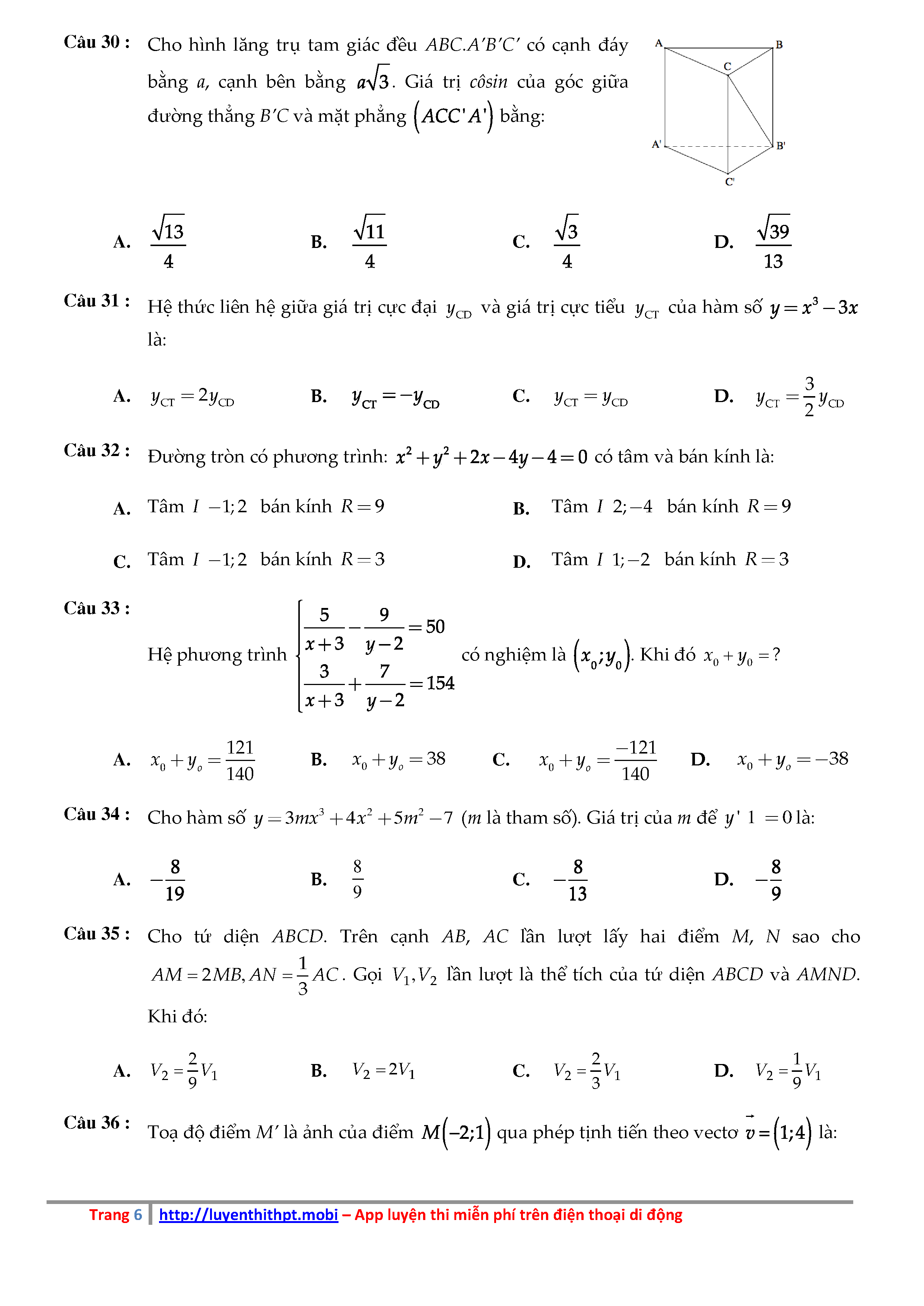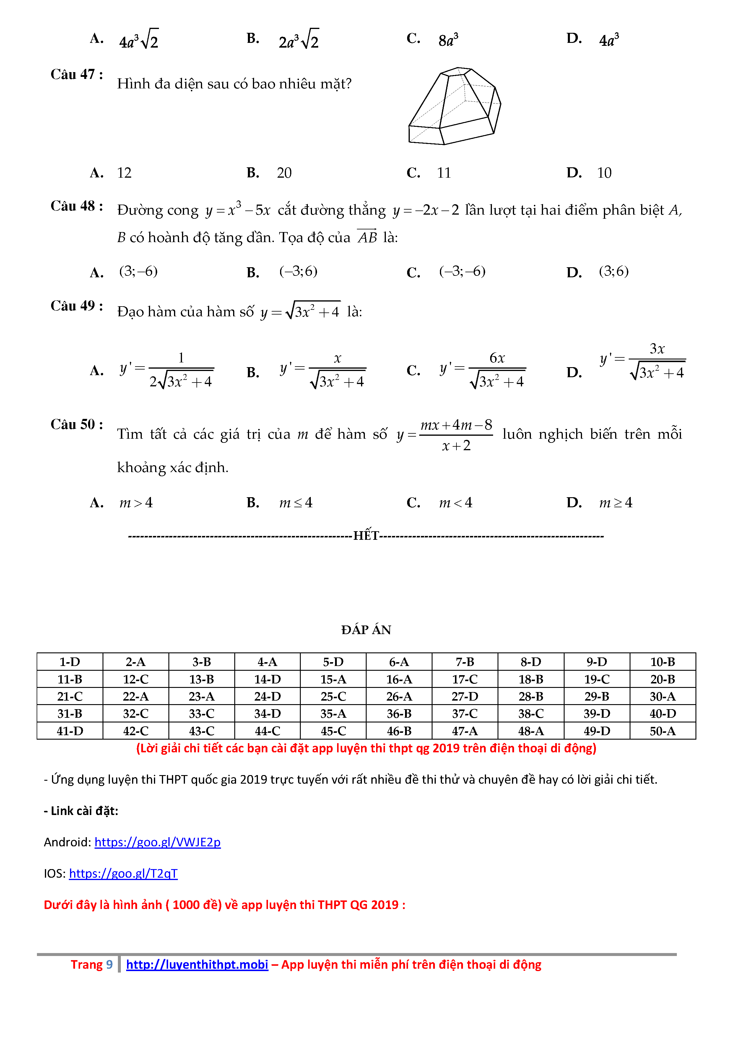 Đề khảo sát chất lượng 2019 - Môn Toán 12 – Trường M.V Lômônôxốp - File word có đáp án