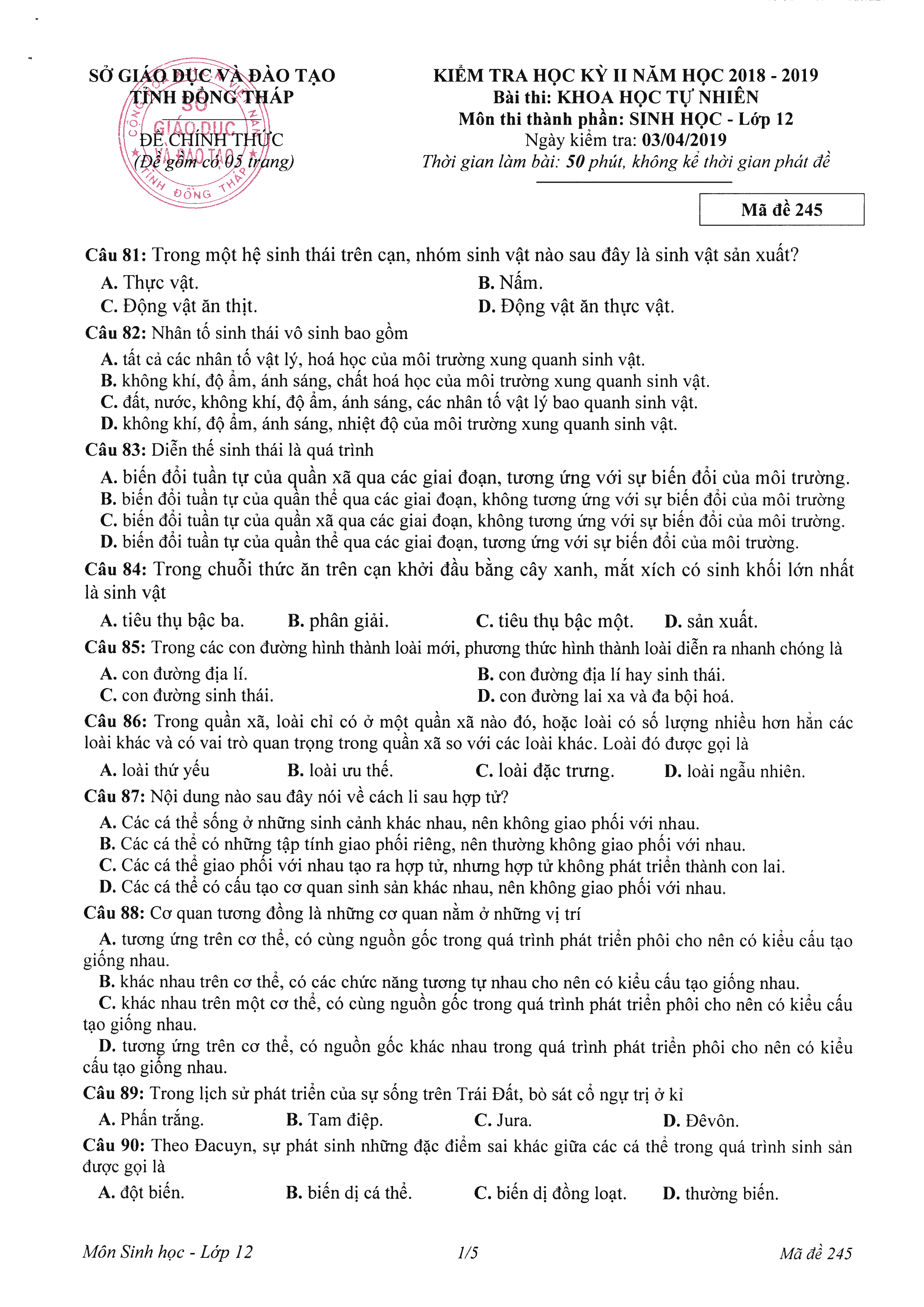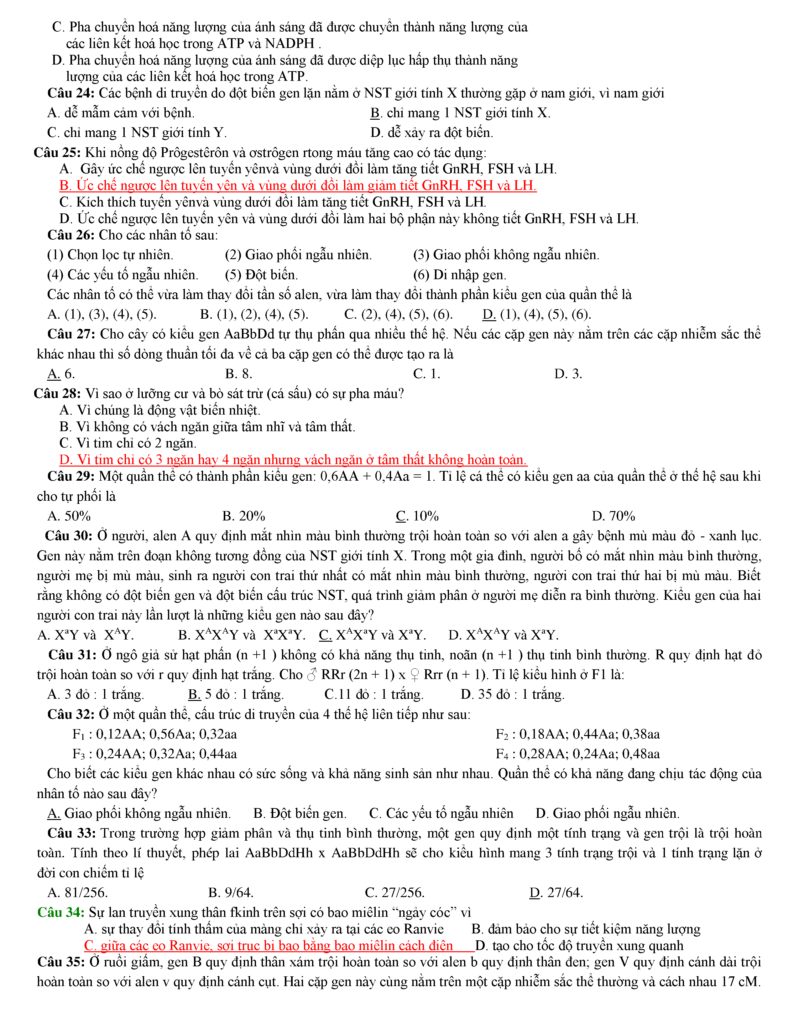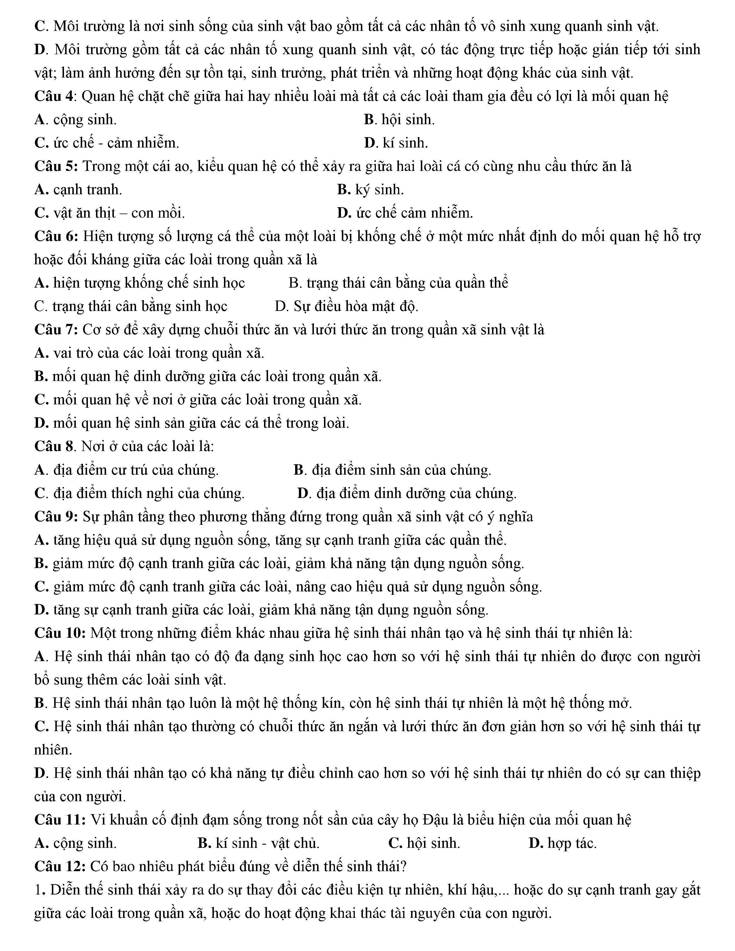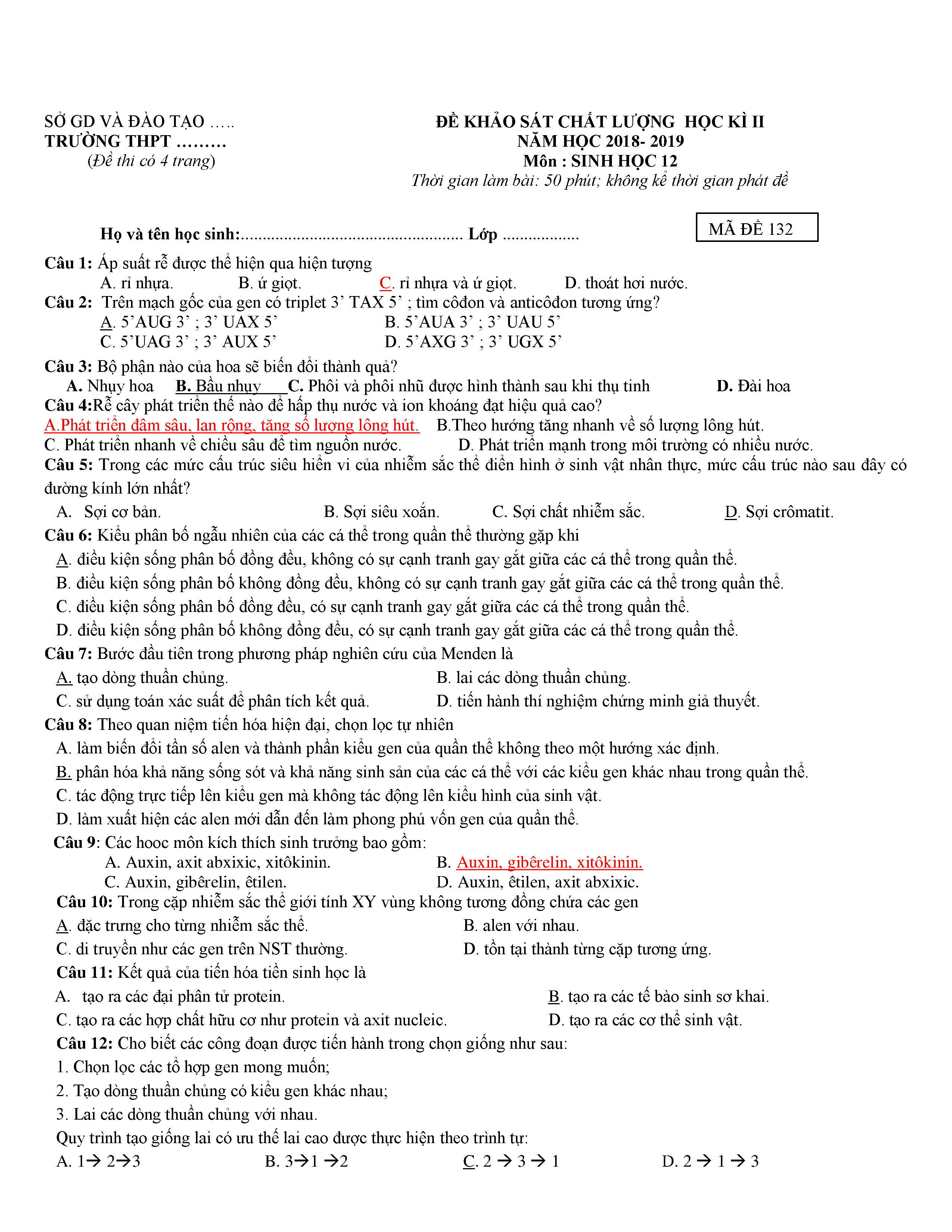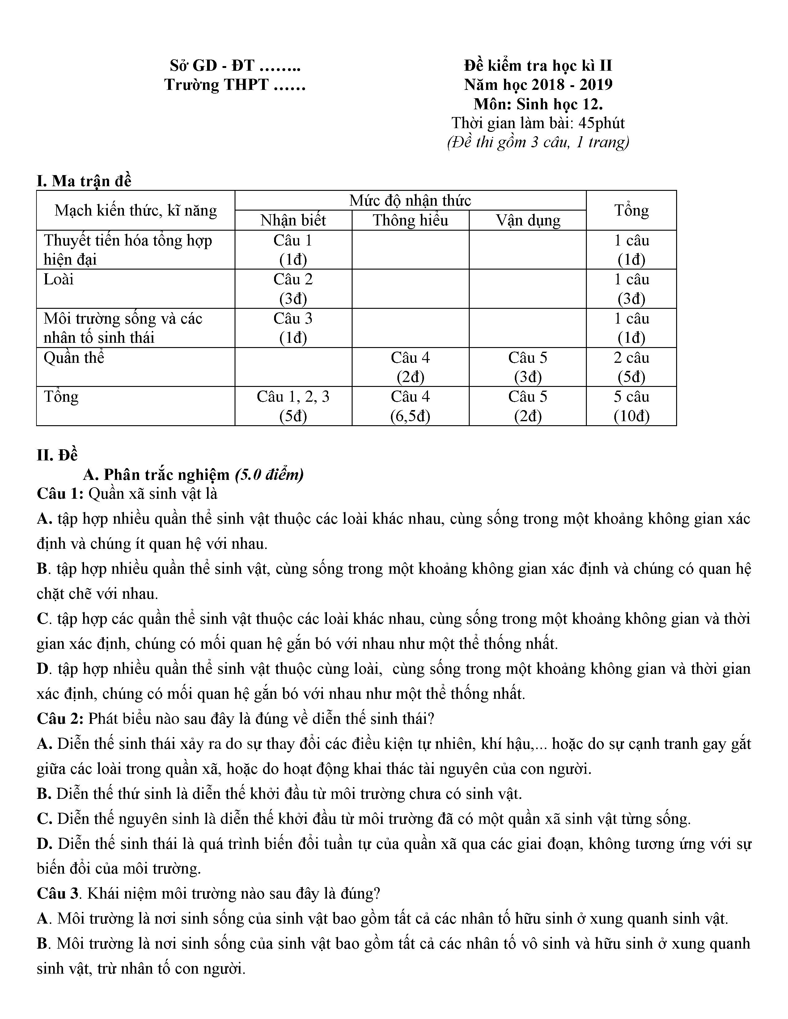 Bộ đề thi học kỳ 2 môn Sinh học 12