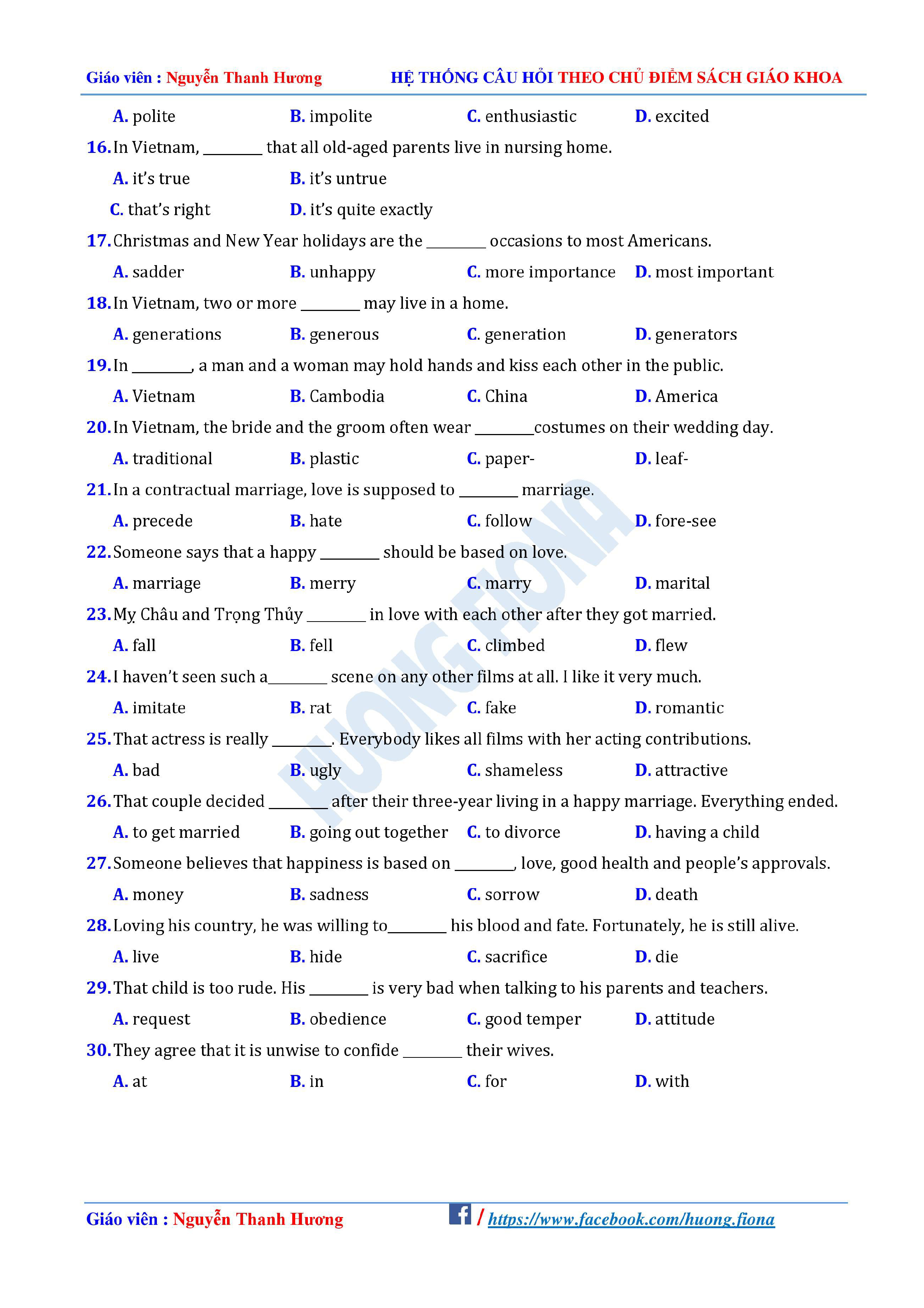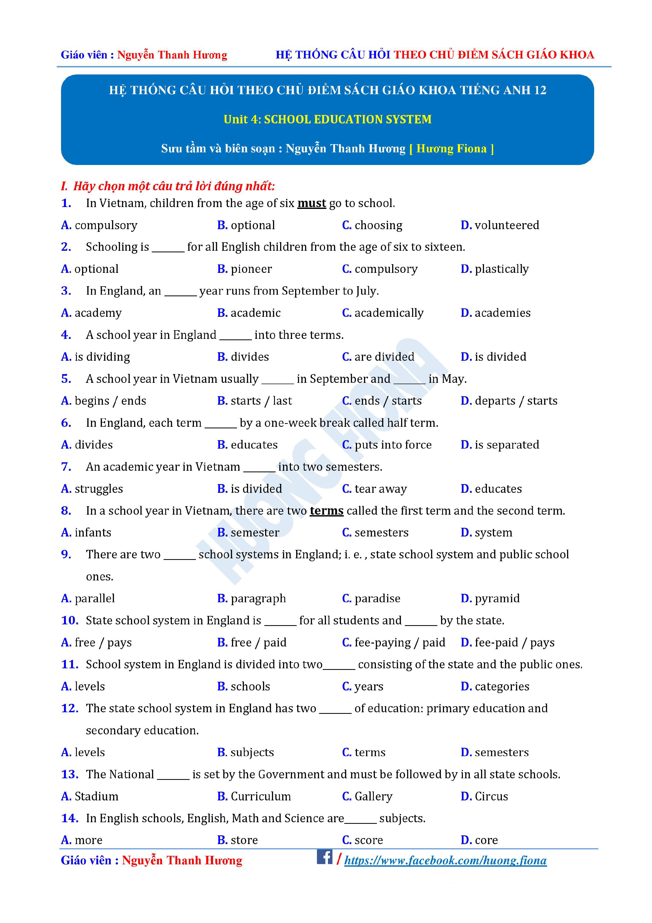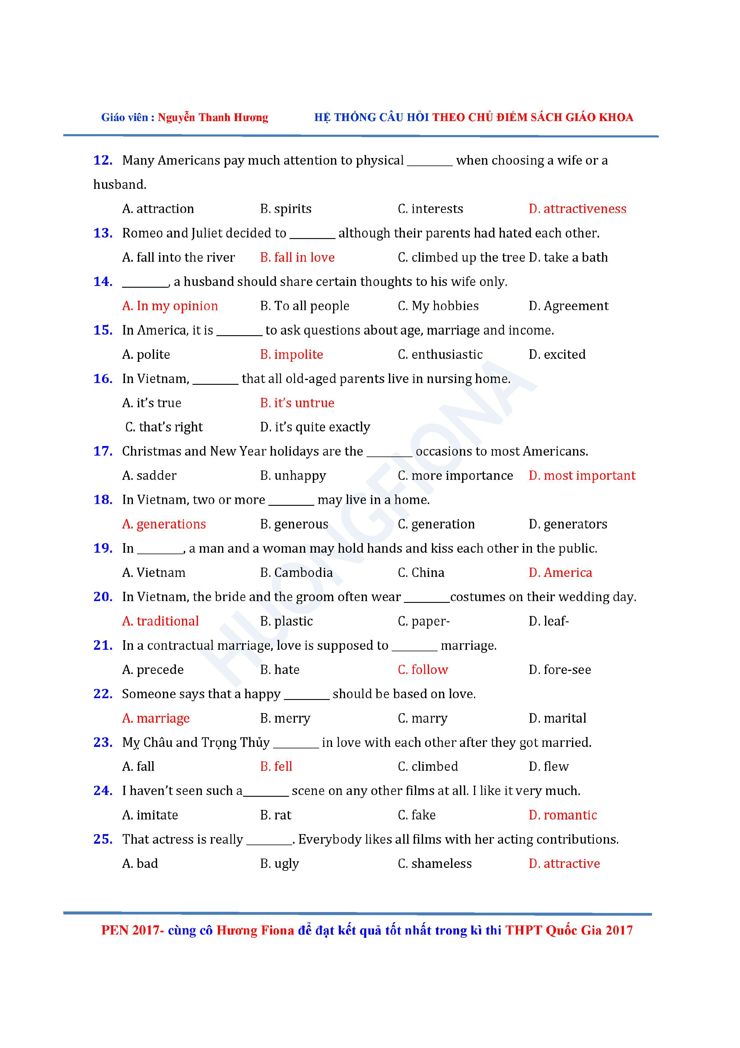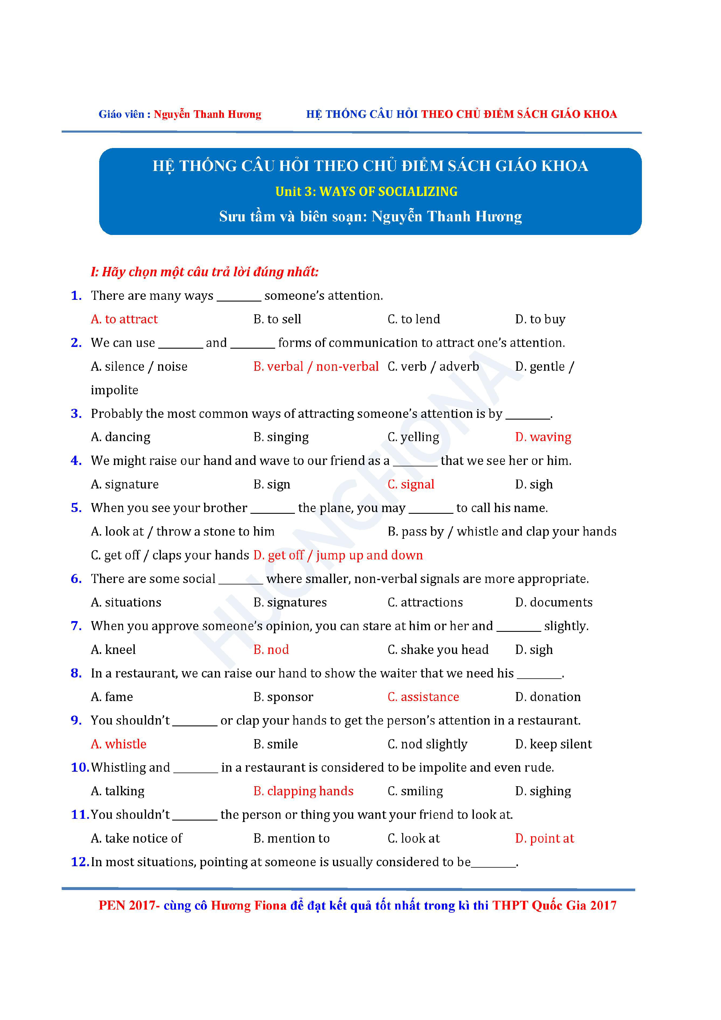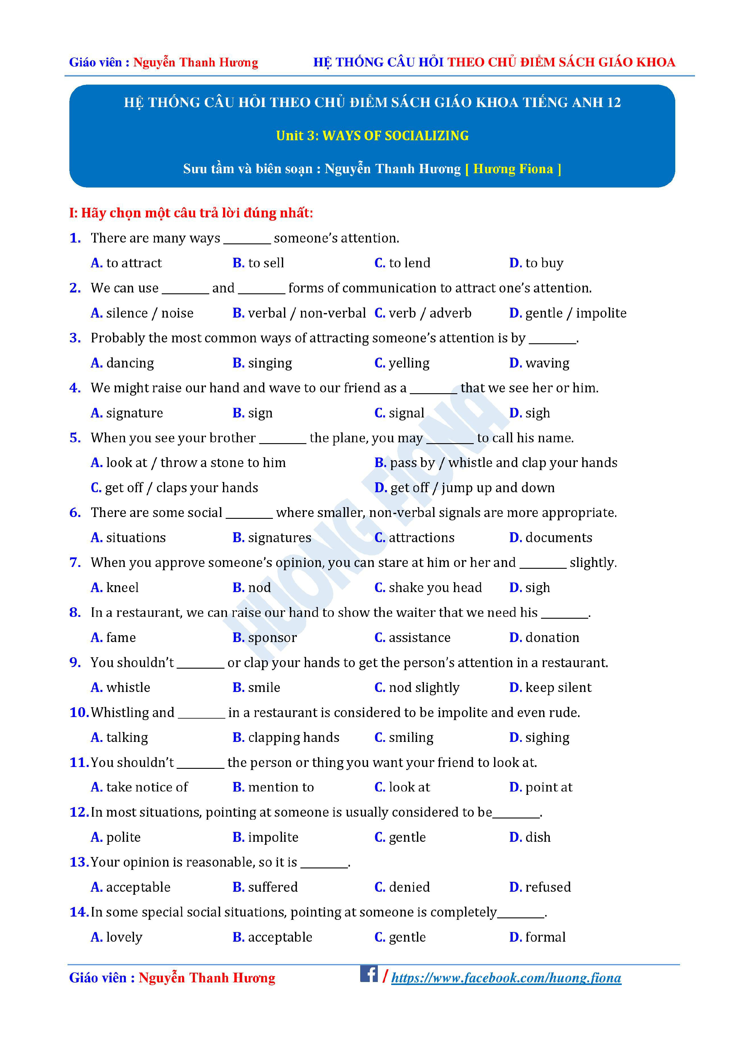 Câu hỏi trắc nghiệm Tiếng Anh 12 theo từng chủ điểm
