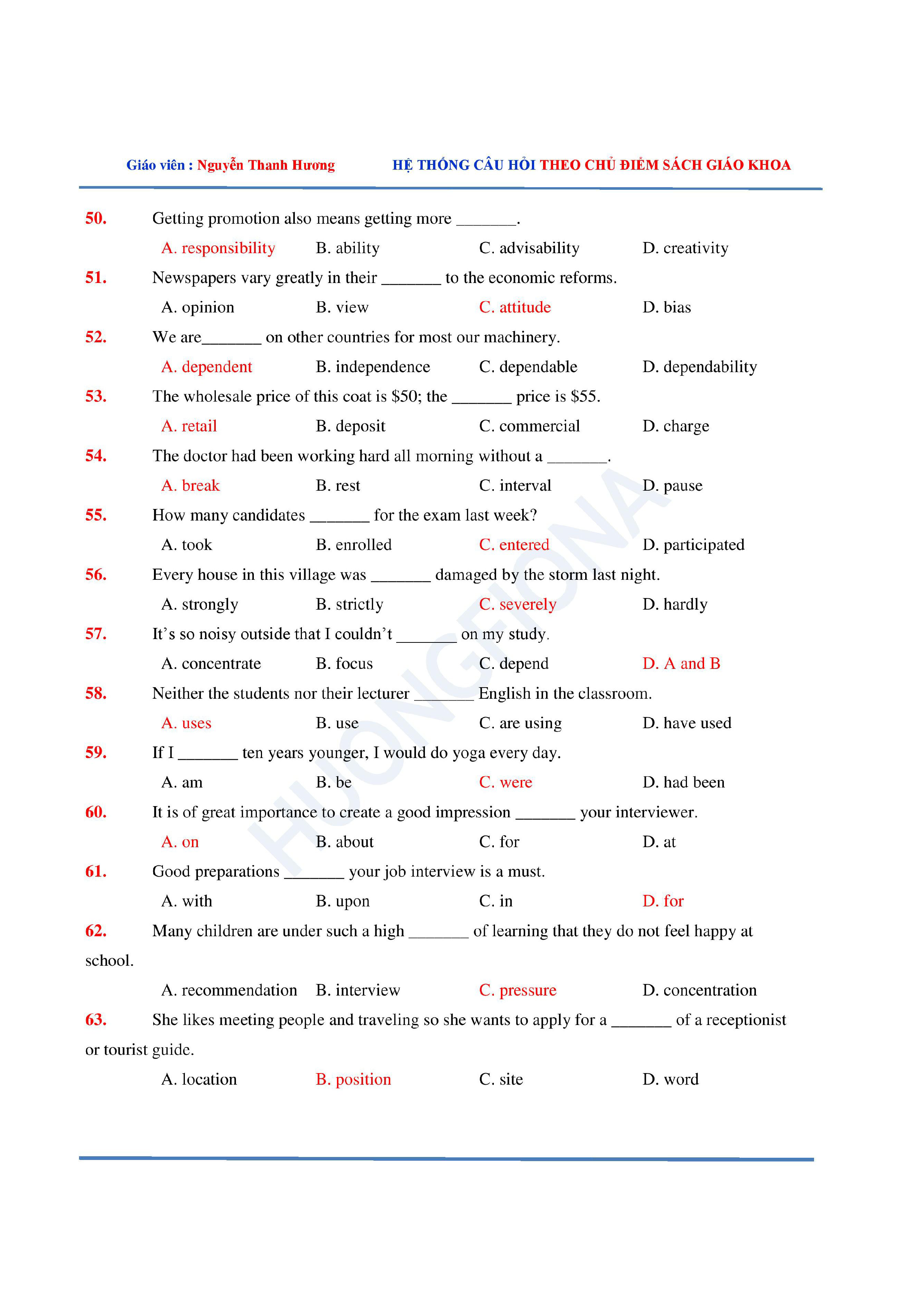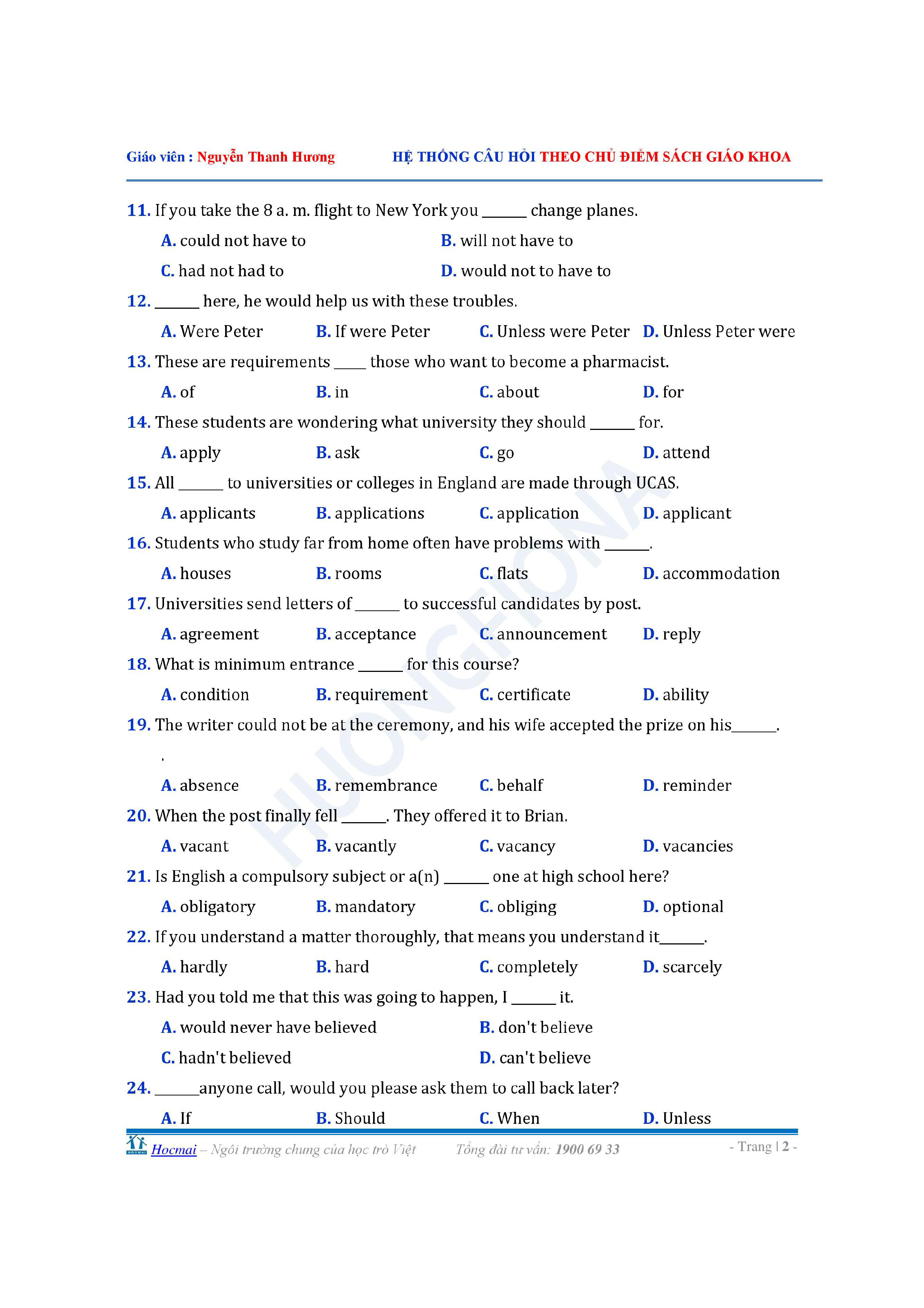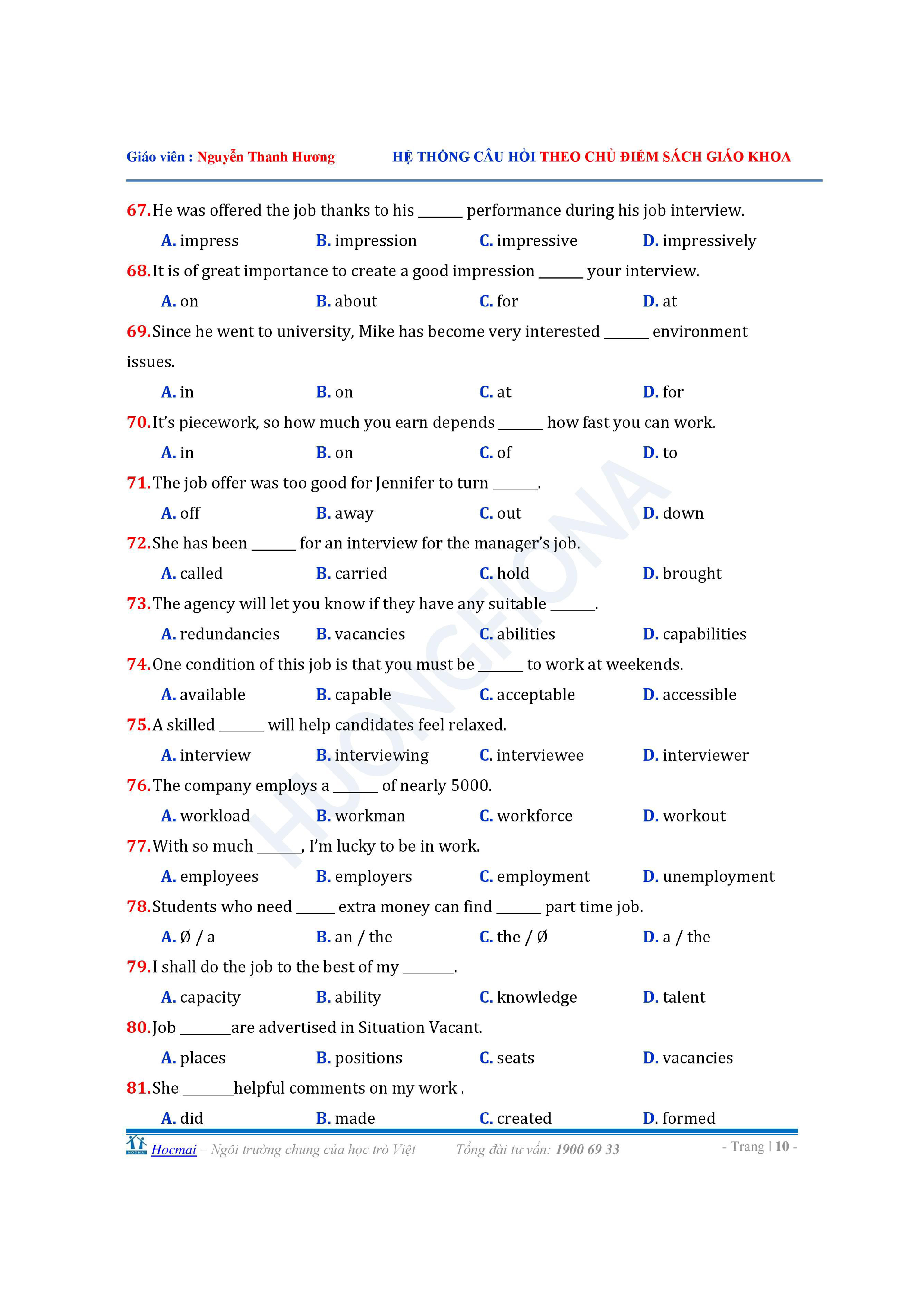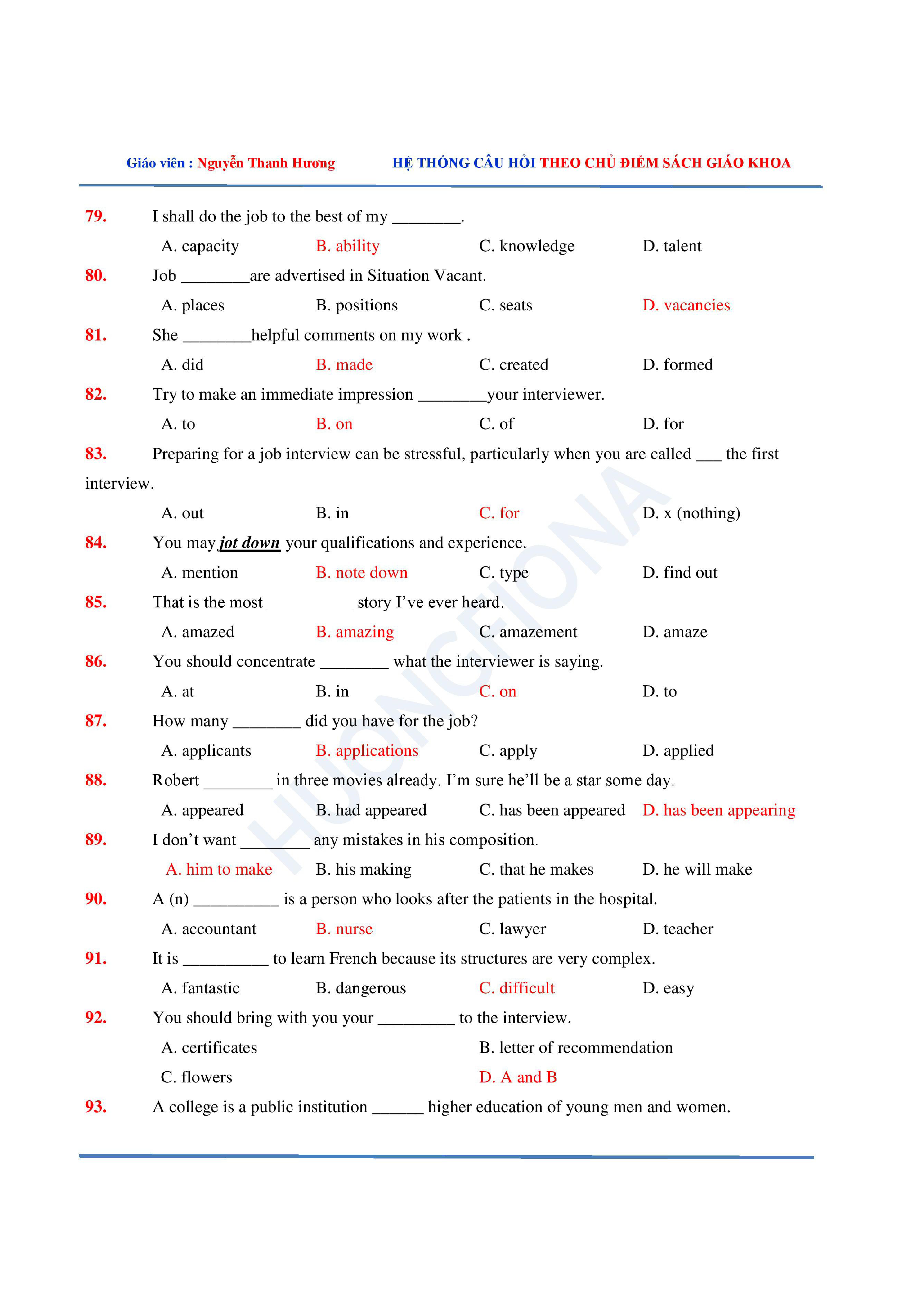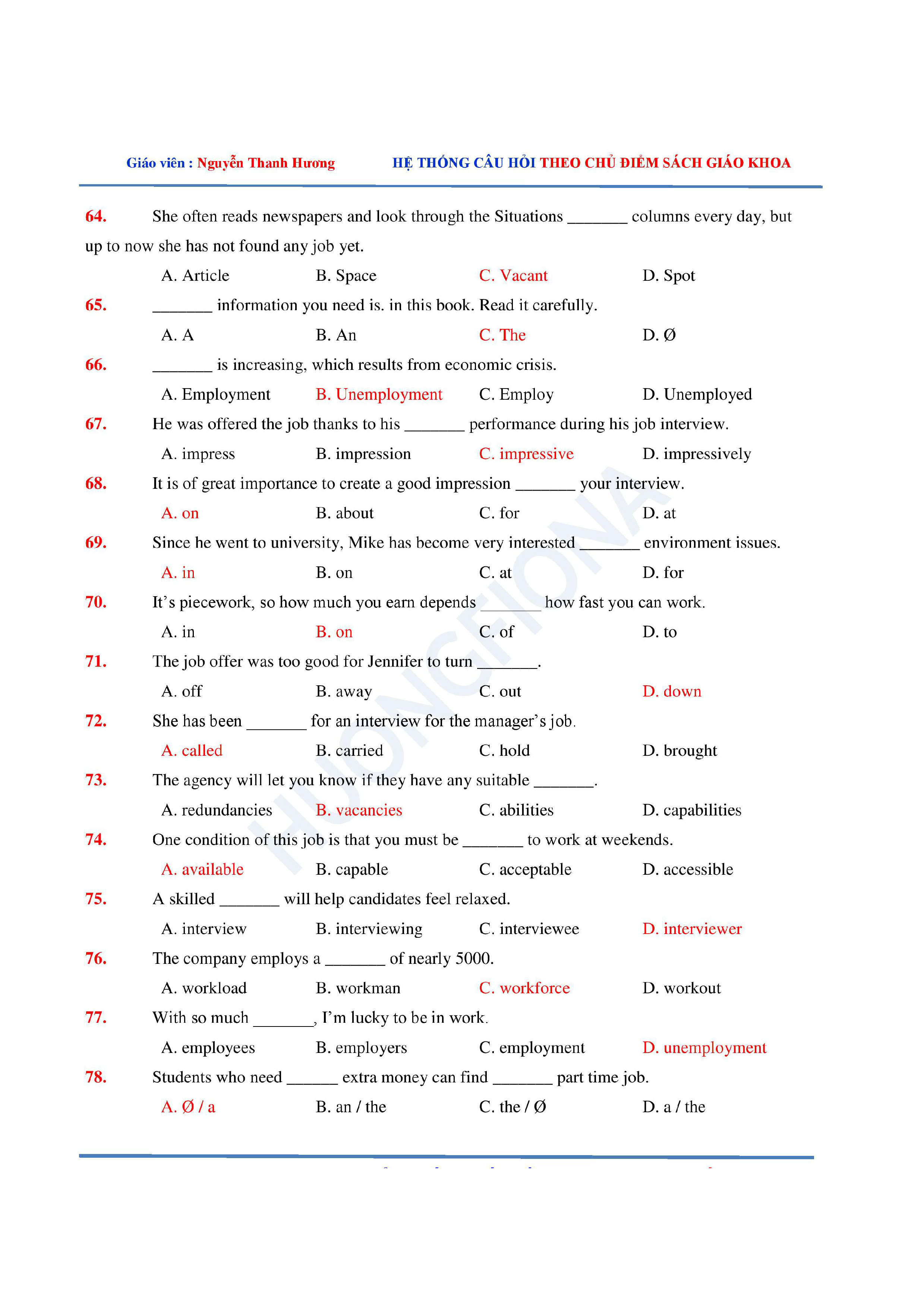 Câu hỏi trắc nghiệm Tiếng Anh theo từng chủ điểm (phần 2)