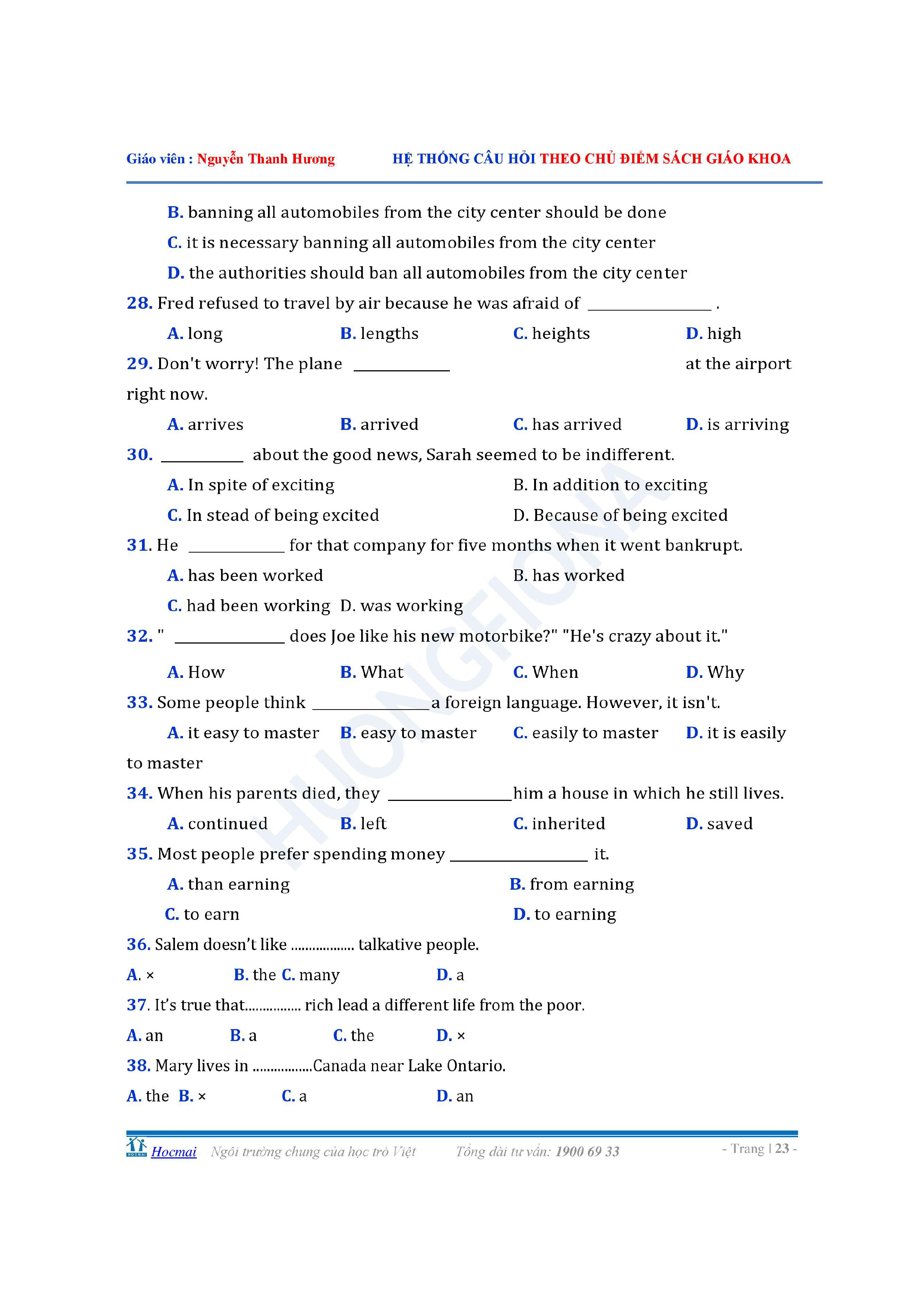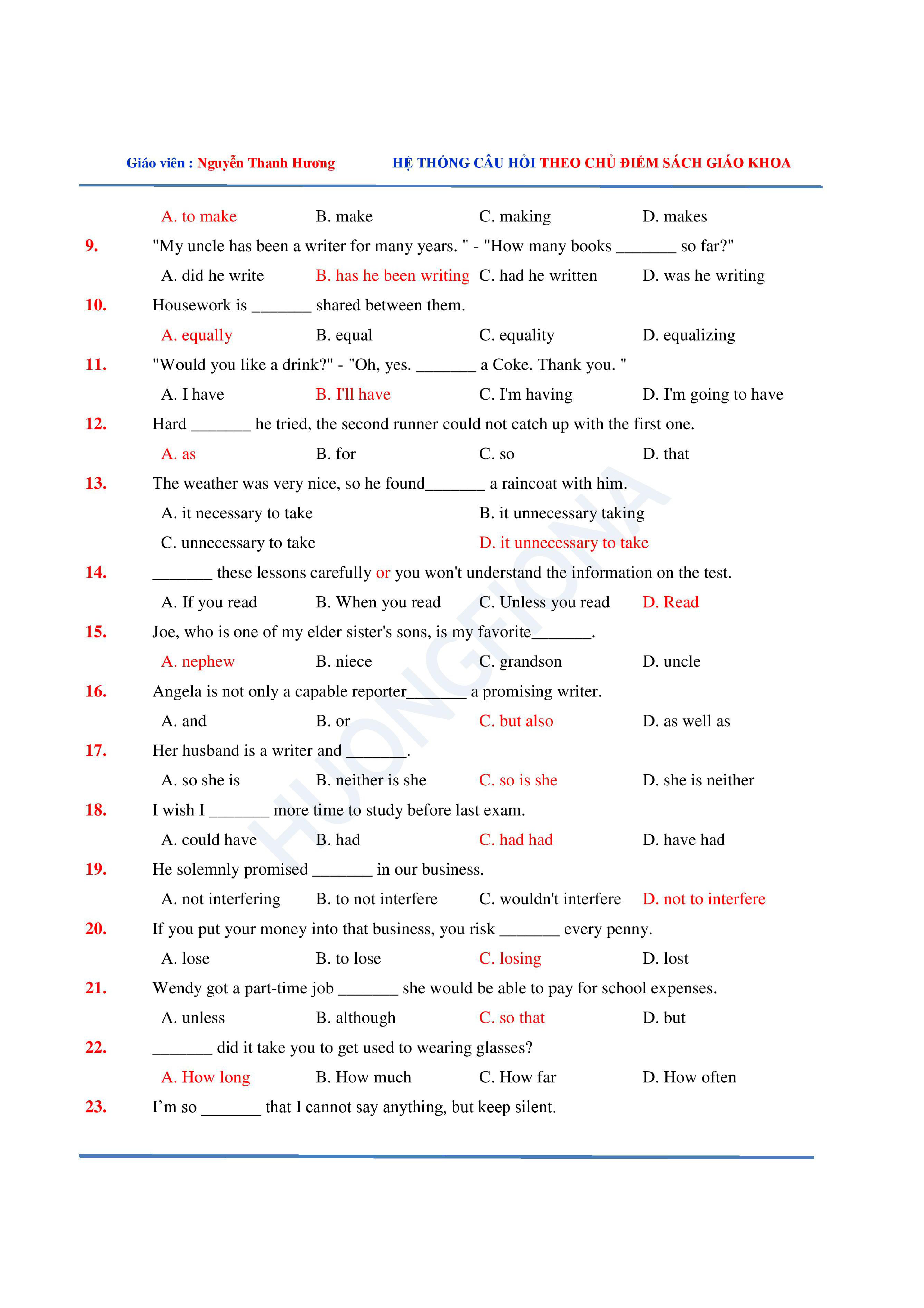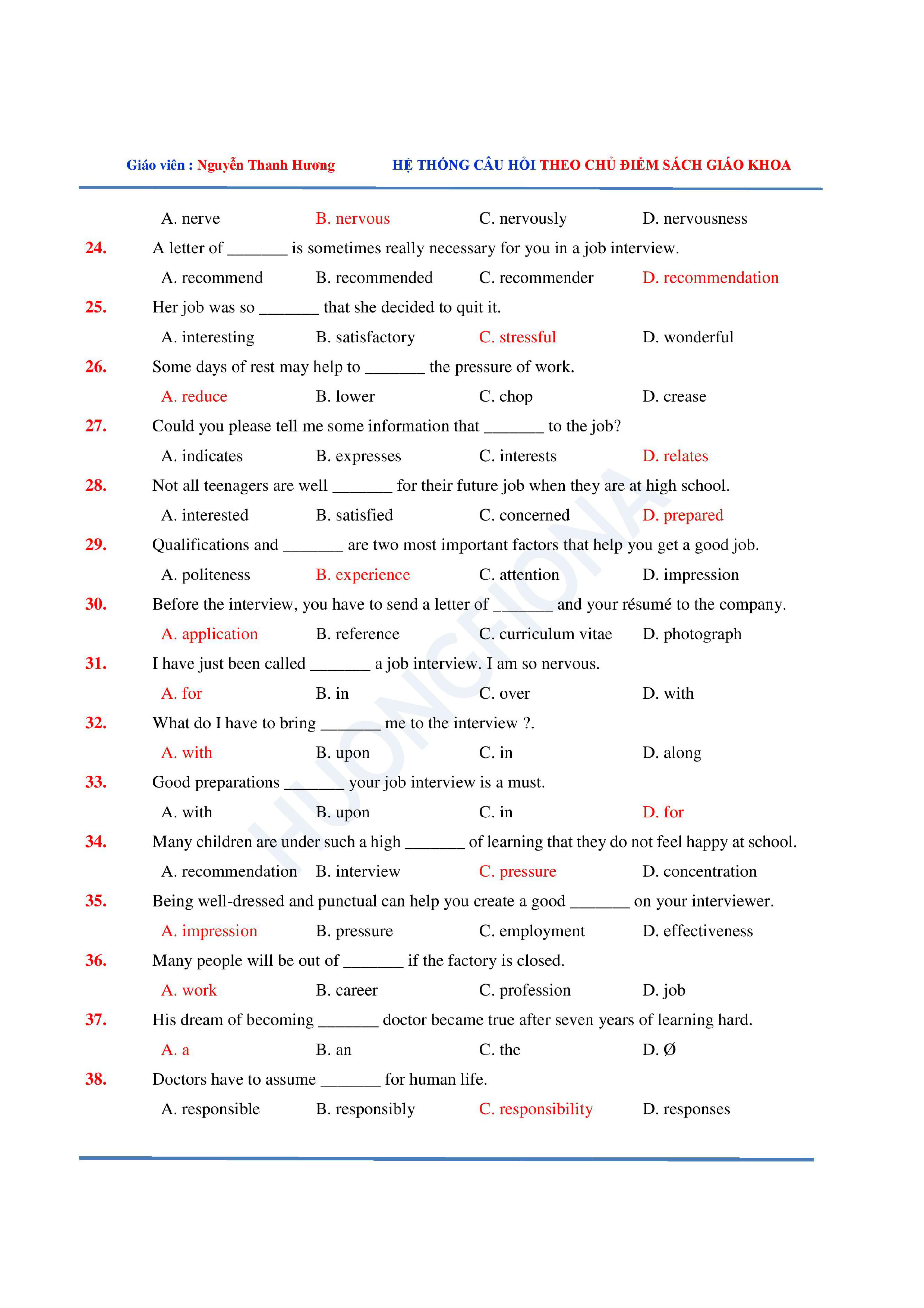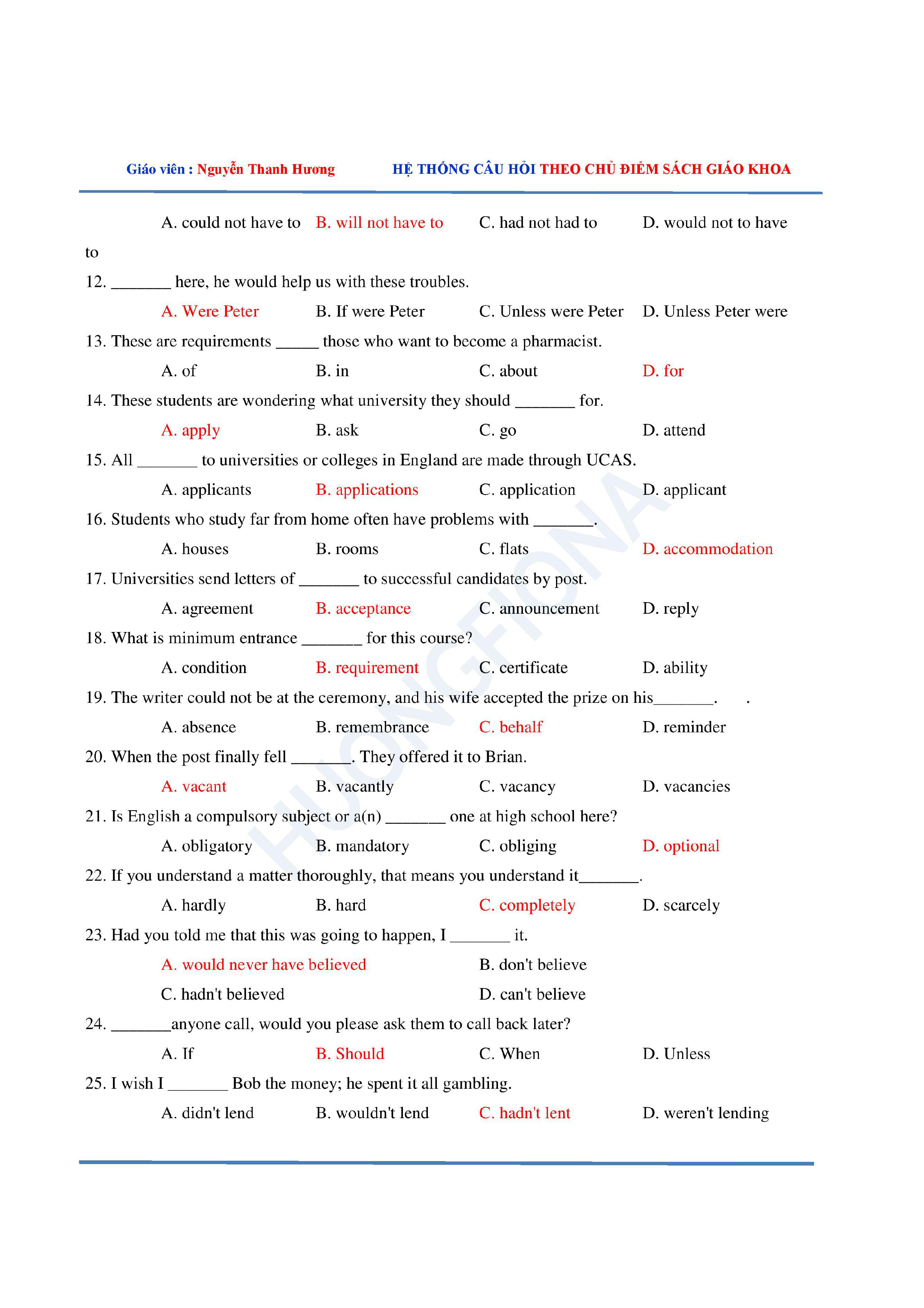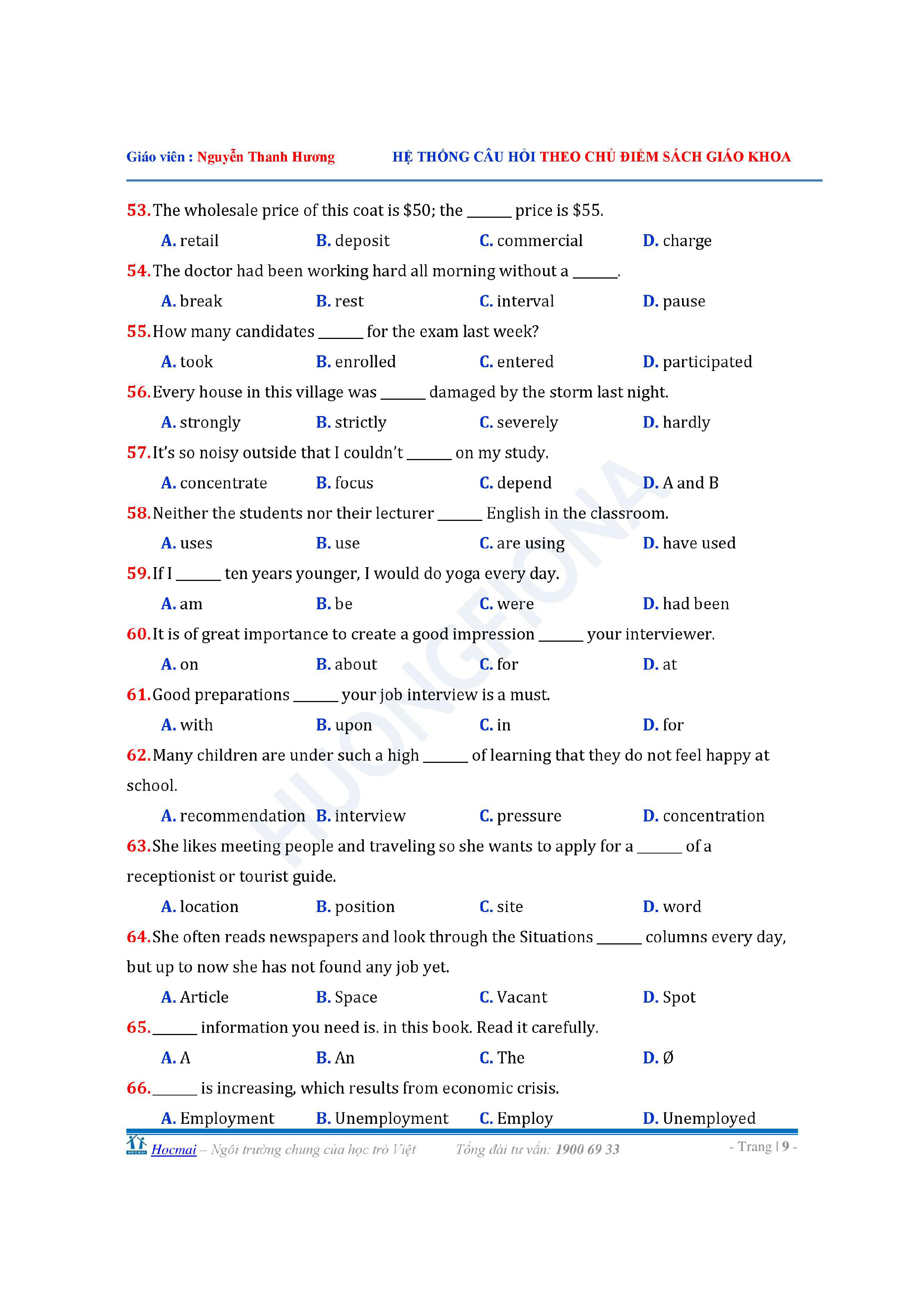 Câu hỏi trắc nghiệm Tiếng Anh theo từng chủ điểm (phần 2)