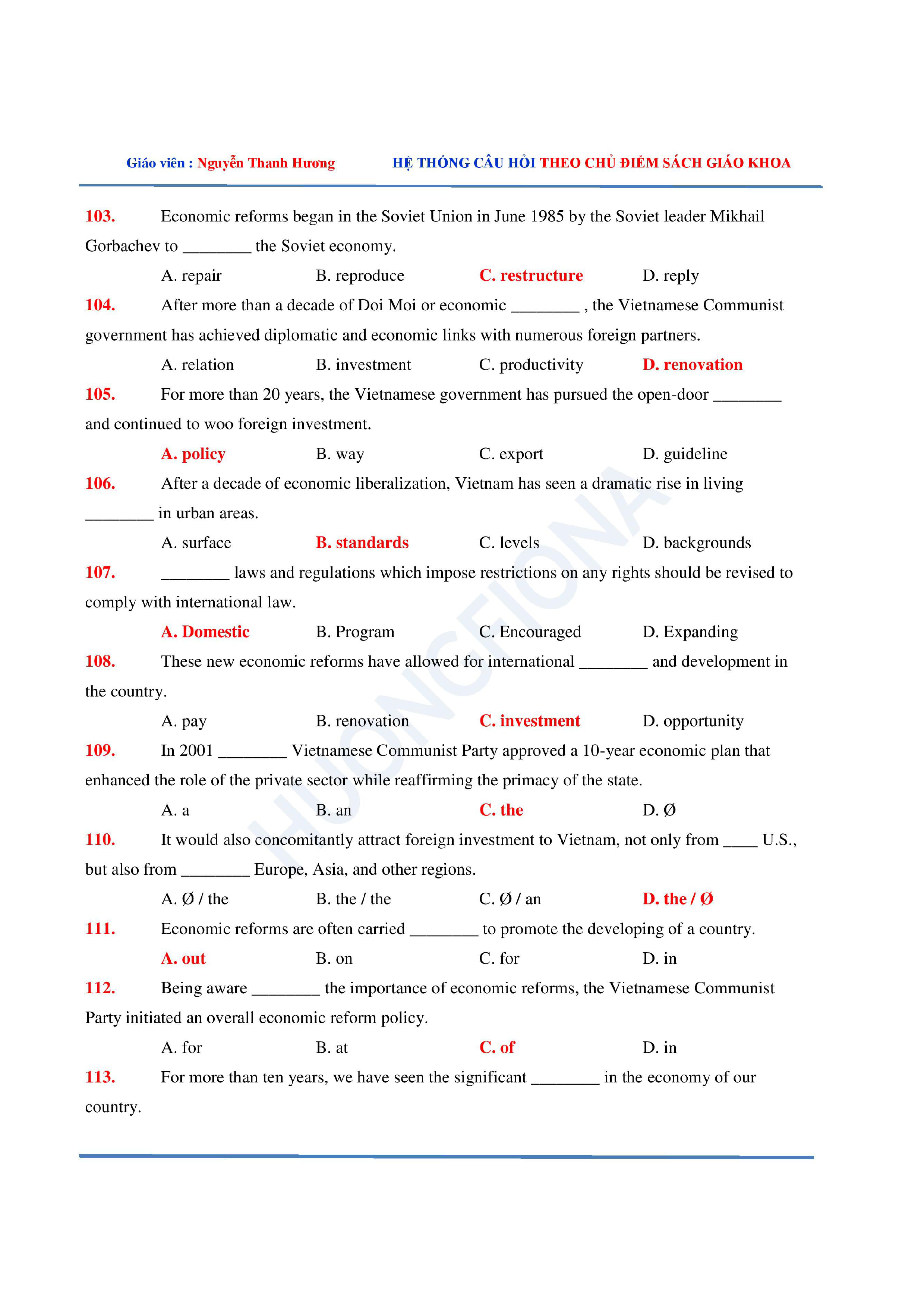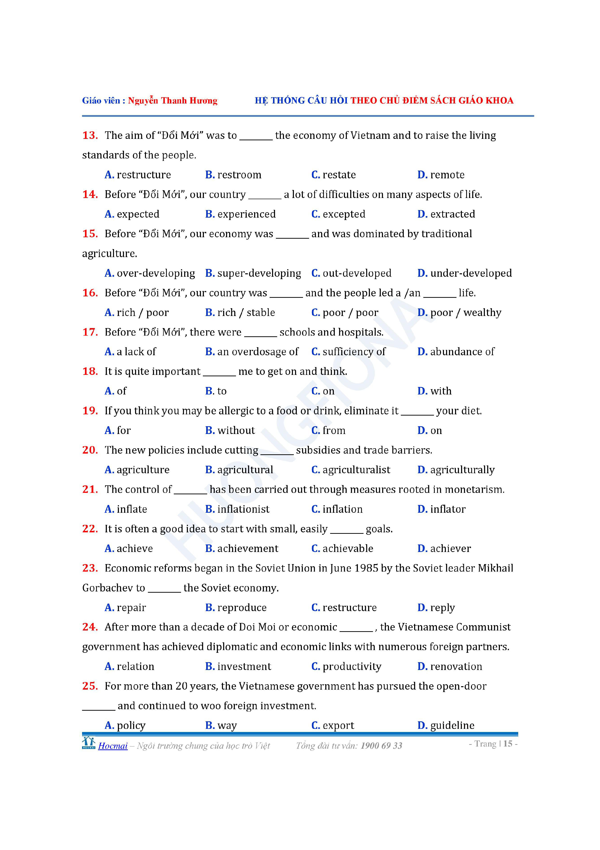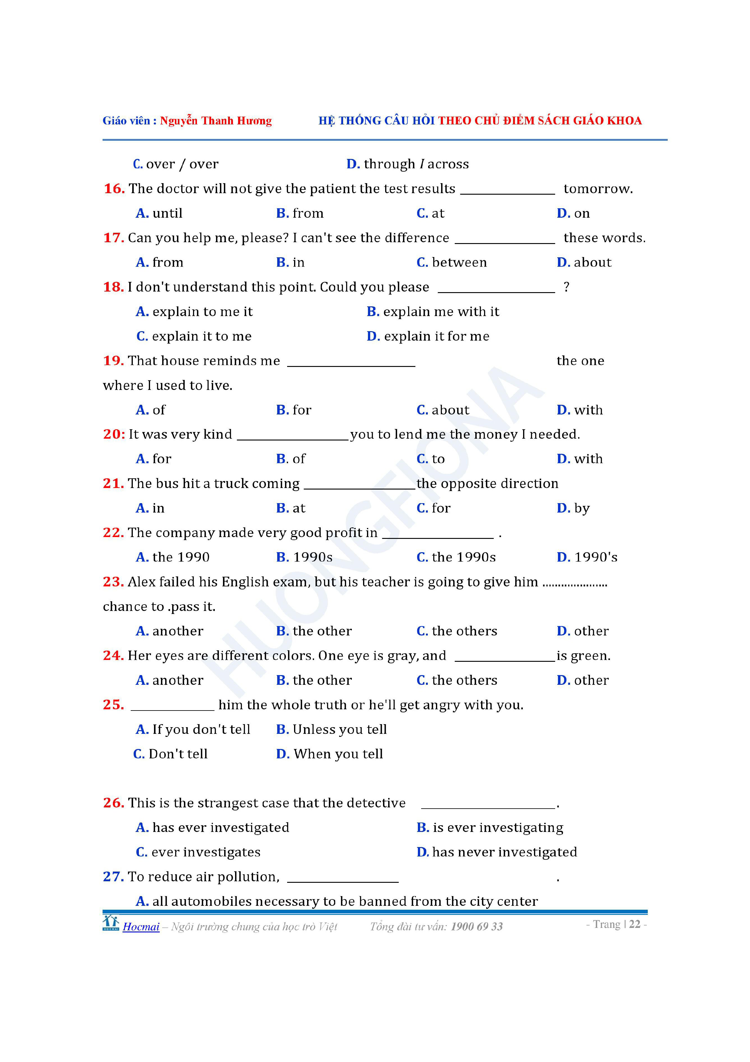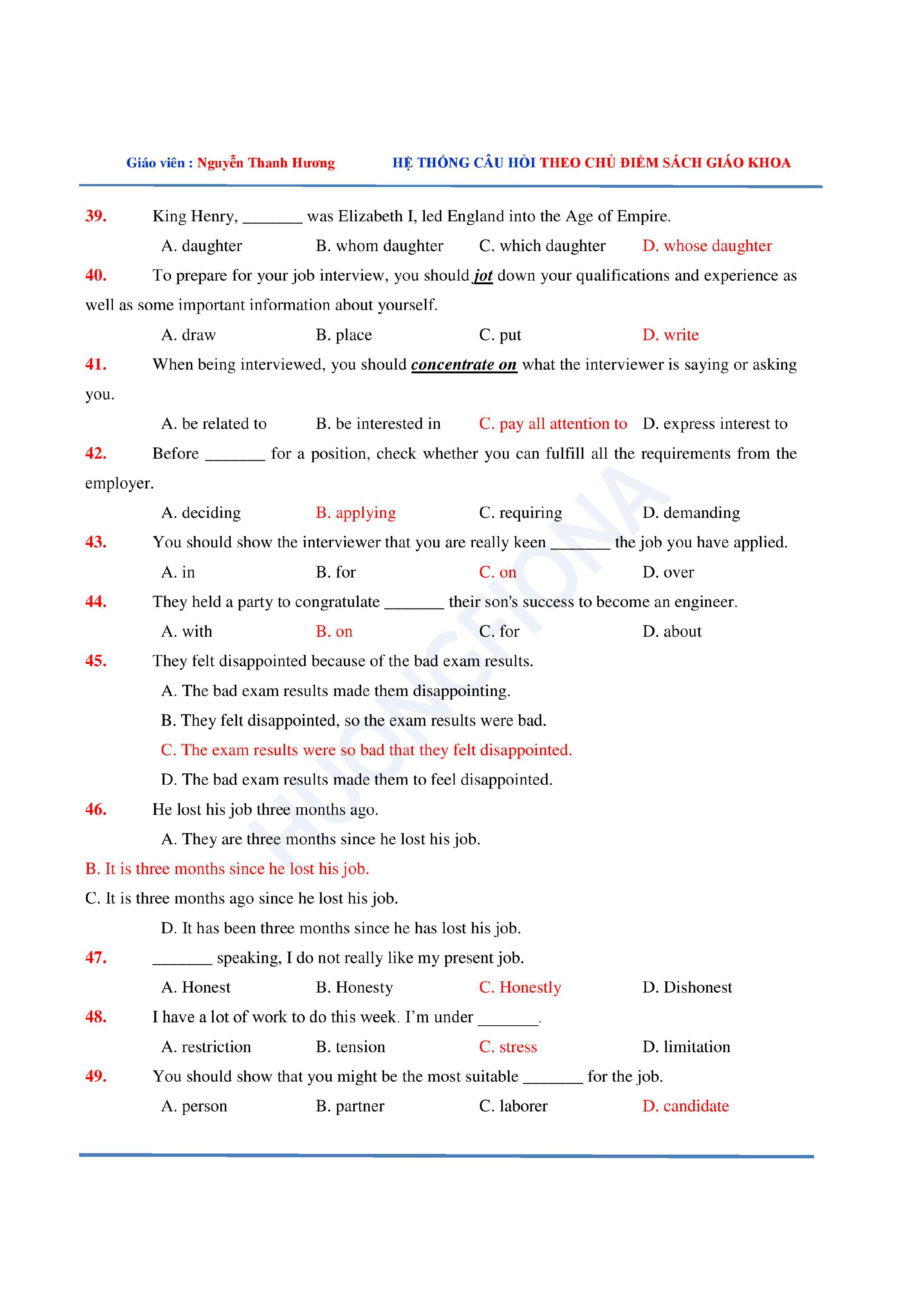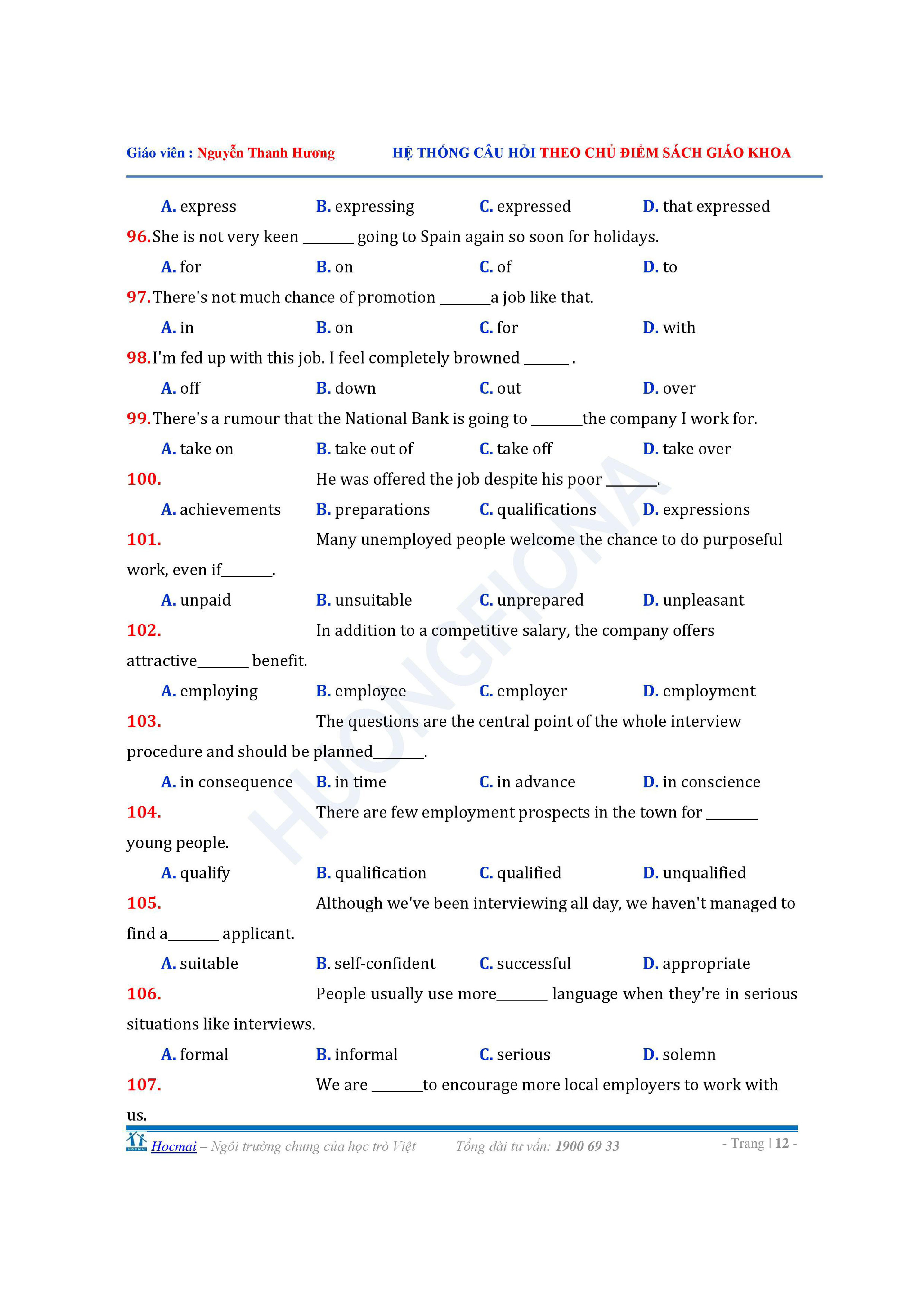 Câu hỏi trắc nghiệm Tiếng Anh theo từng chủ điểm (phần 2)