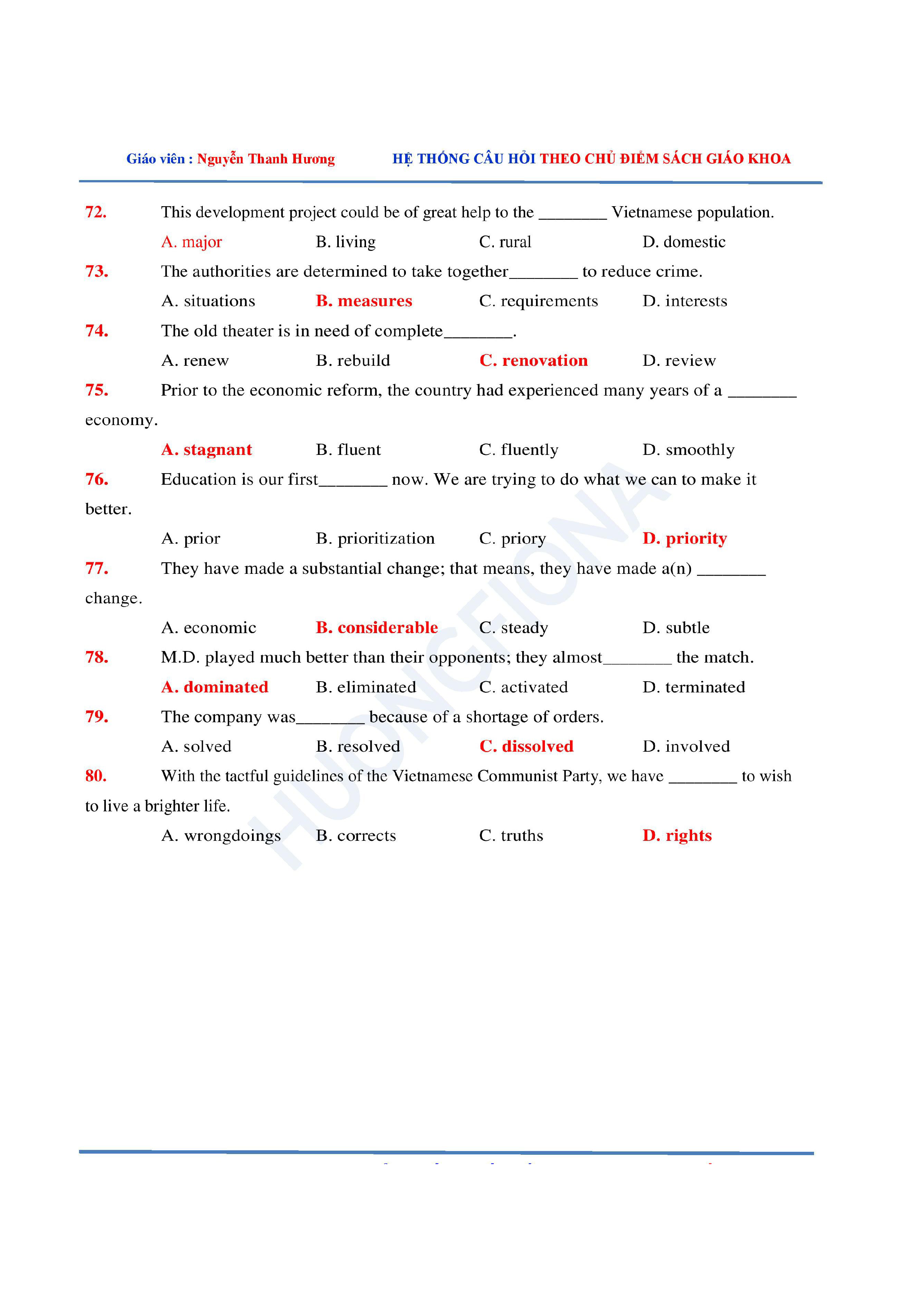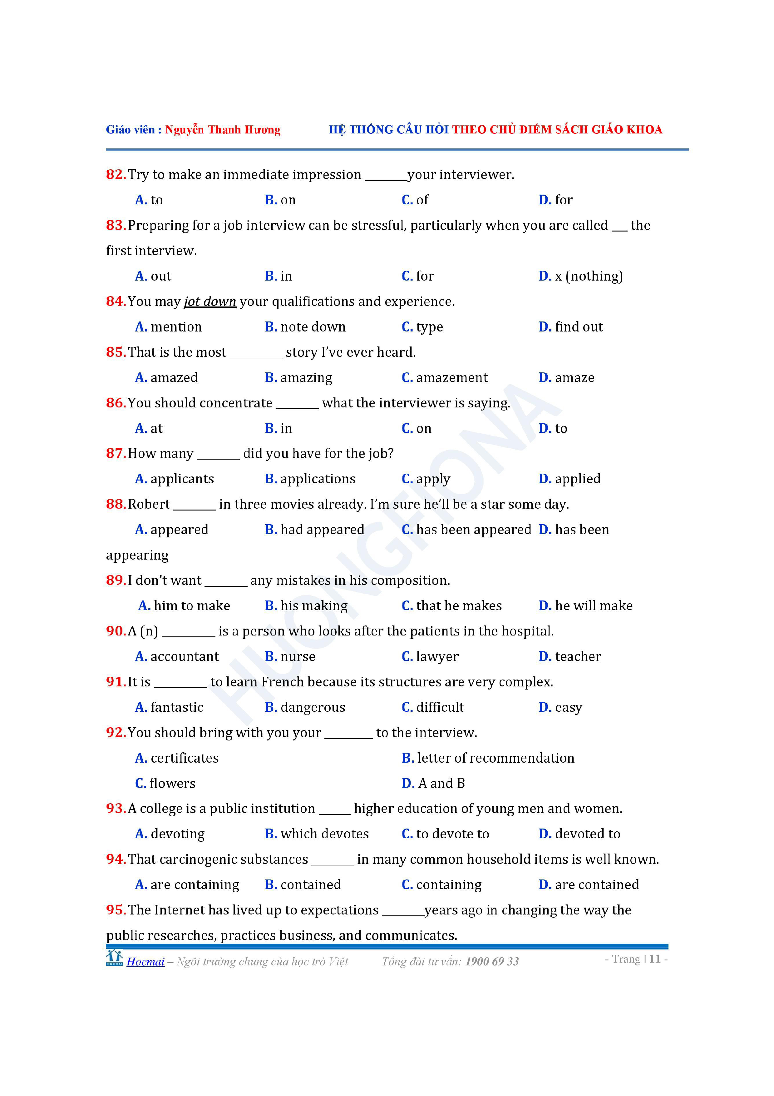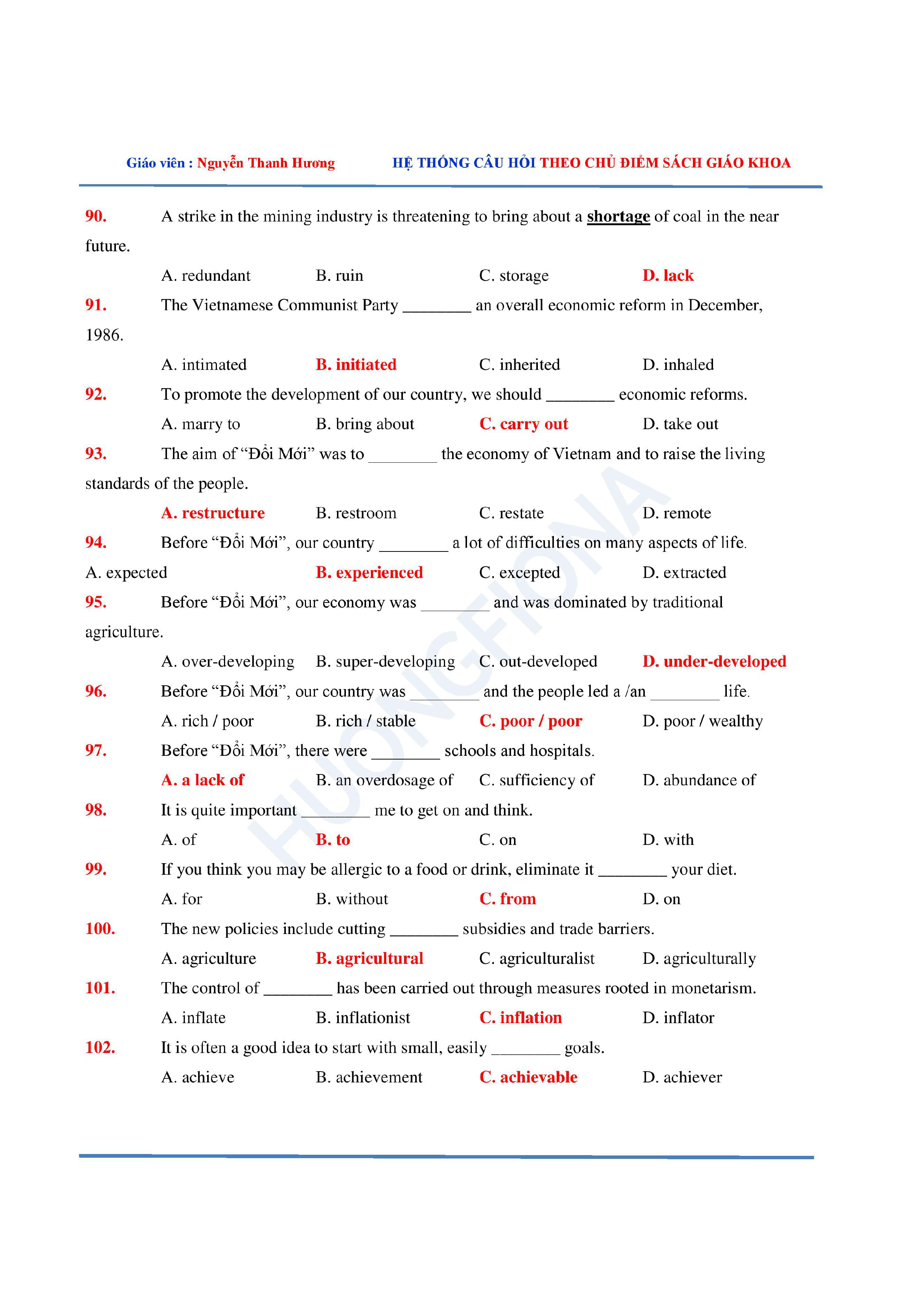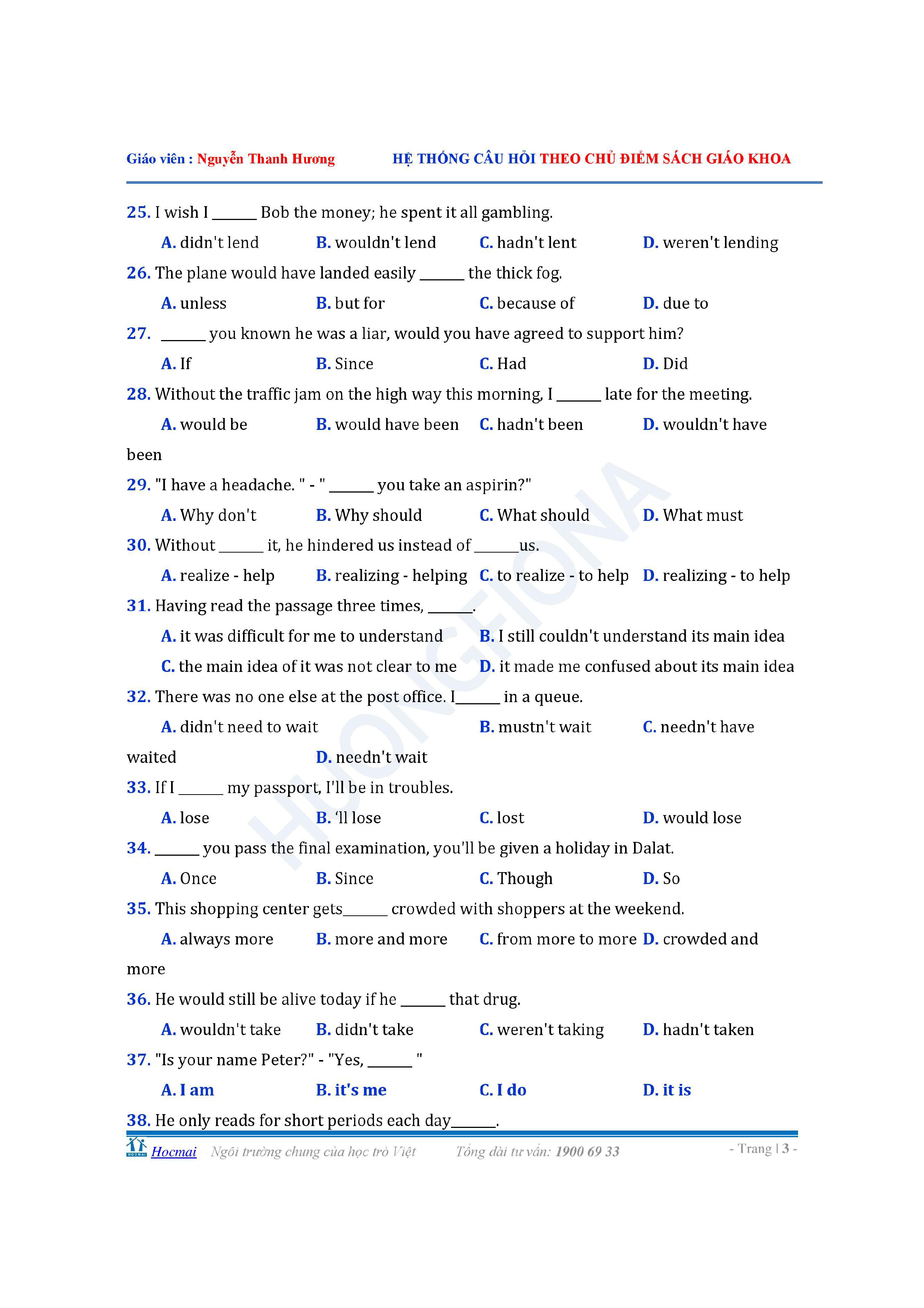 Câu hỏi trắc nghiệm Tiếng Anh theo từng chủ điểm (phần 2)