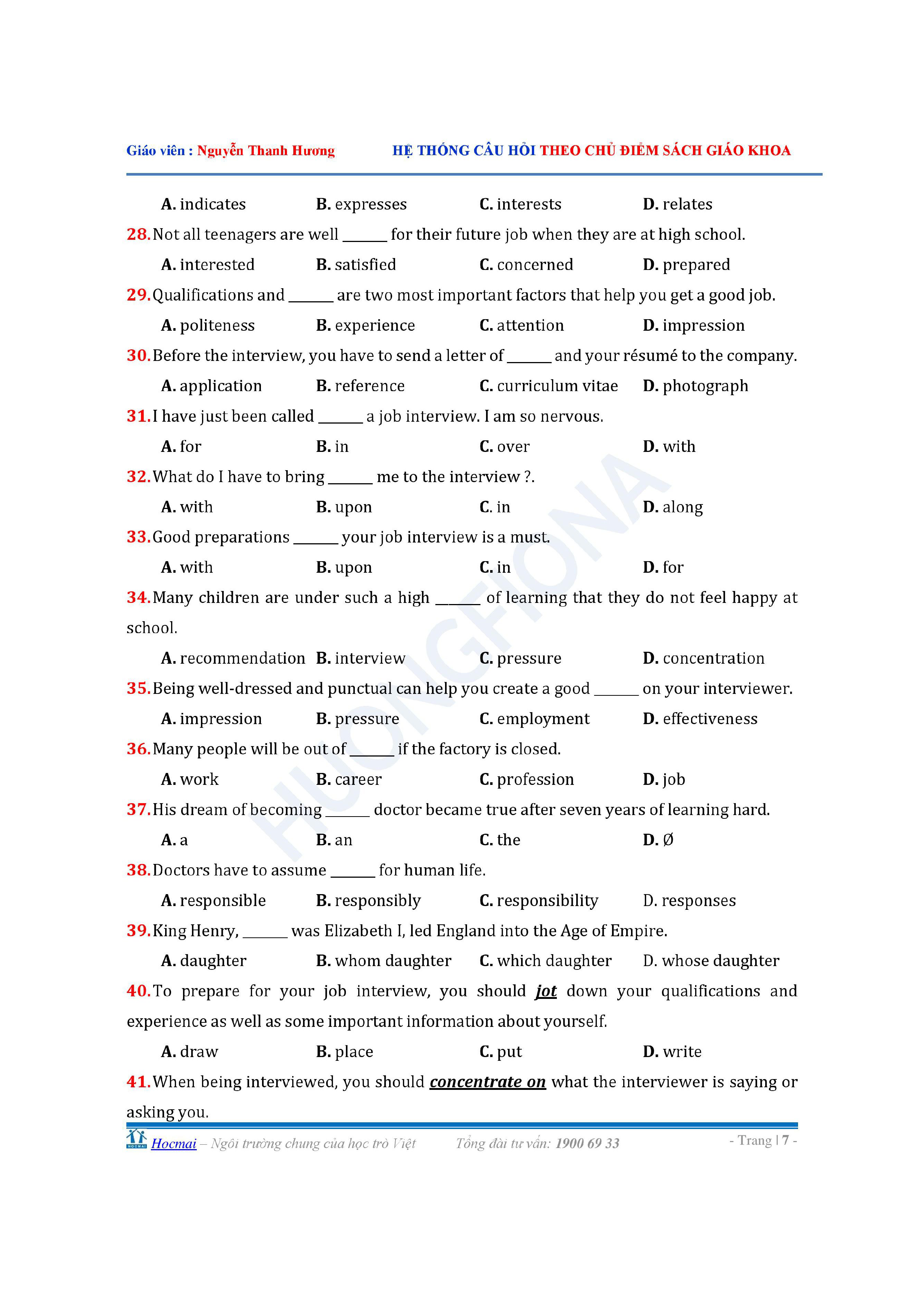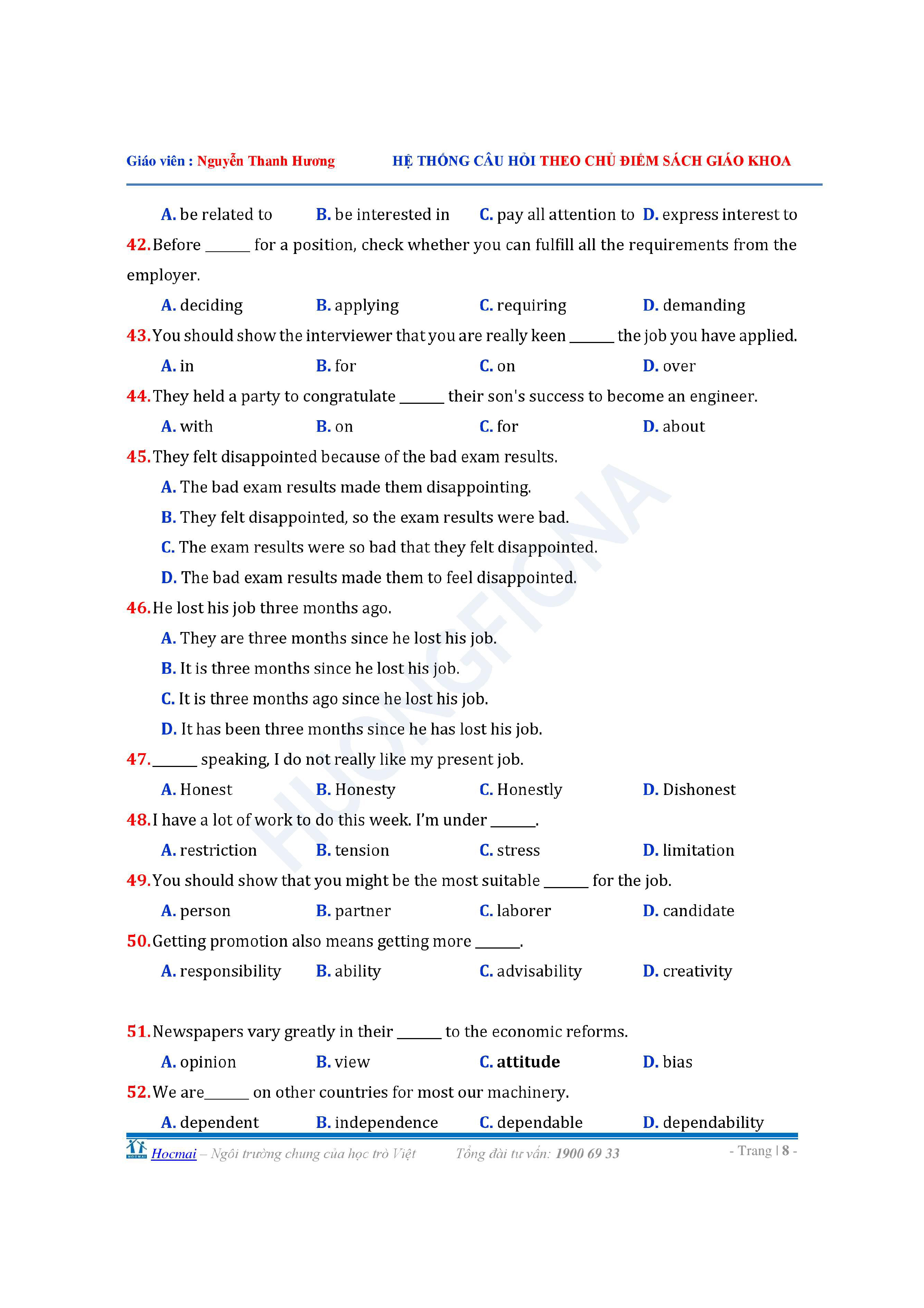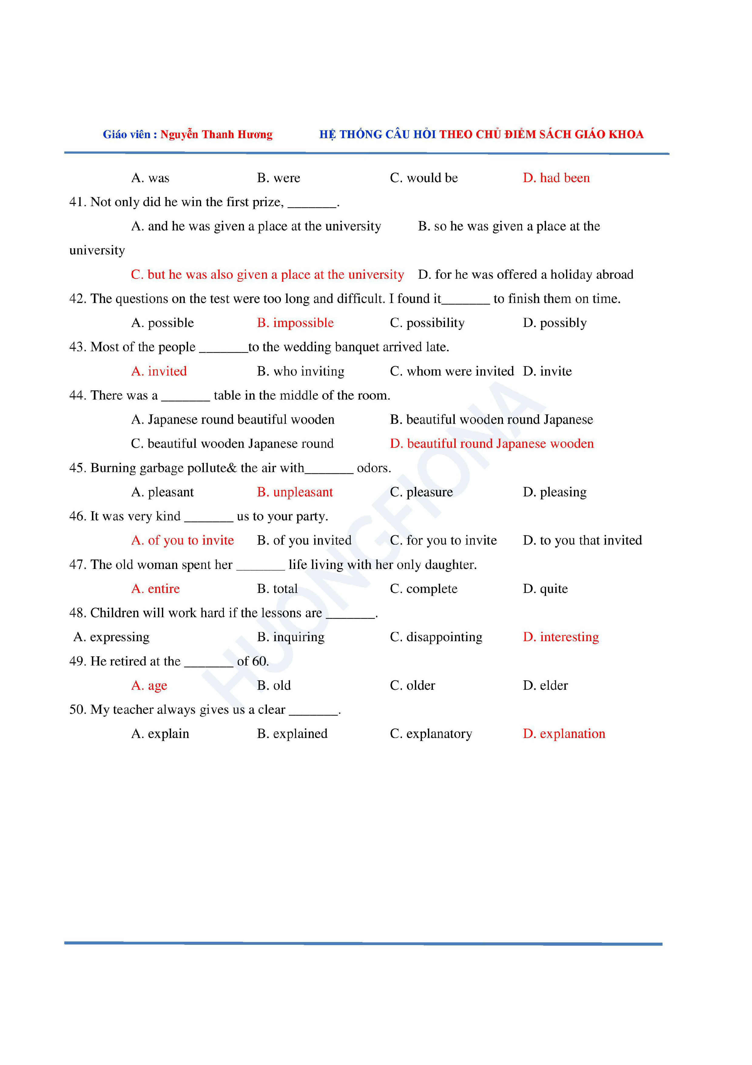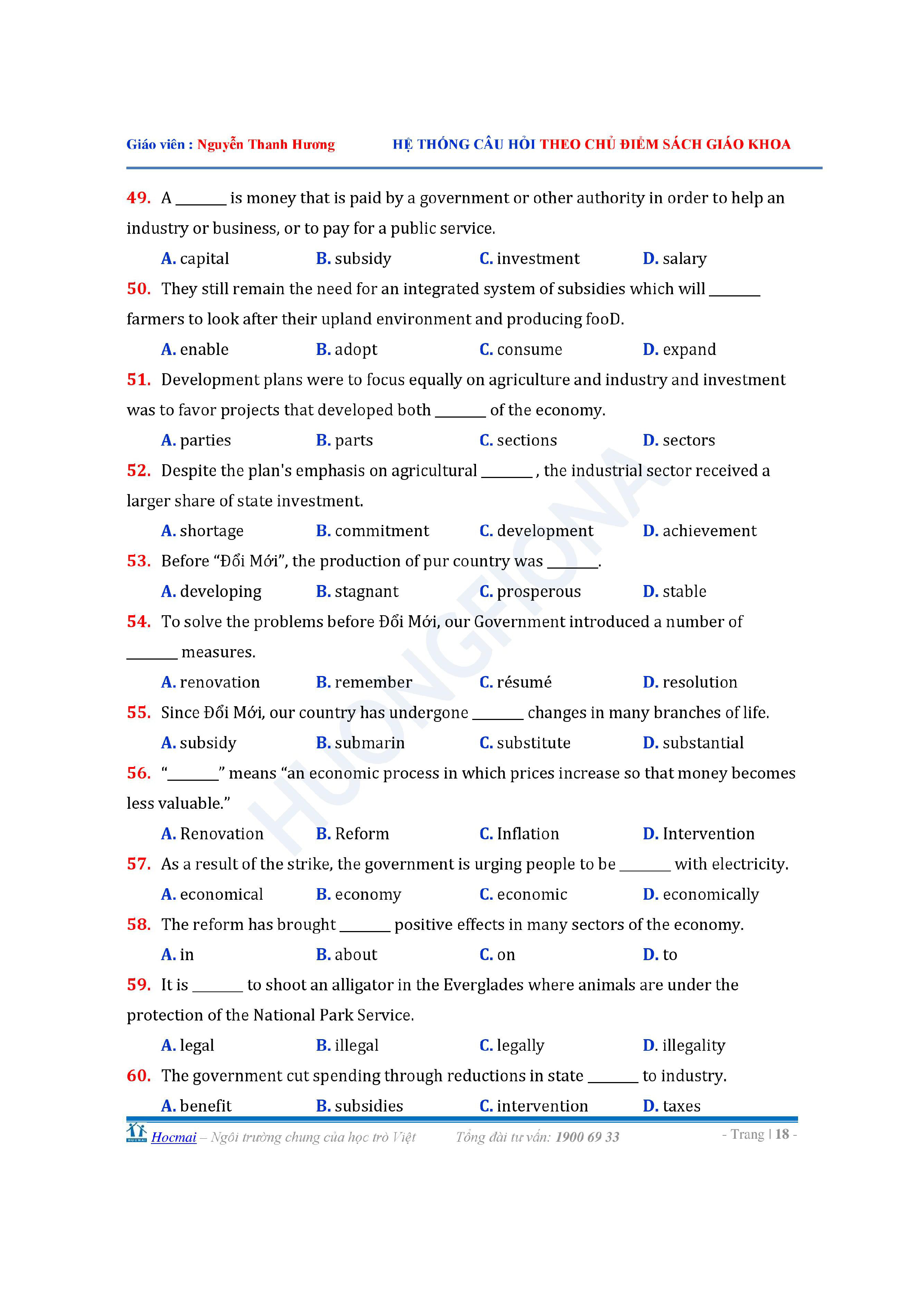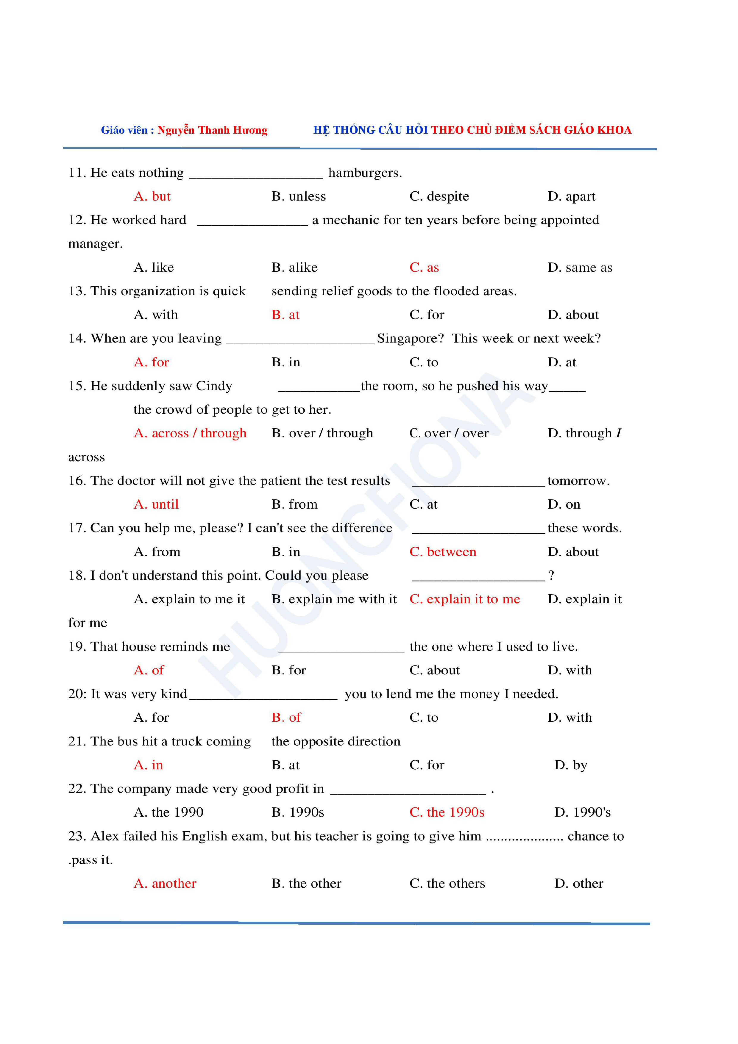 Câu hỏi trắc nghiệm Tiếng Anh theo từng chủ điểm (phần 2)