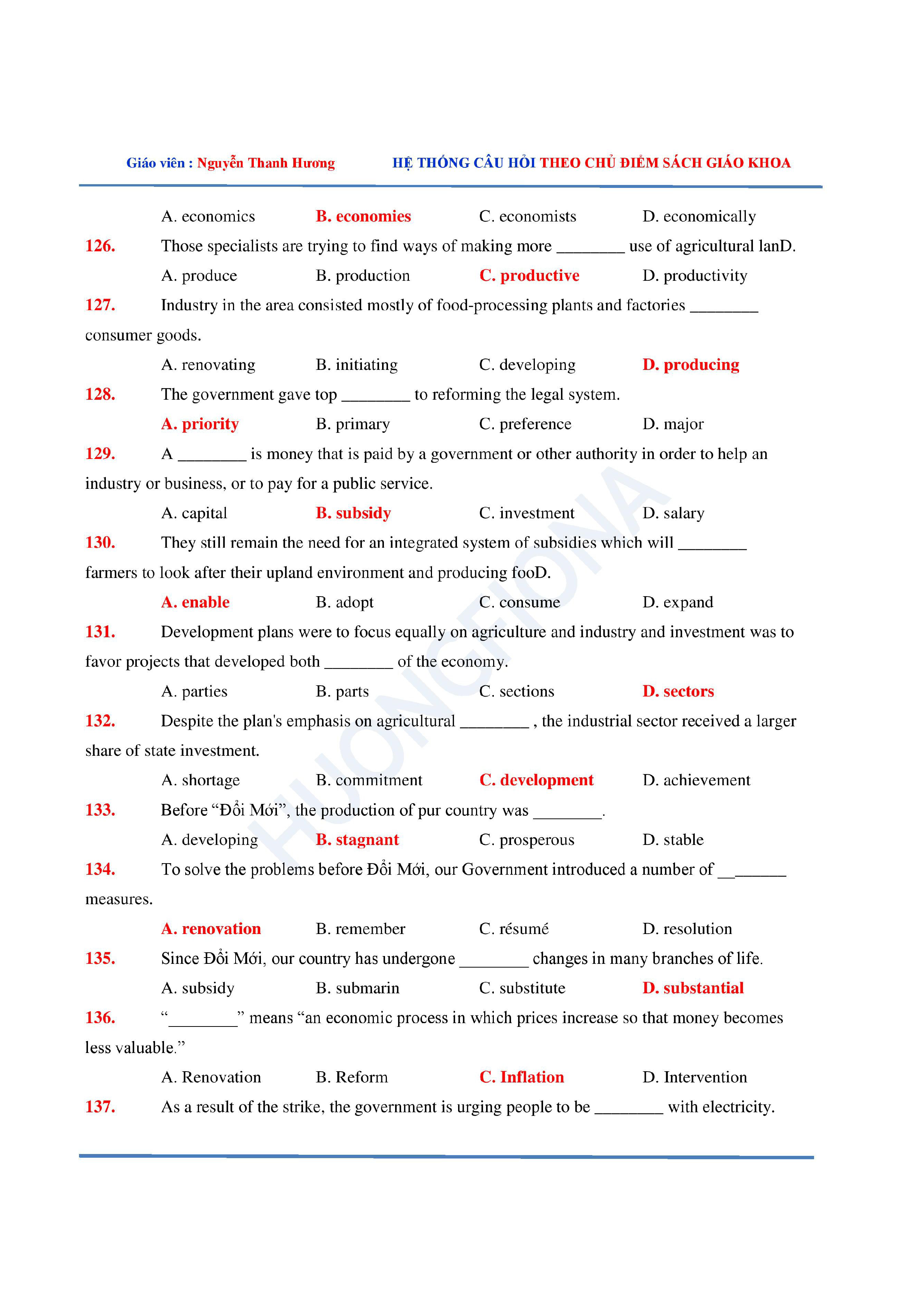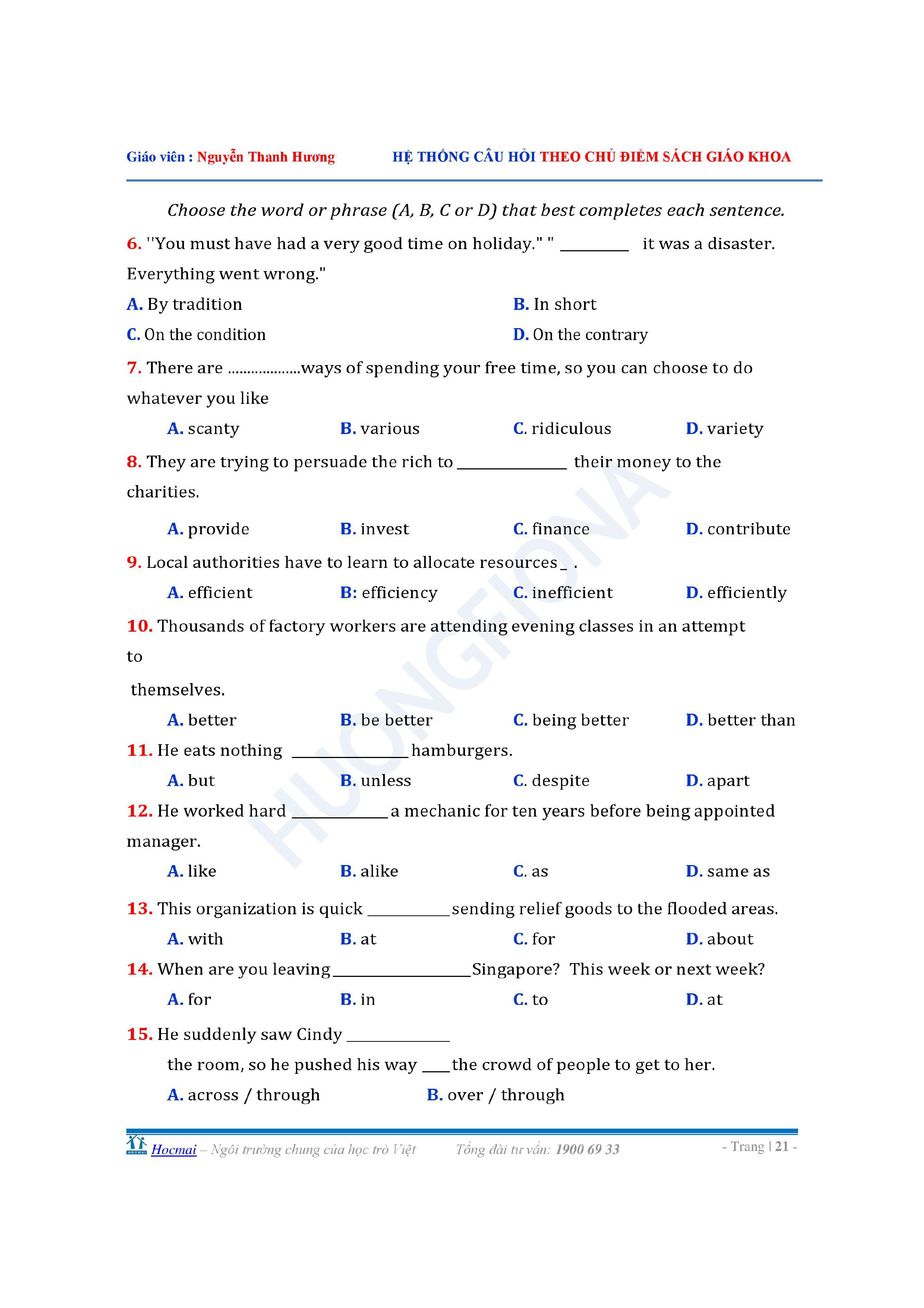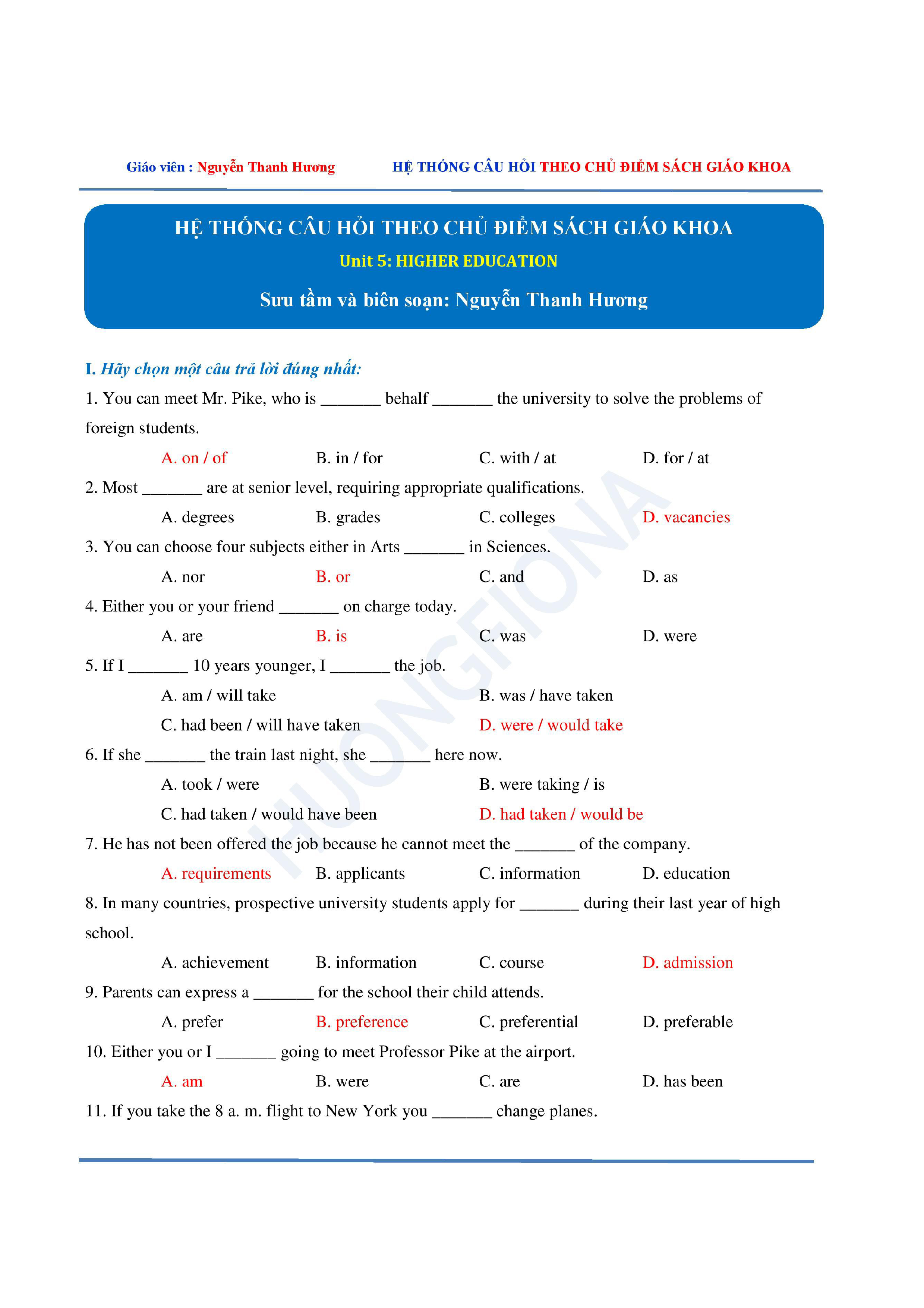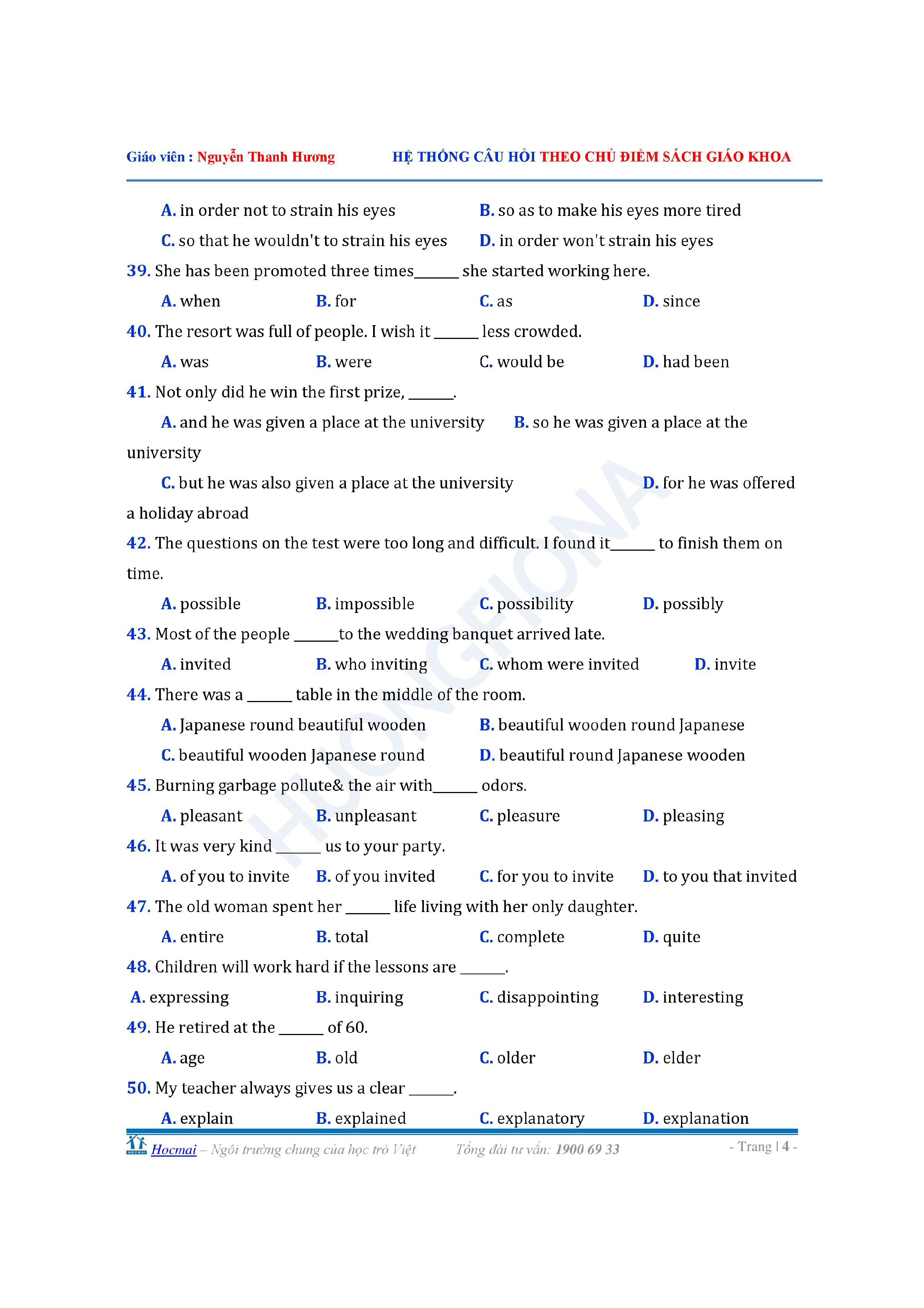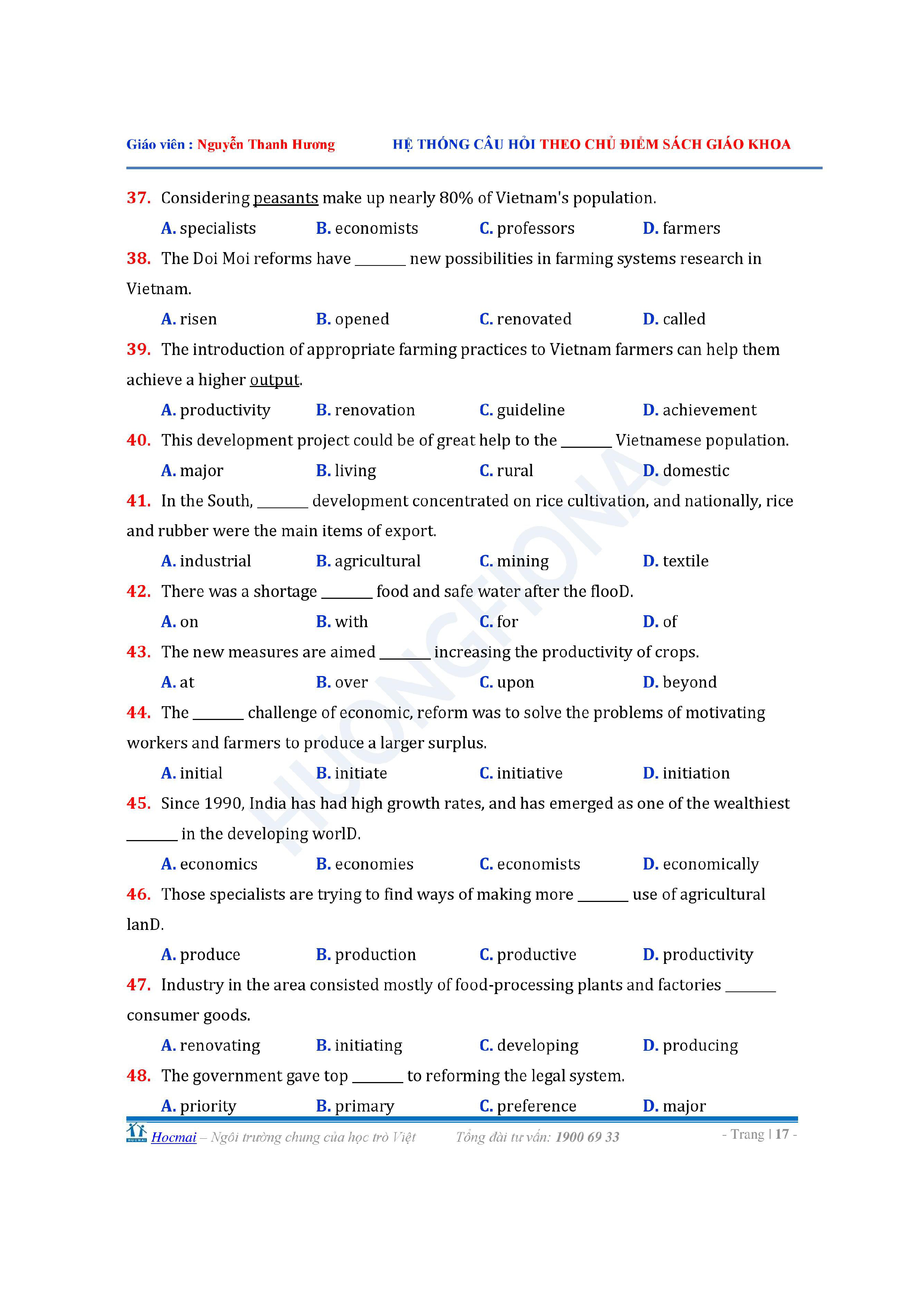 Câu hỏi trắc nghiệm Tiếng Anh theo từng chủ điểm (phần 2)