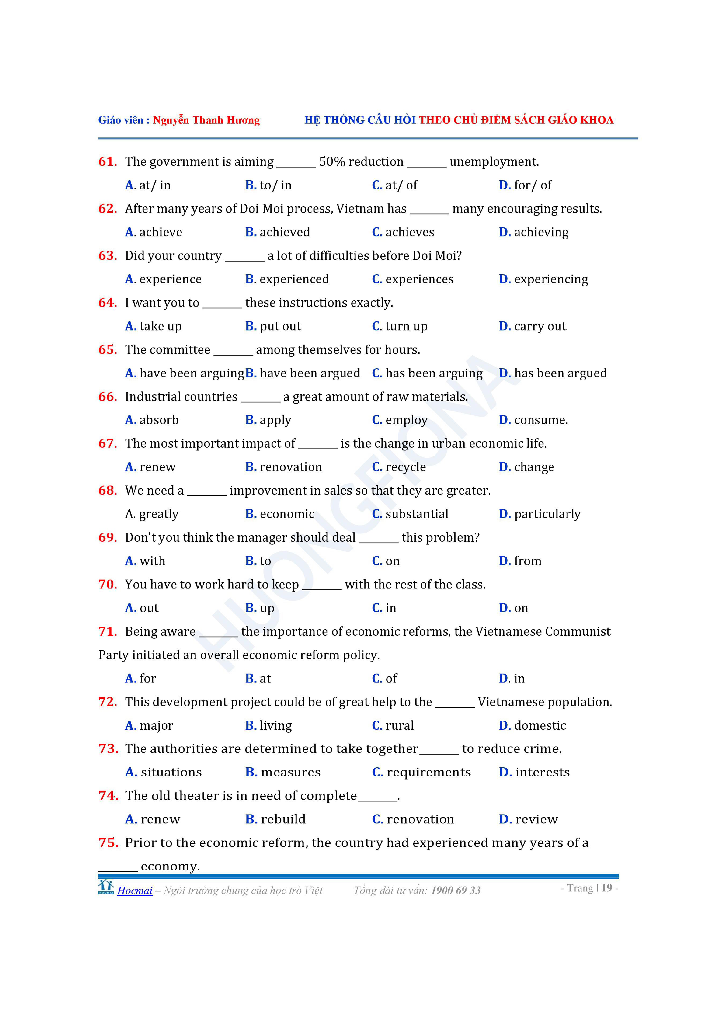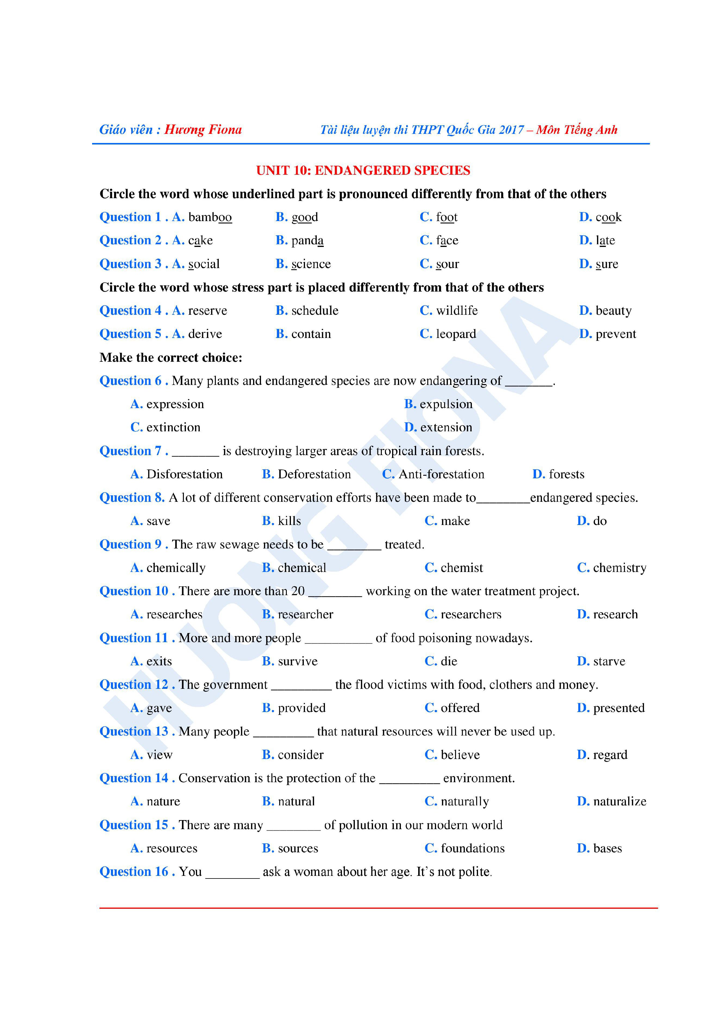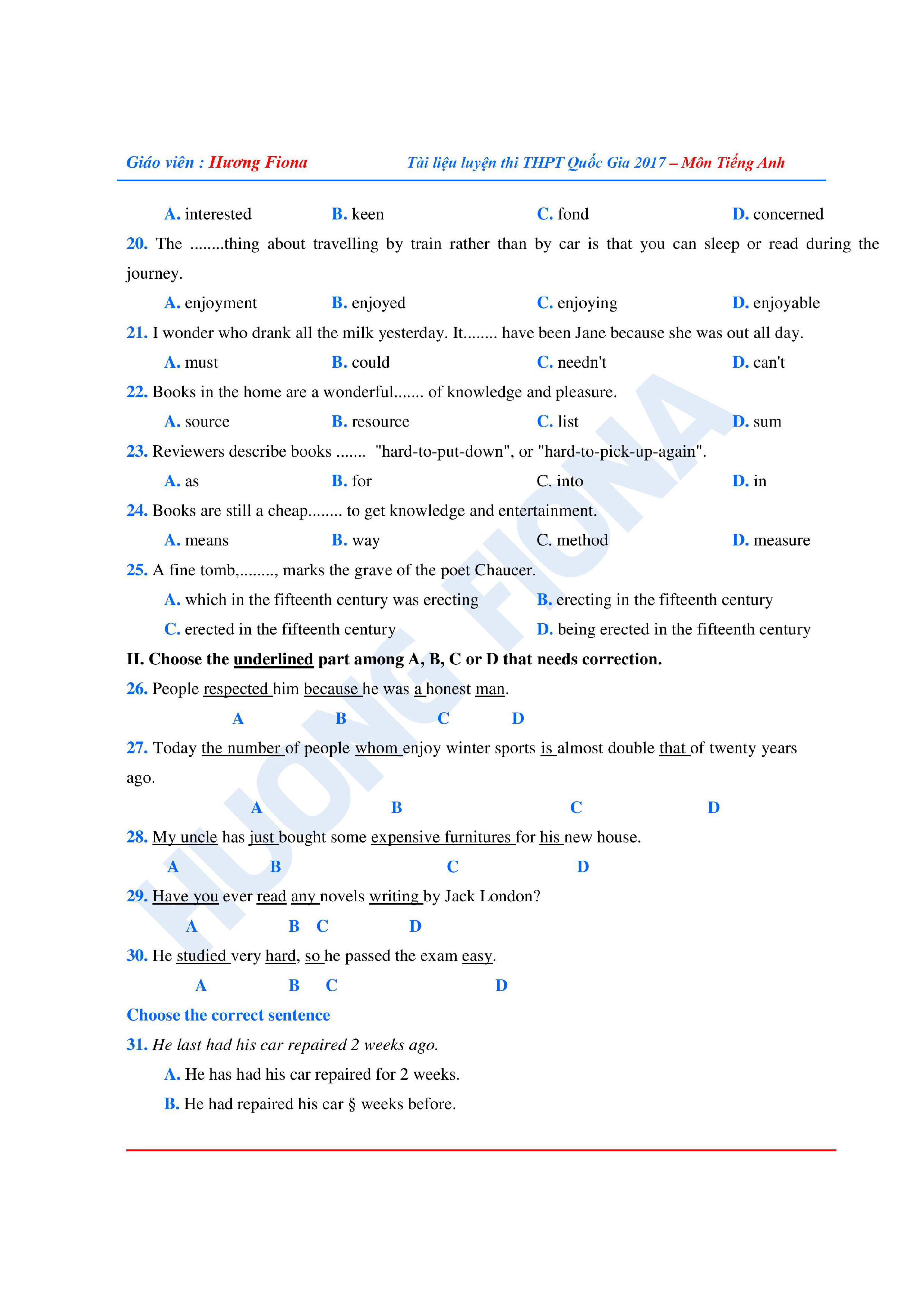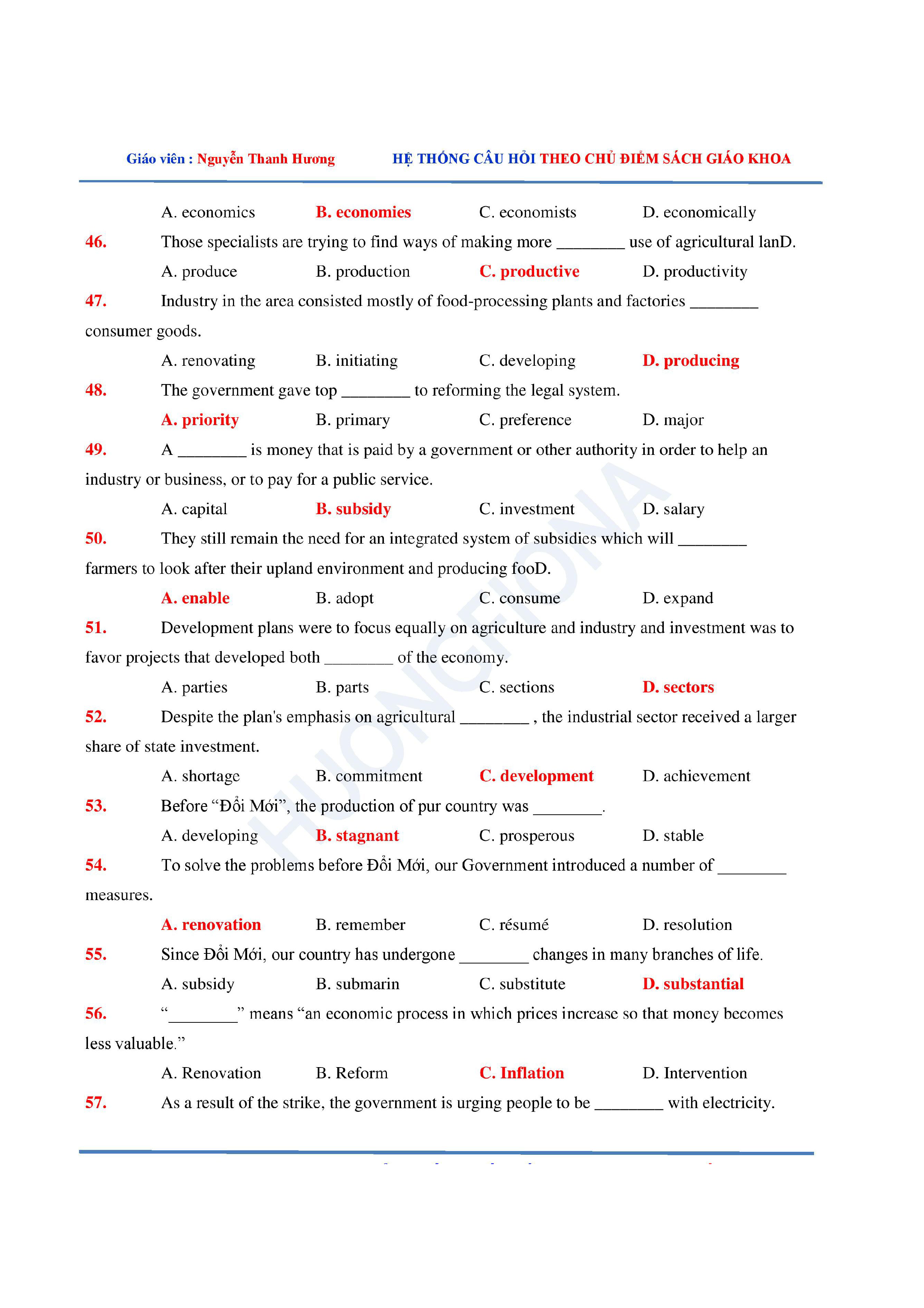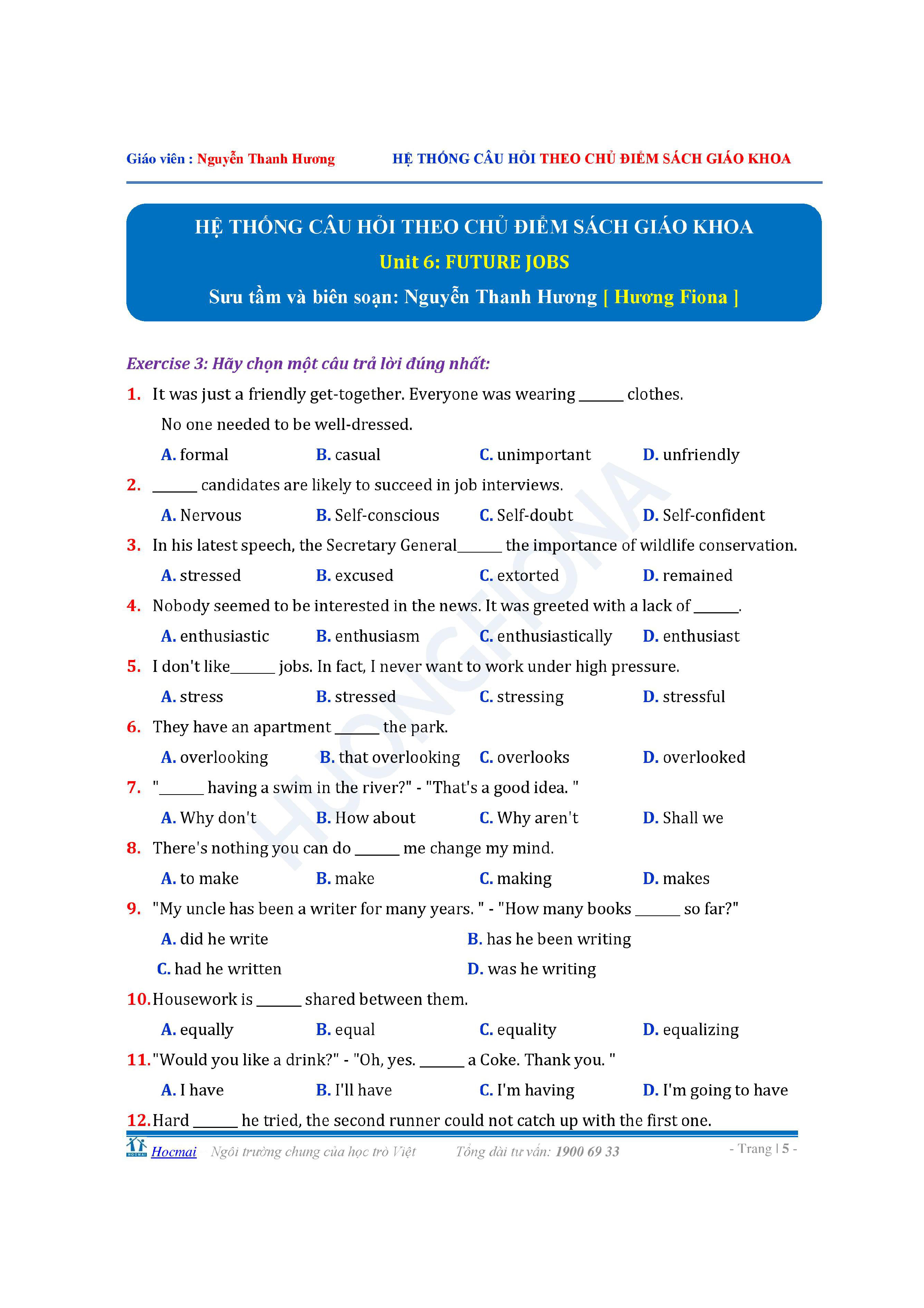 Câu hỏi trắc nghiệm Tiếng Anh theo từng chủ điểm (phần 2)