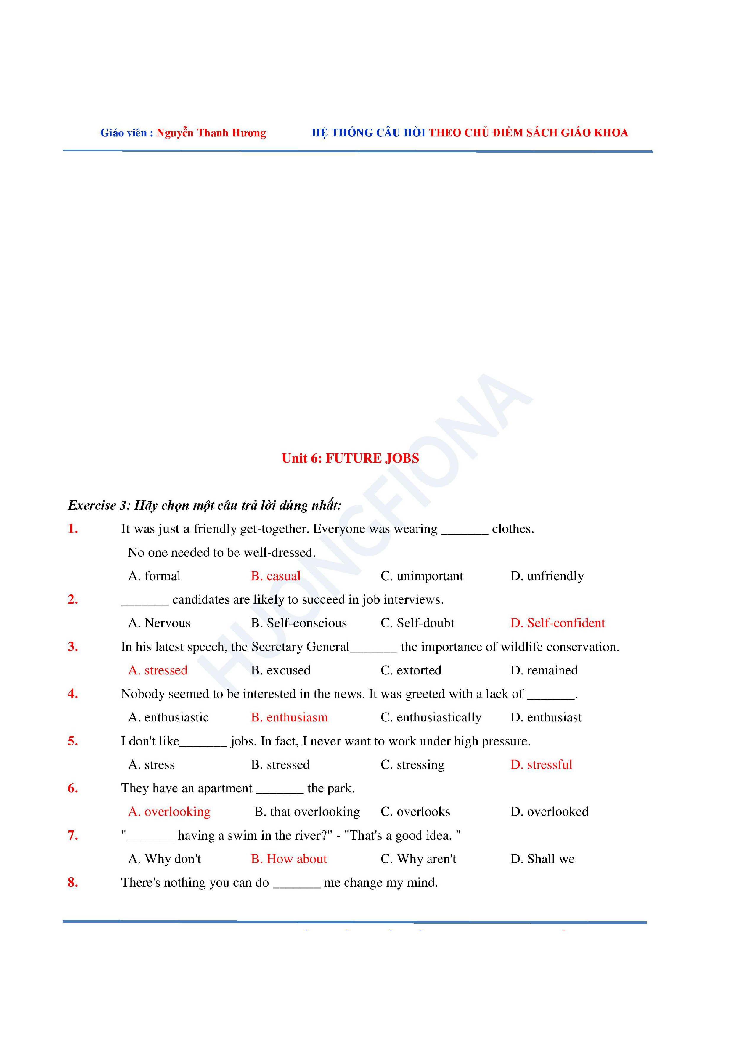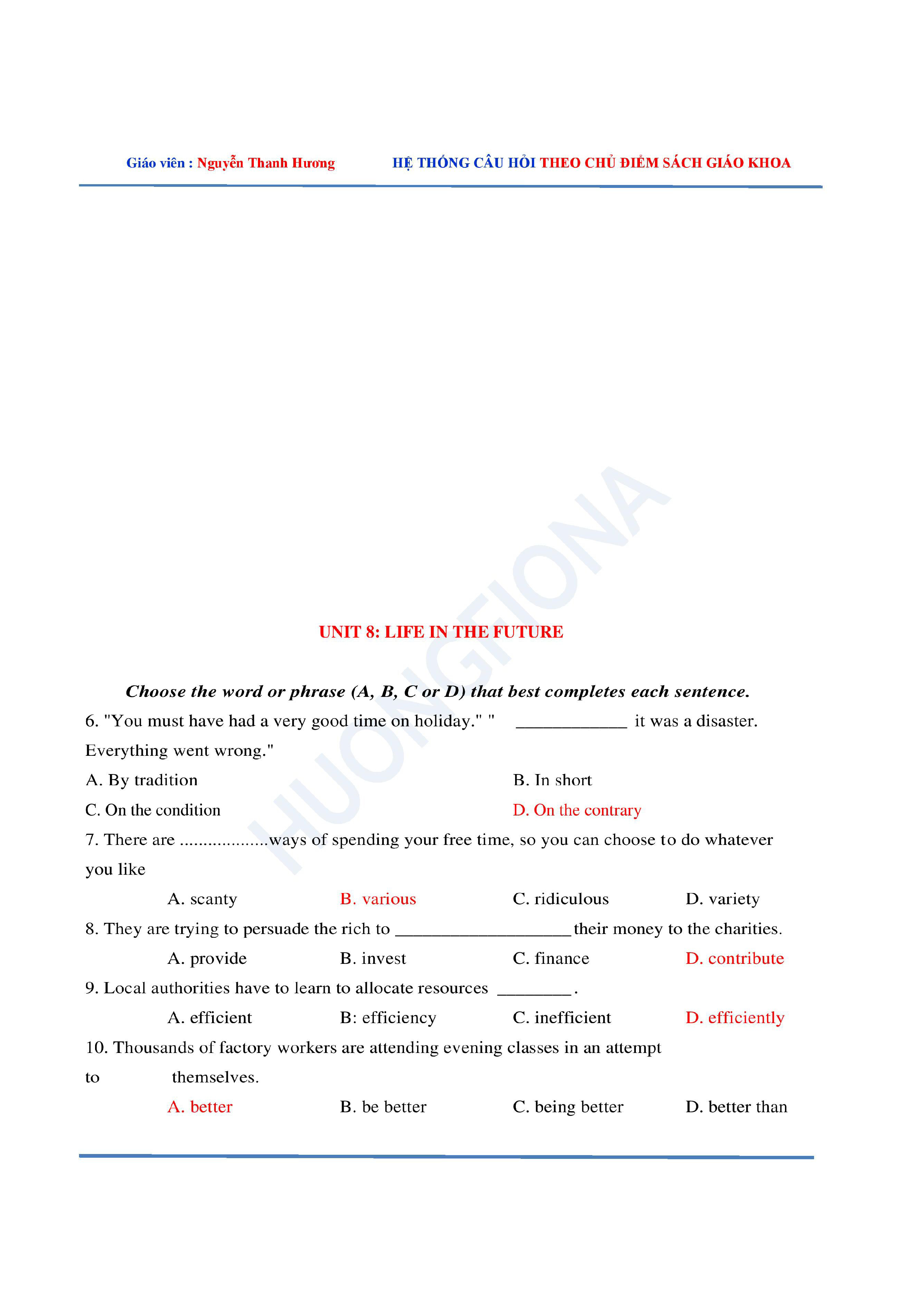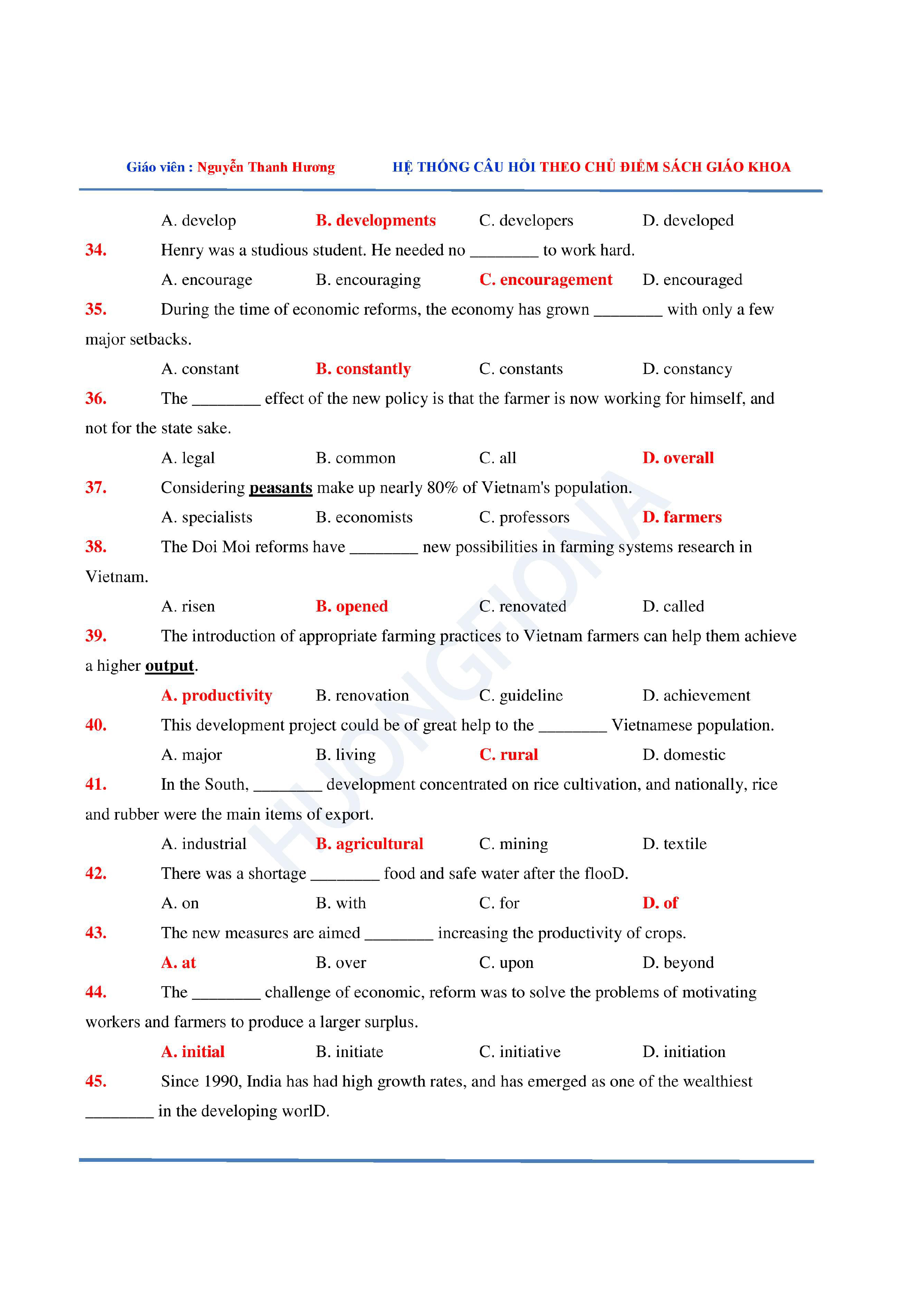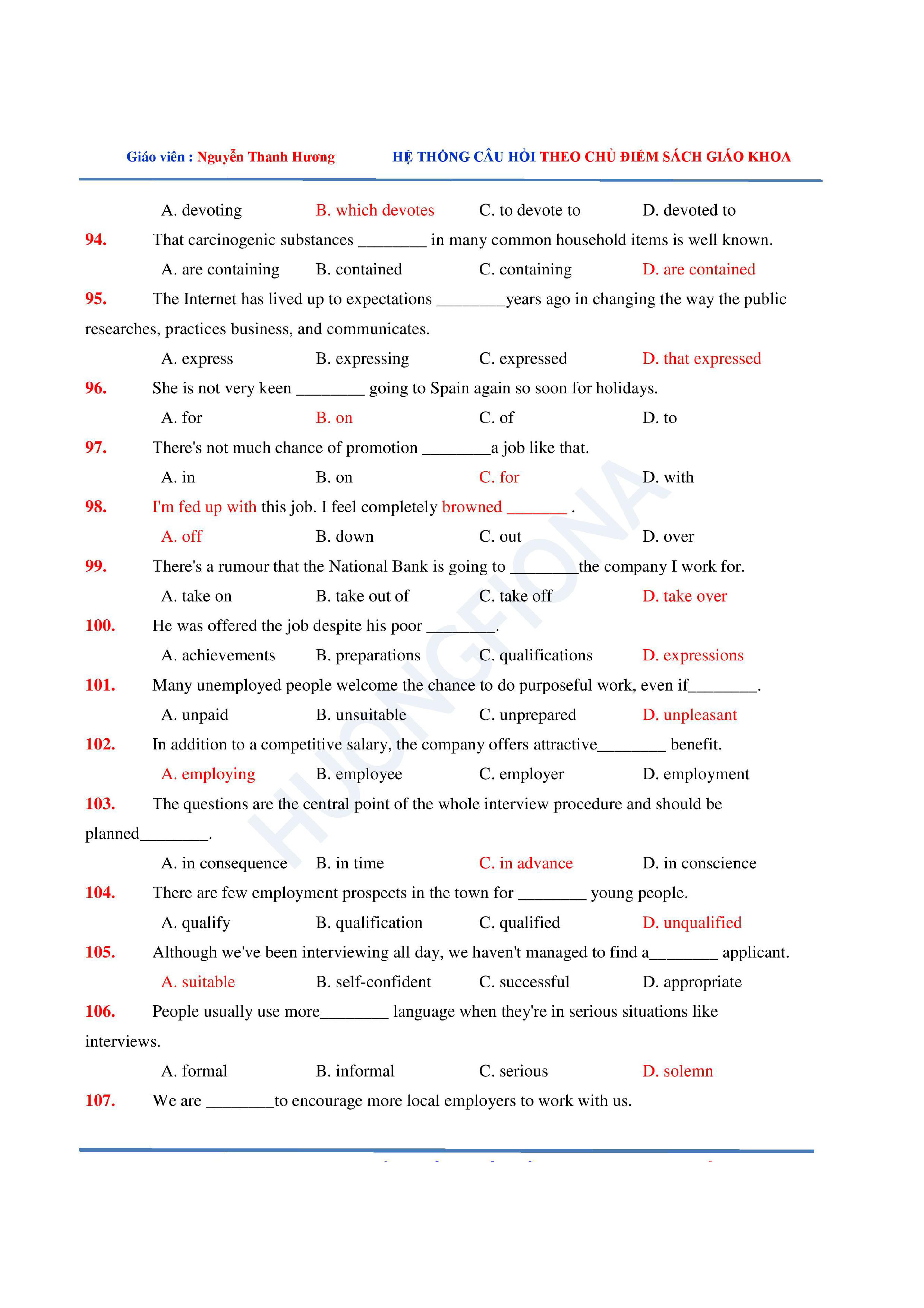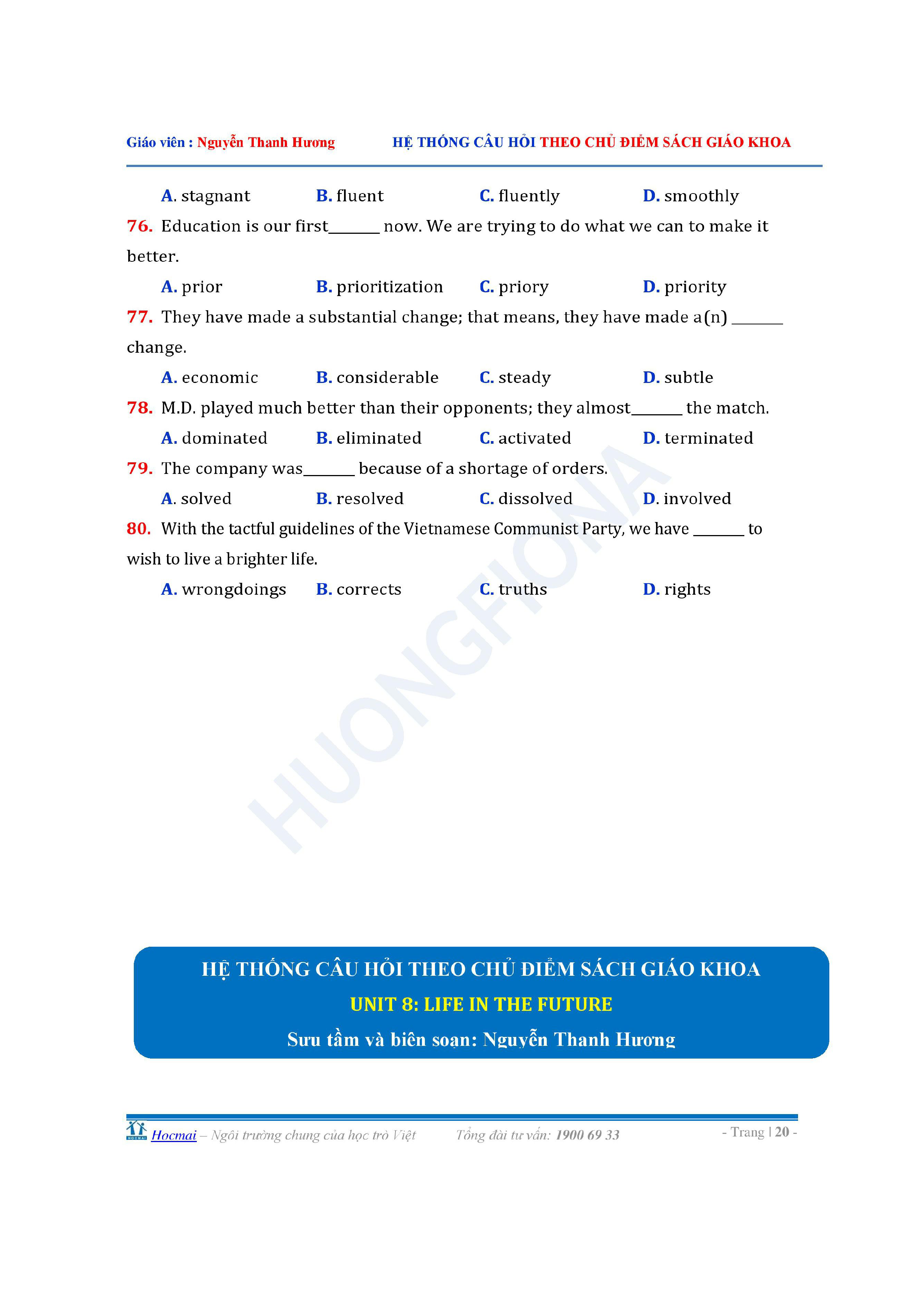 Câu hỏi trắc nghiệm Tiếng Anh theo từng chủ điểm (phần 2)