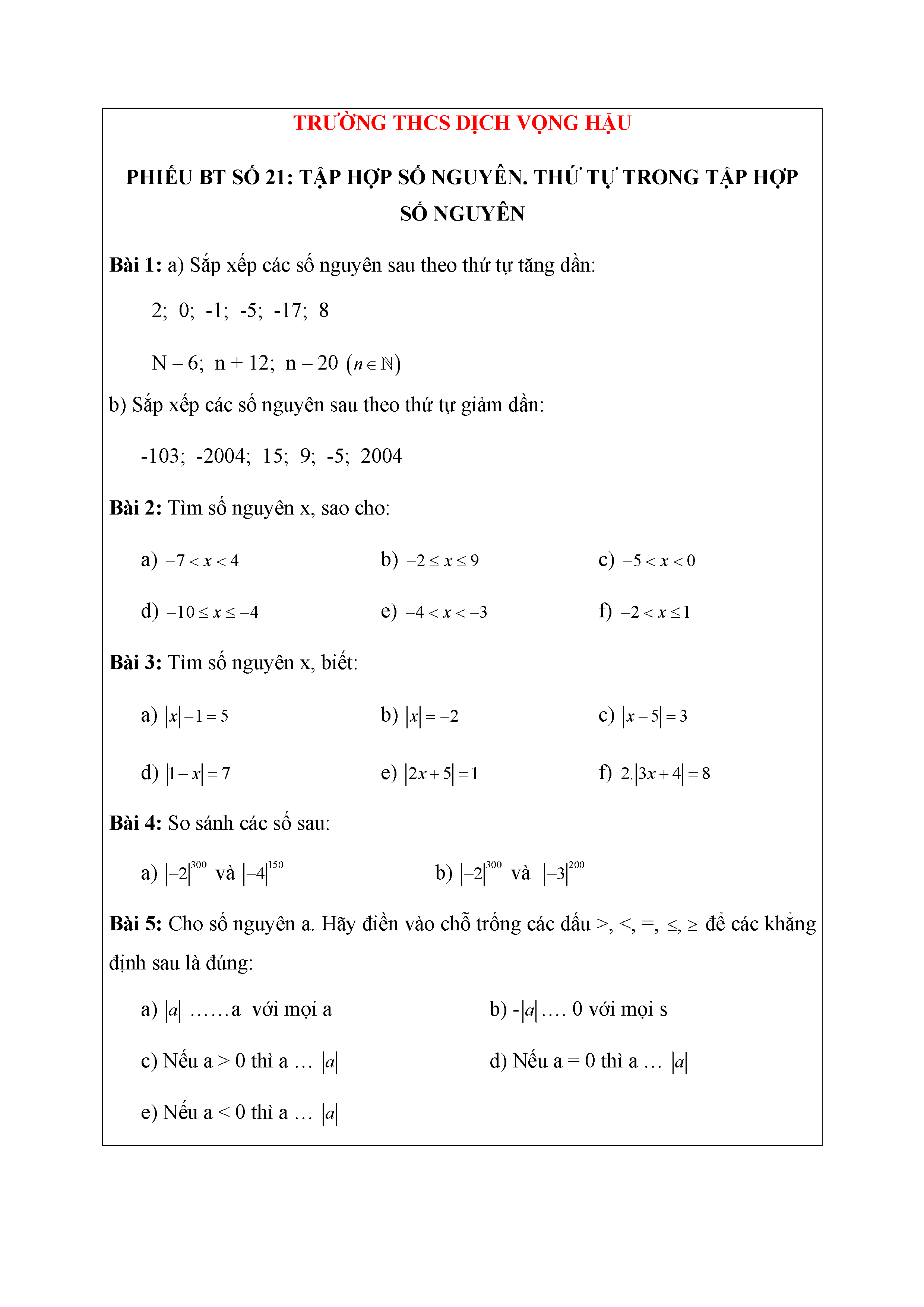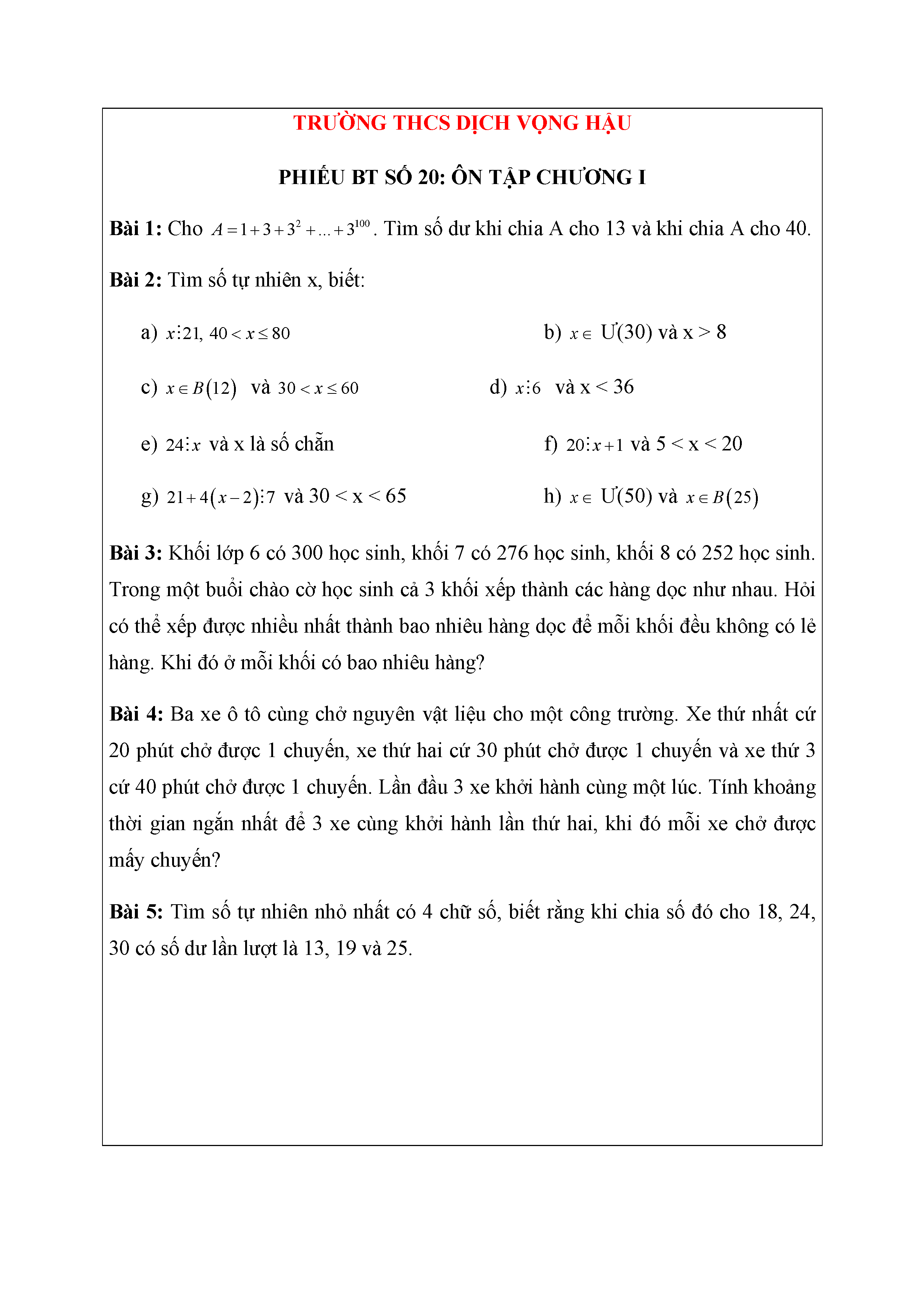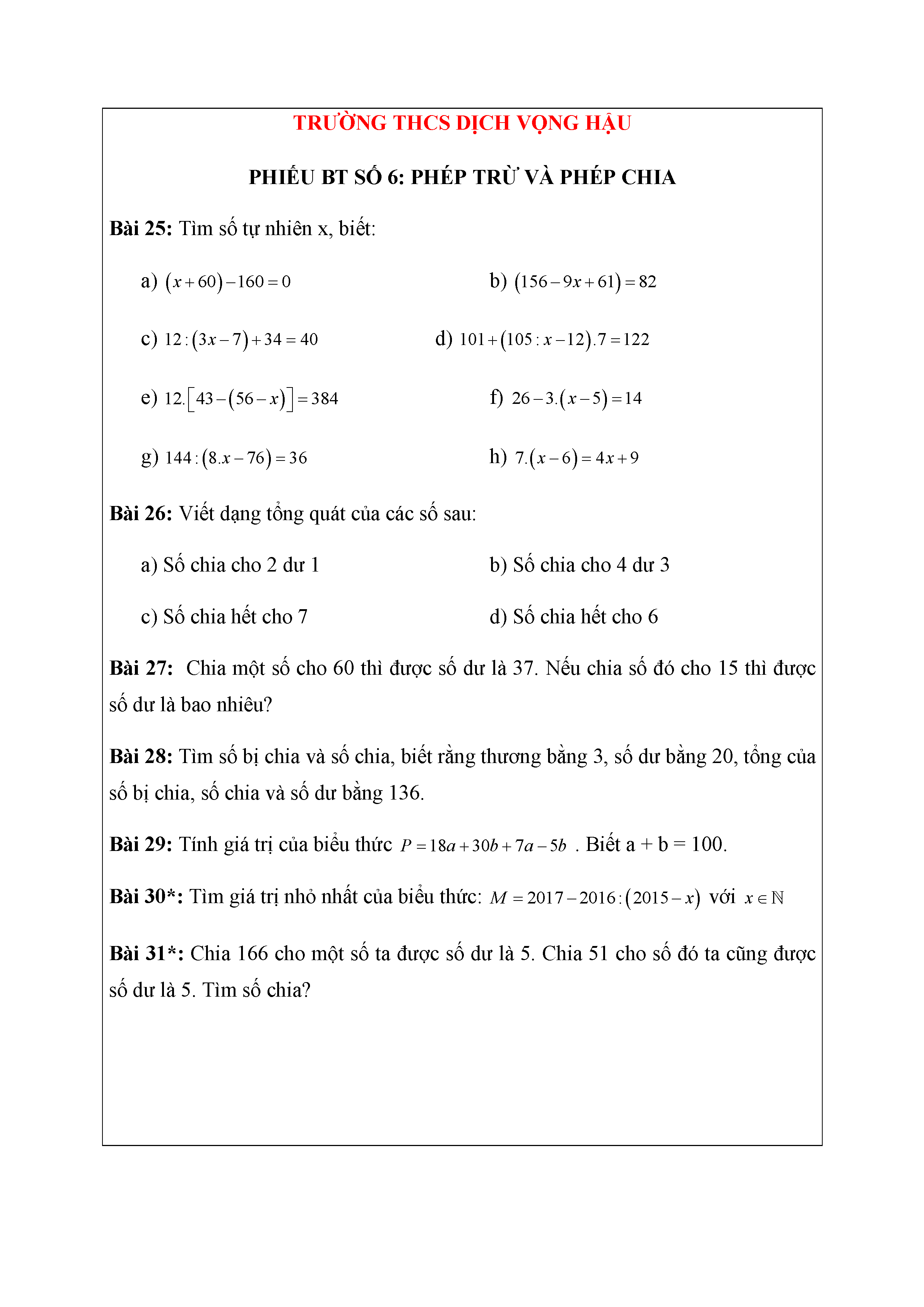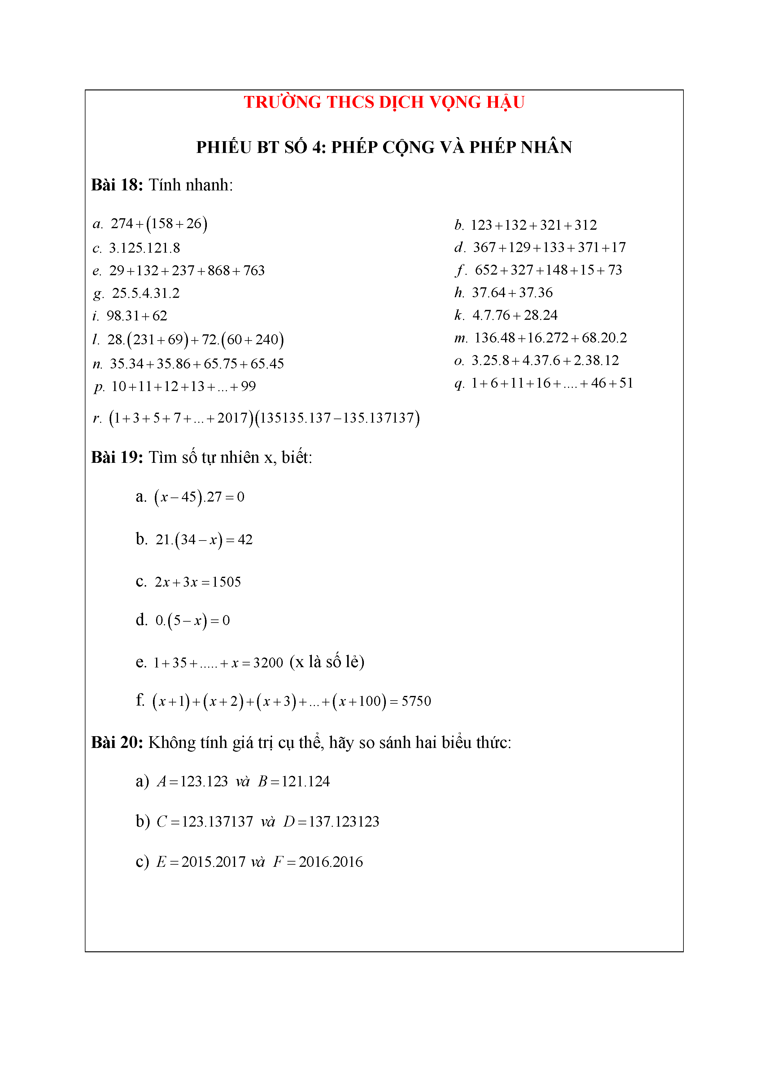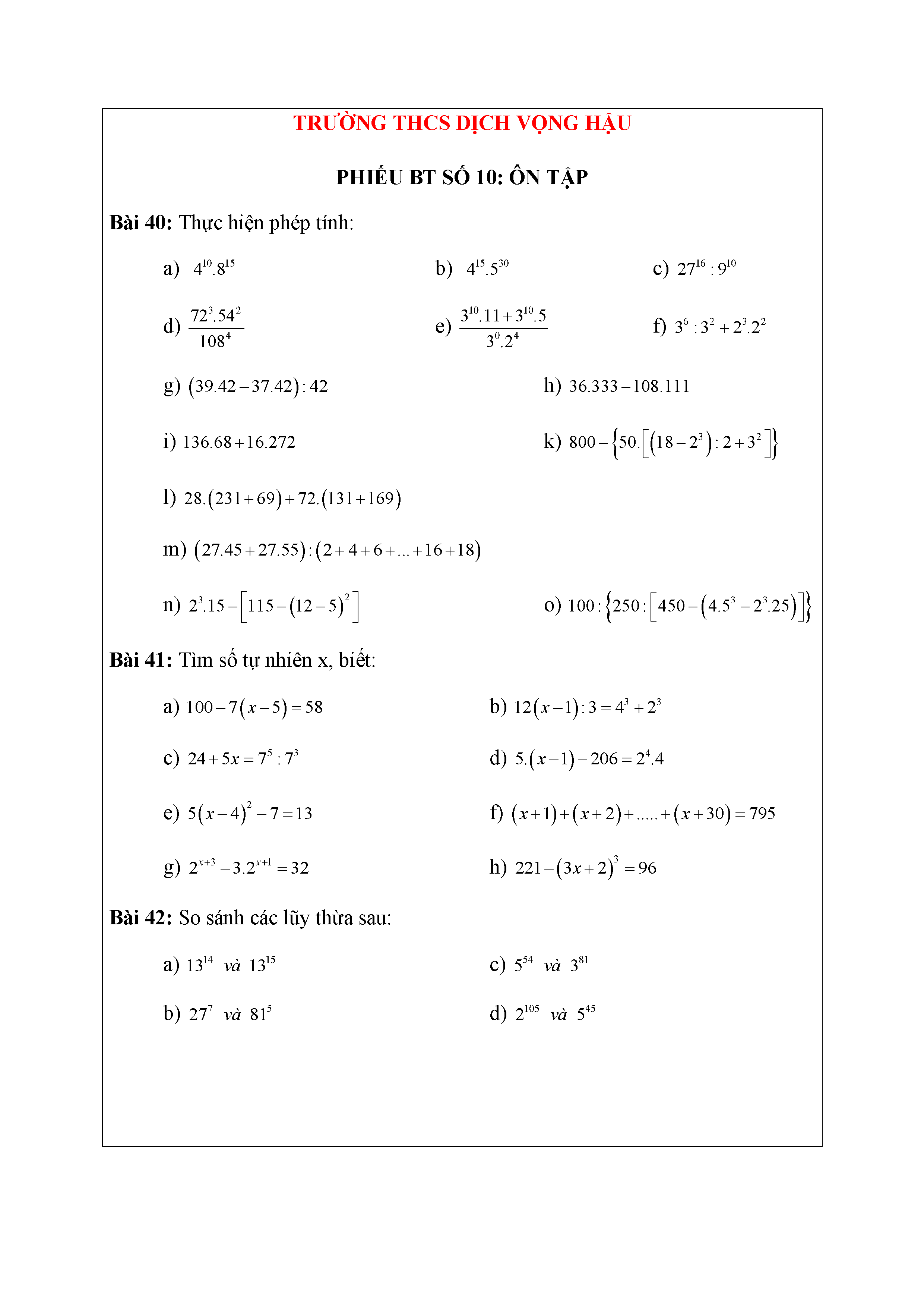 Phiếu bài tập tuần THCS Dịch Vọng Hậu Toán 6