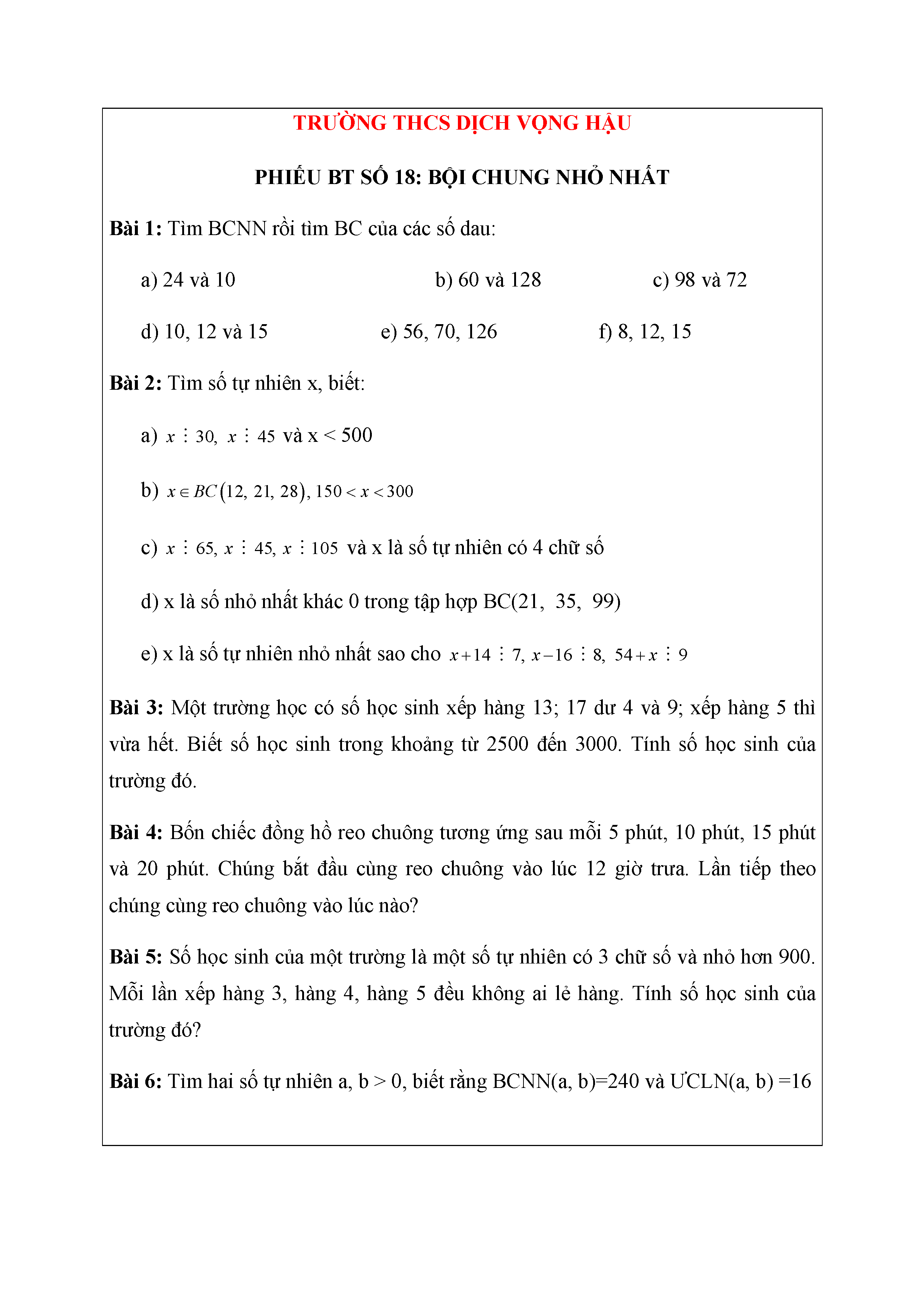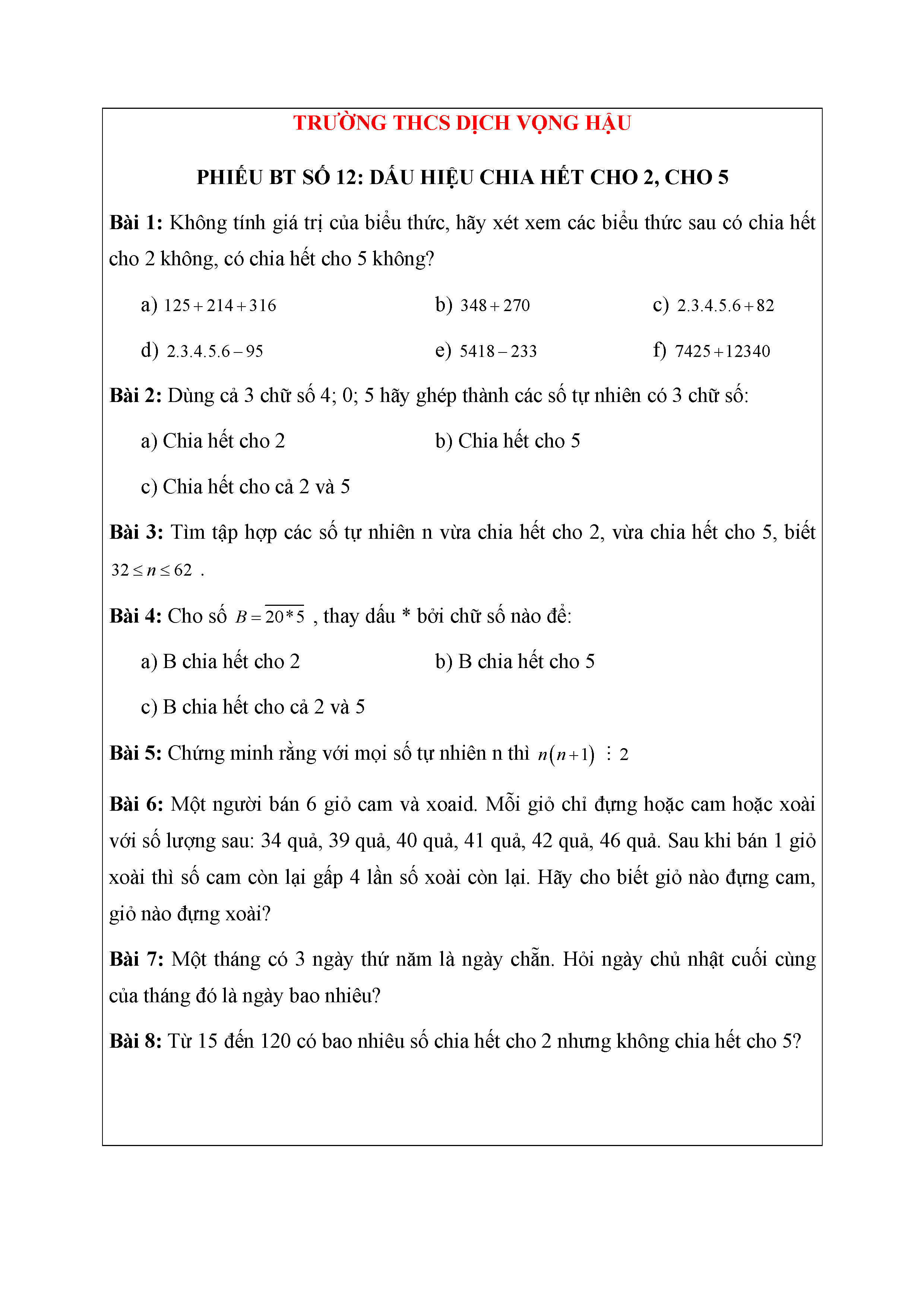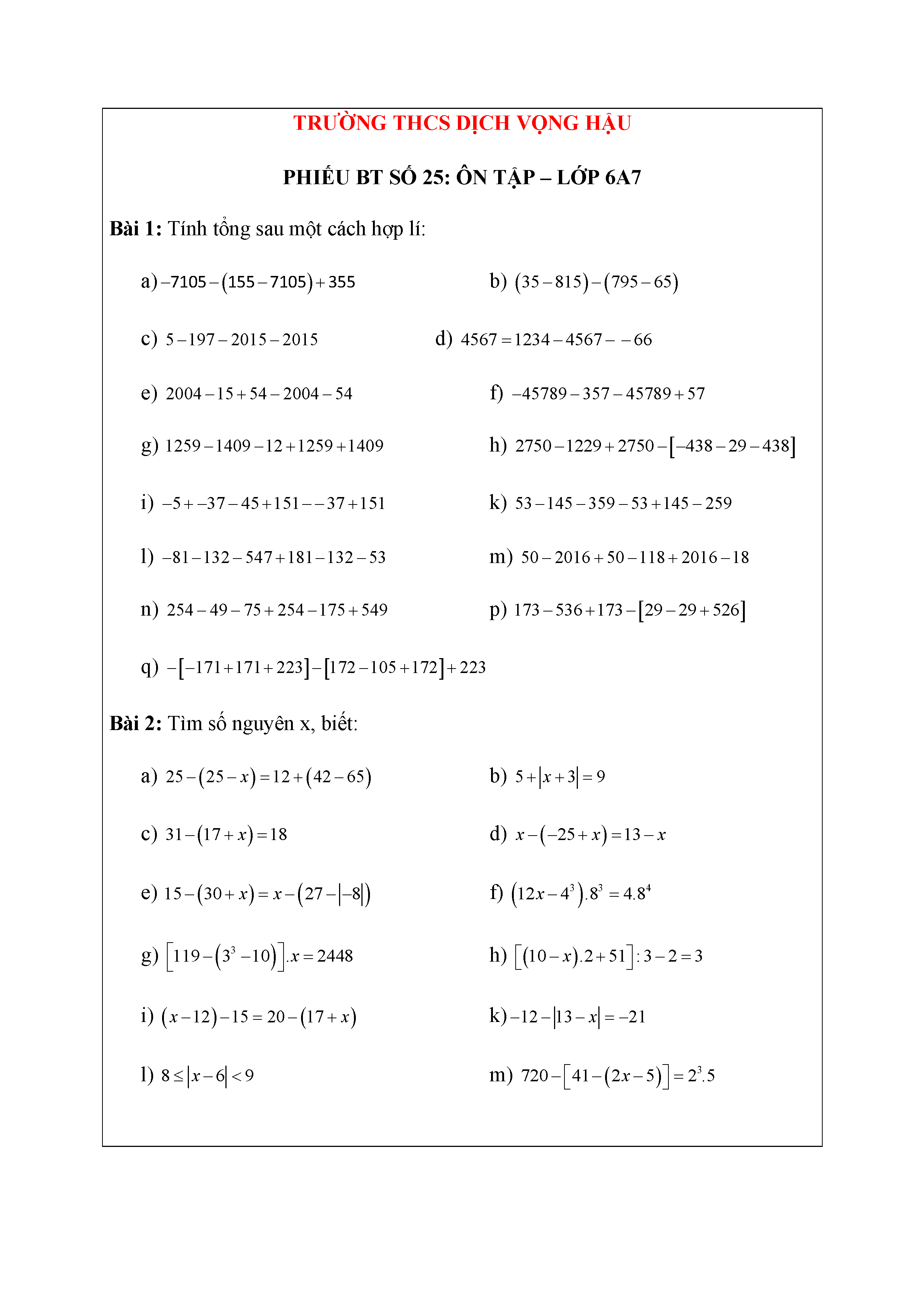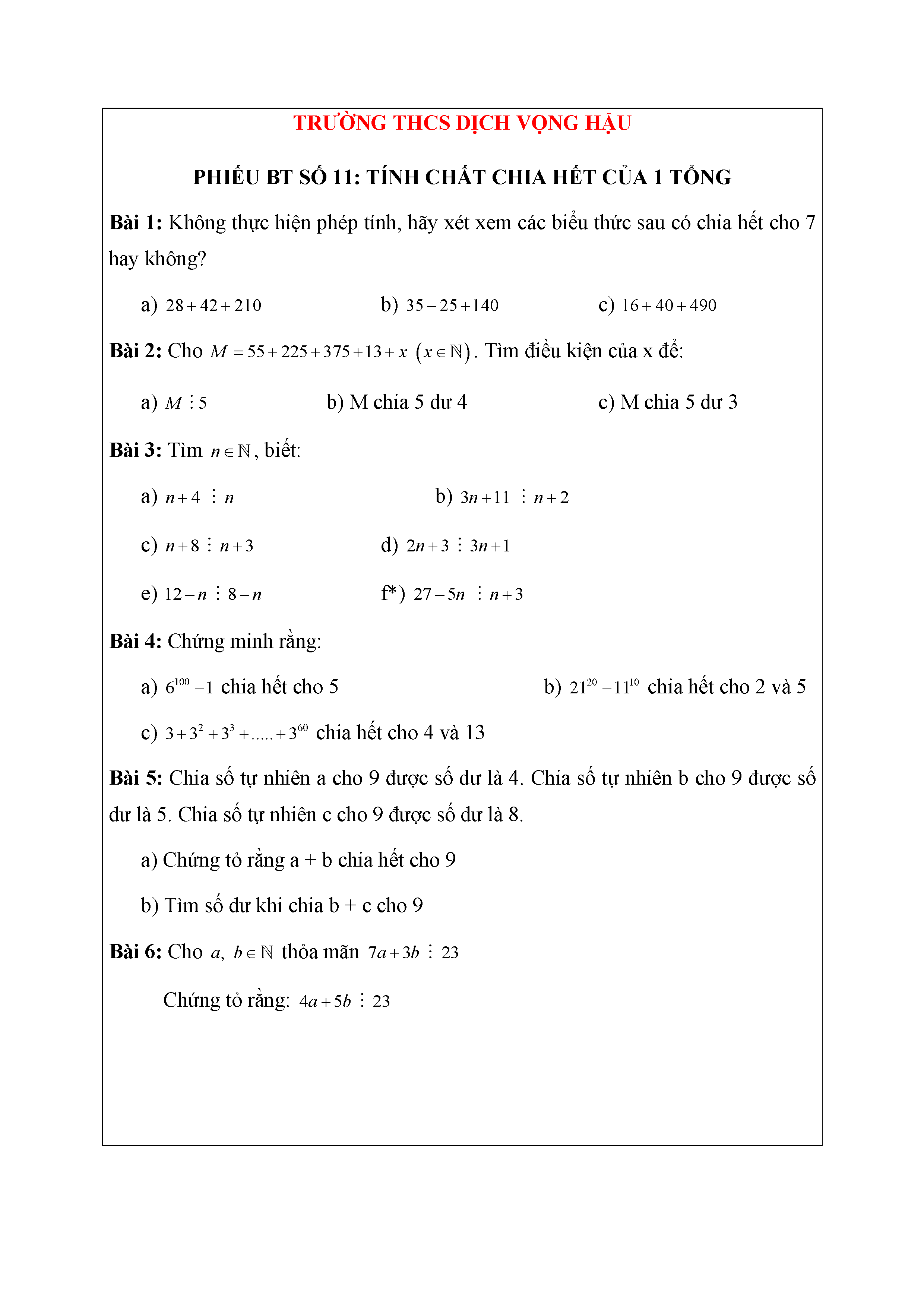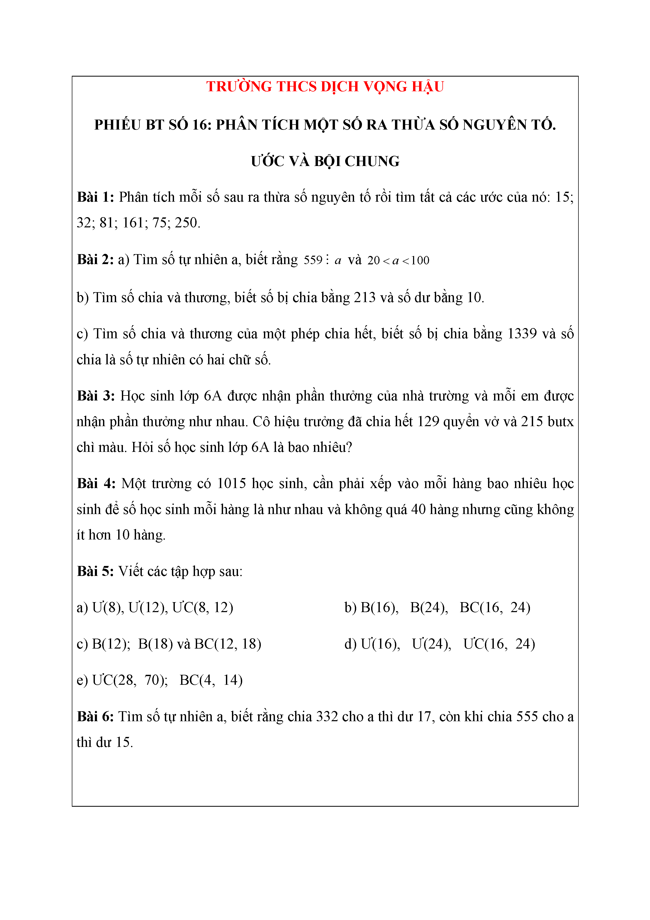 Phiếu bài tập tuần THCS Dịch Vọng Hậu Toán 6