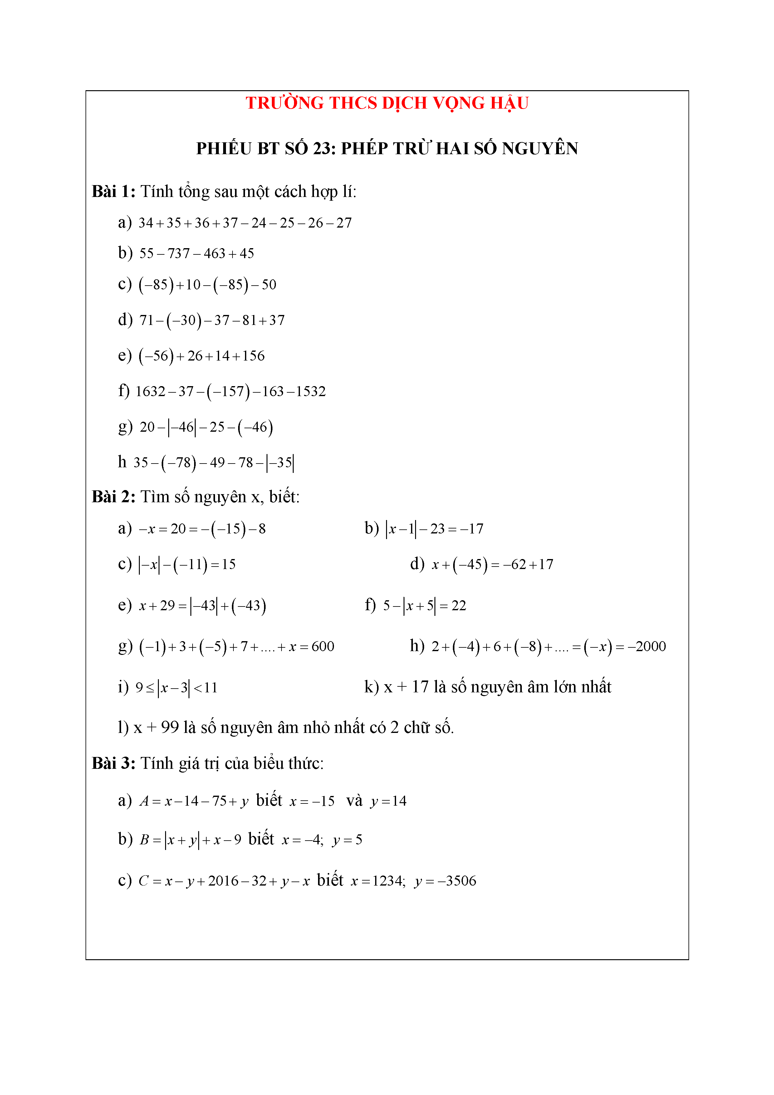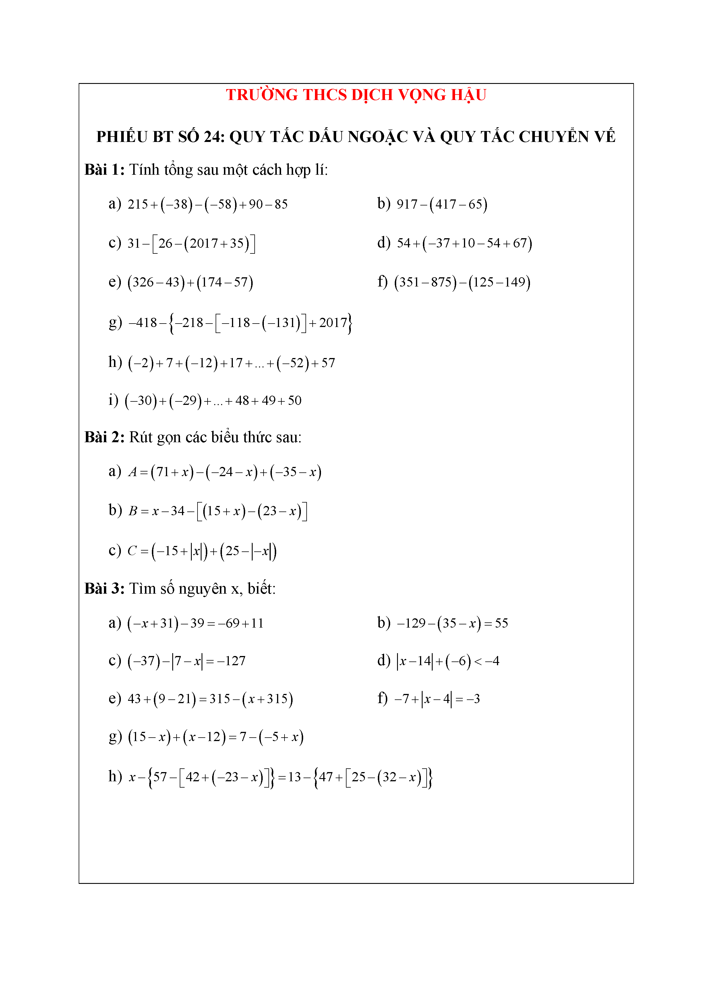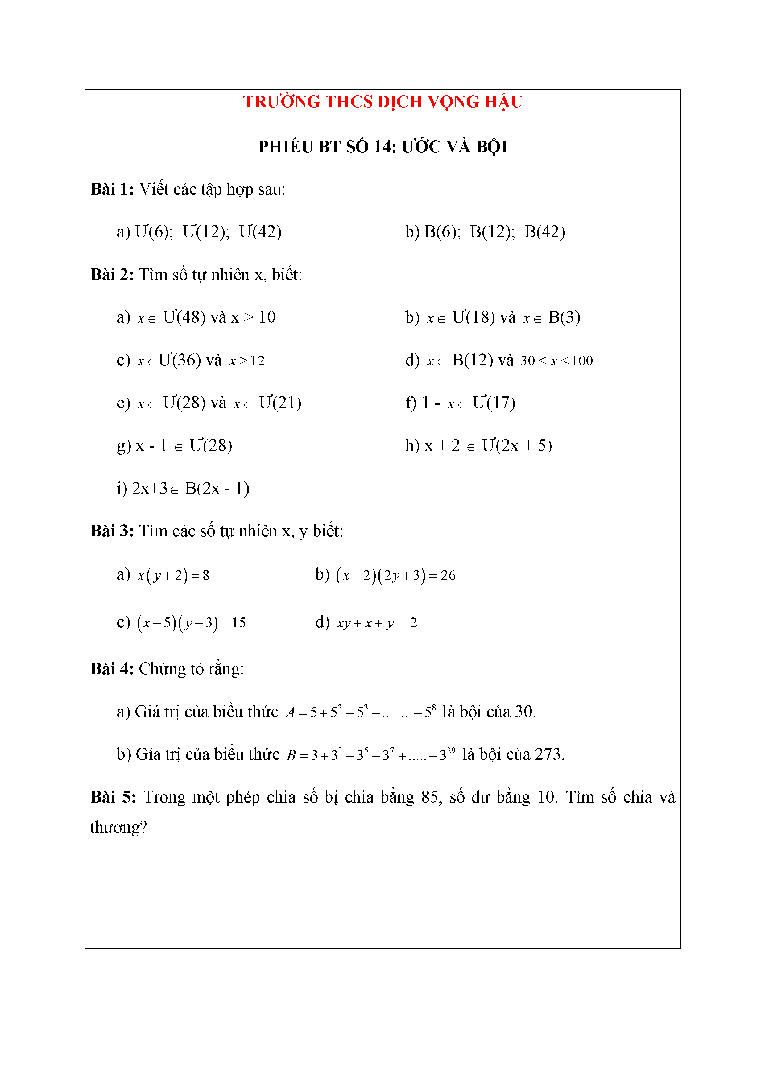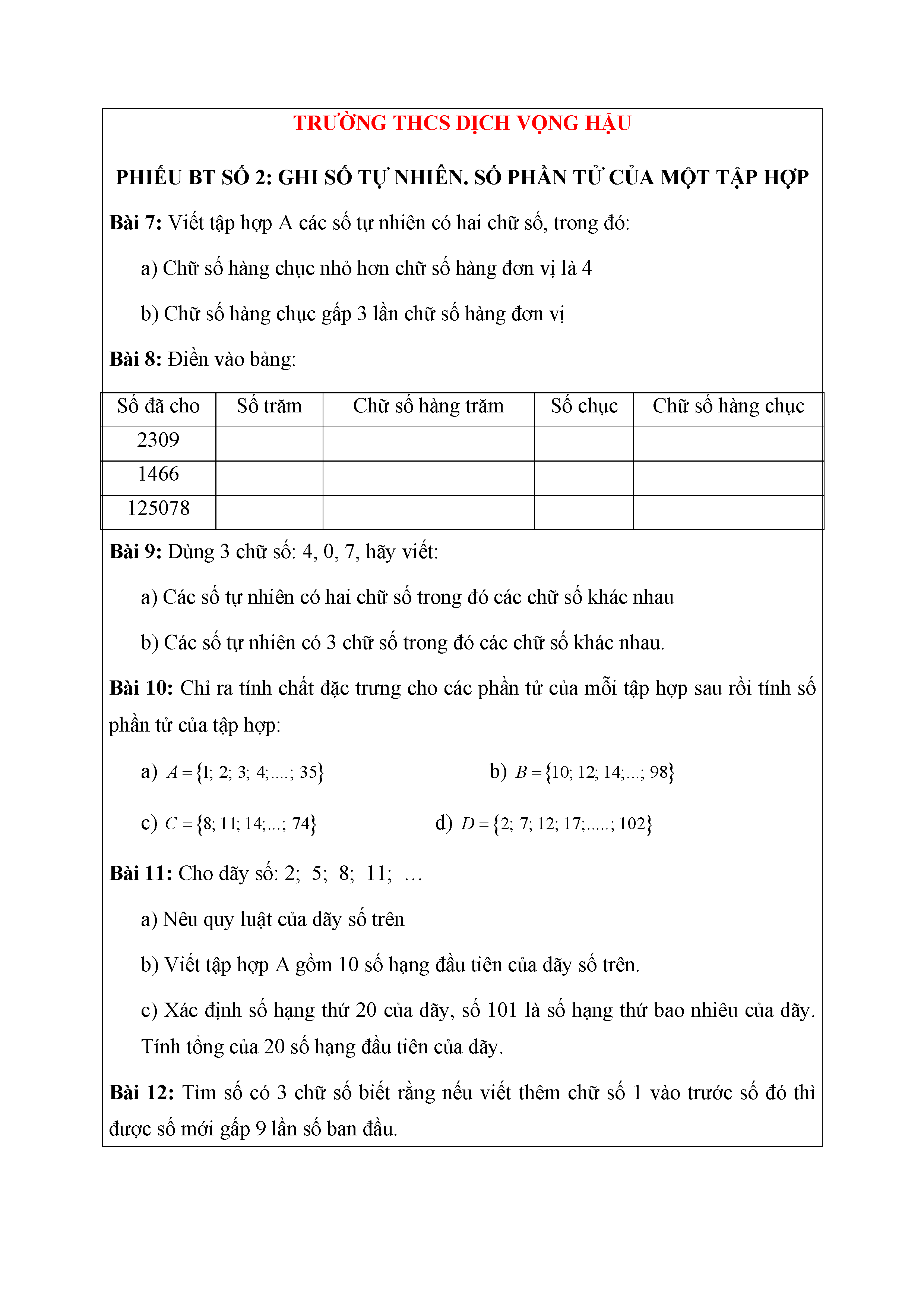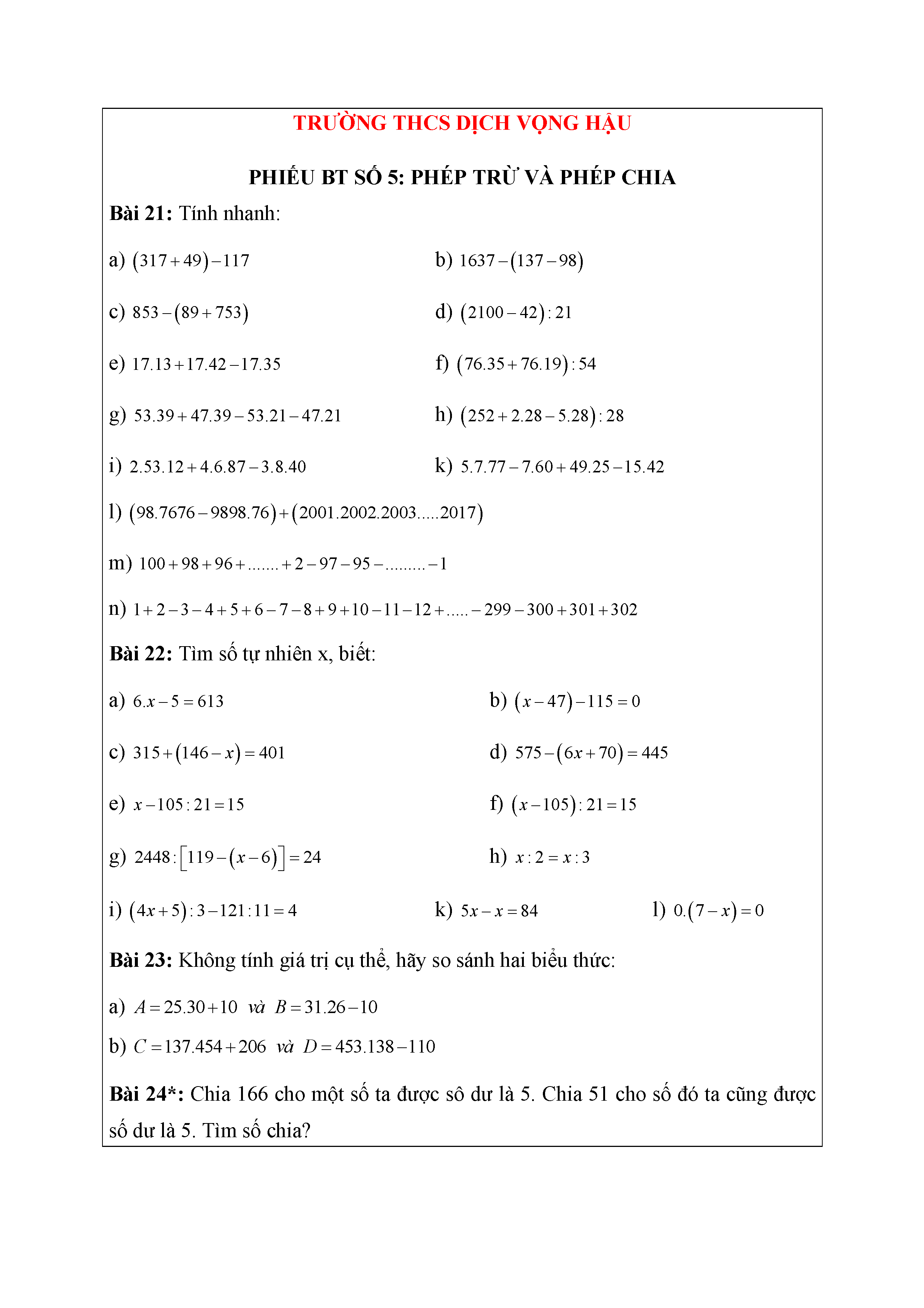 Phiếu bài tập tuần THCS Dịch Vọng Hậu Toán 6