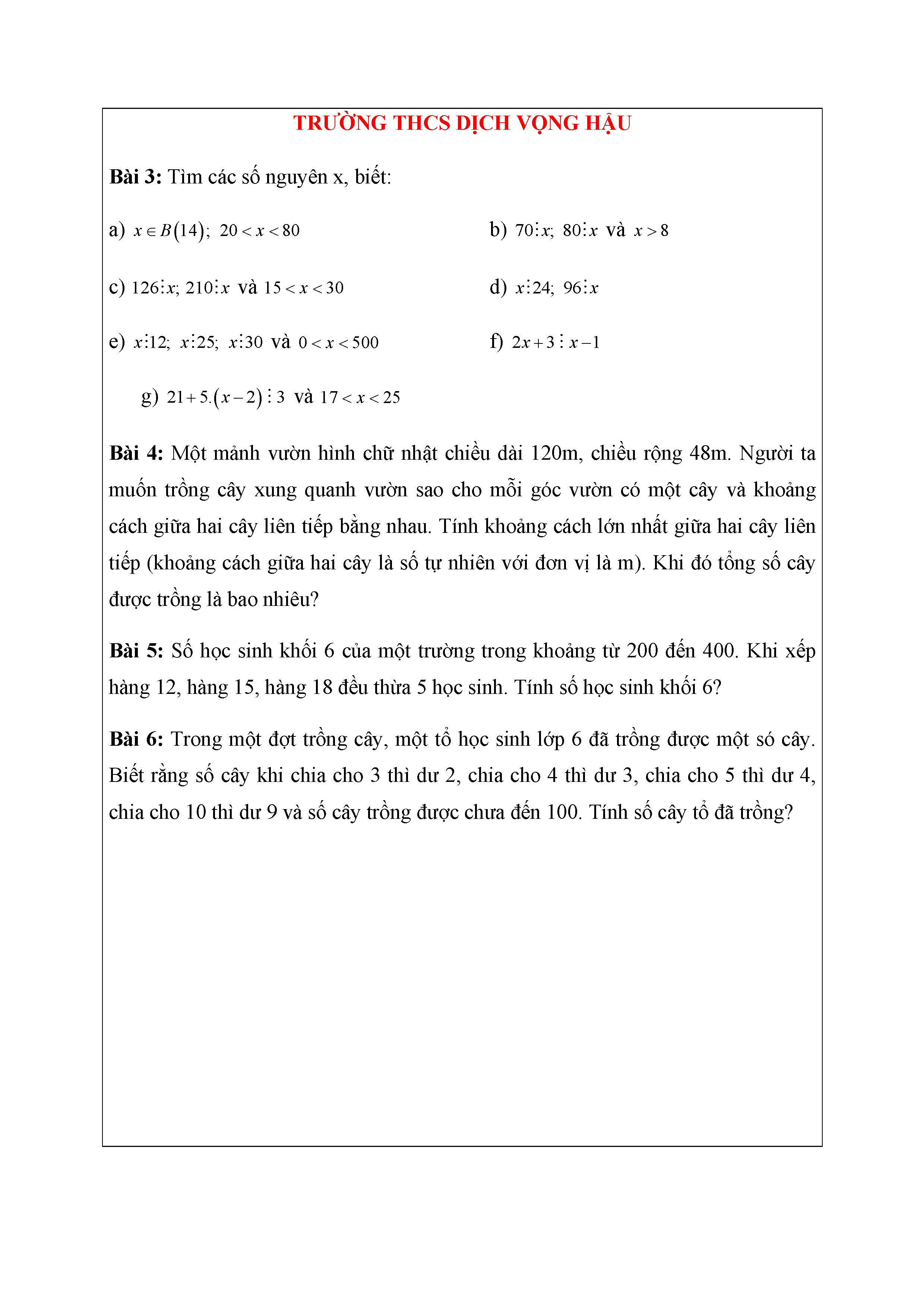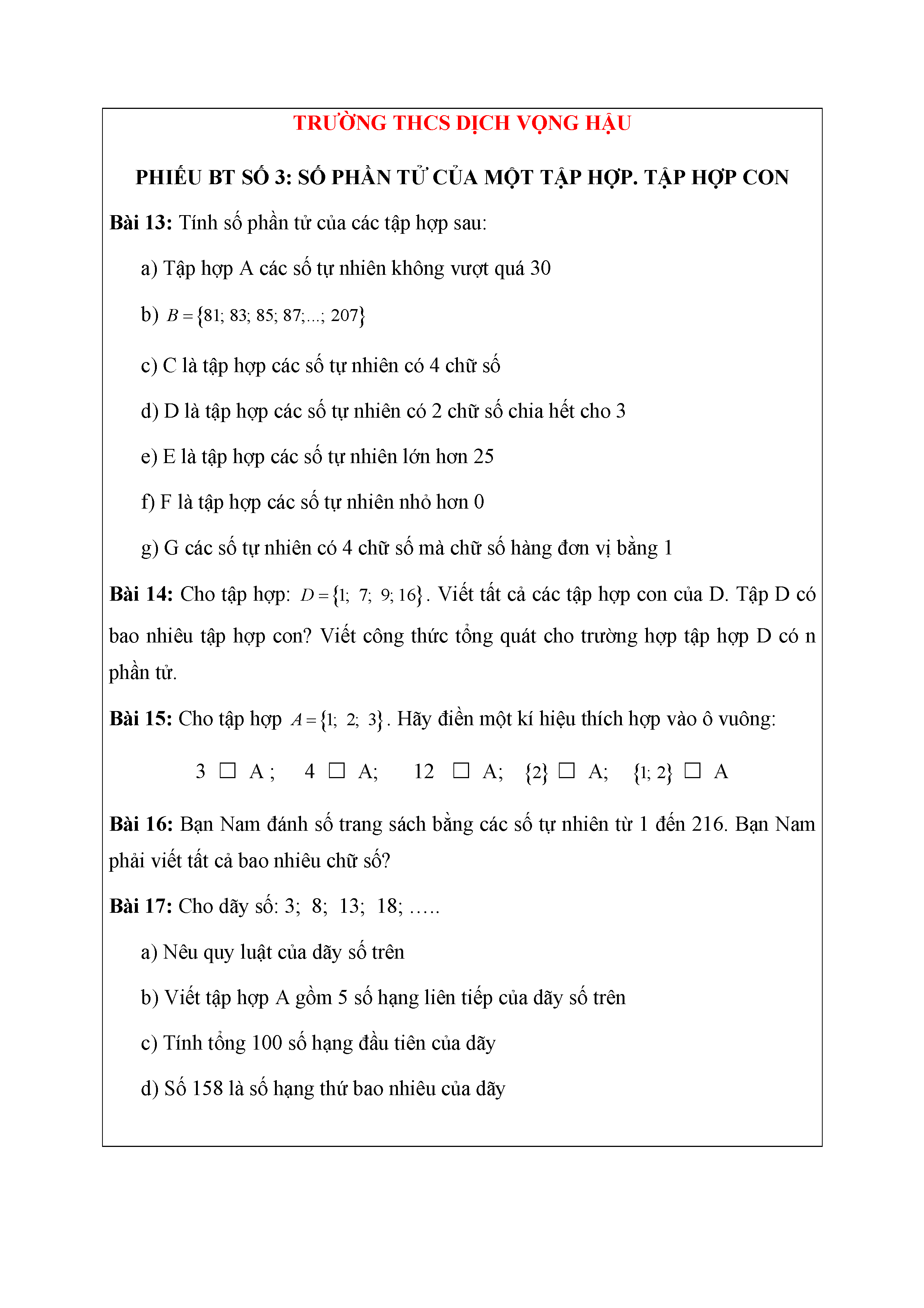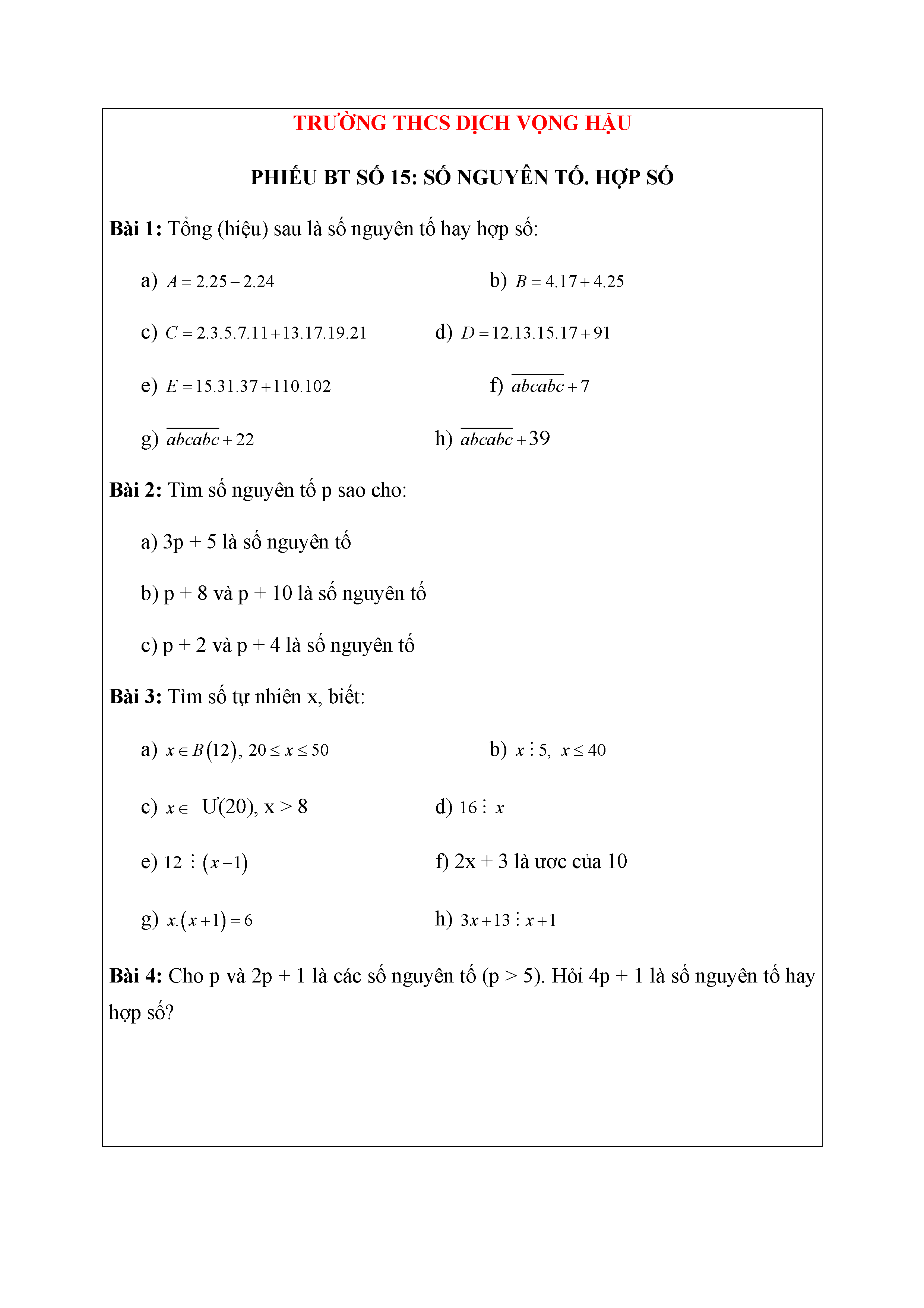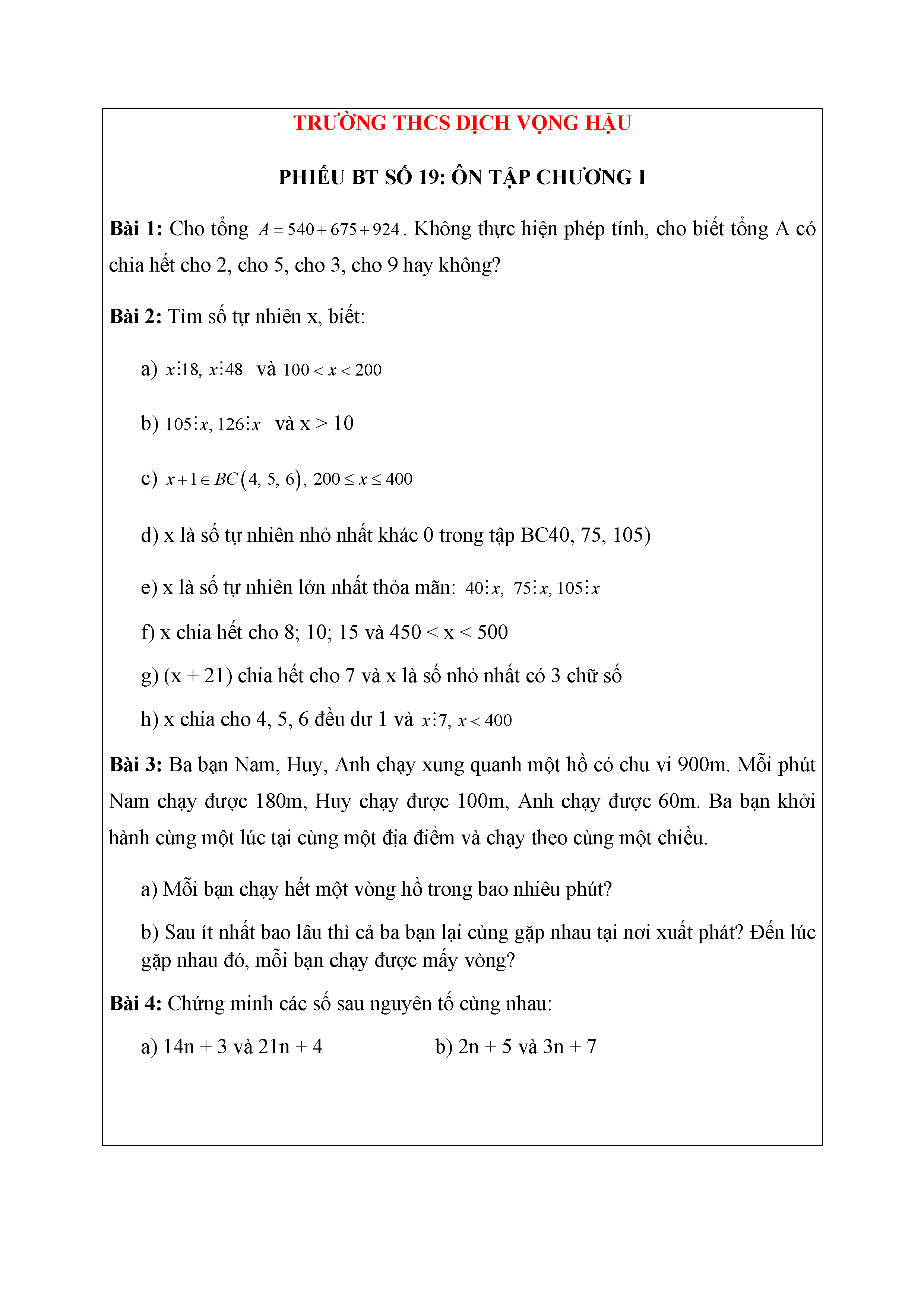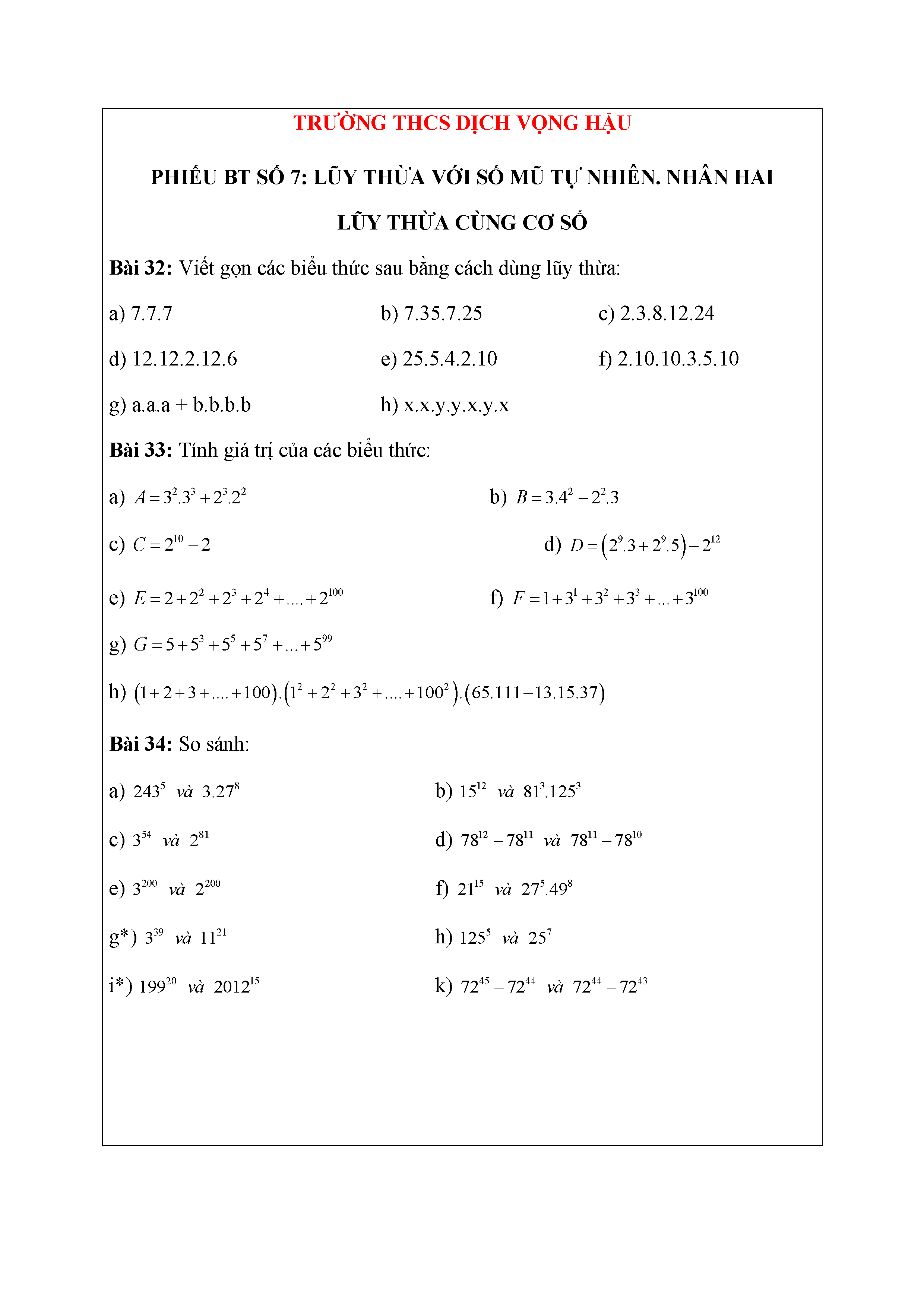 Phiếu bài tập tuần THCS Dịch Vọng Hậu Toán 6