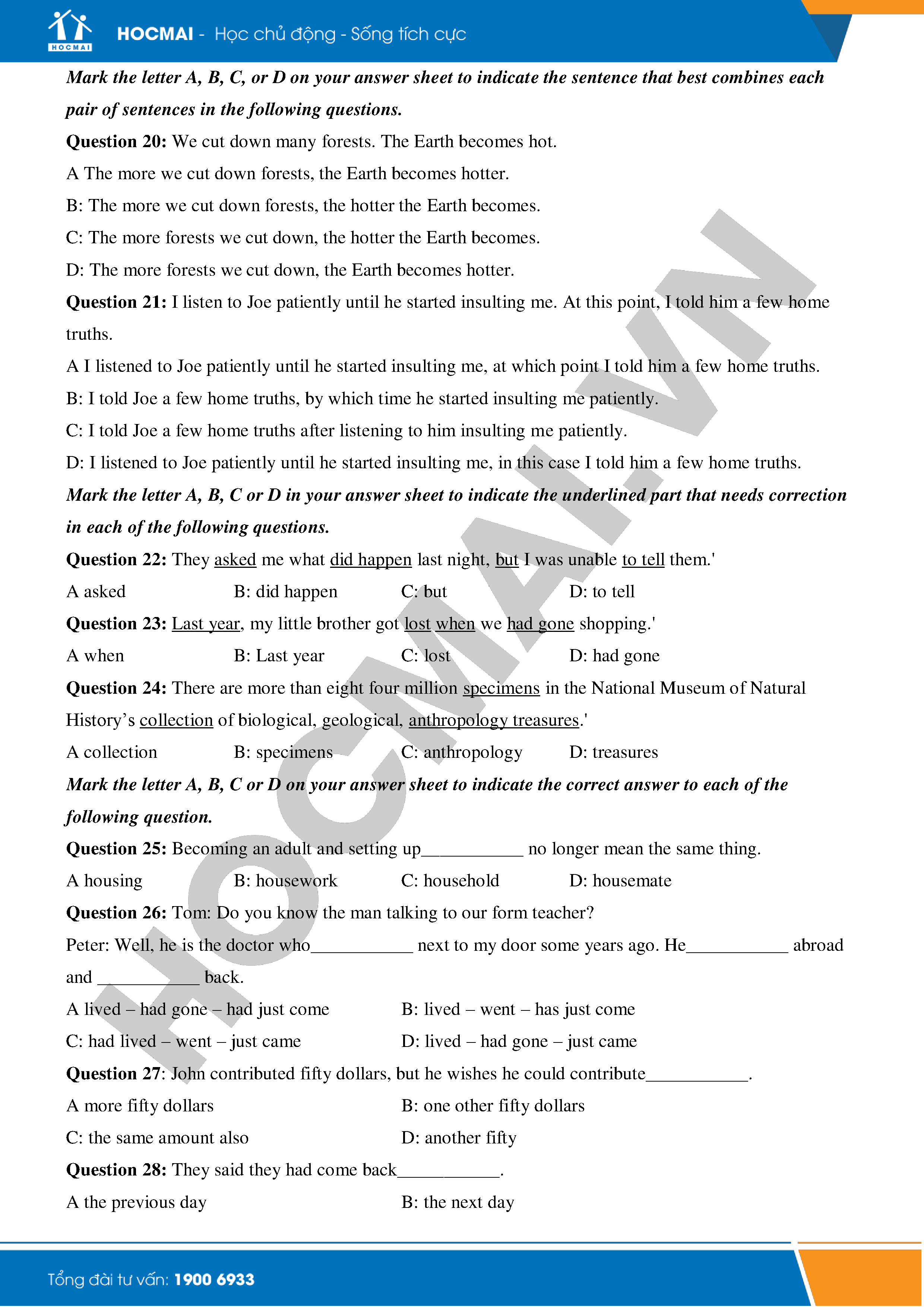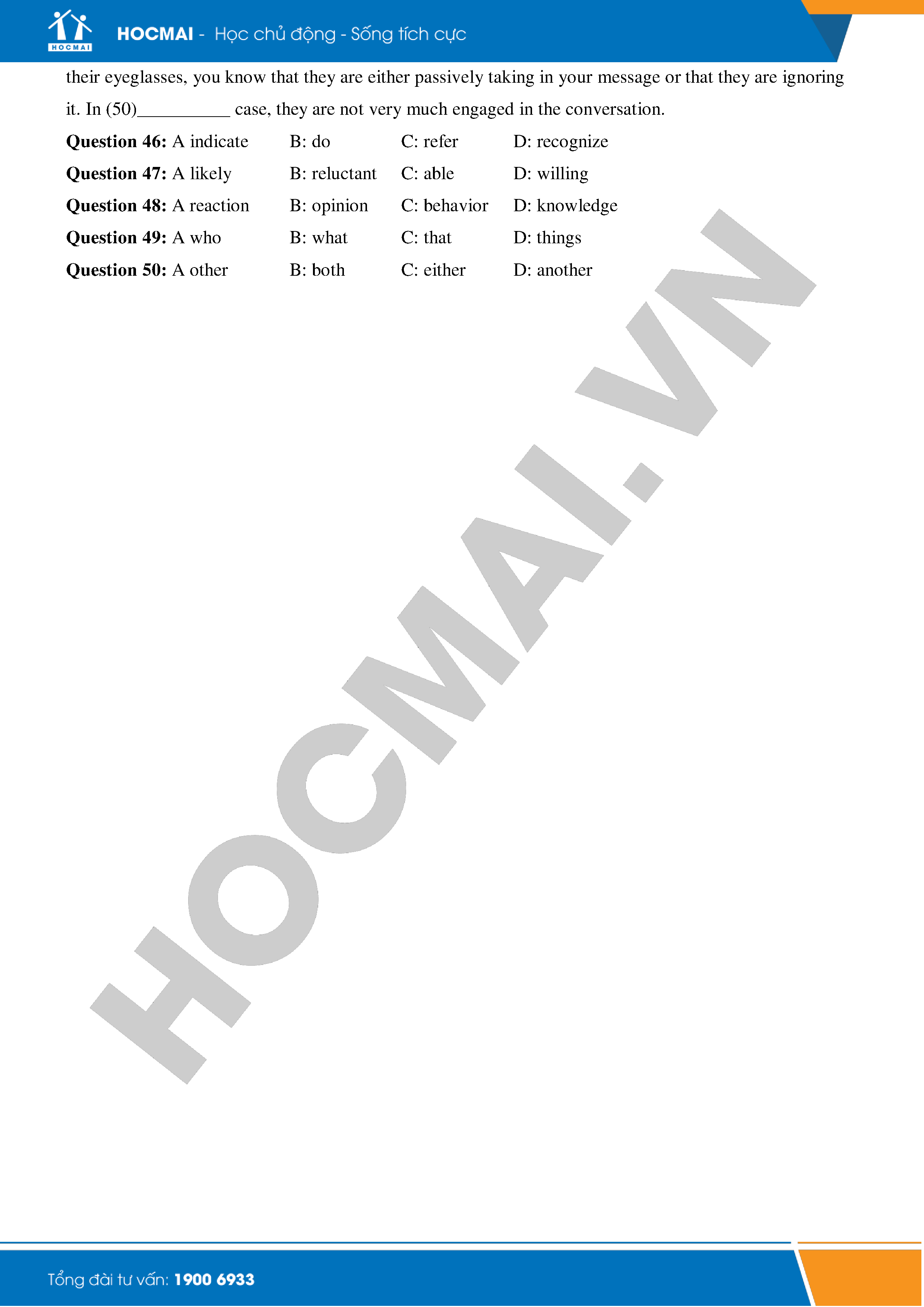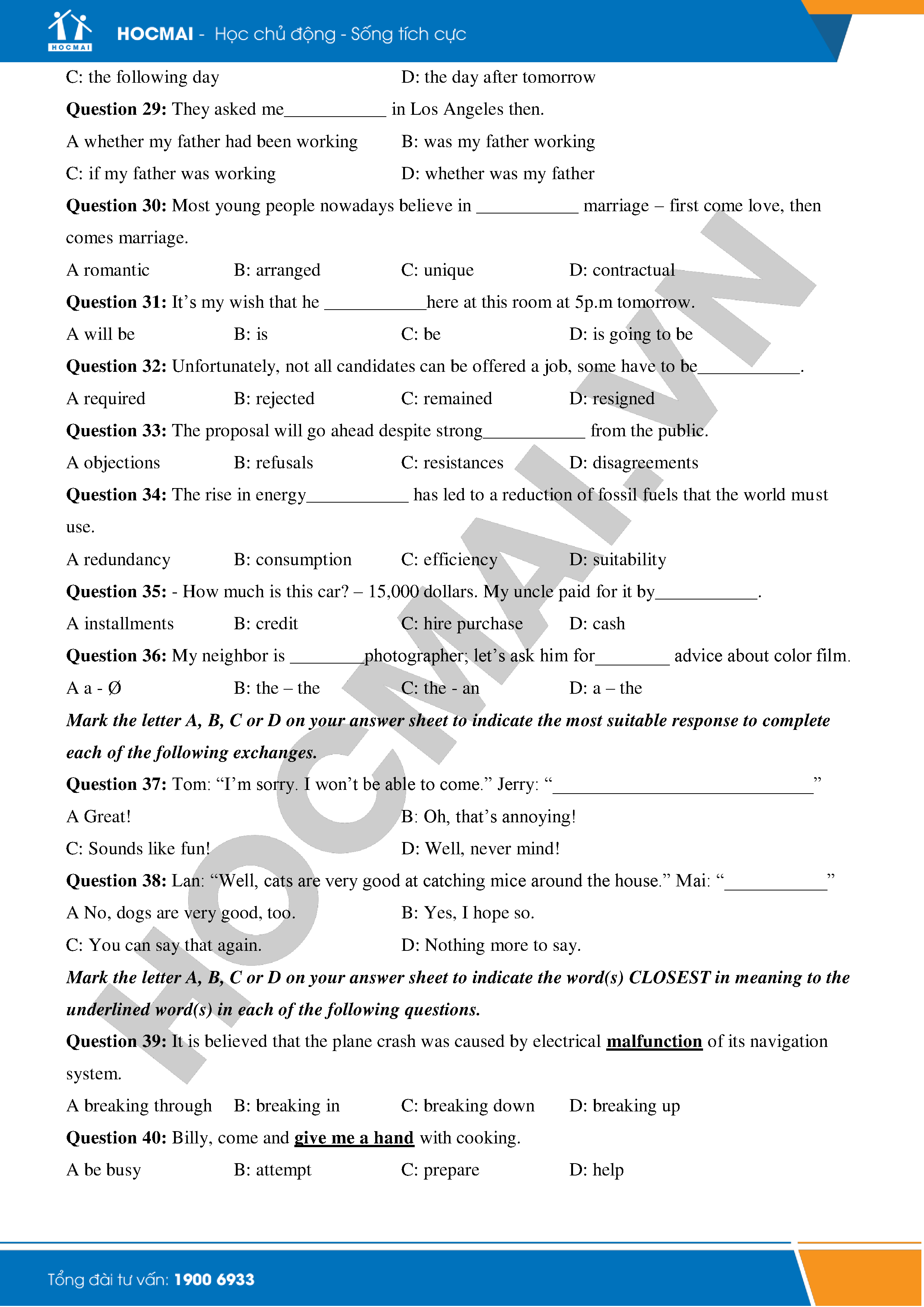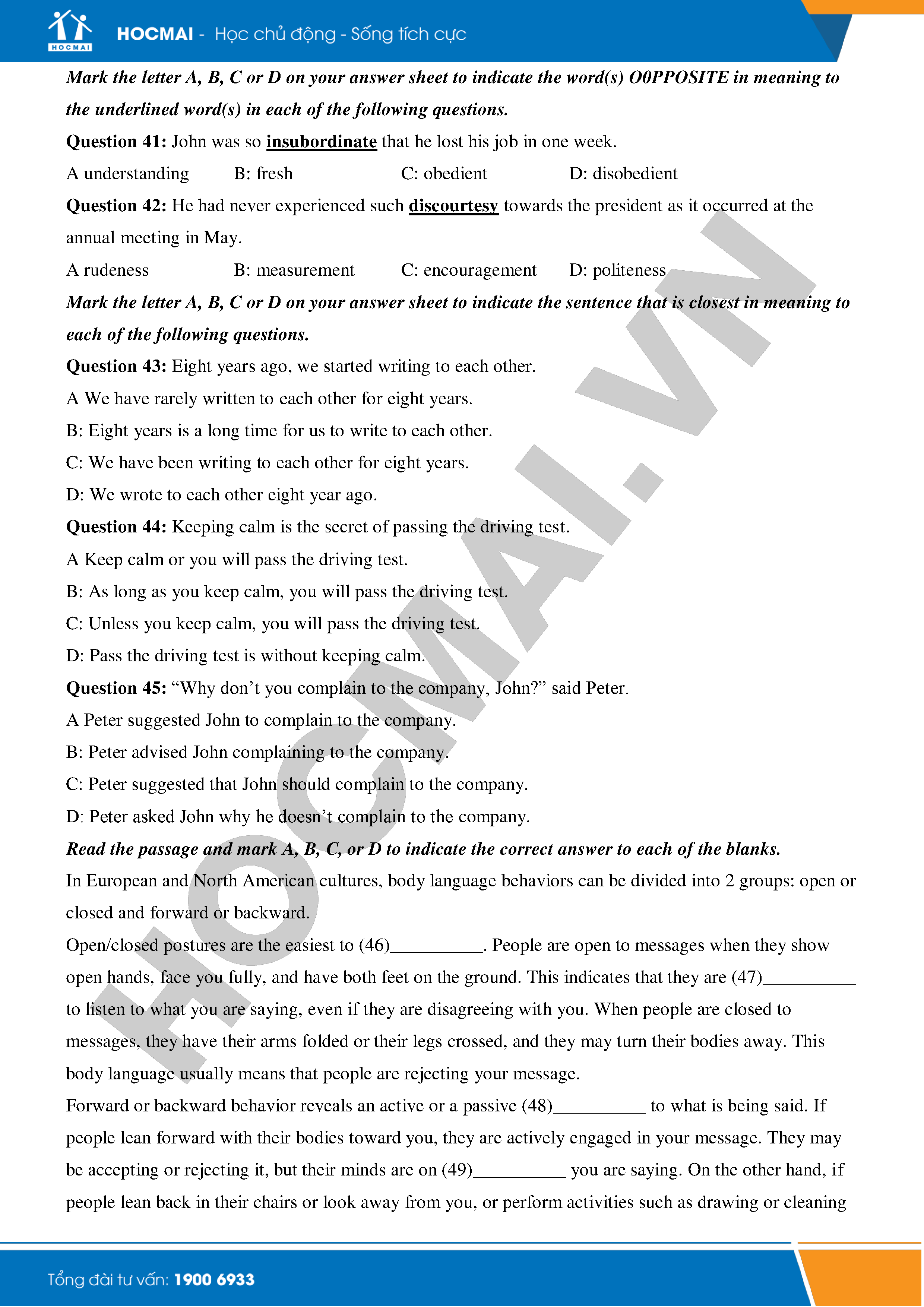 Đề thi thử THPTQG năm 2018 - Môn Tiếng Anh - THPT Yên Lạc 1 - Vĩnh Phúc - Lần 1 là bộ đề do HOCMAI sưu tầm, nội dung chủ yếu xoay quanh những kiến thức ôn thi THPTQG 2018. Đề gồm 50 câu dưới hình thức trắc nghiệm. Cùng ôn luyện thật tốt các bạn nhé!