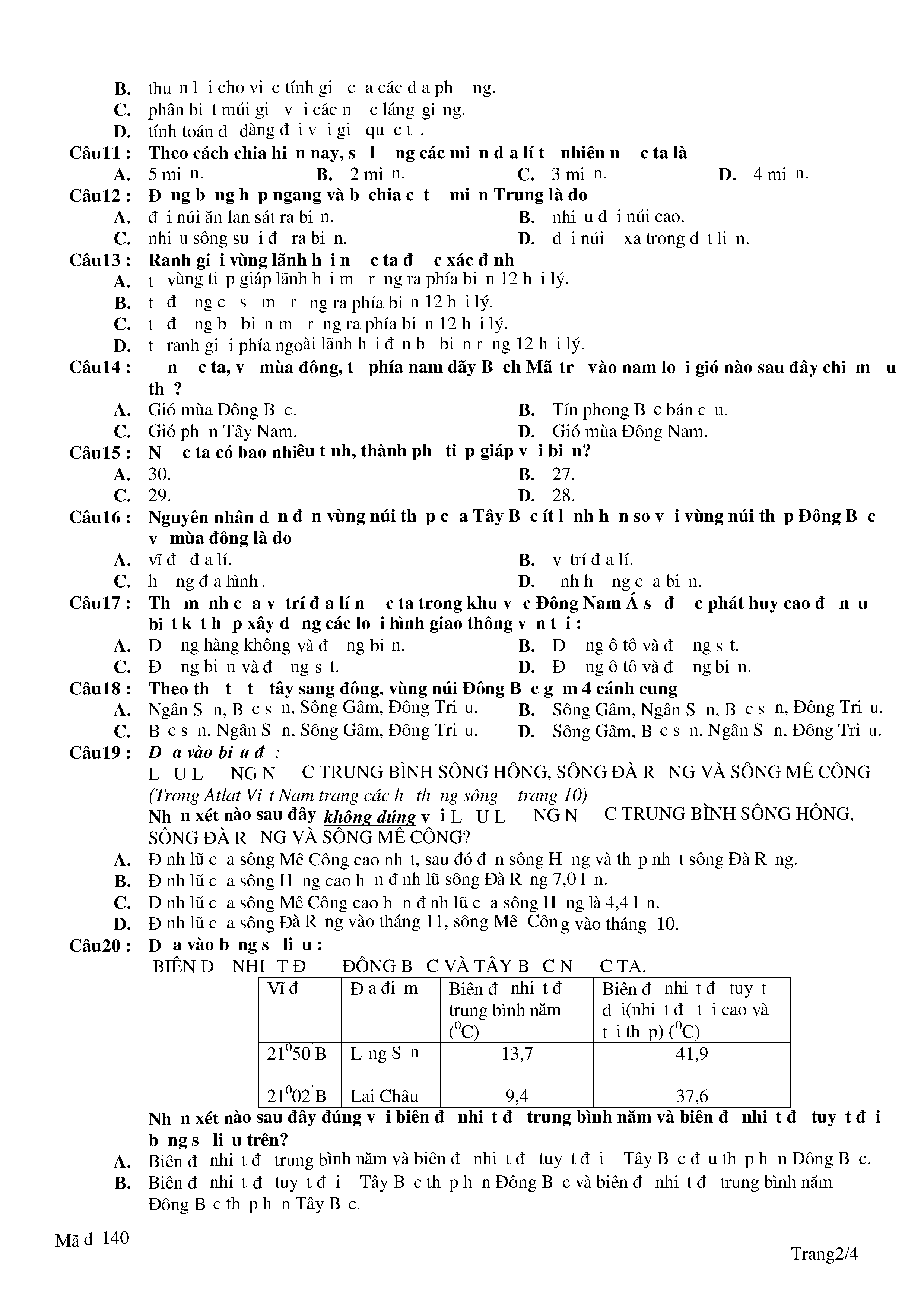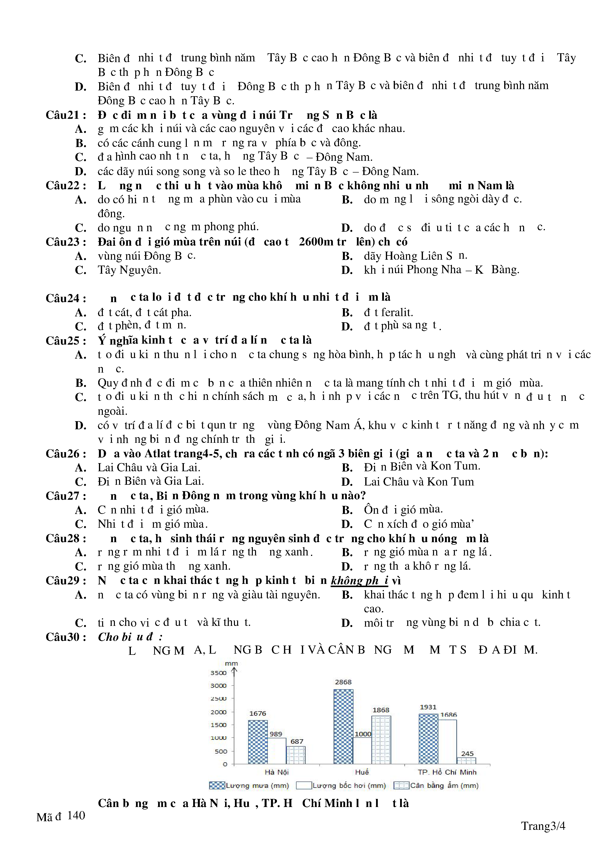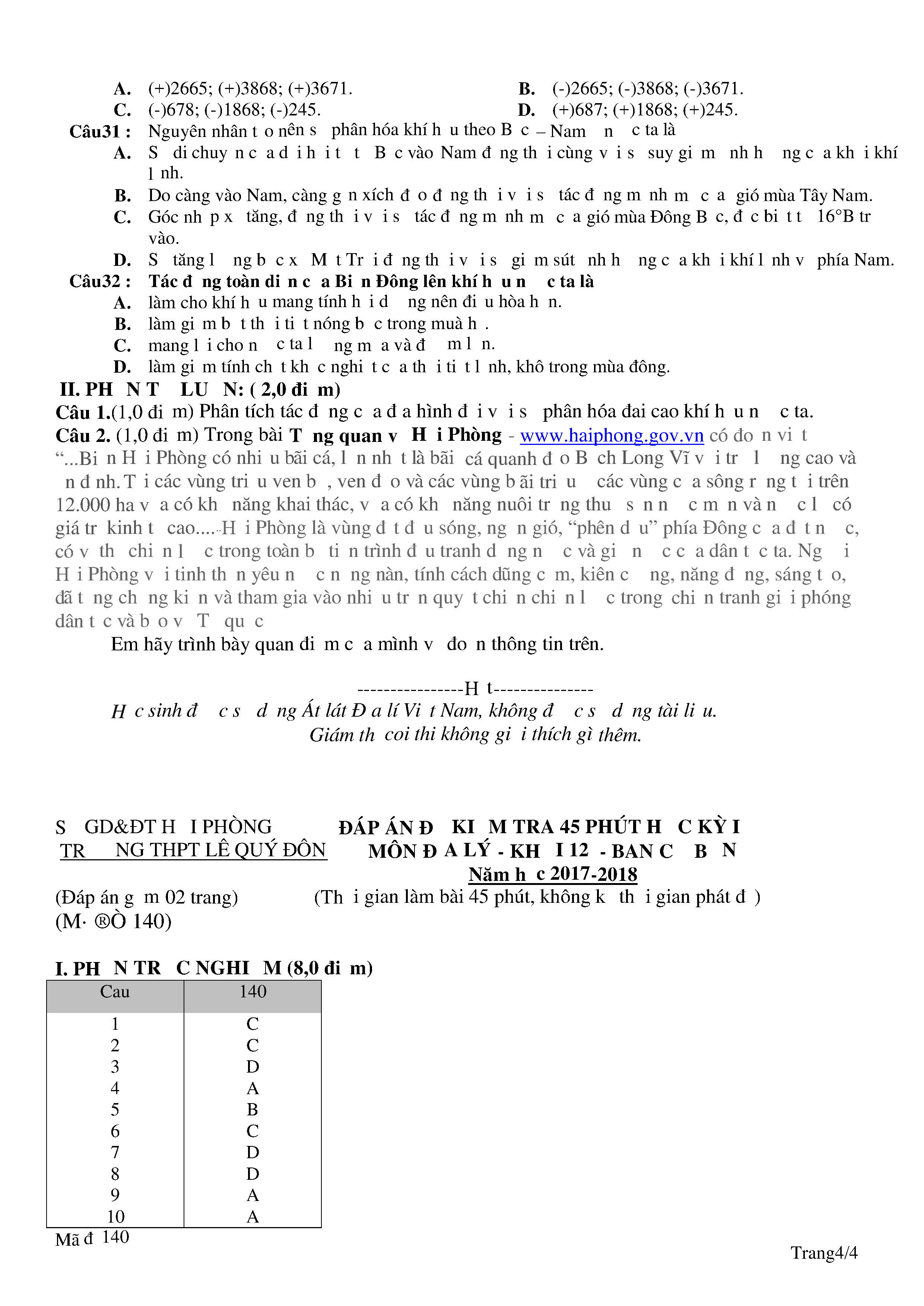 Đề kiểm tra 1 tiết lớp 12 năm học 2017-2018 môn Địa lí Trường THPT Lê Quý Đôn (mã đề 140)