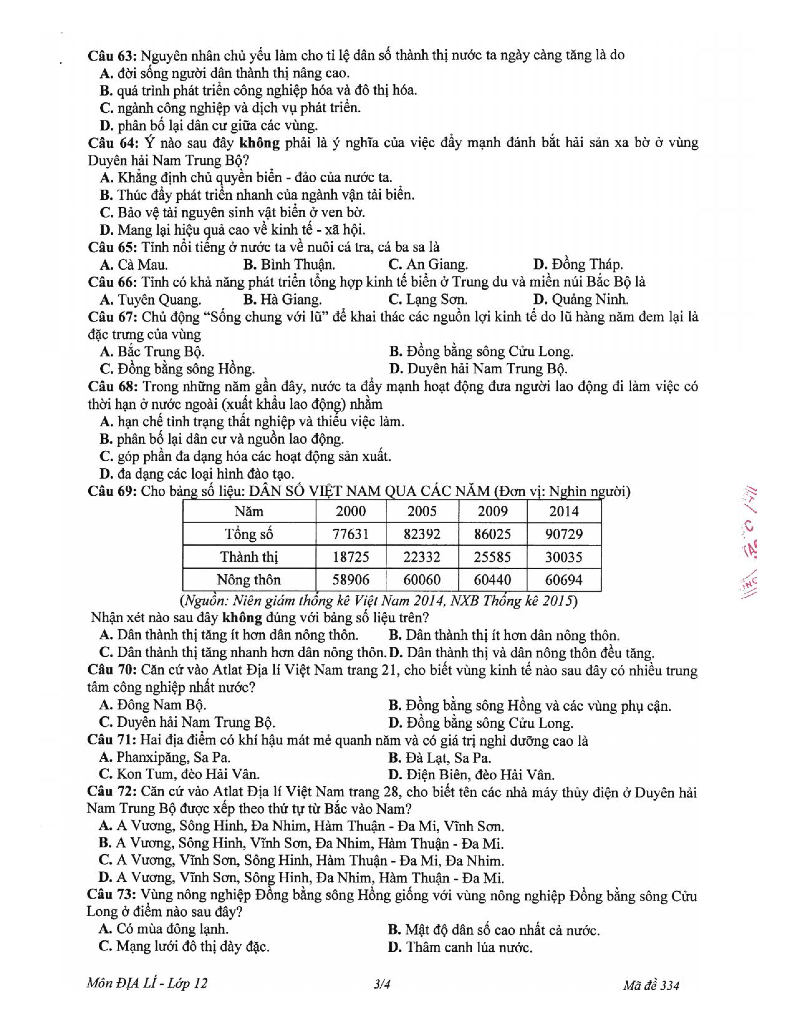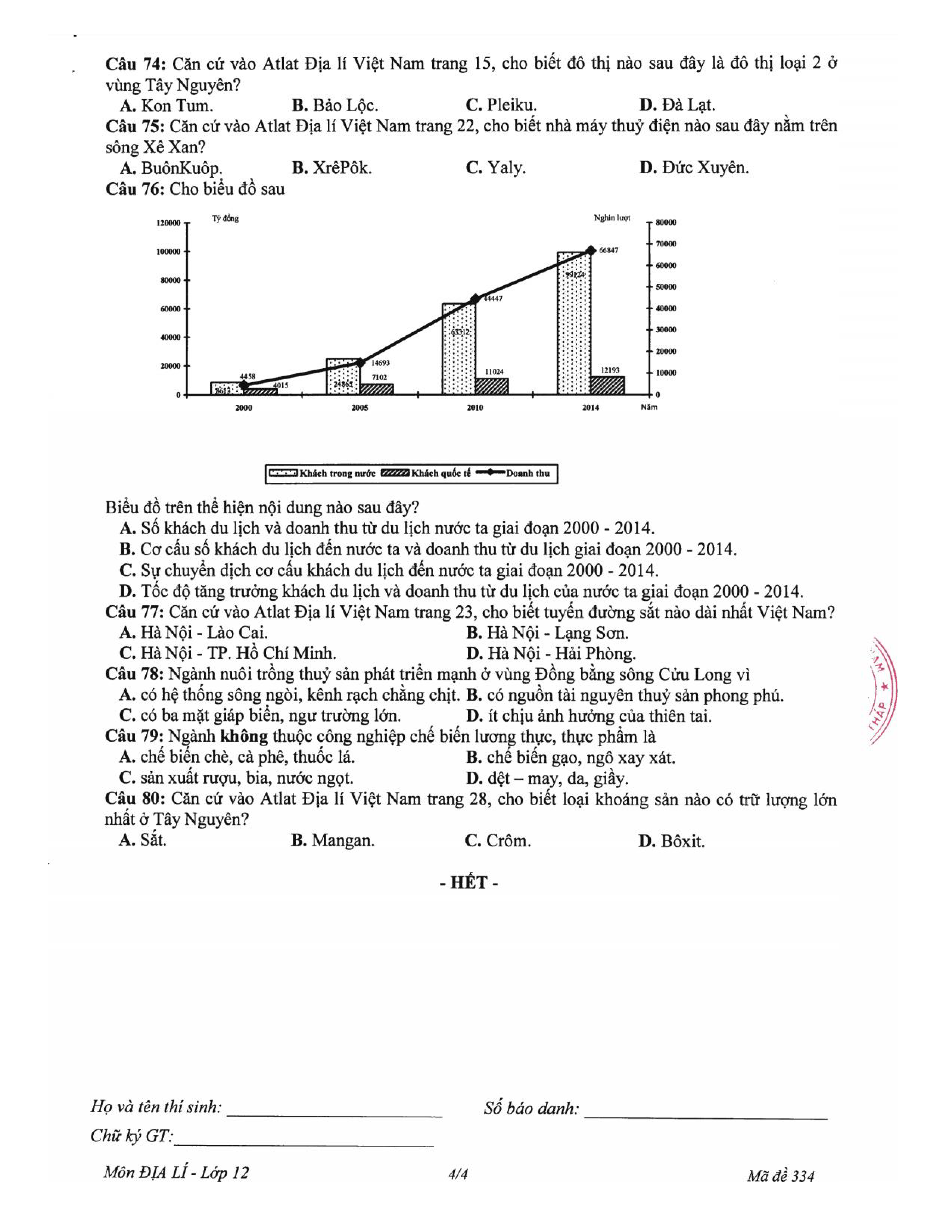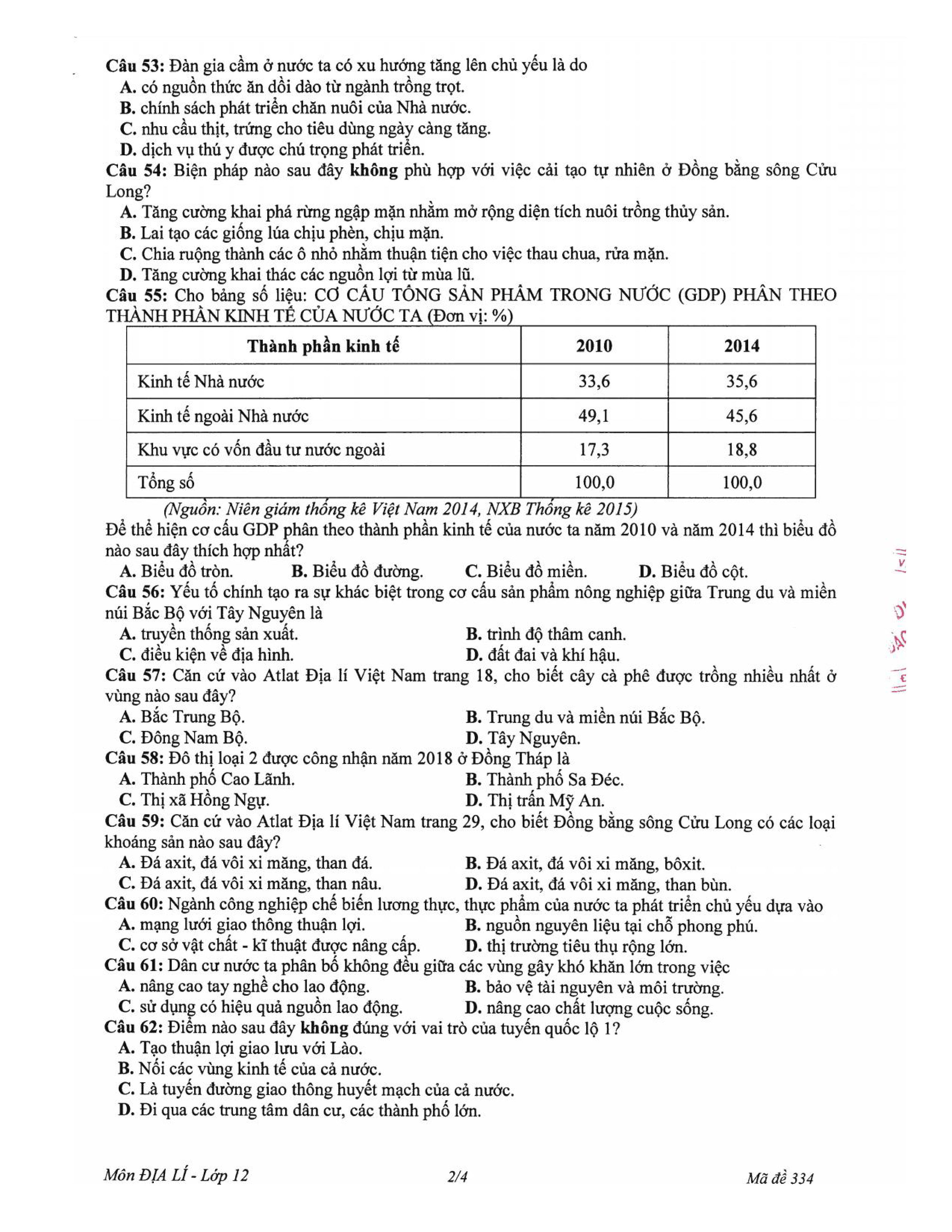 Đề kiểm tra HKII - Lớp 12 - năm học 2018 - 2019 - Địa lí - Sở GD & ĐT Đồng Tháp (mã số 334)