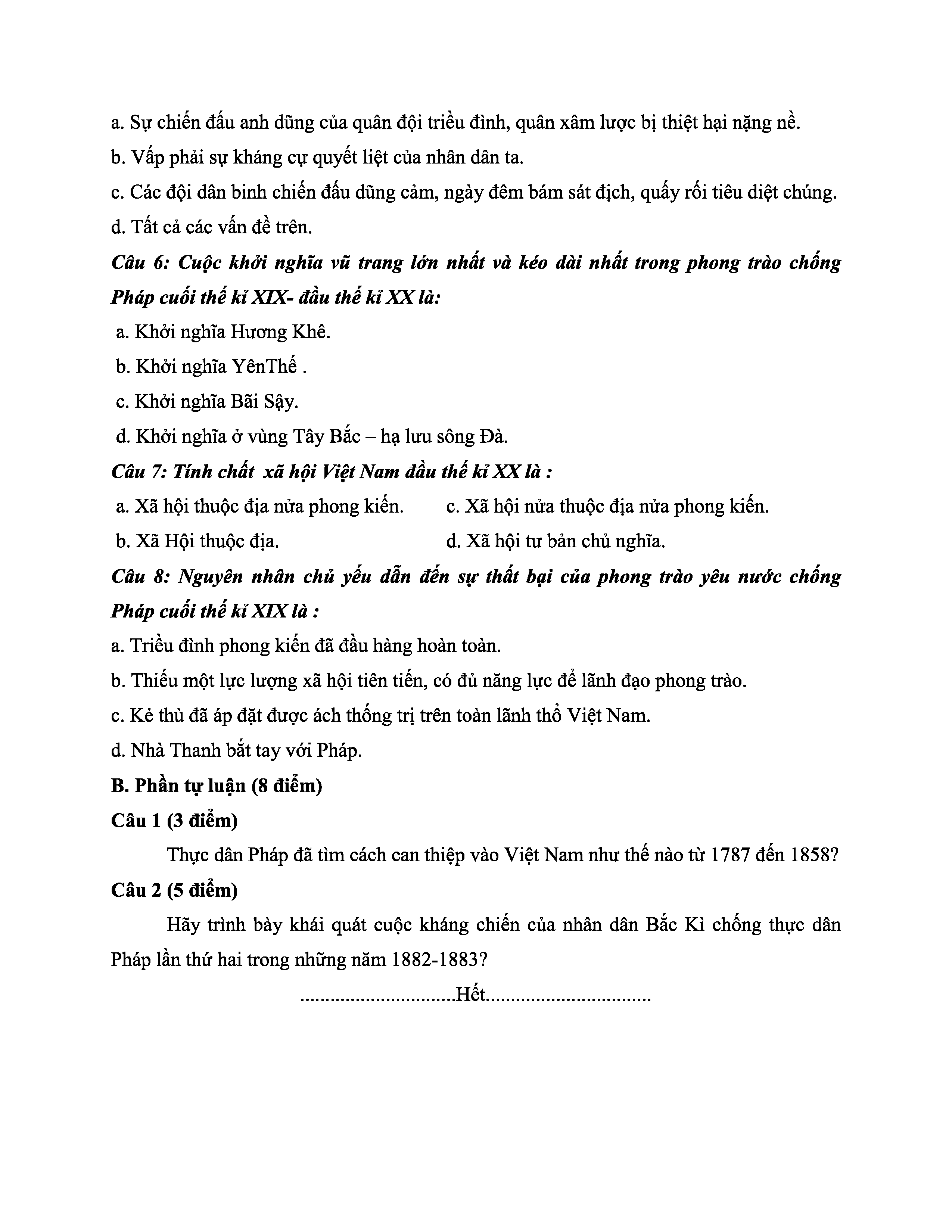 Đề kiểm tra giữa HKII - Lớp 11 - năm học 2018 - 2019 - Lịch sử - Đề số 2