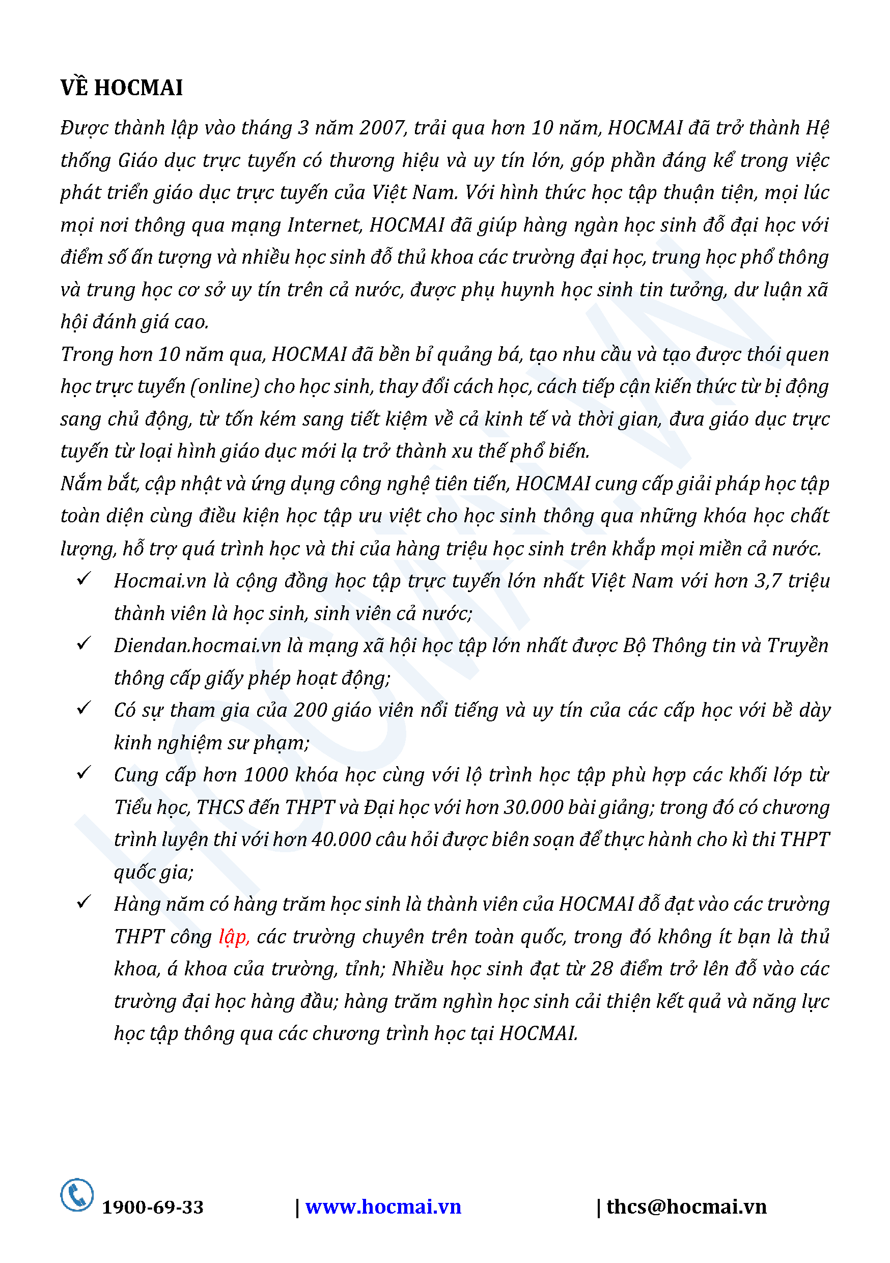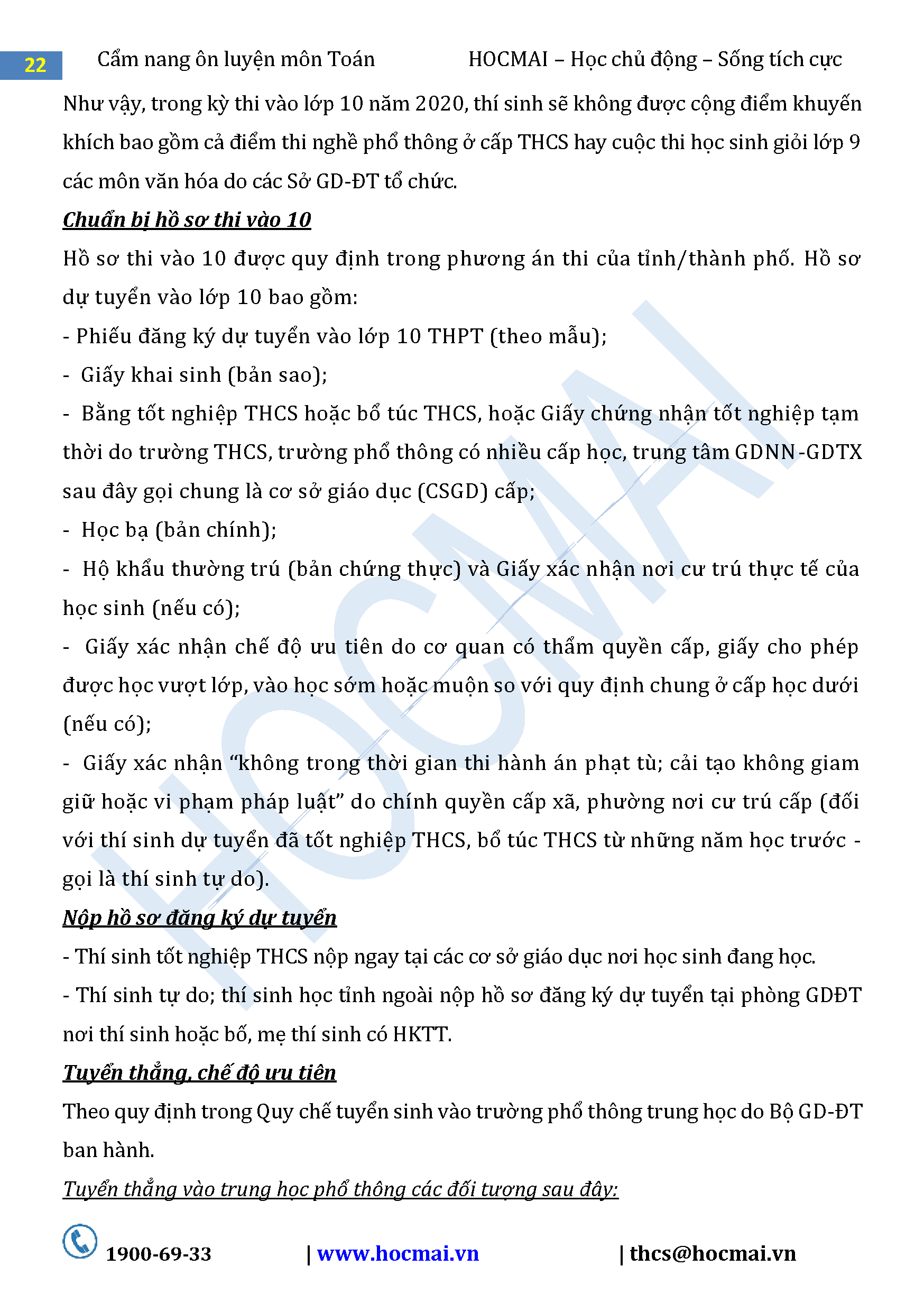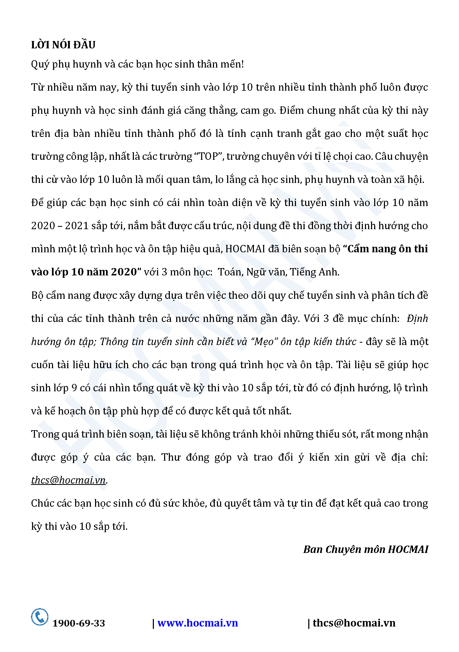 Với mục đích giúp phụ huynh và học sinh lớp 9 có cái nhìn toàn diện về cấu trúc, nội dung thi vào 10, đồng thời định hướng cho mình một lộ trình học và ôn tập hiệu quả, HOCMAI trân trọng gửi tới bộ “Cẩm nang ôn thi vào lớp 10 năm 2020” với bộ 3 môn học: T