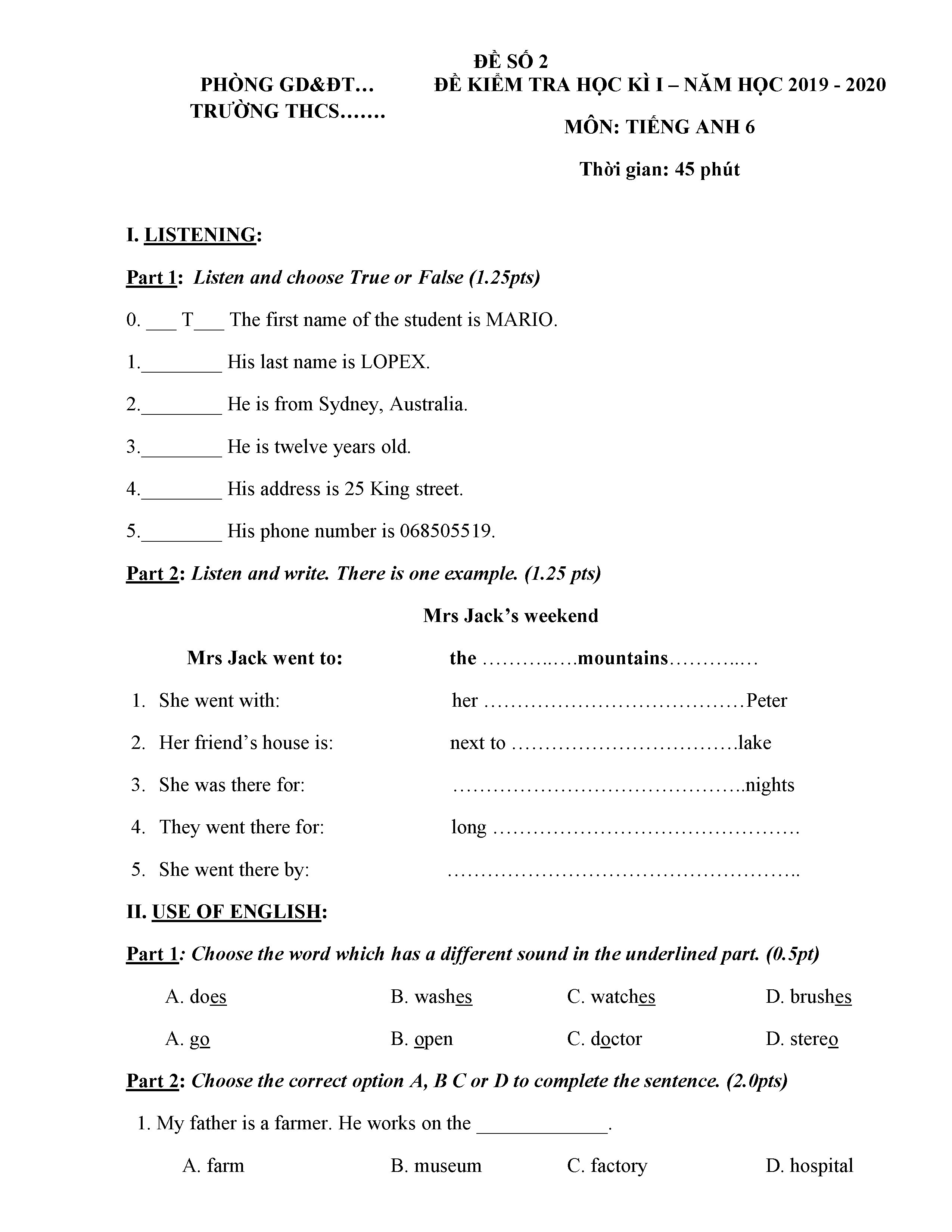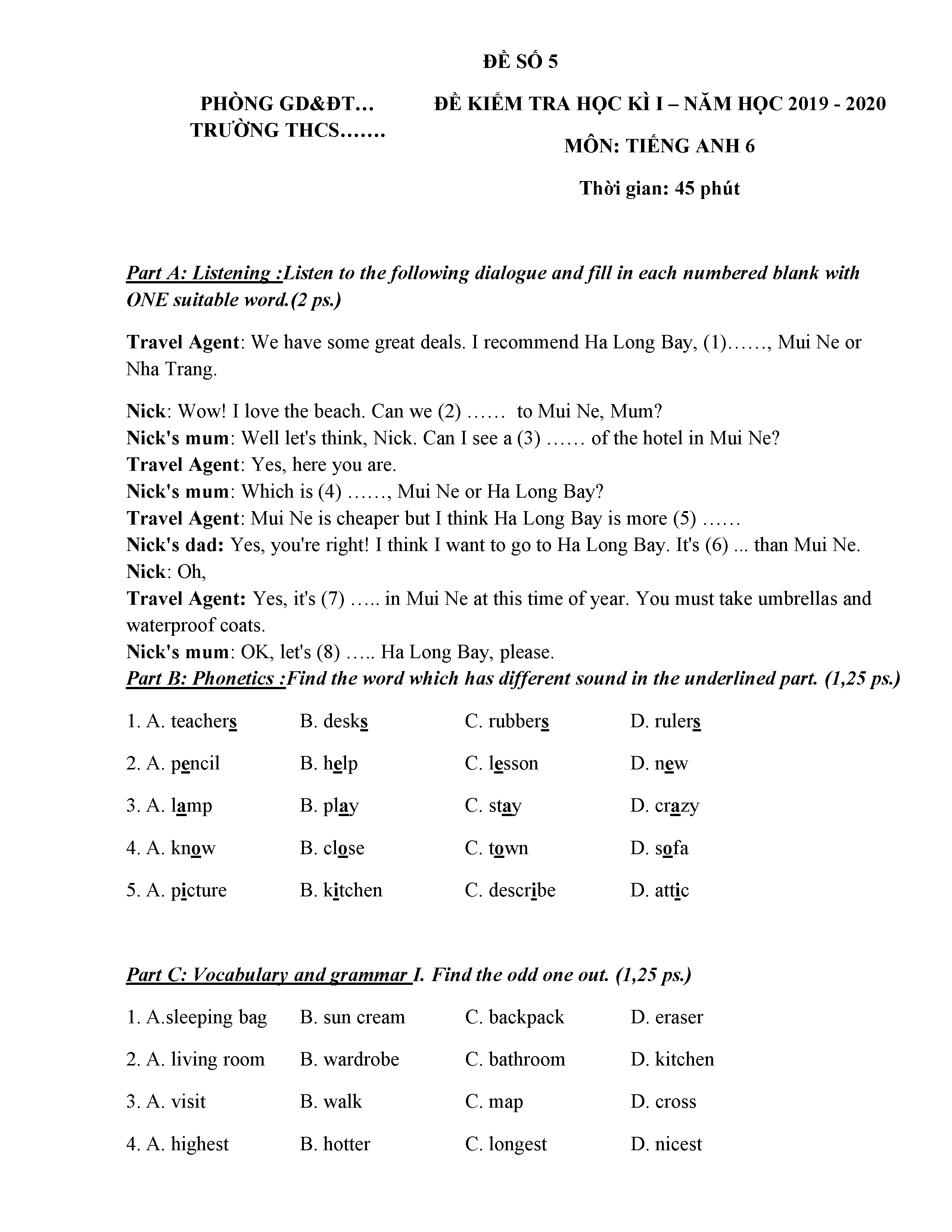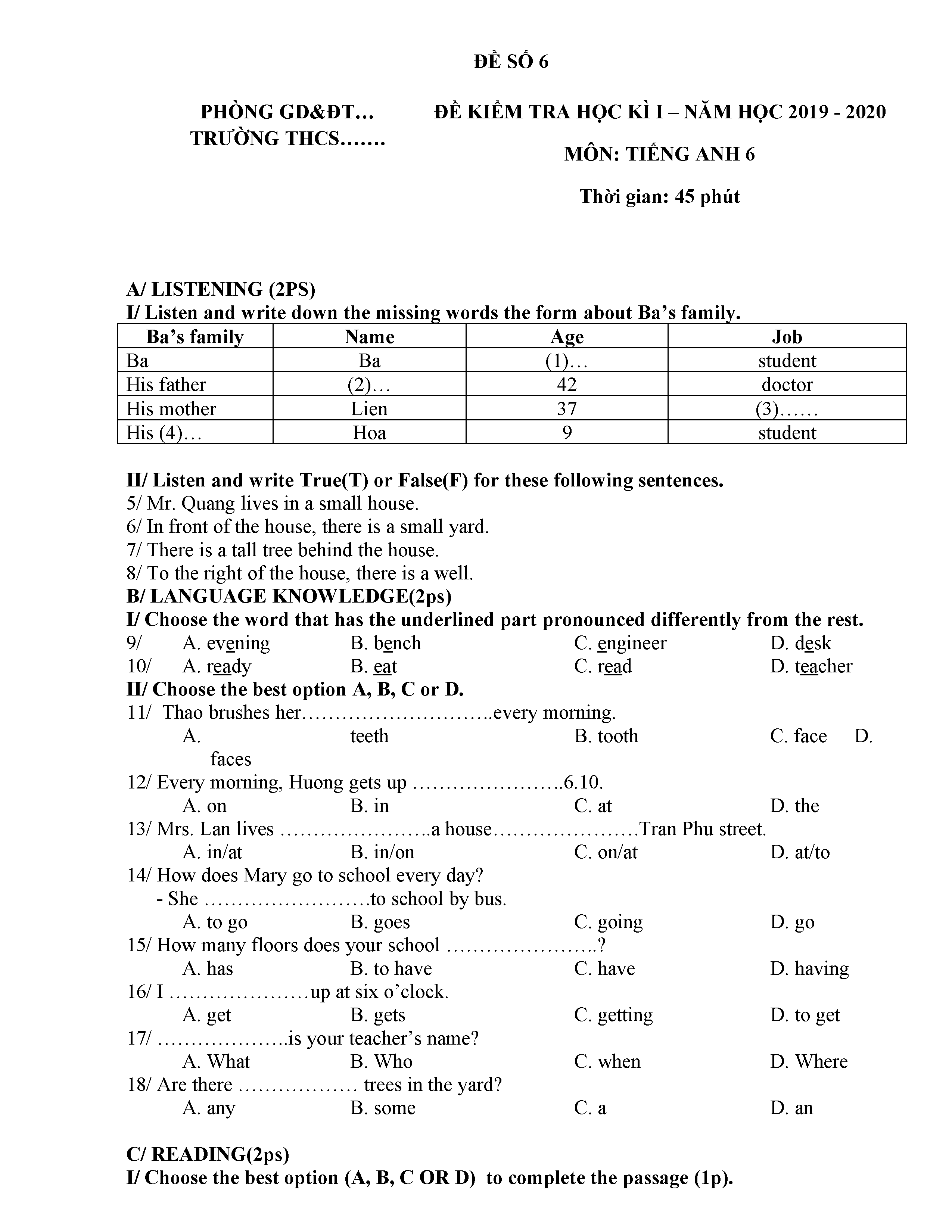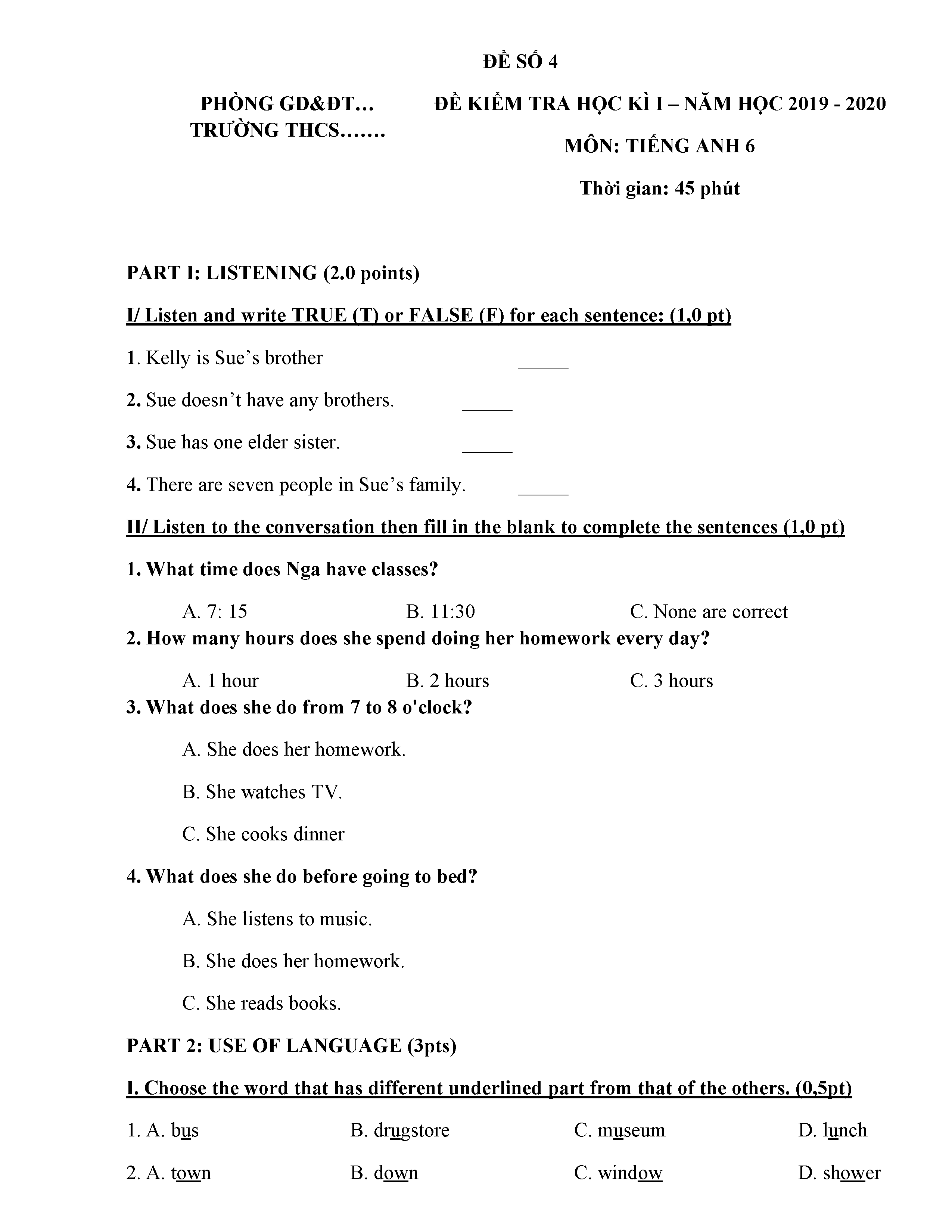 ĐỀ THI TIẾNG ANH 6 NĂM HỌC 2019-2020