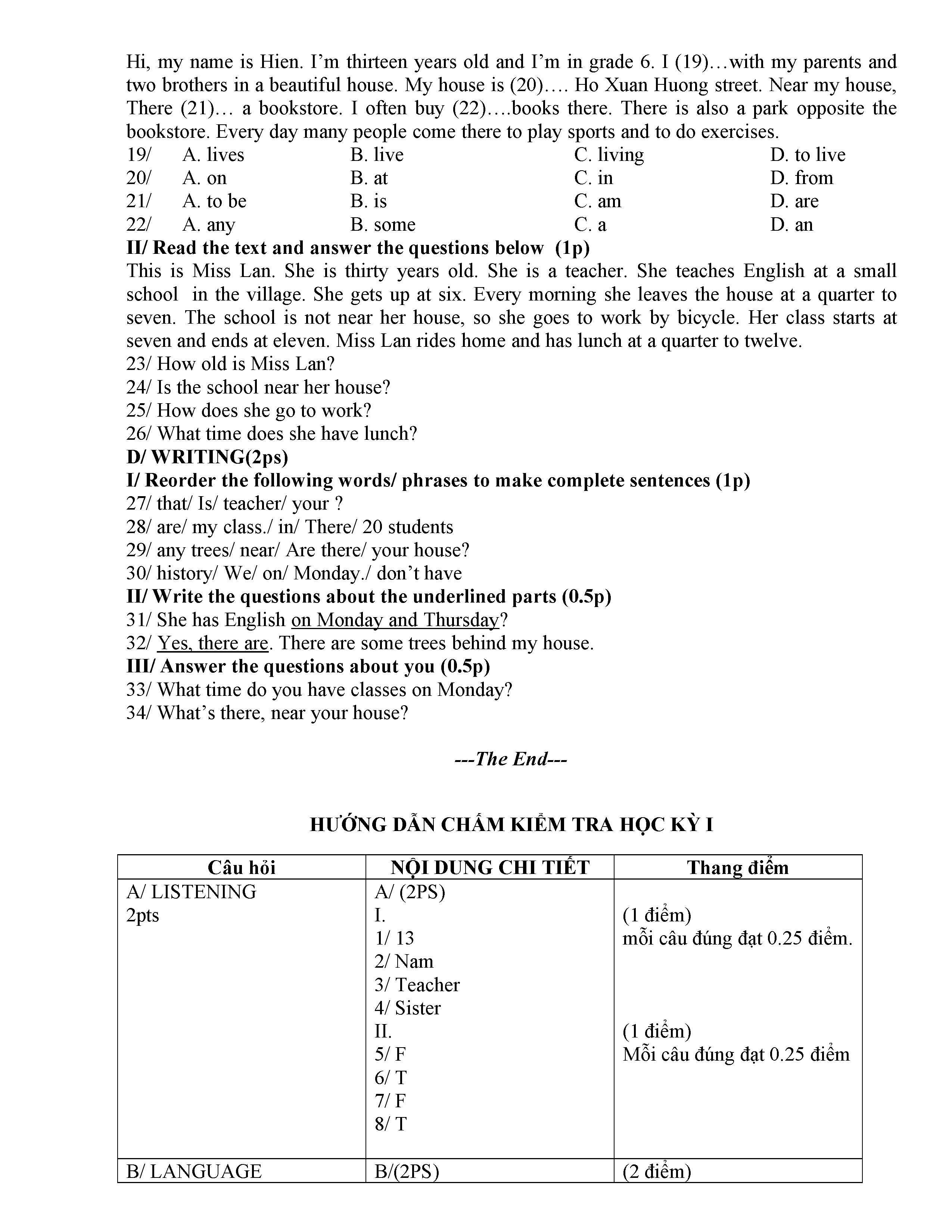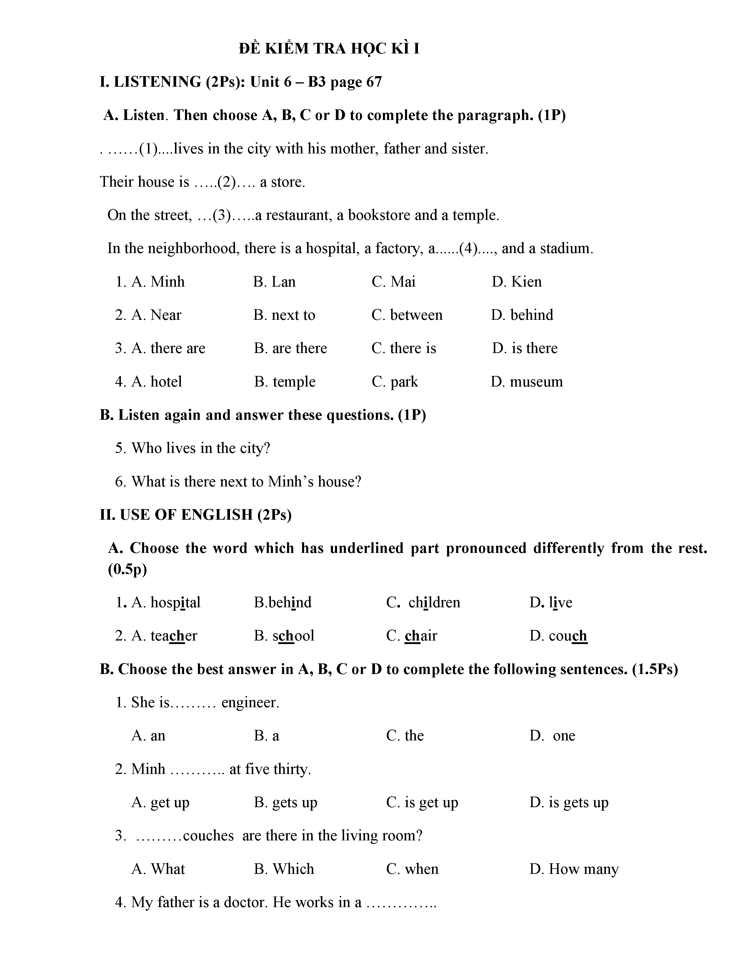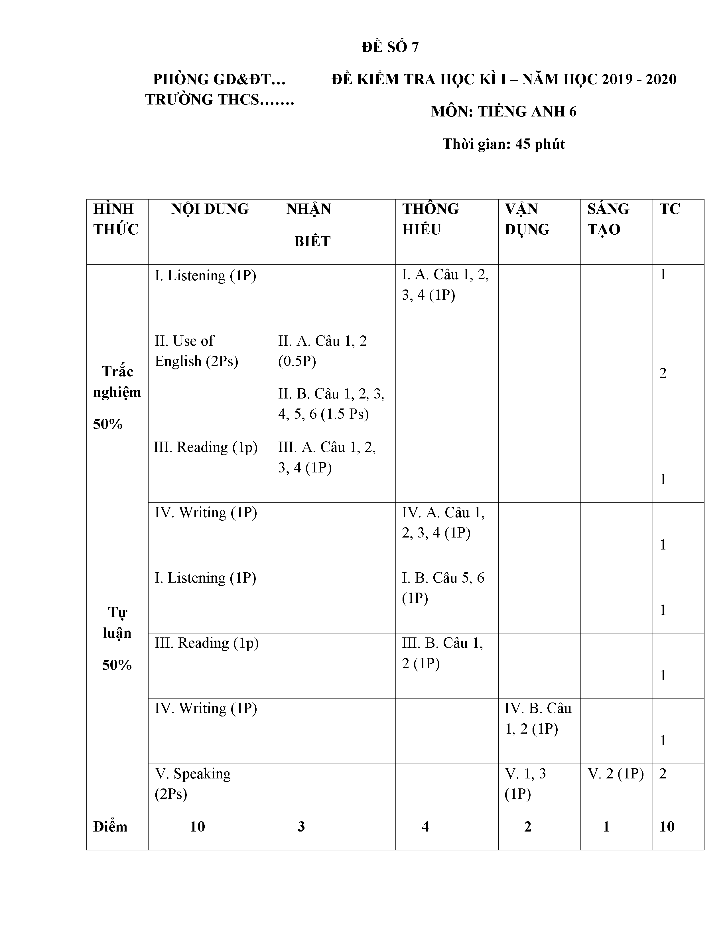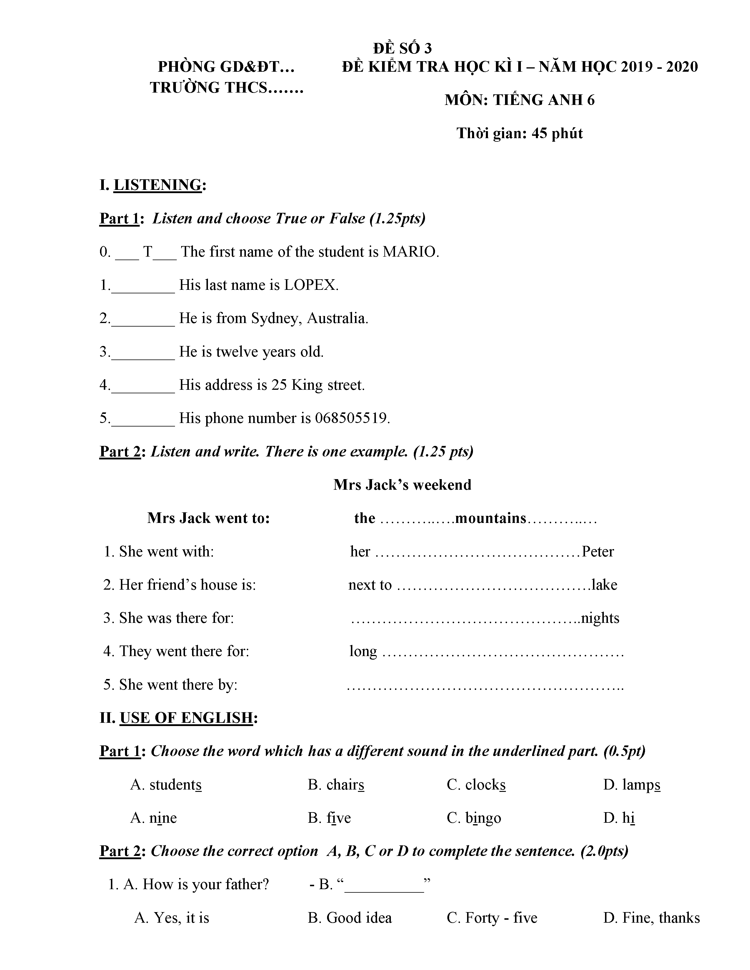 ĐỀ THI TIẾNG ANH 6 NĂM HỌC 2019-2020