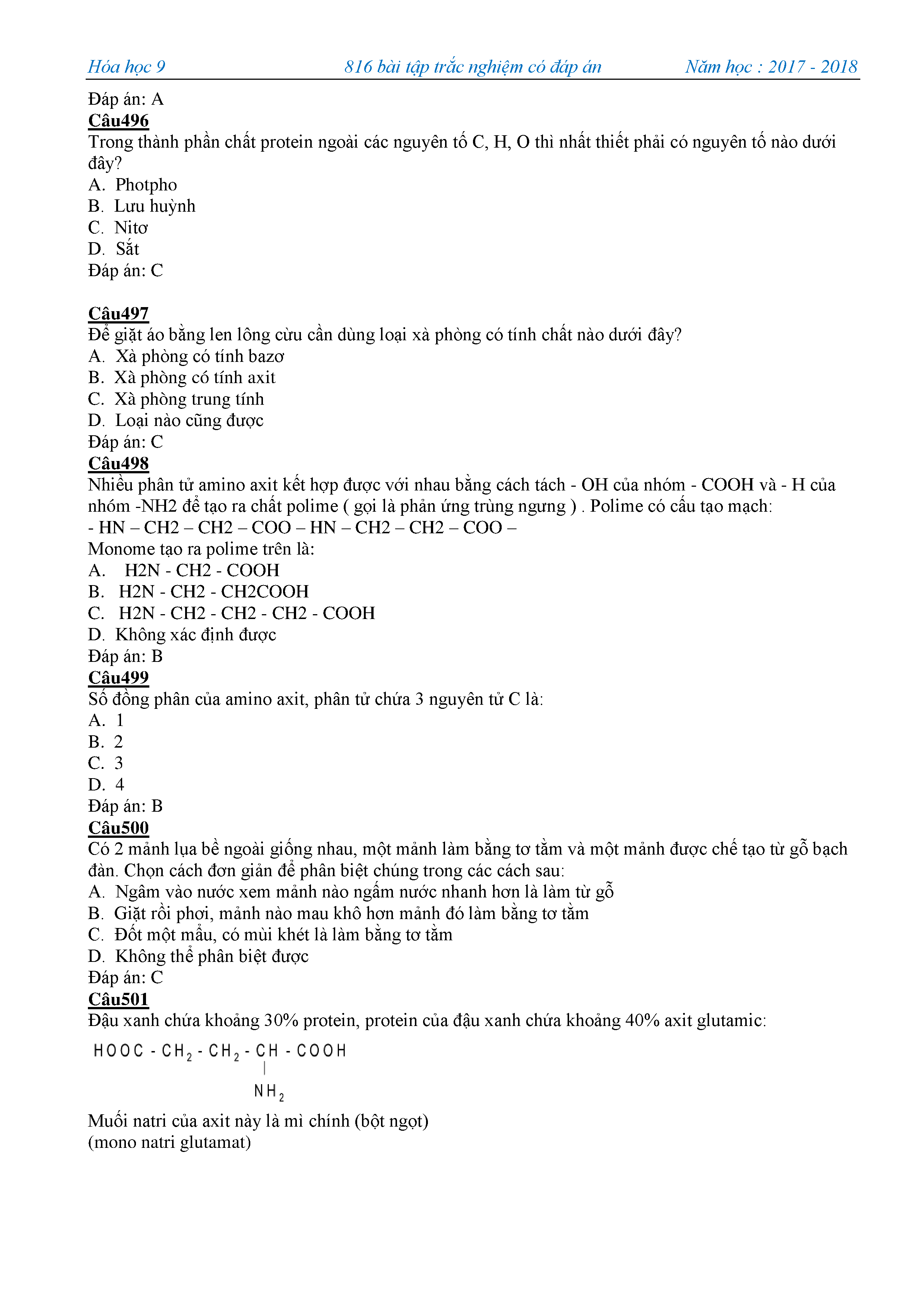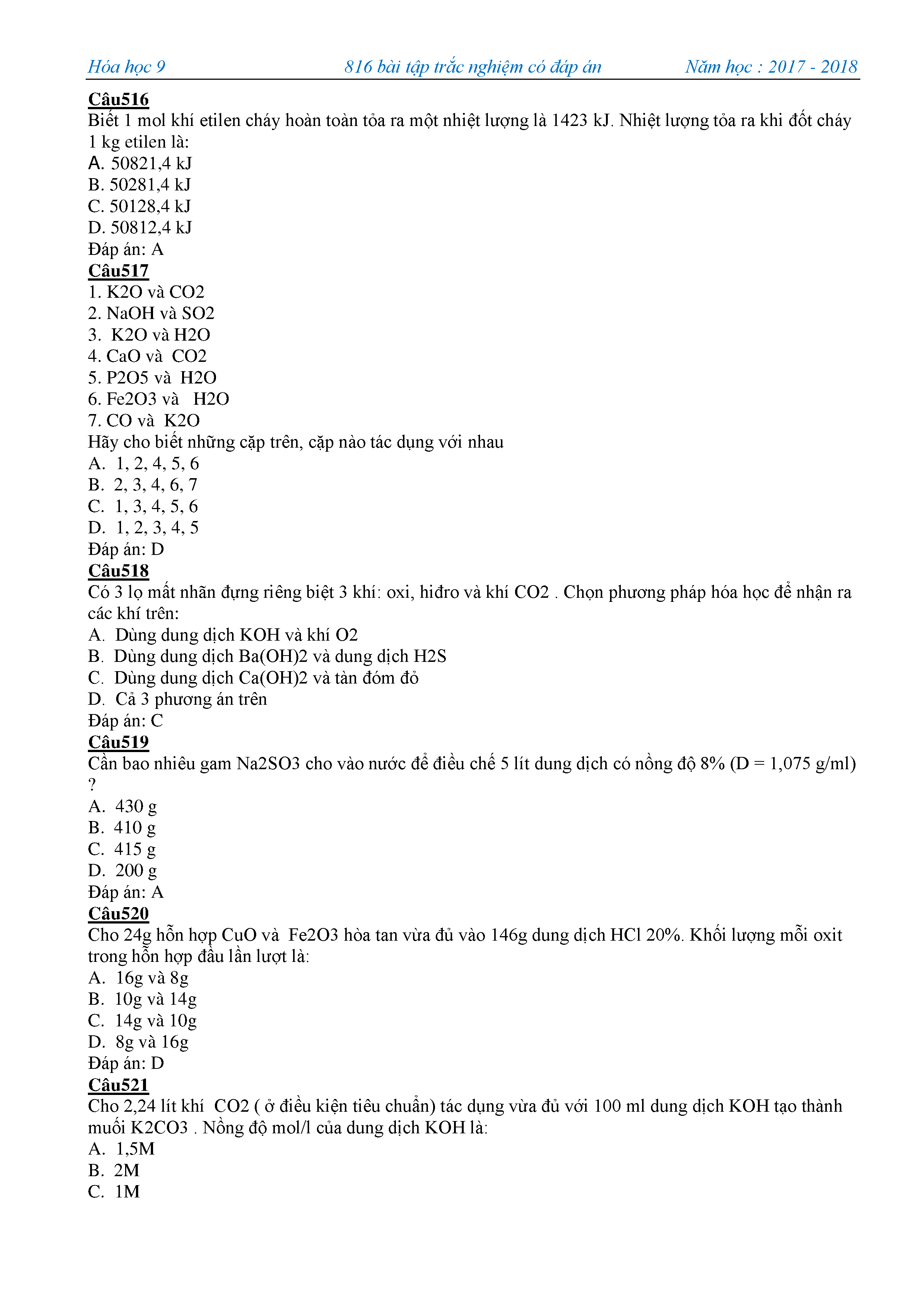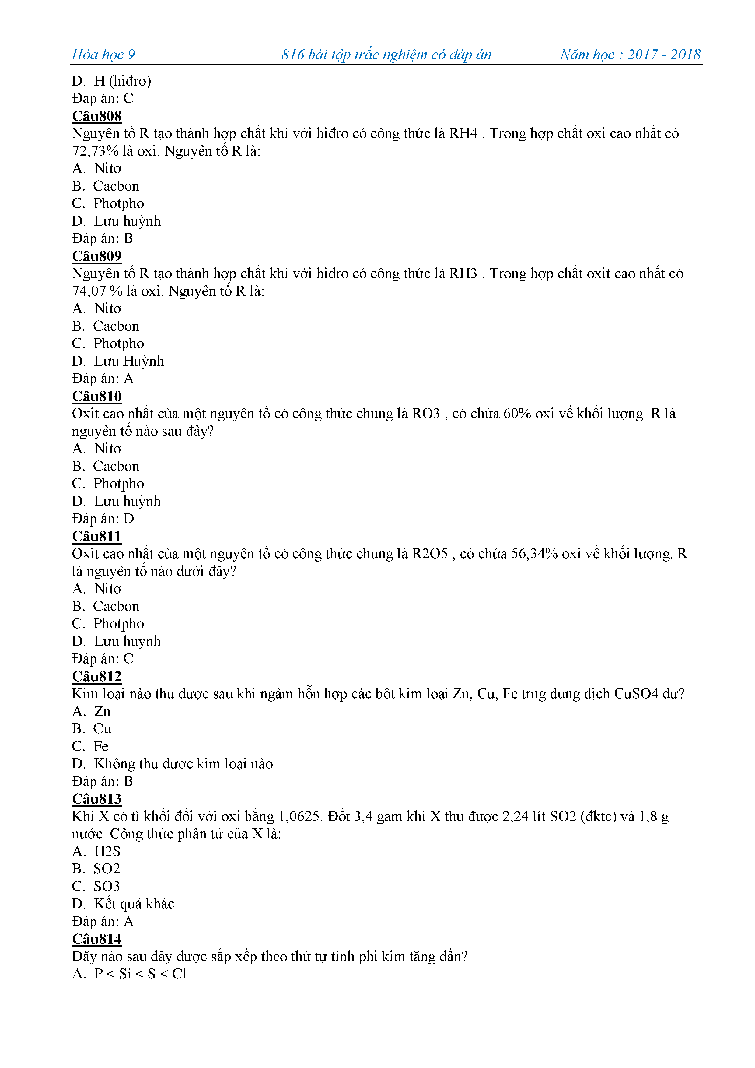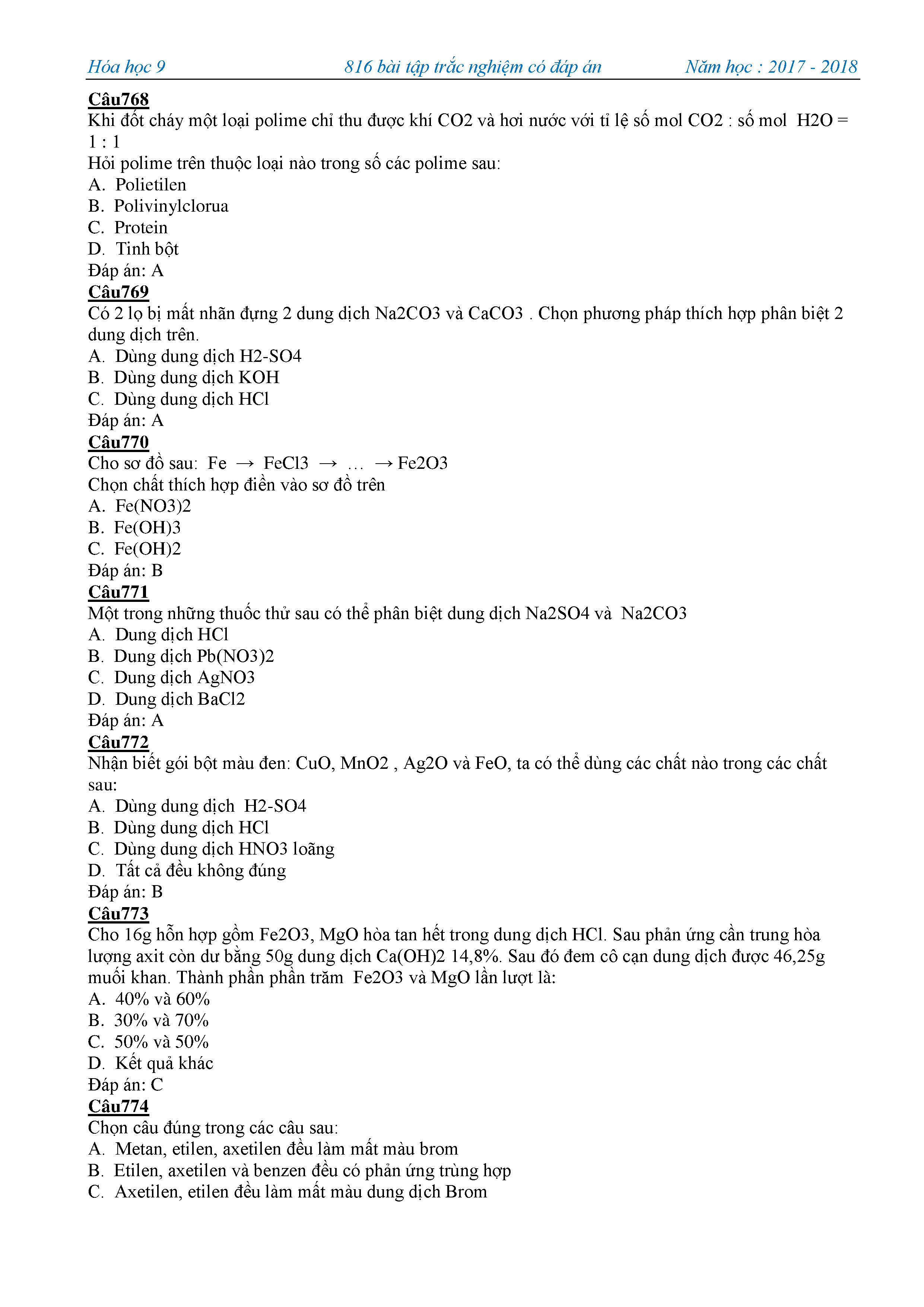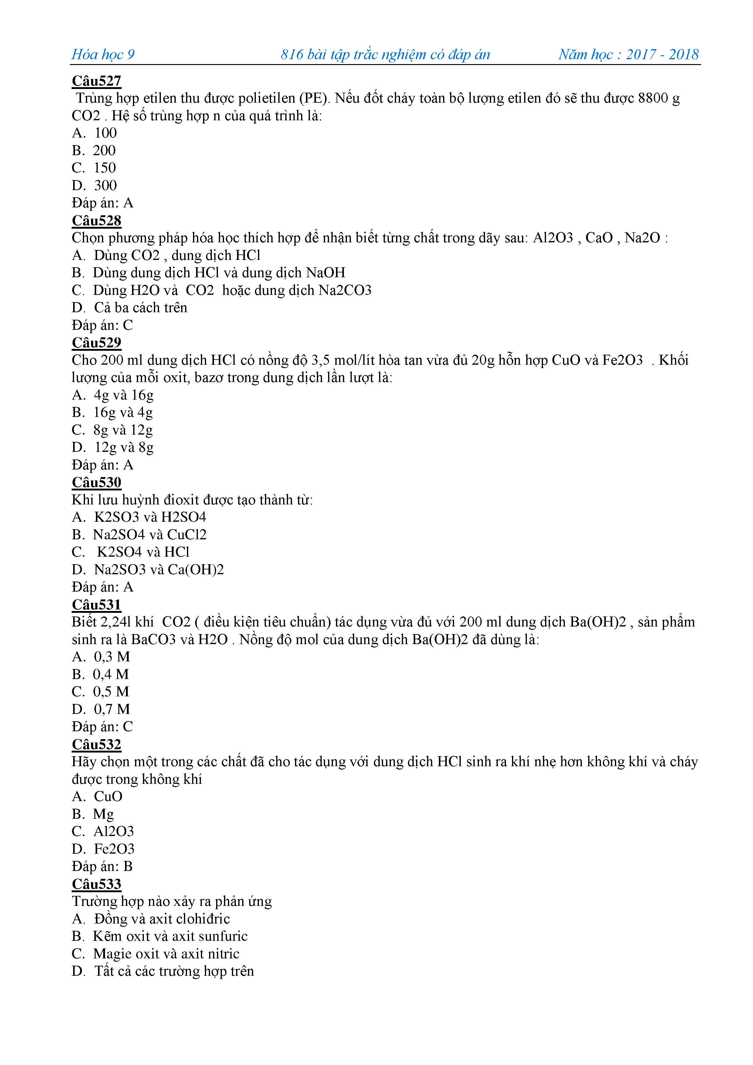 816 CÂU TRẮC NGHIỆM HÓA HỌC 9 (CÓ ĐÁP ÁN)