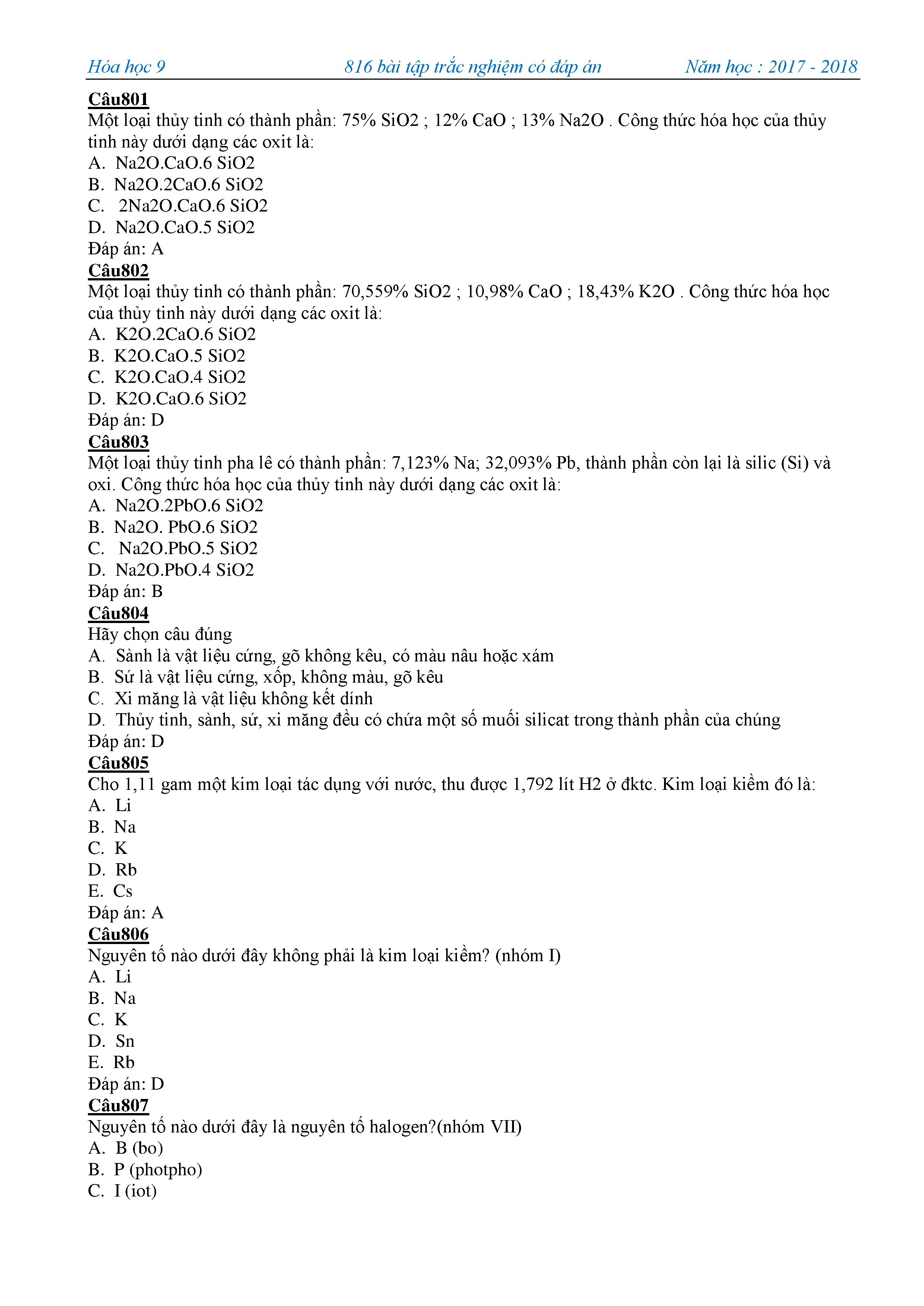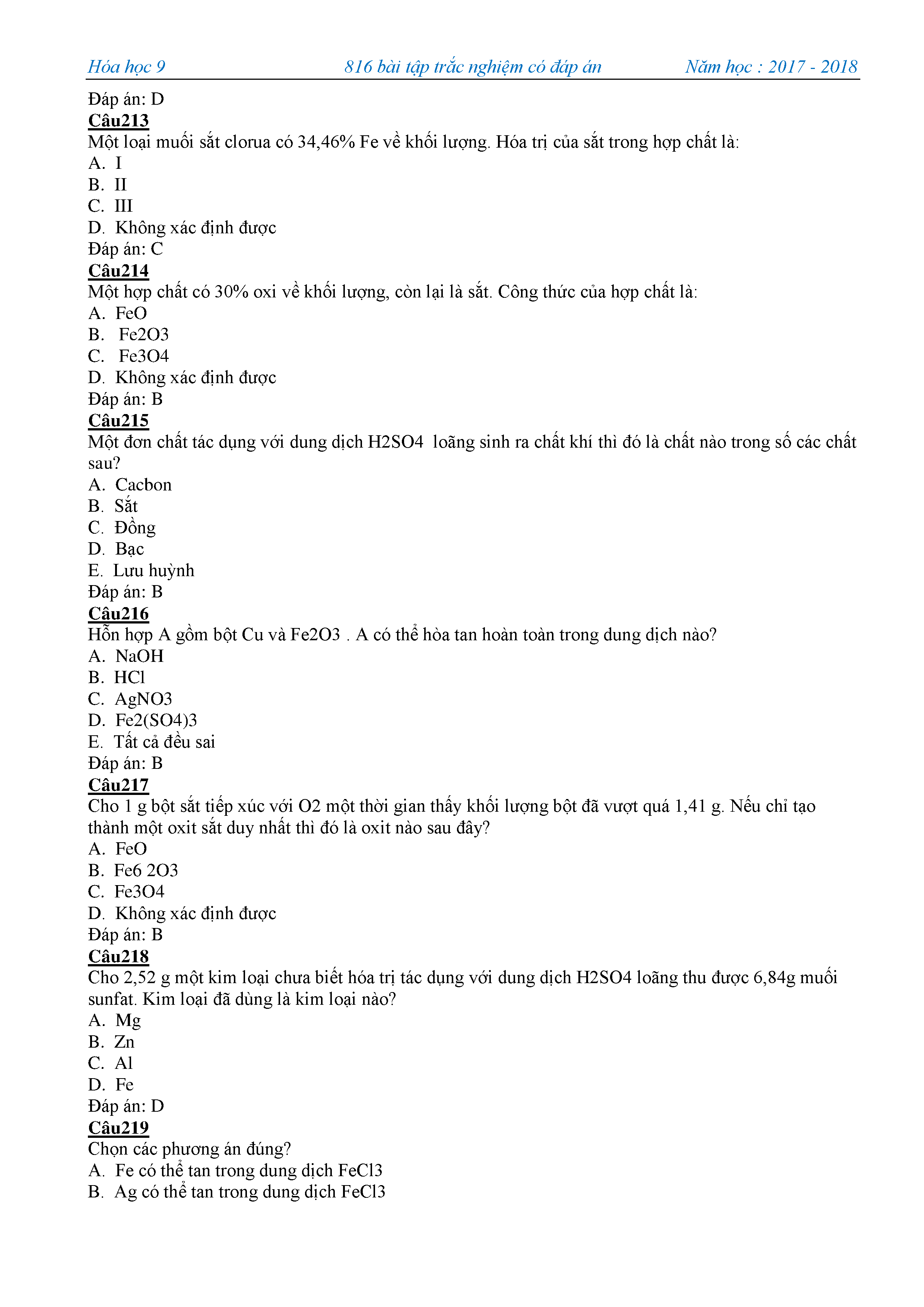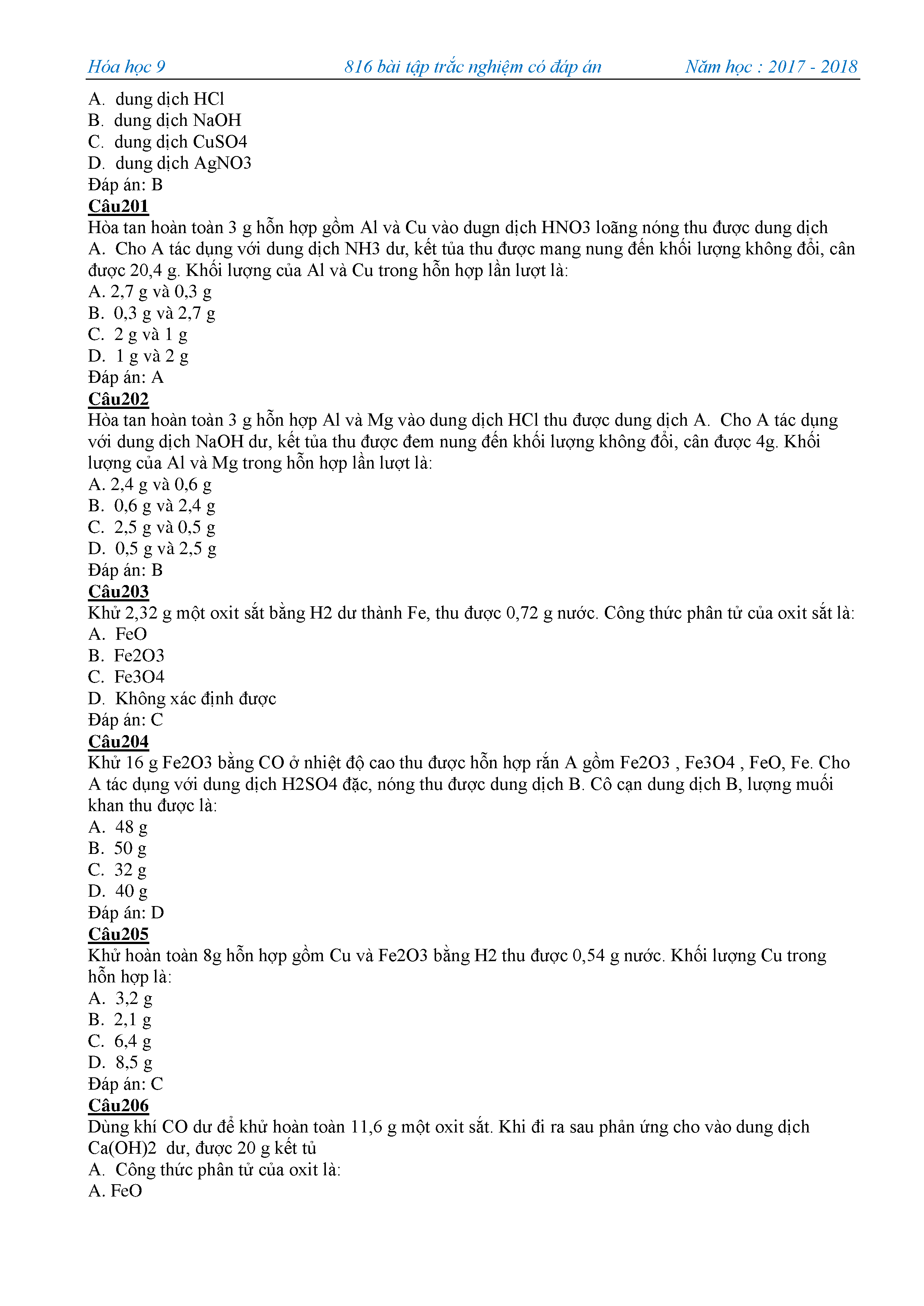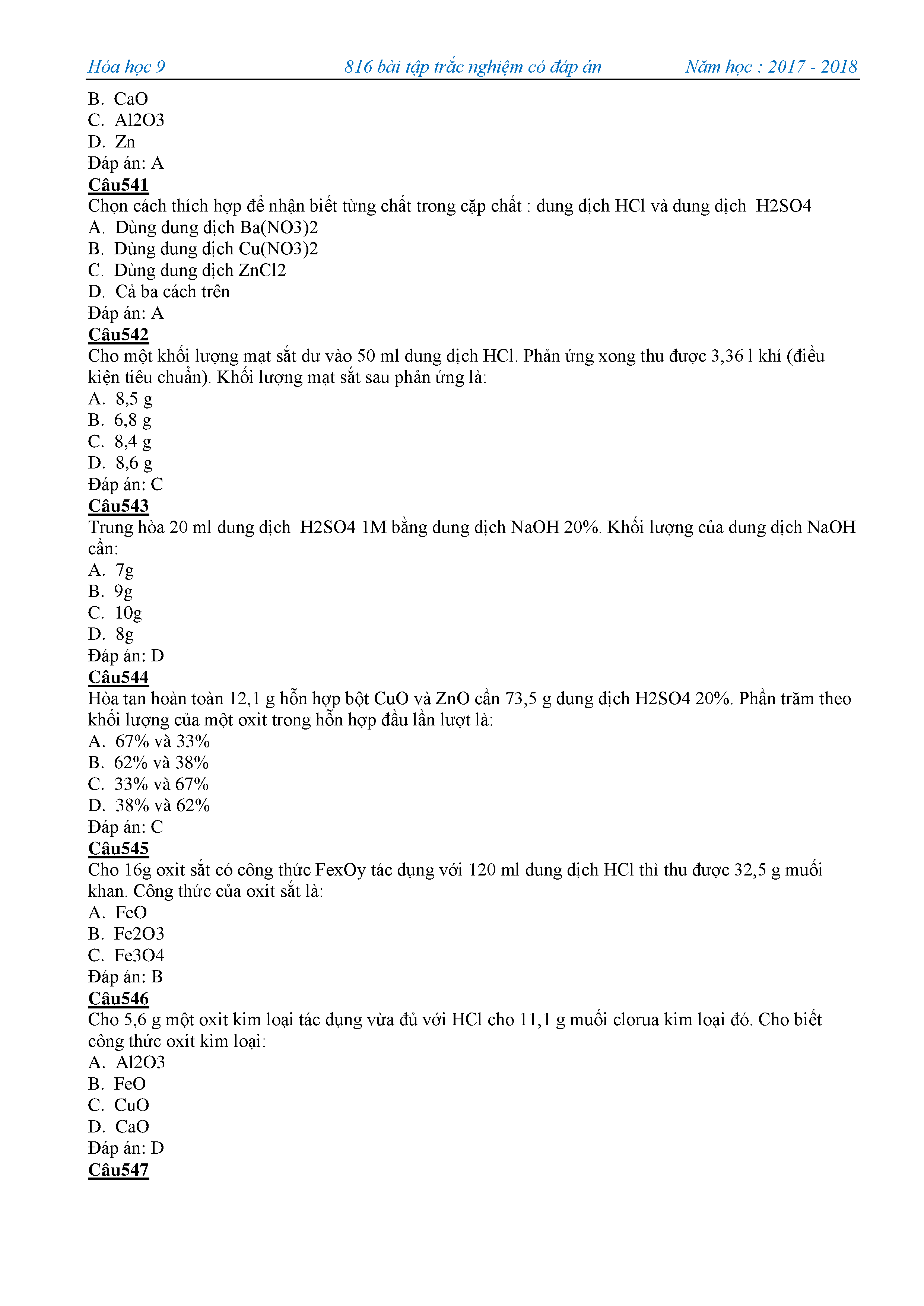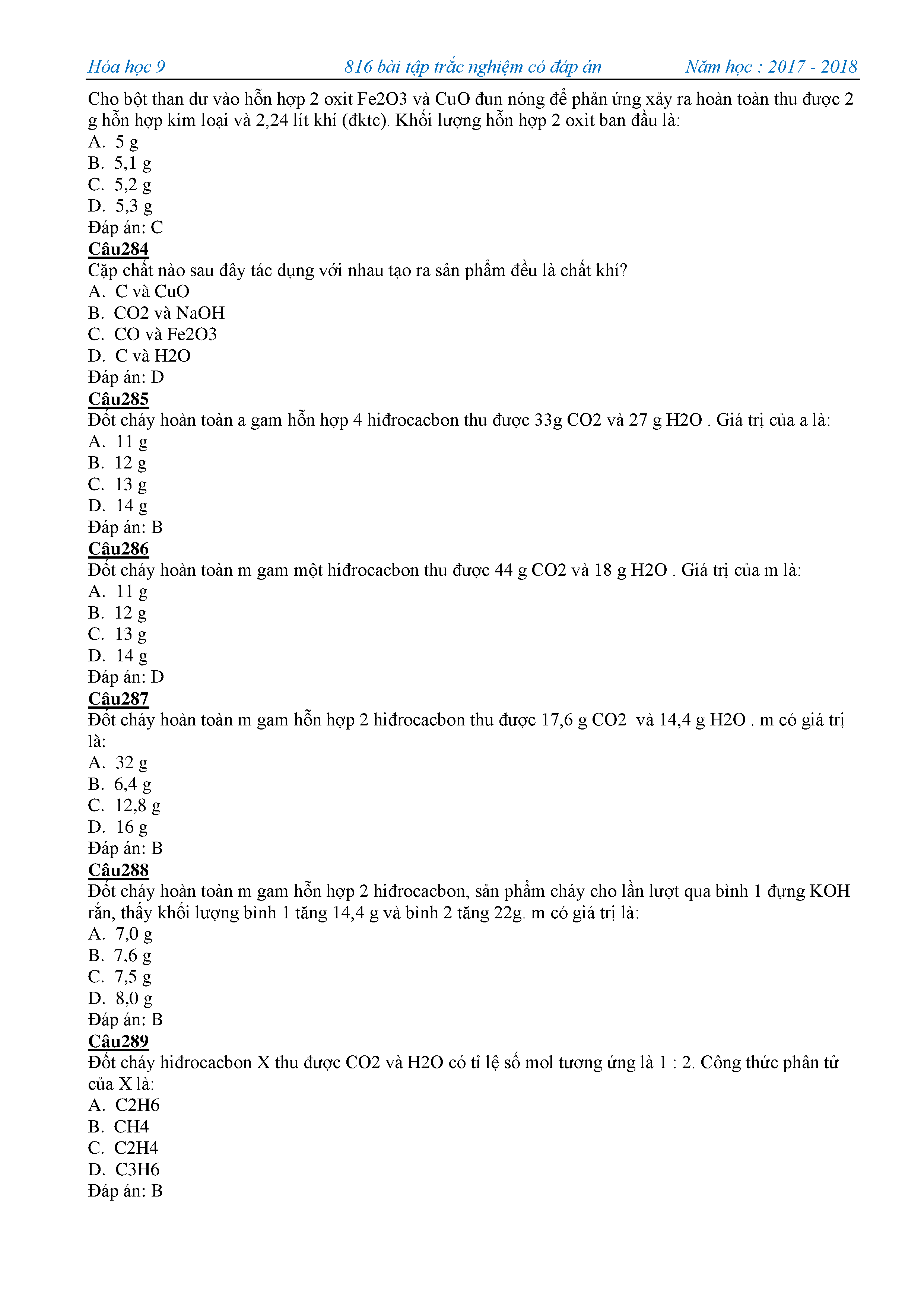816 CÂU TRẮC NGHIỆM HÓA HỌC 9 (CÓ ĐÁP ÁN)