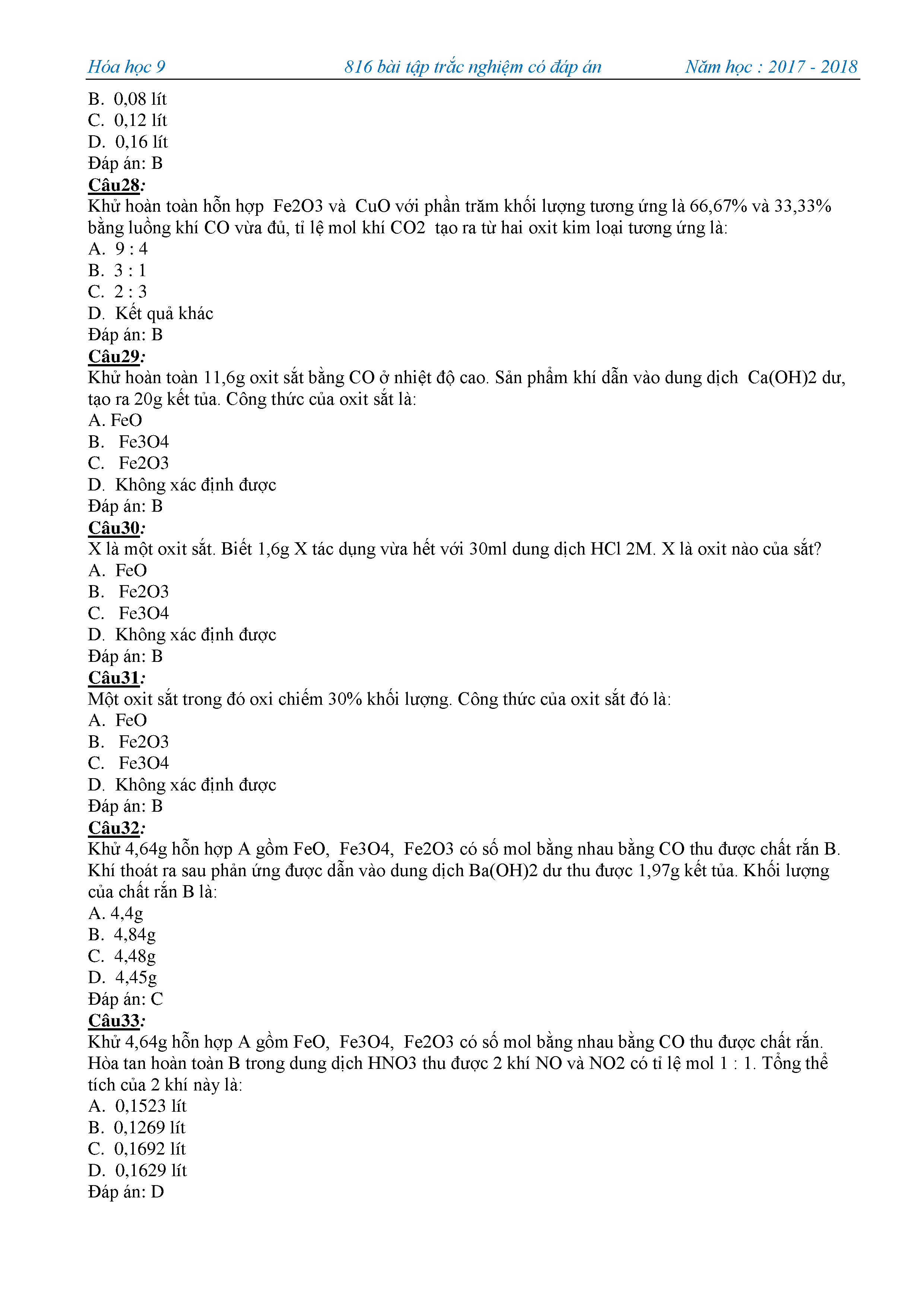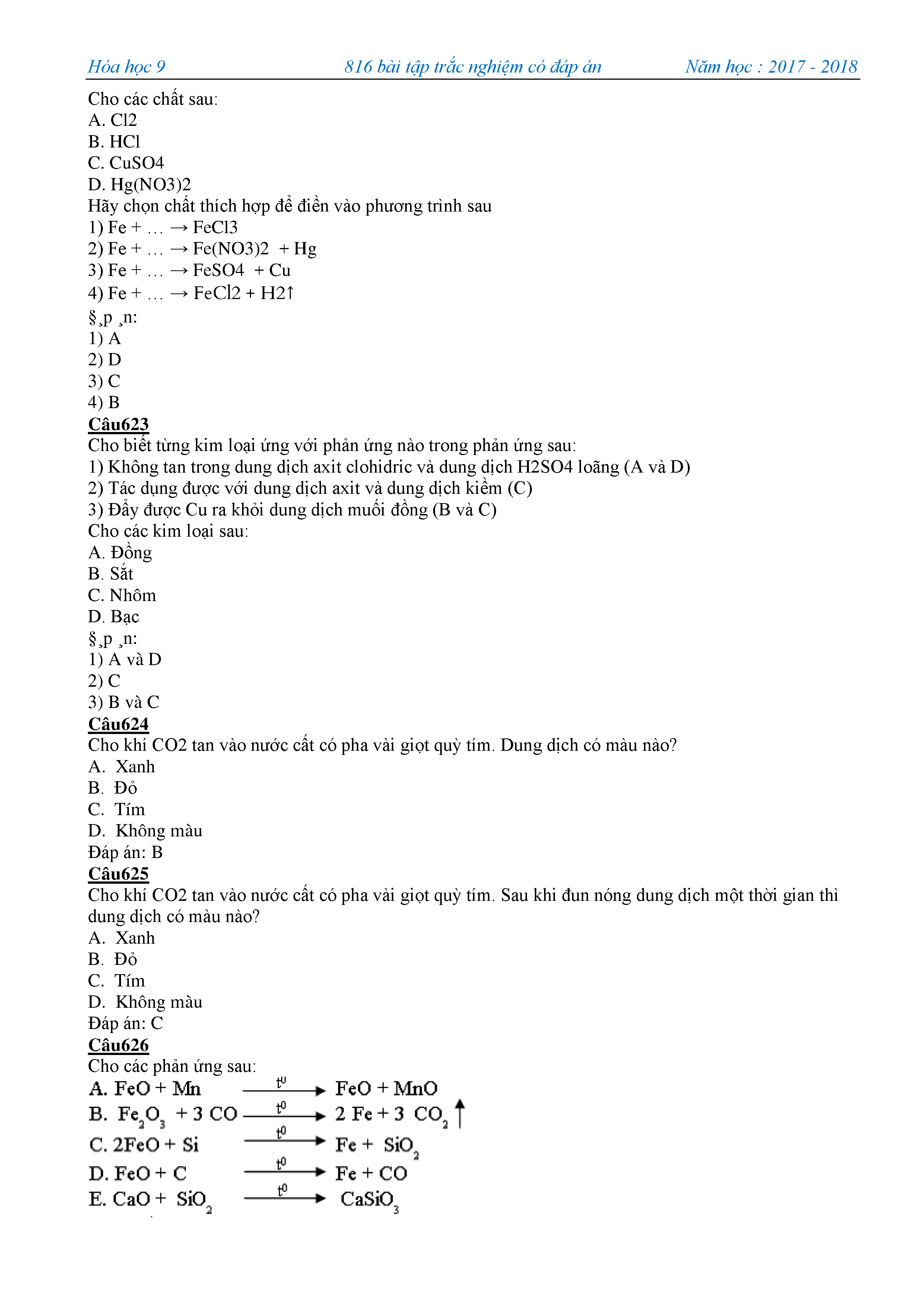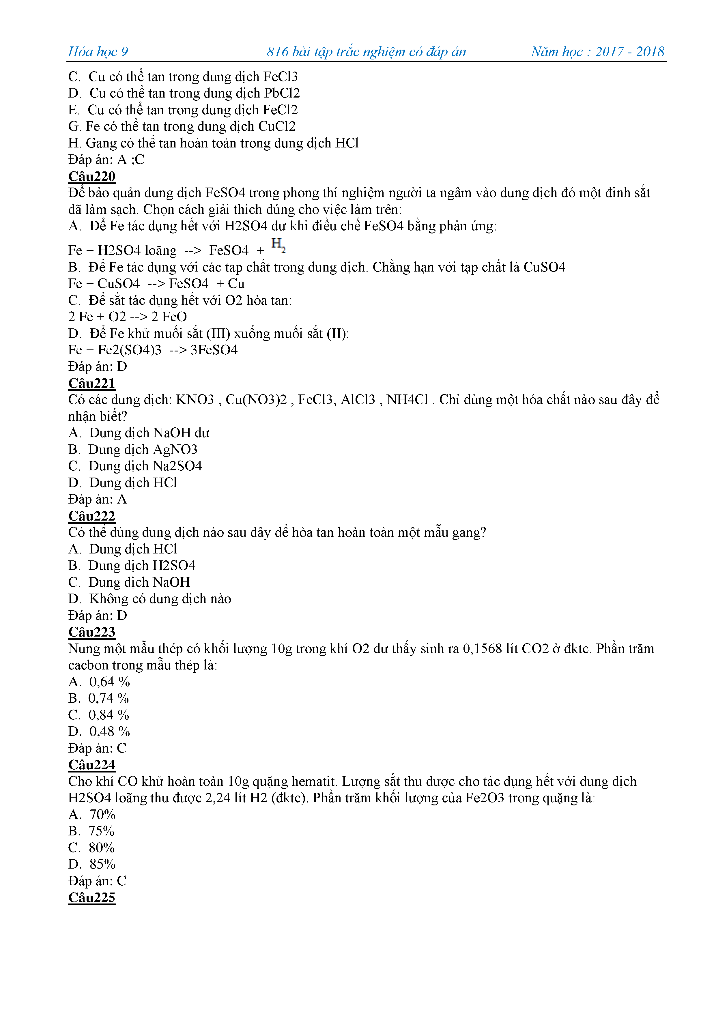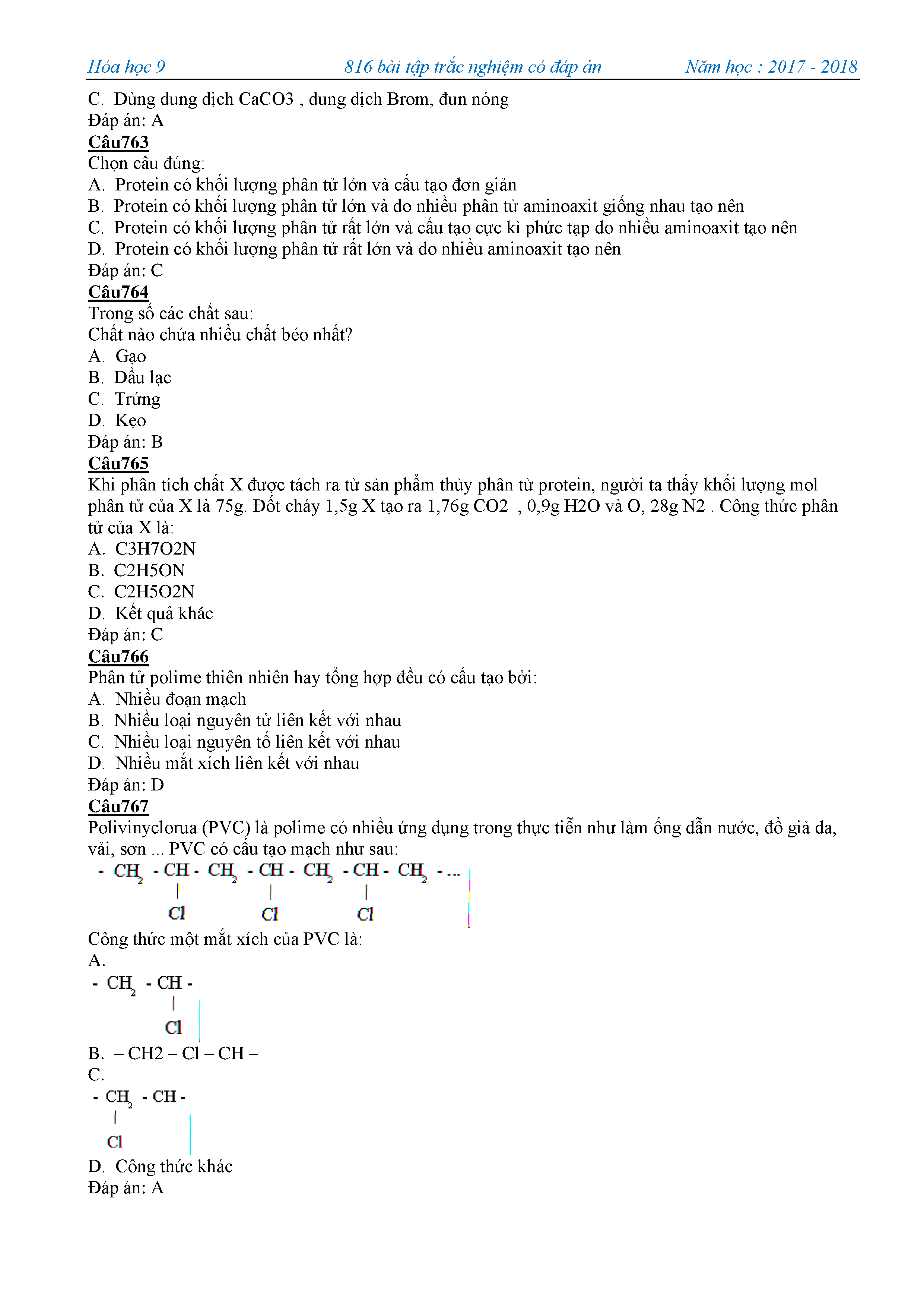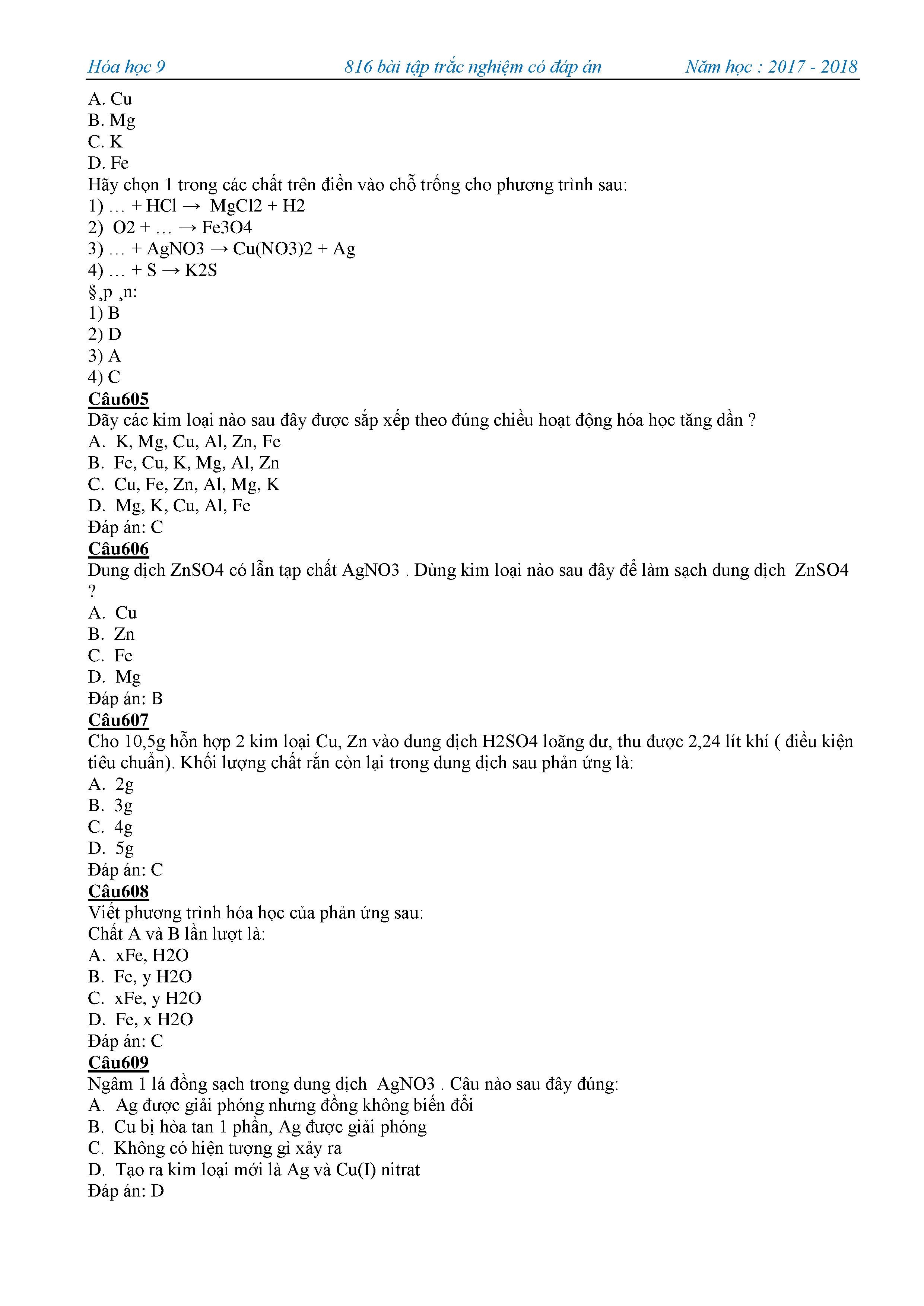 816 CÂU TRẮC NGHIỆM HÓA HỌC 9 (CÓ ĐÁP ÁN)
