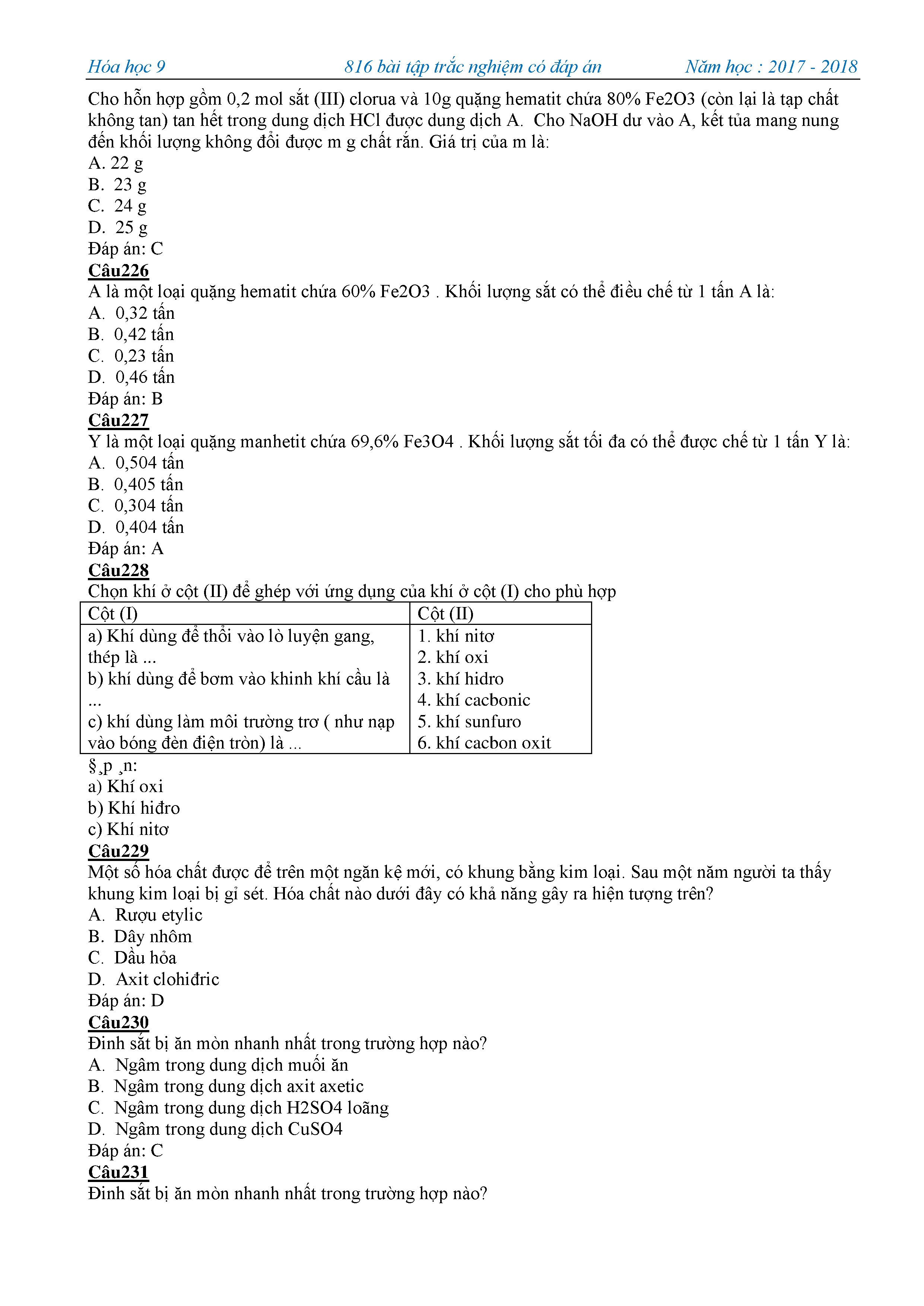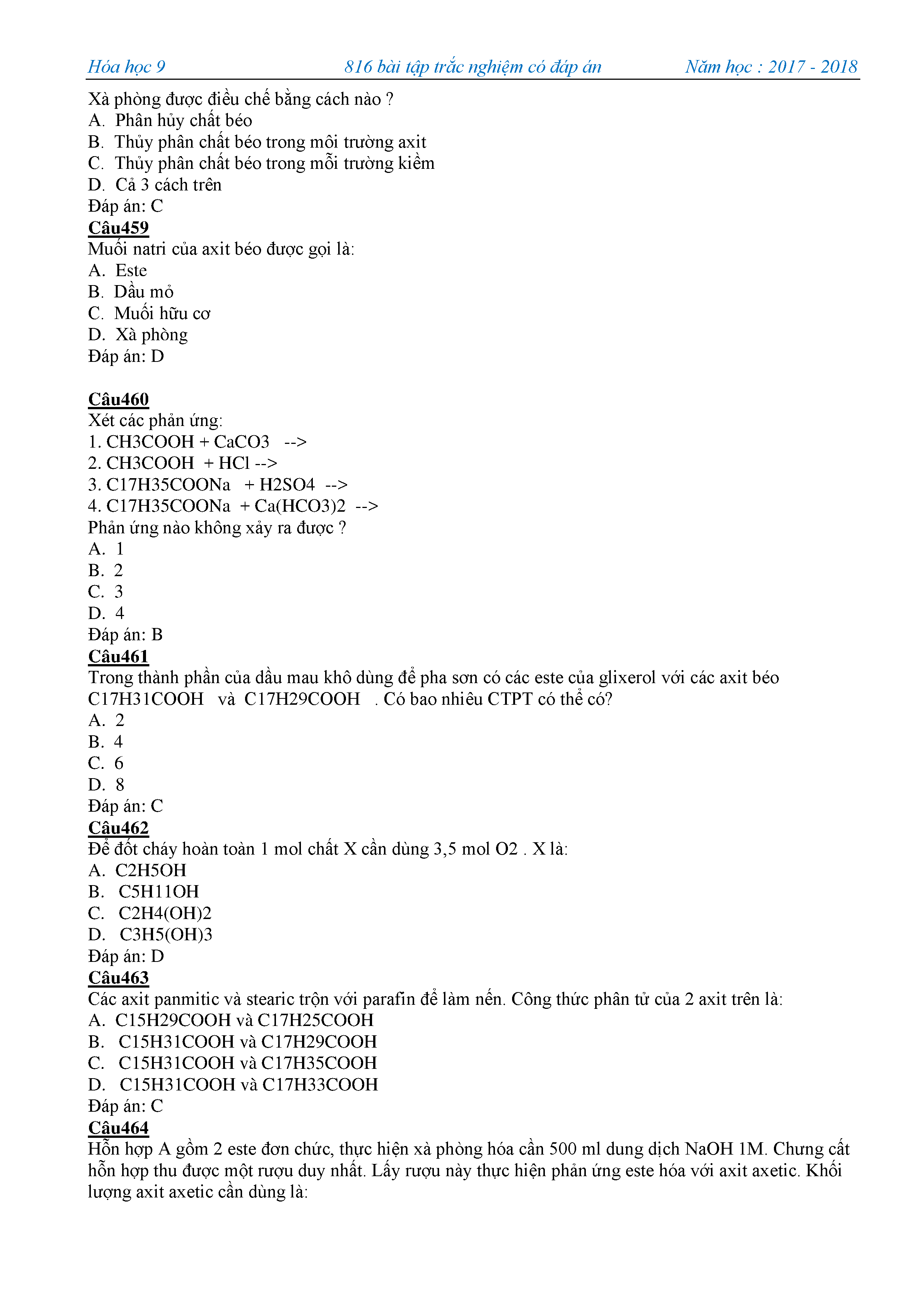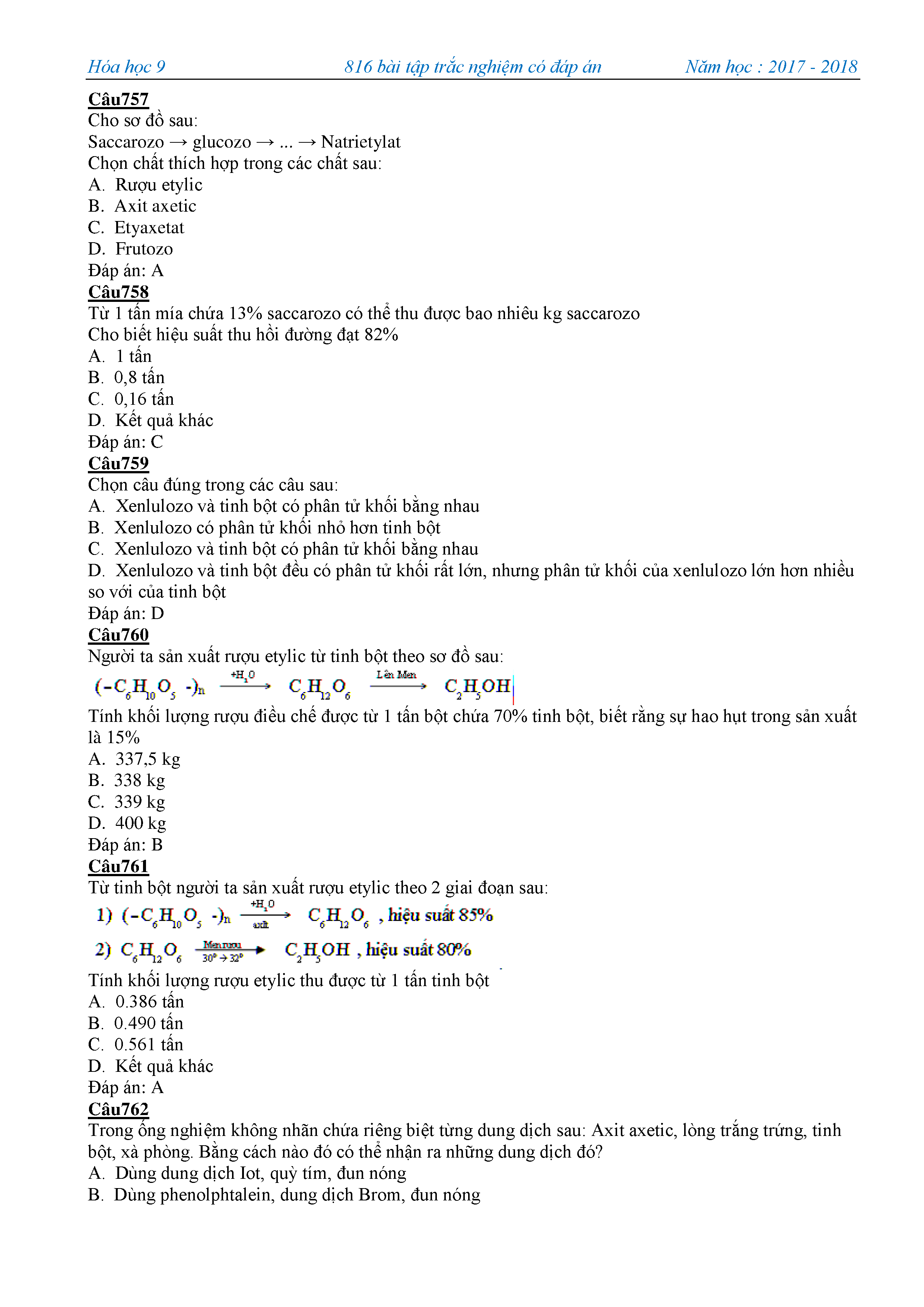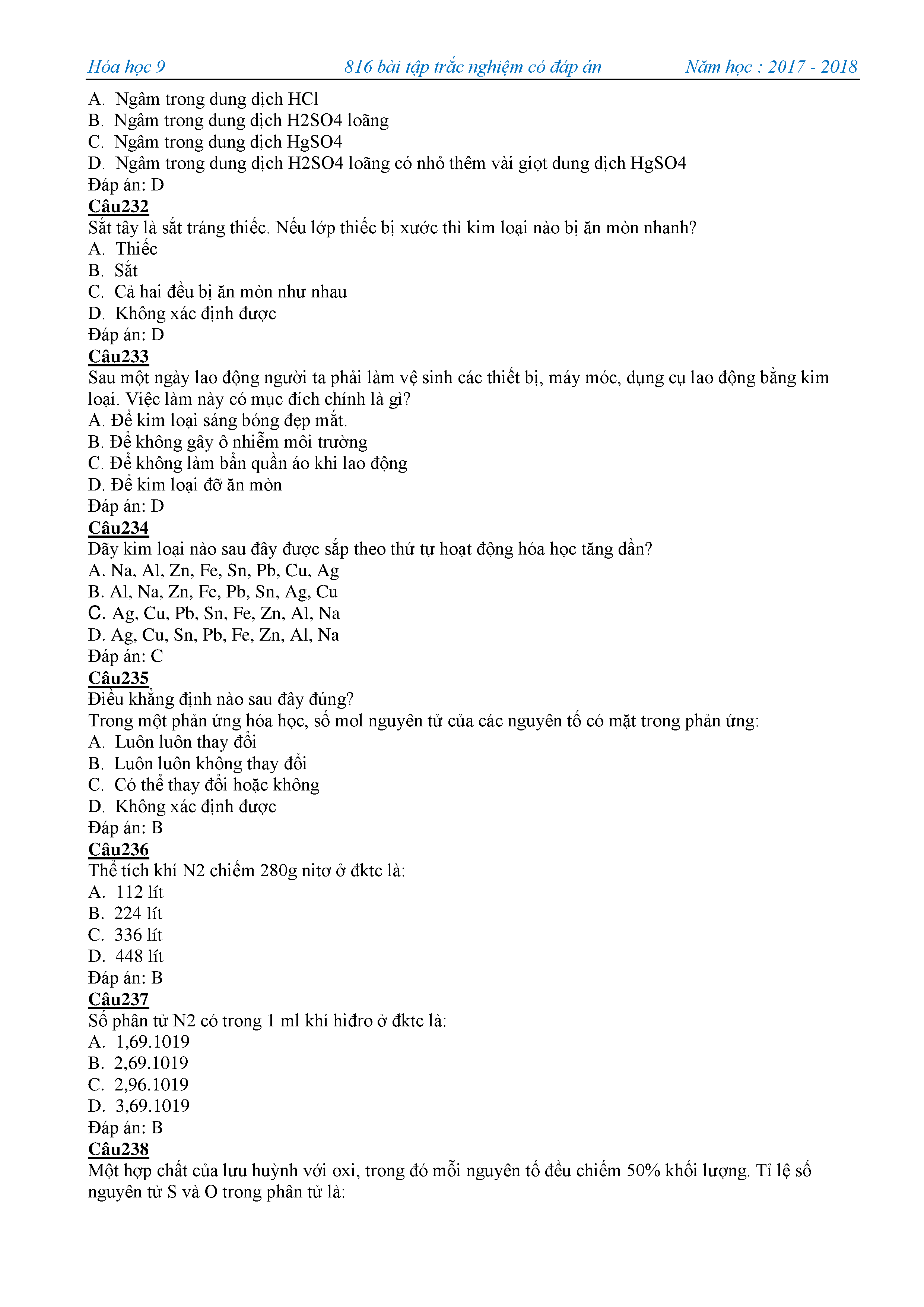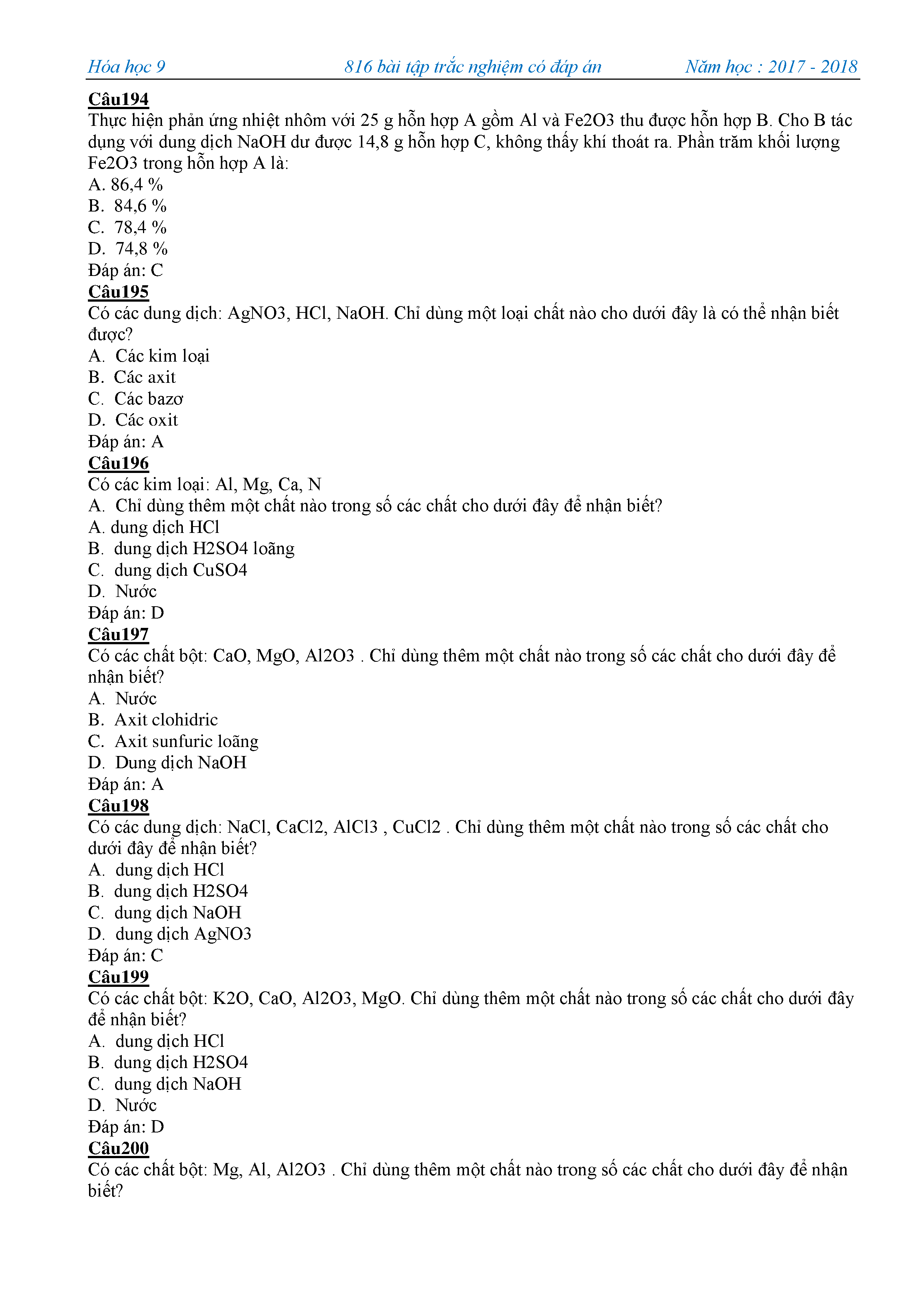 816 CÂU TRẮC NGHIỆM HÓA HỌC 9 (CÓ ĐÁP ÁN)