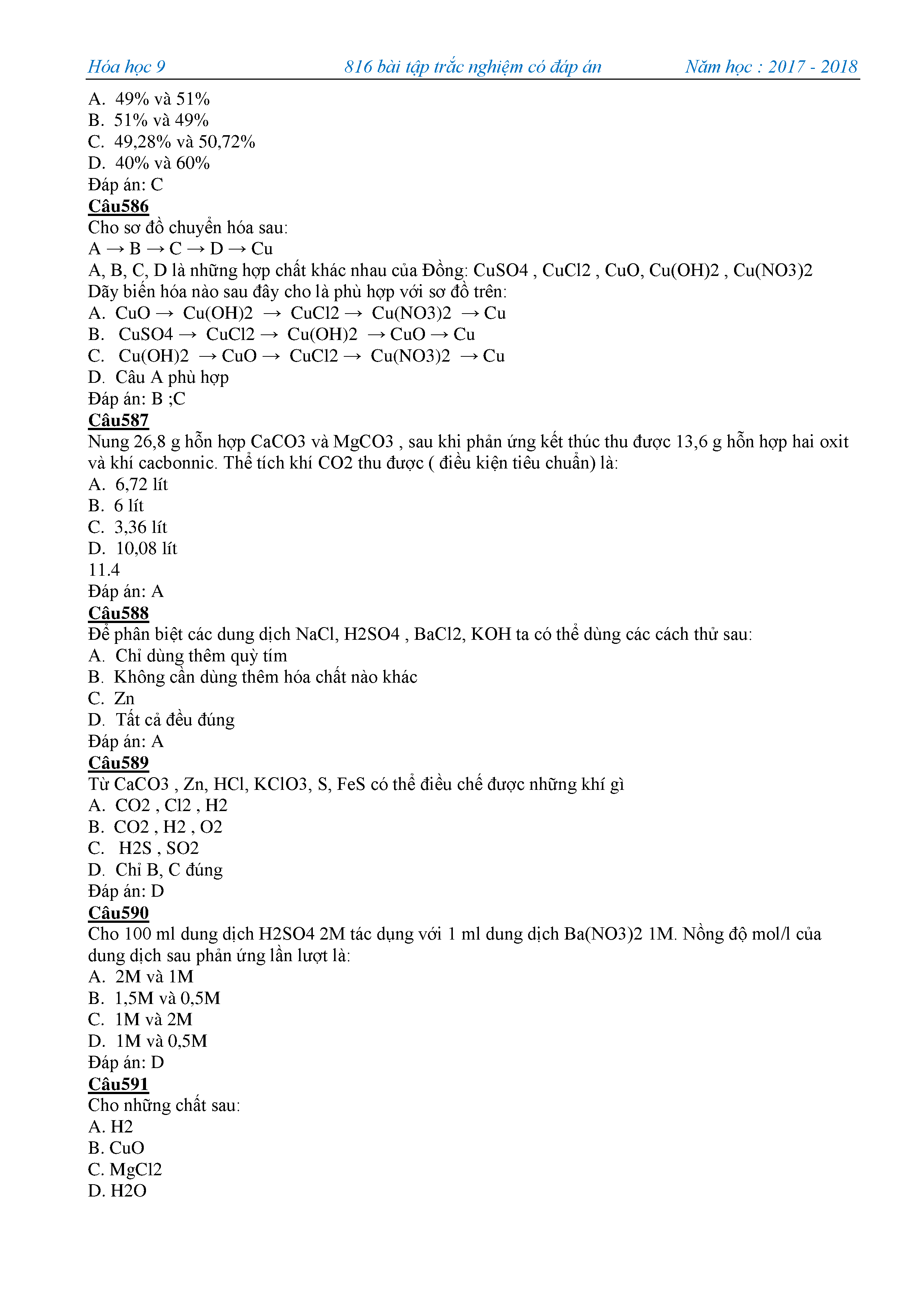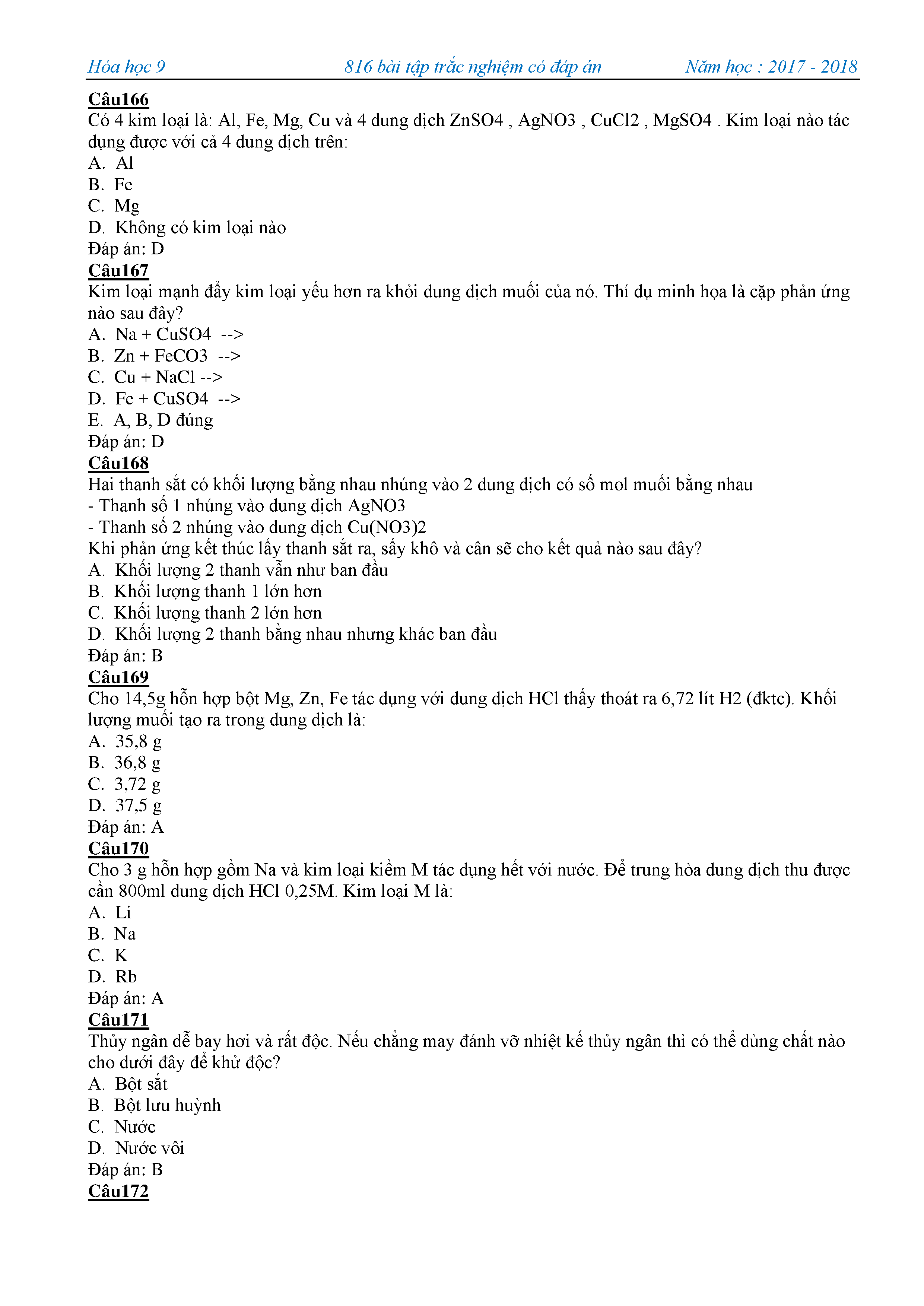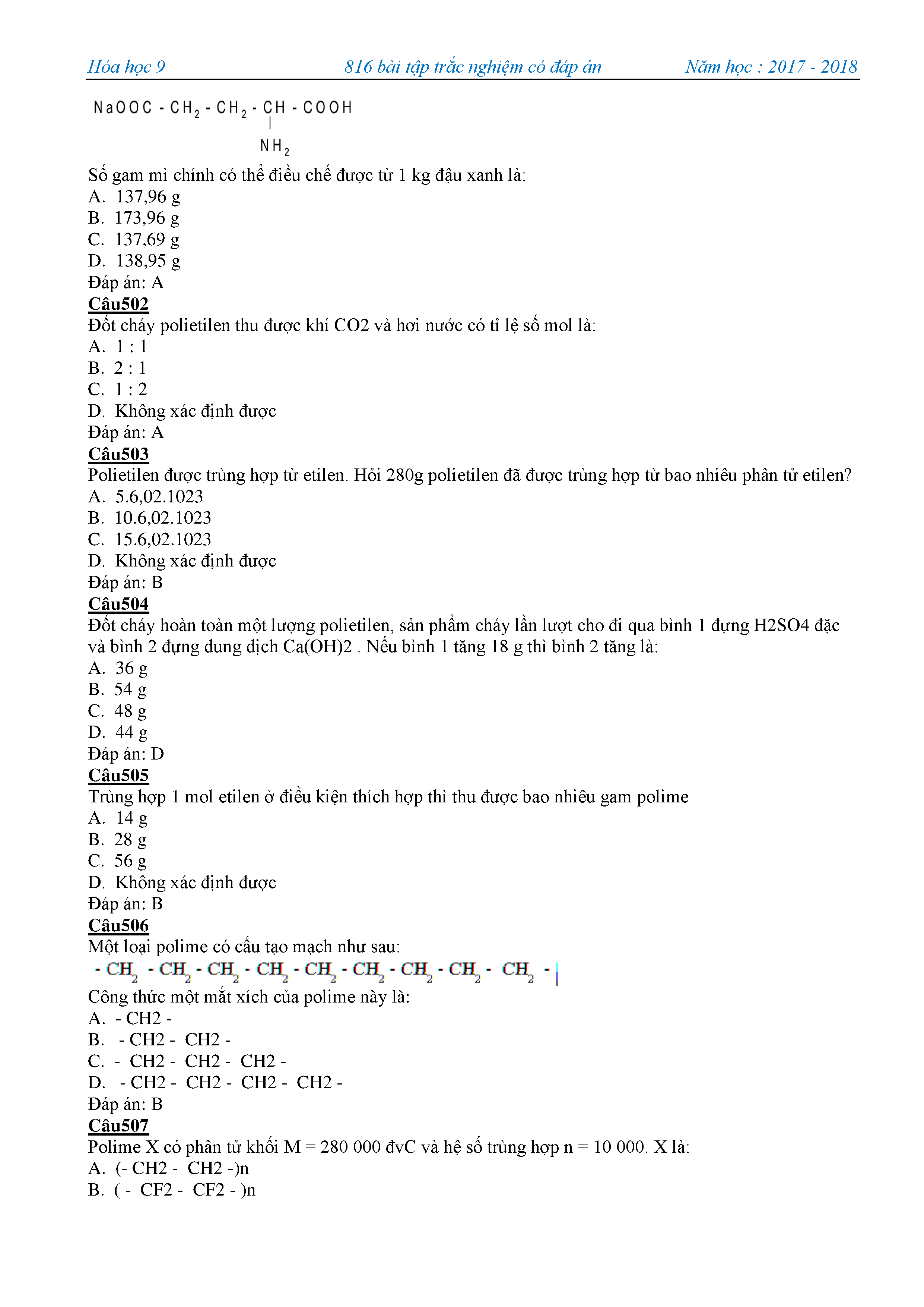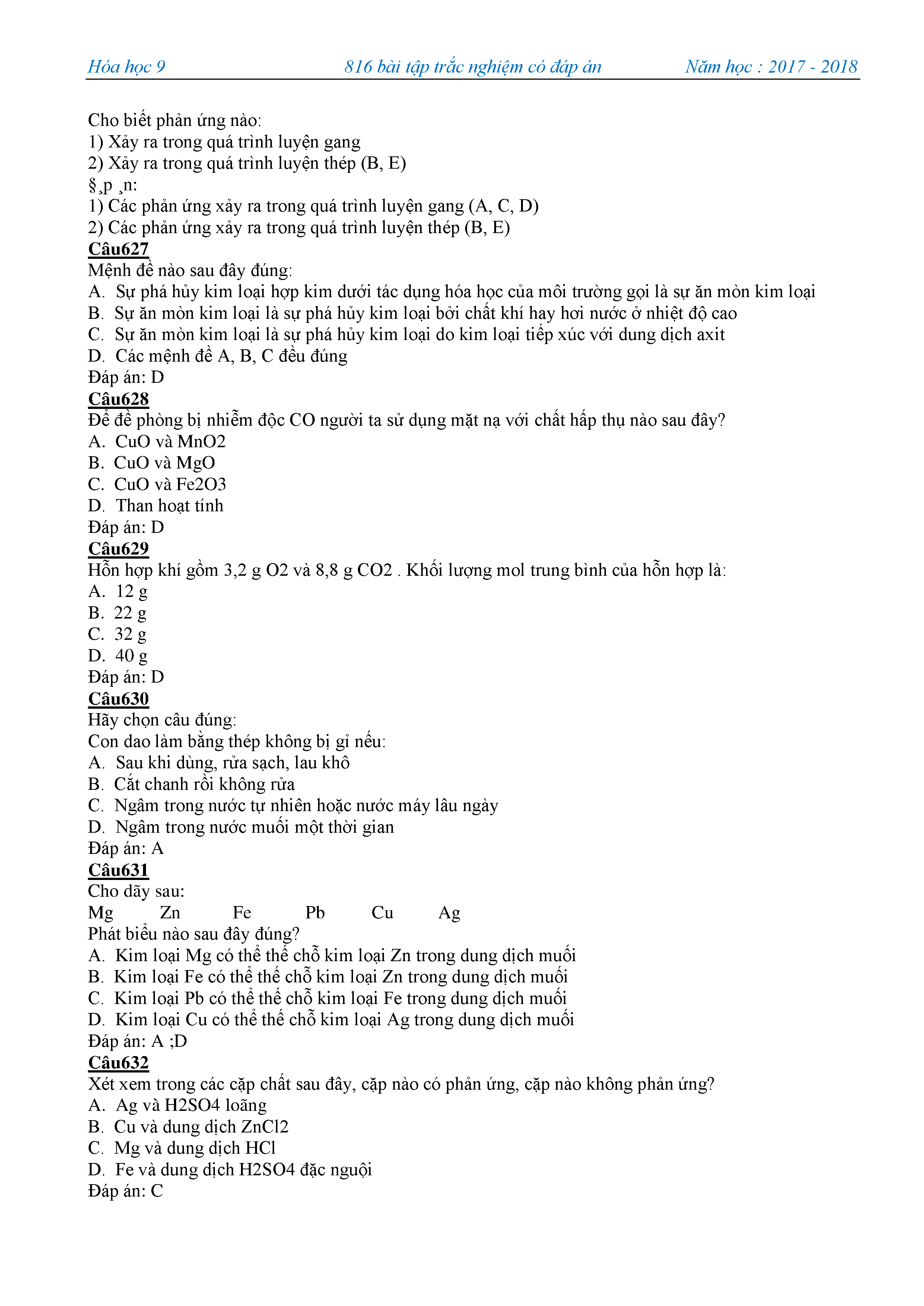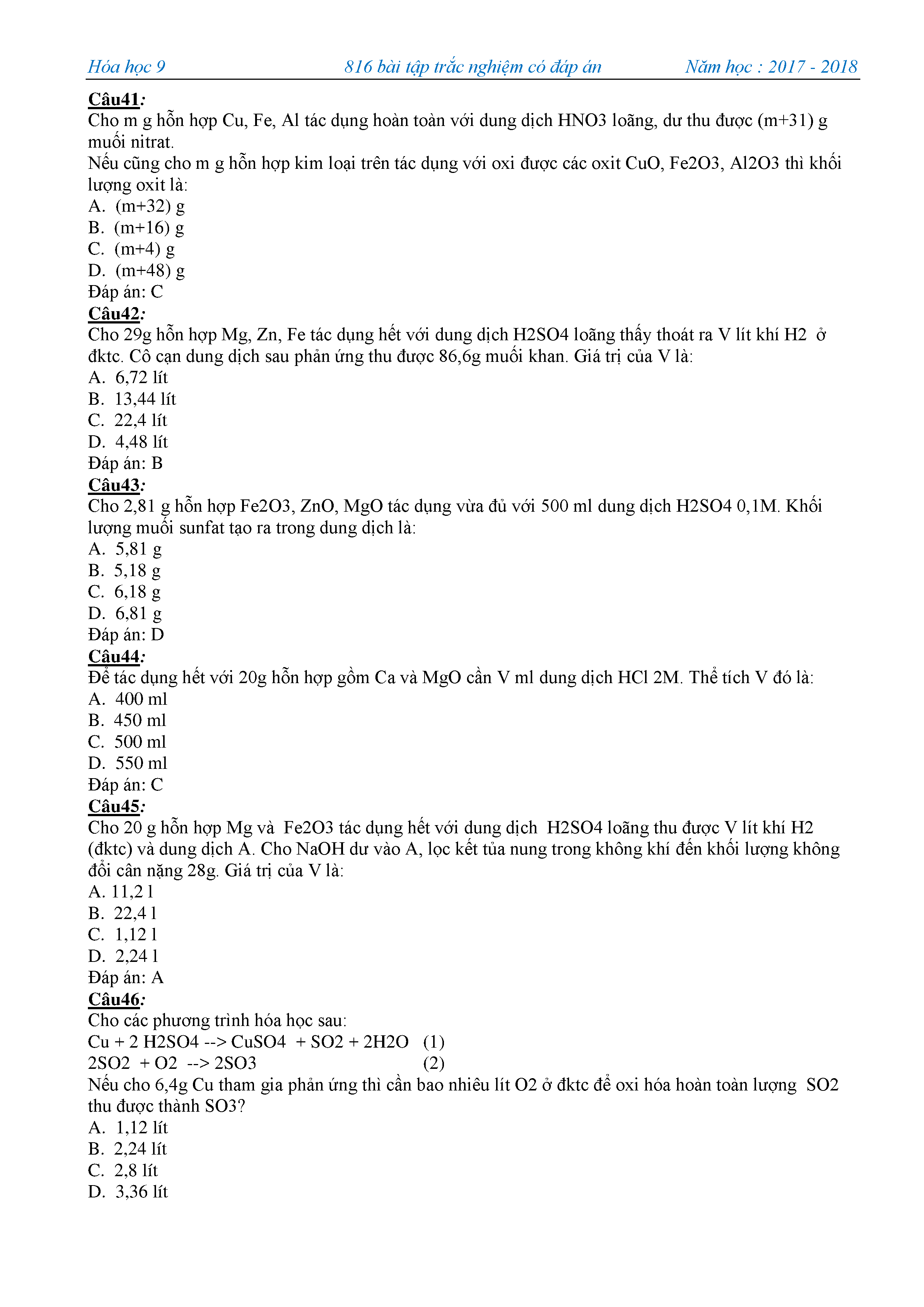 816 CÂU TRẮC NGHIỆM HÓA HỌC 9 (CÓ ĐÁP ÁN)