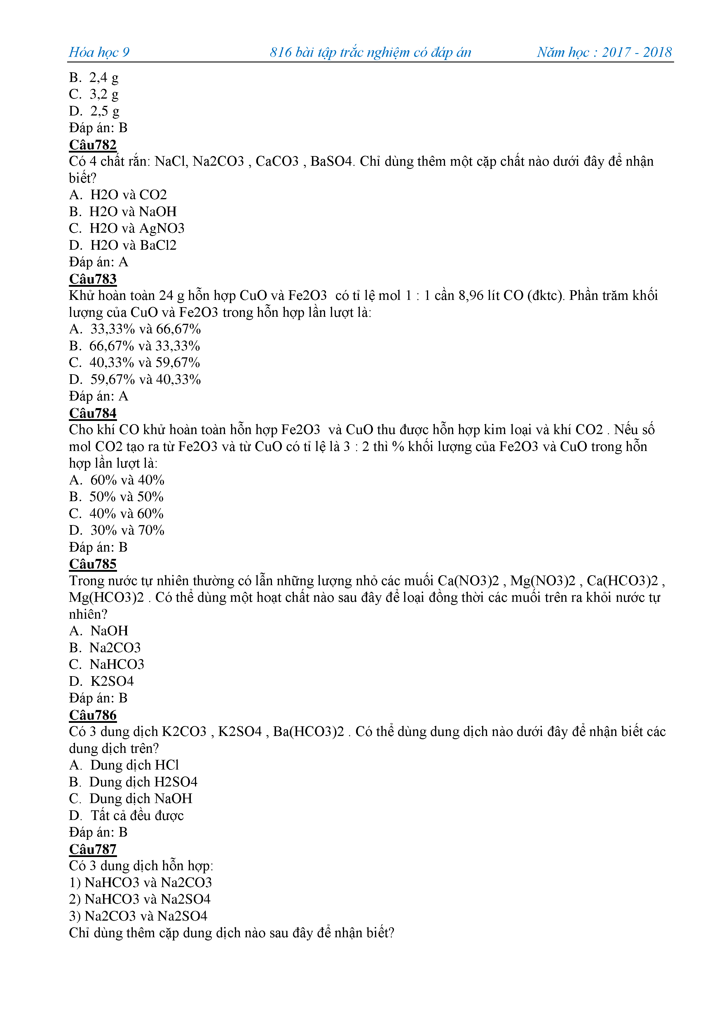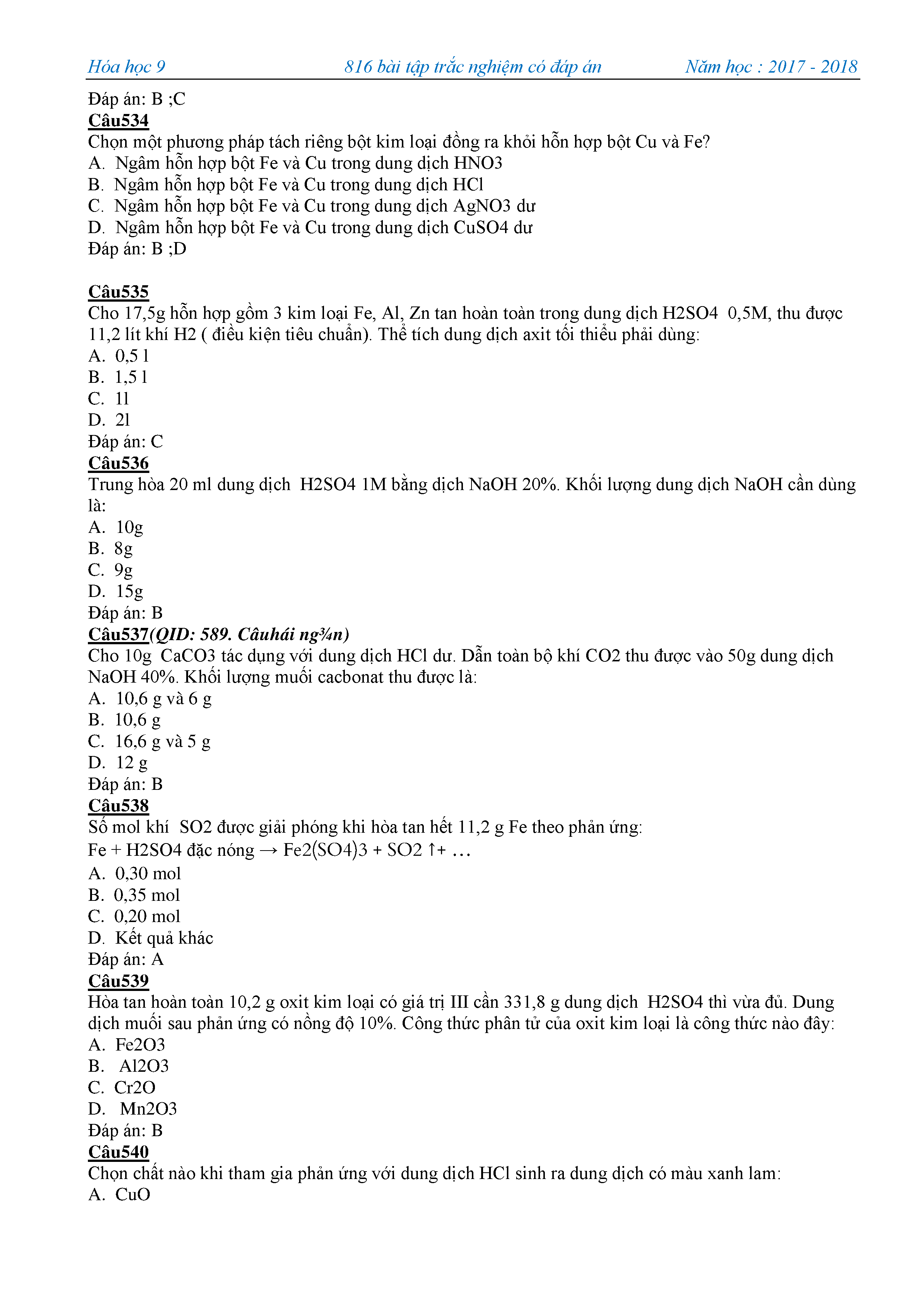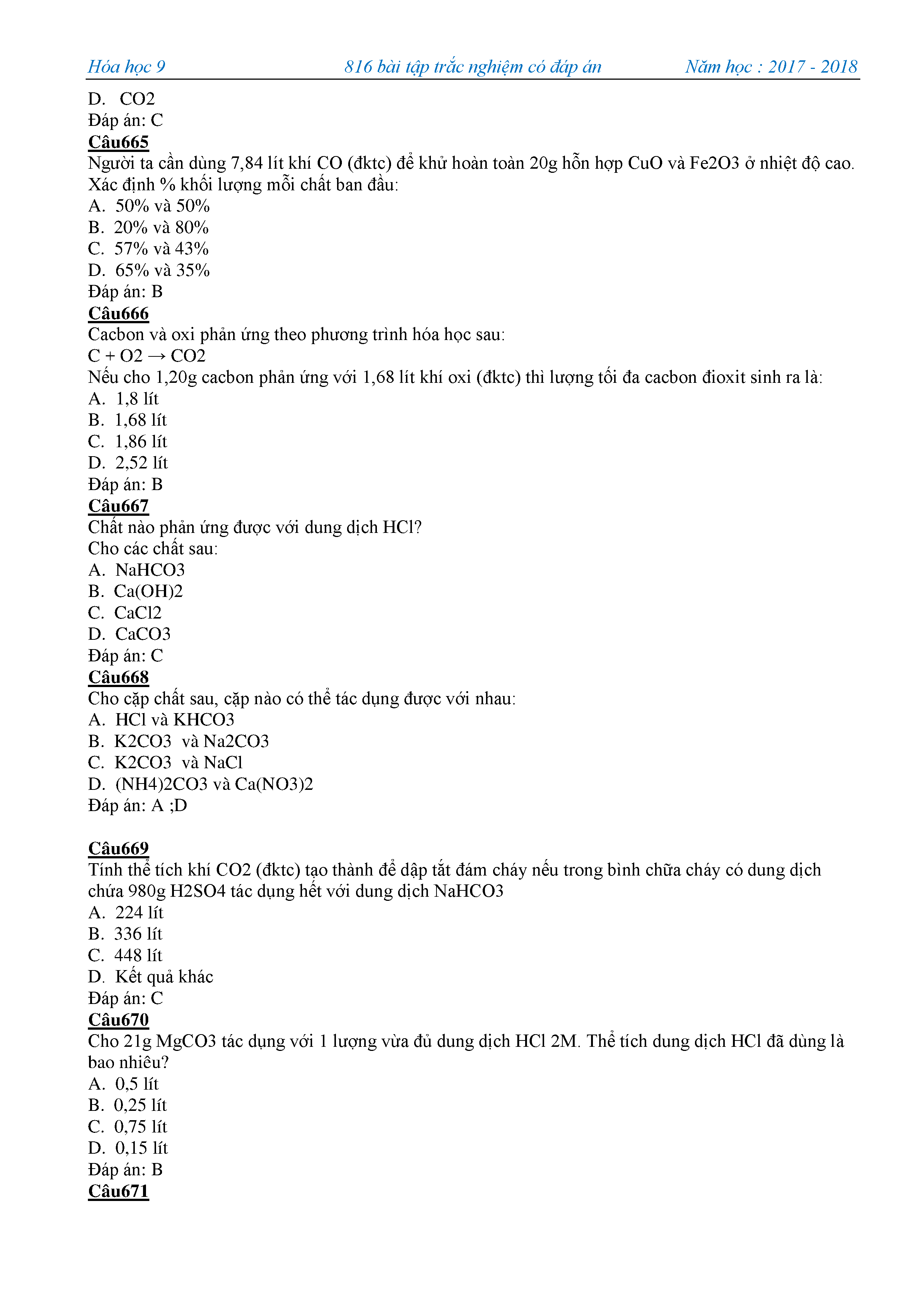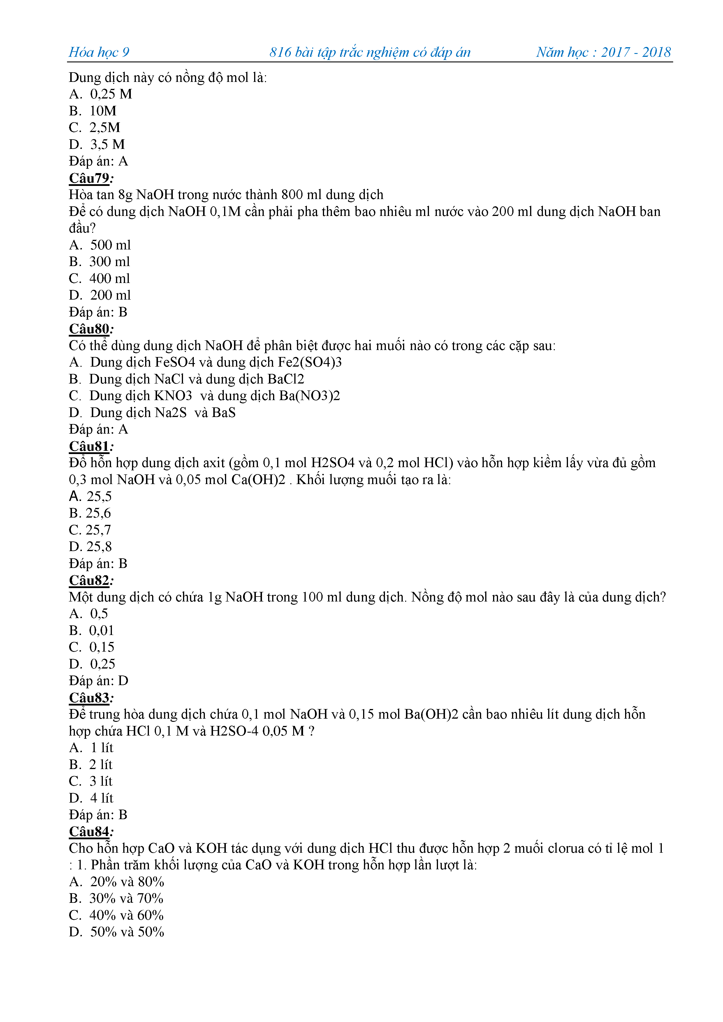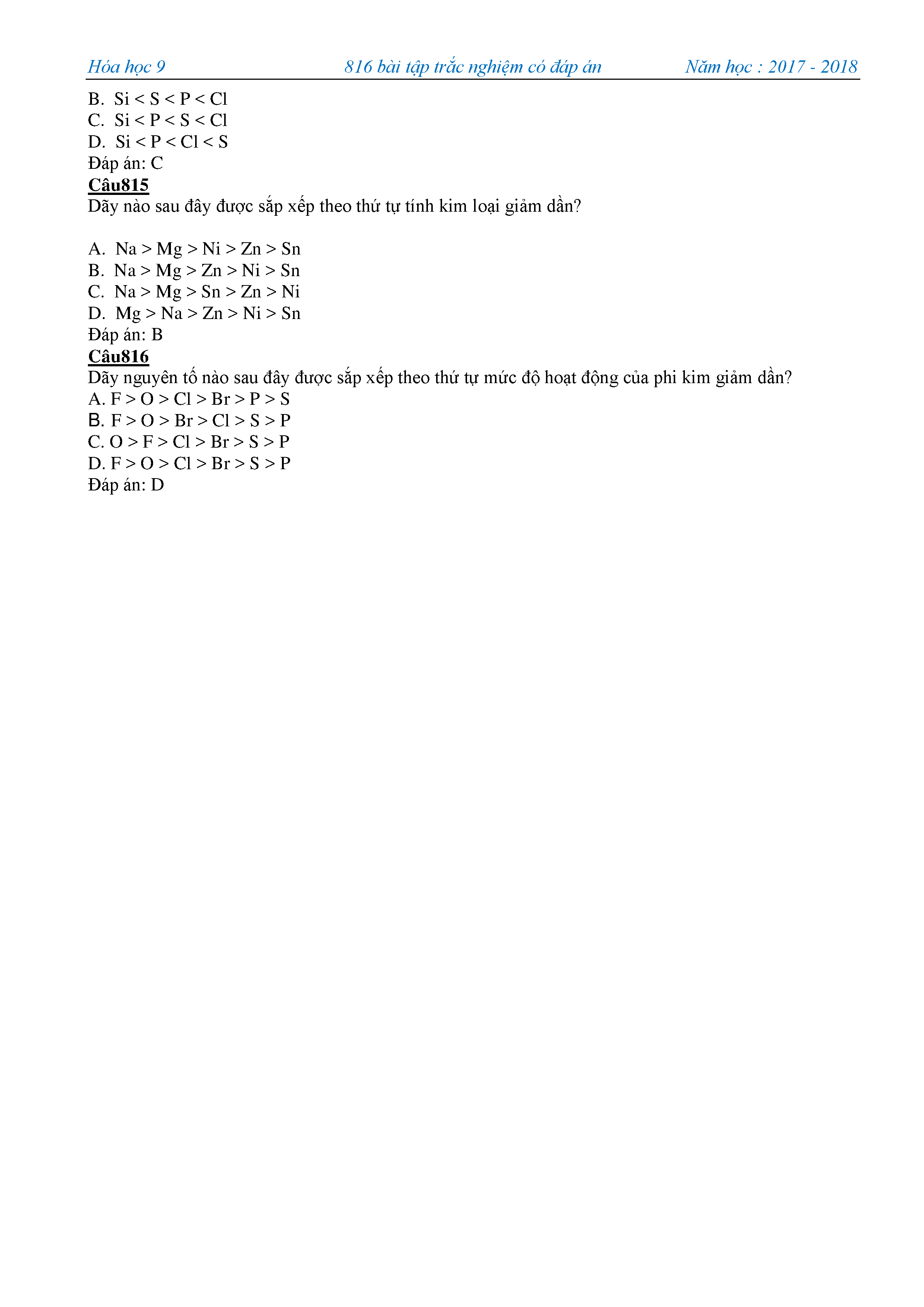 816 CÂU TRẮC NGHIỆM HÓA HỌC 9 (CÓ ĐÁP ÁN)