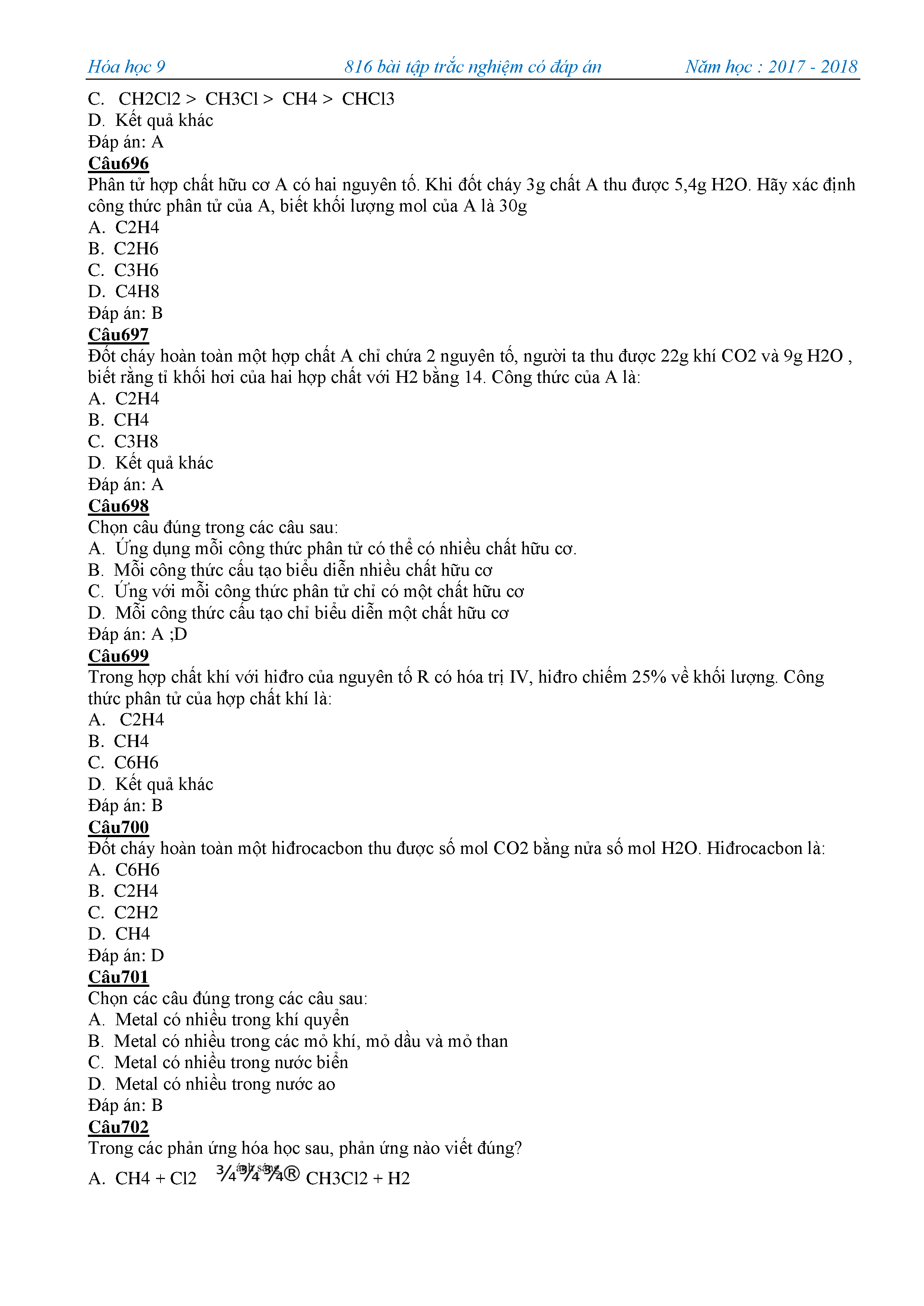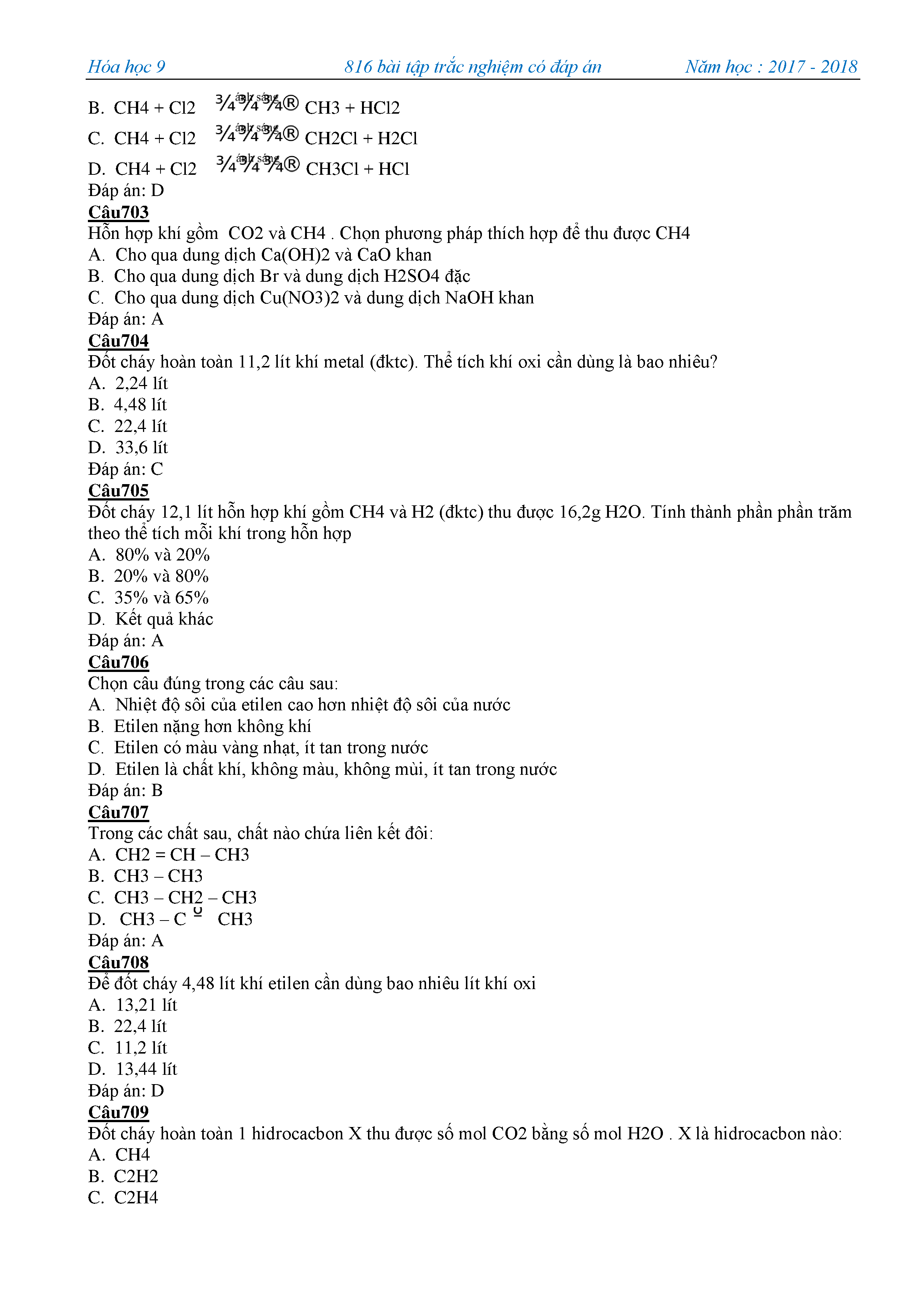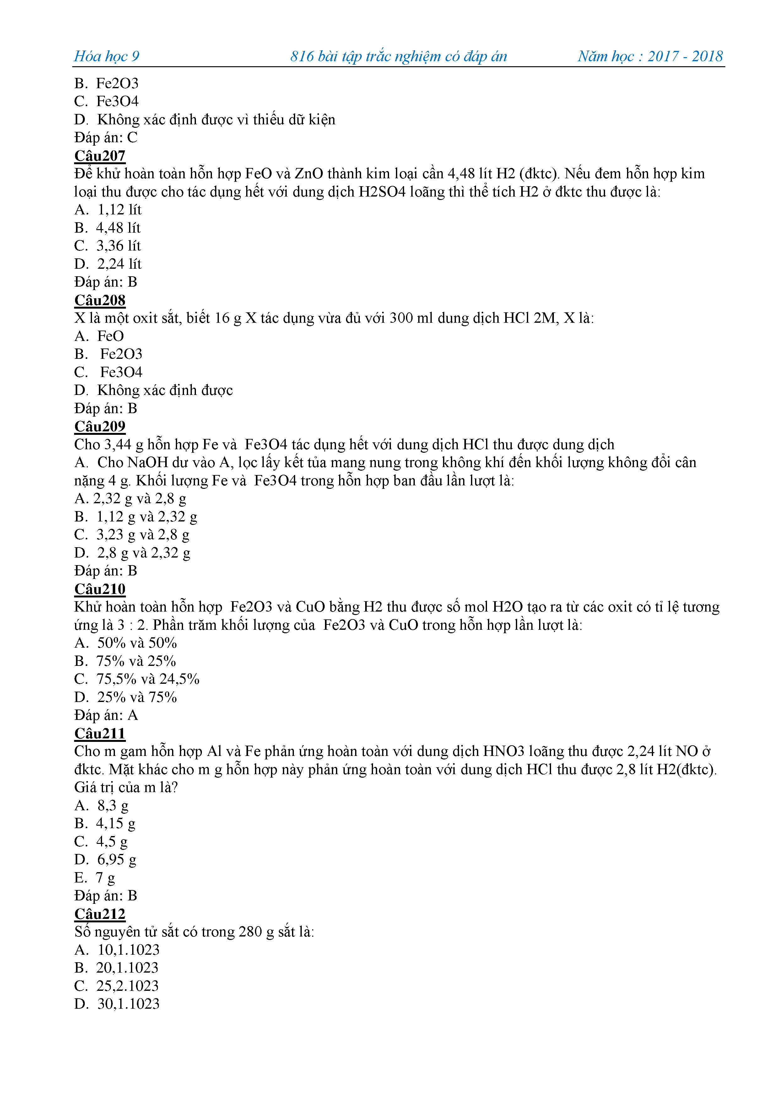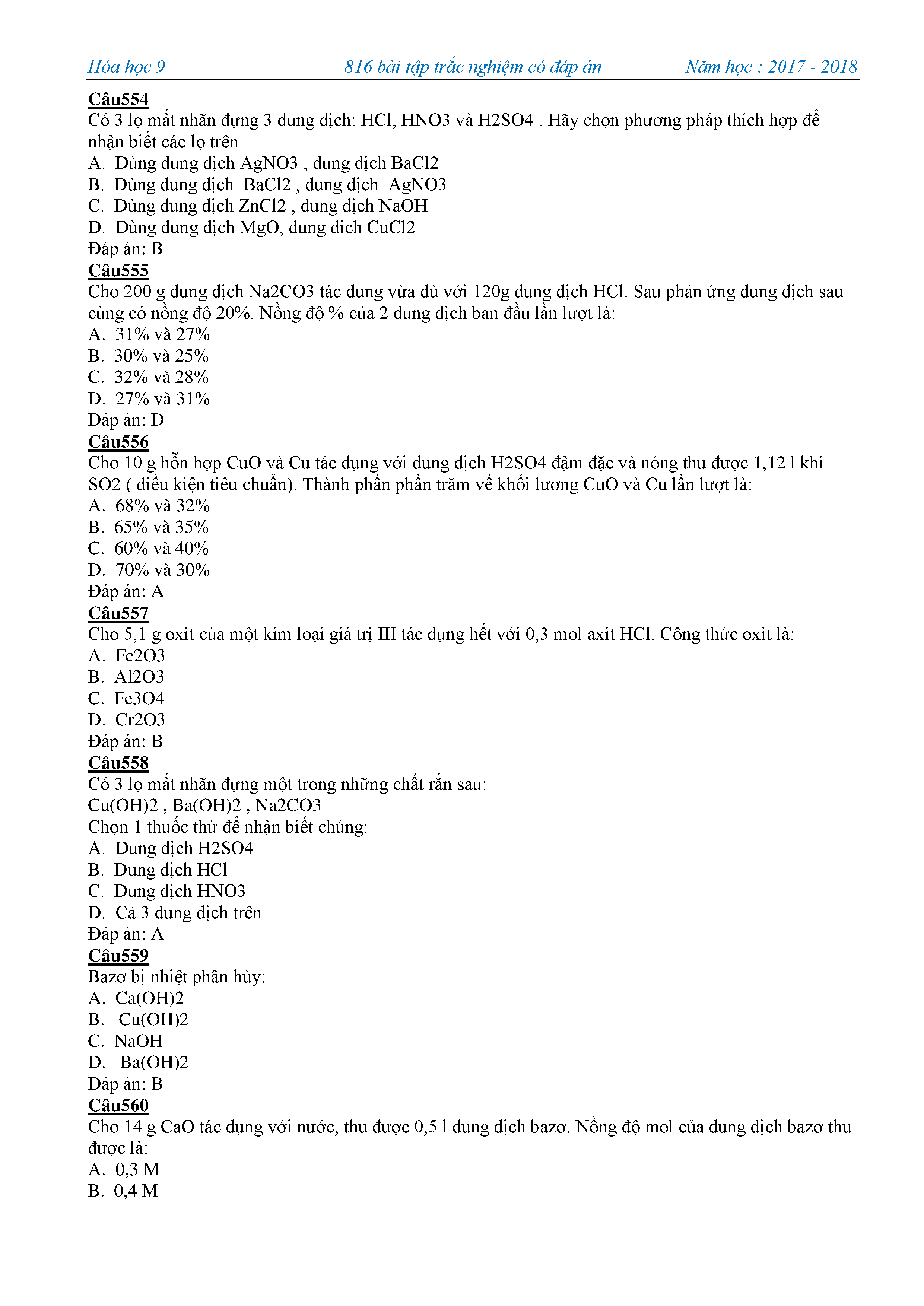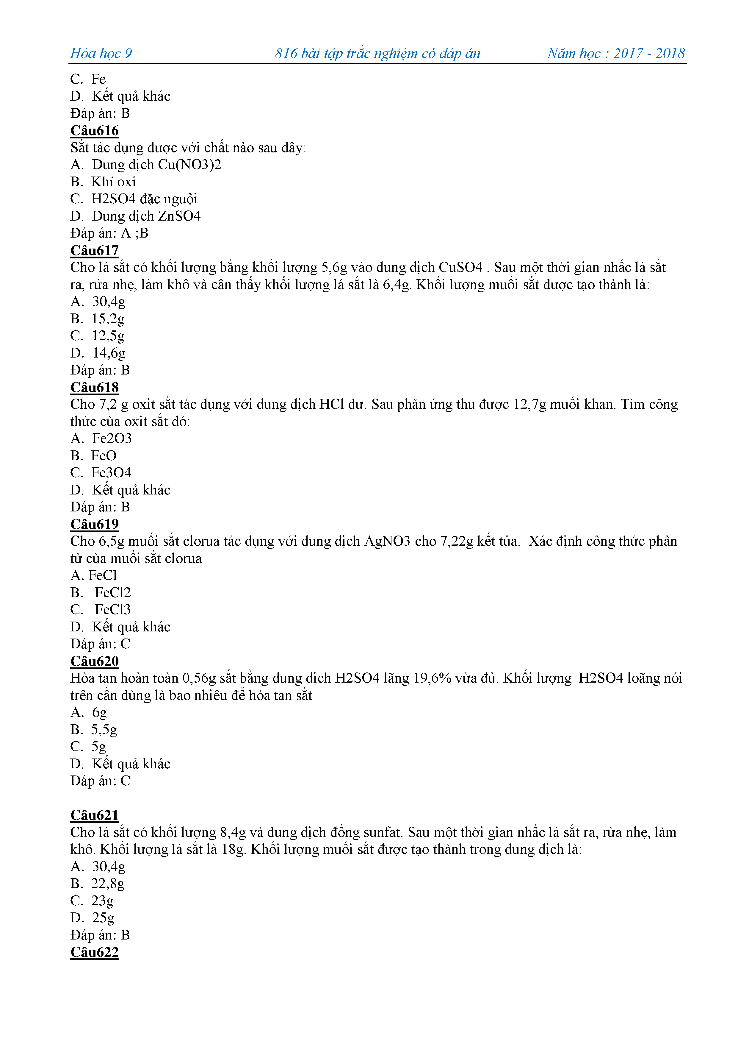 816 CÂU TRẮC NGHIỆM HÓA HỌC 9 (CÓ ĐÁP ÁN)
