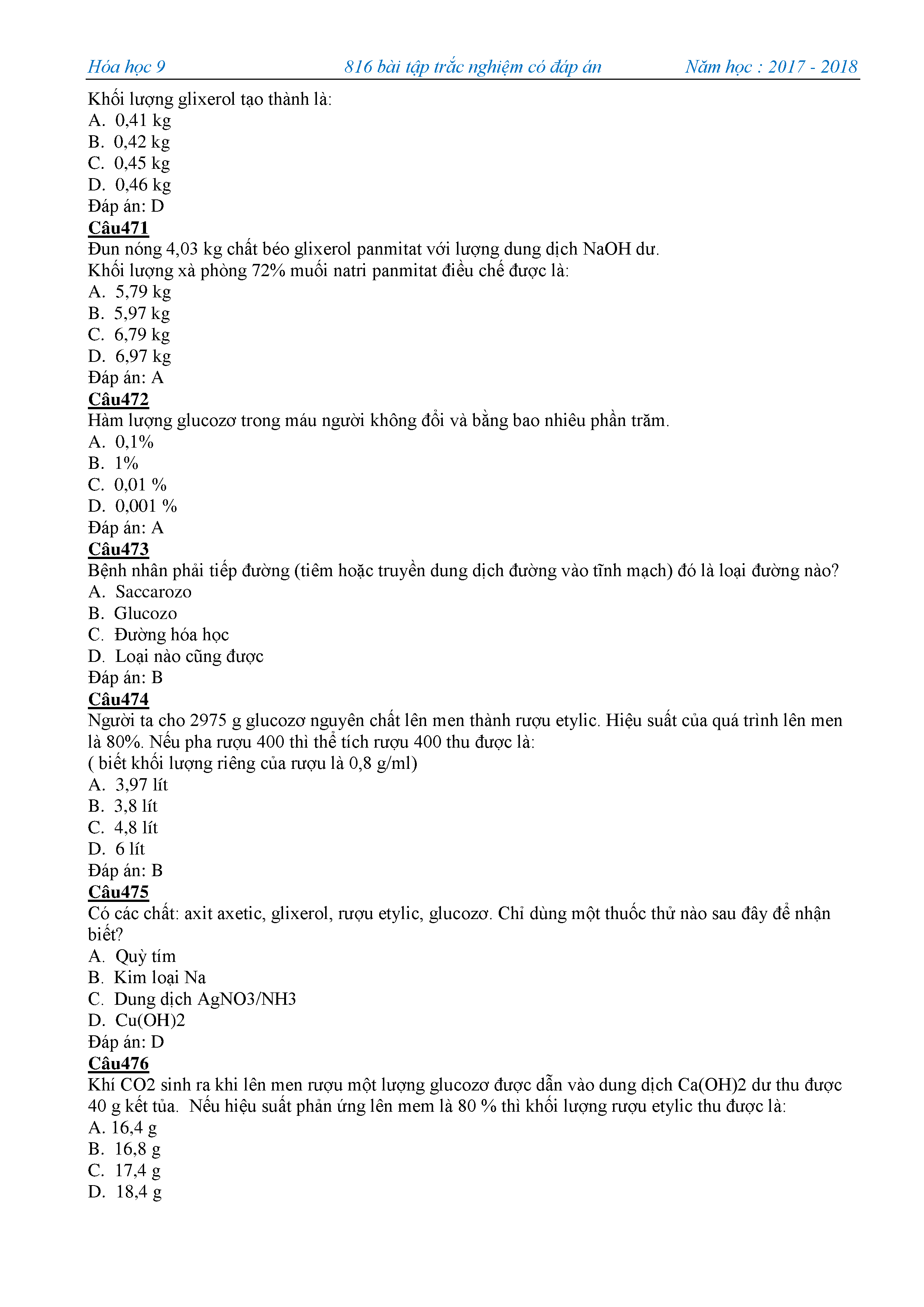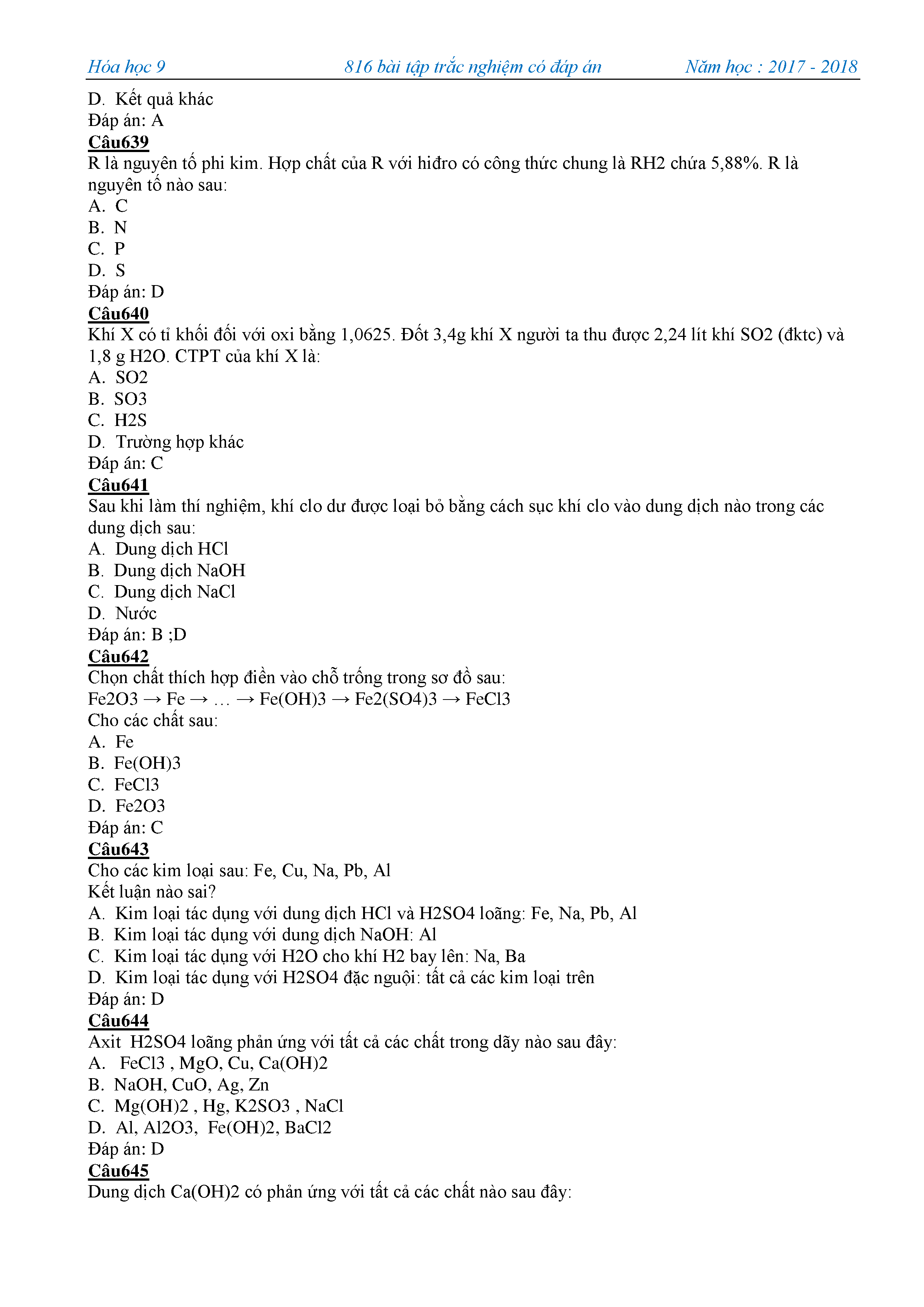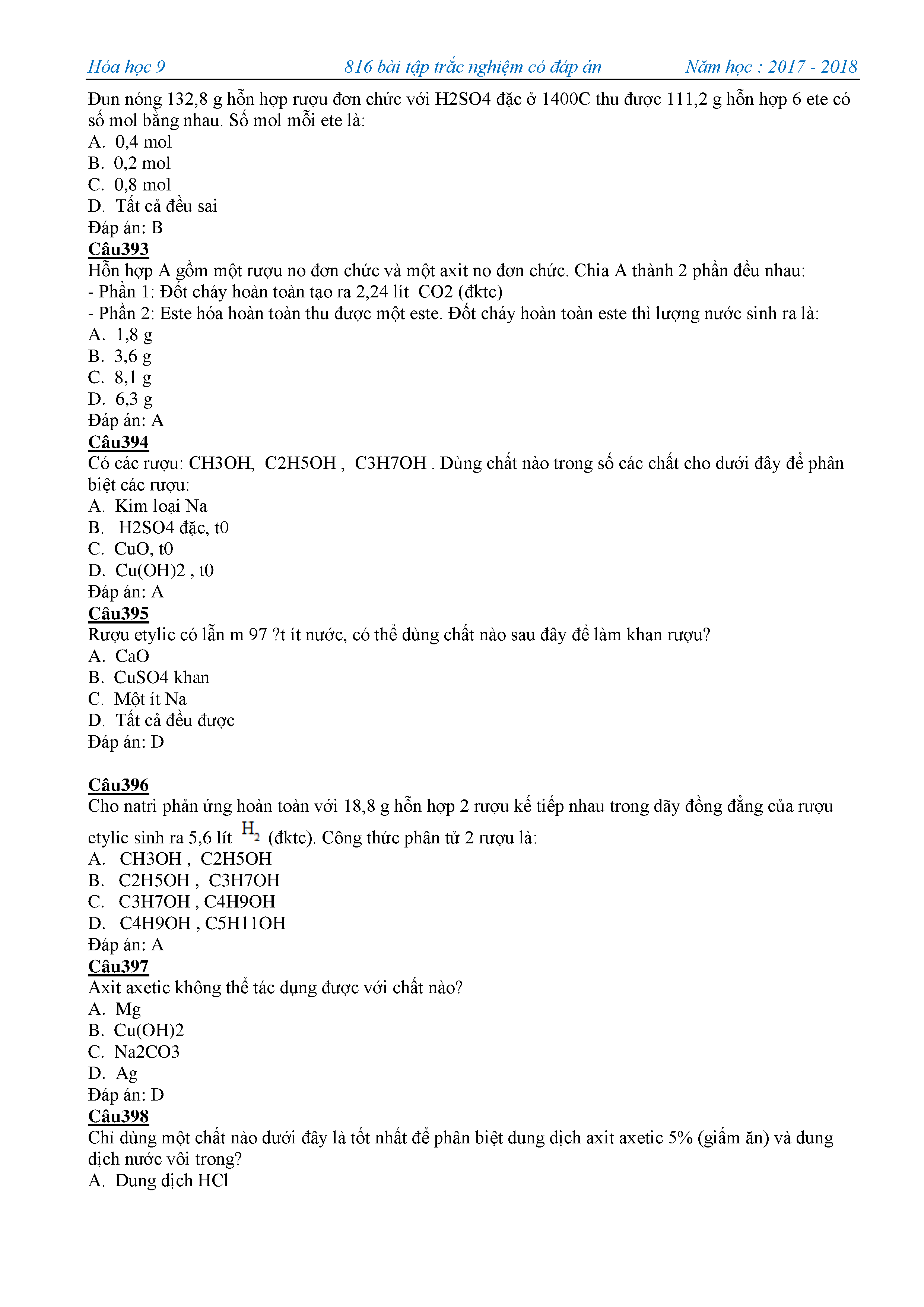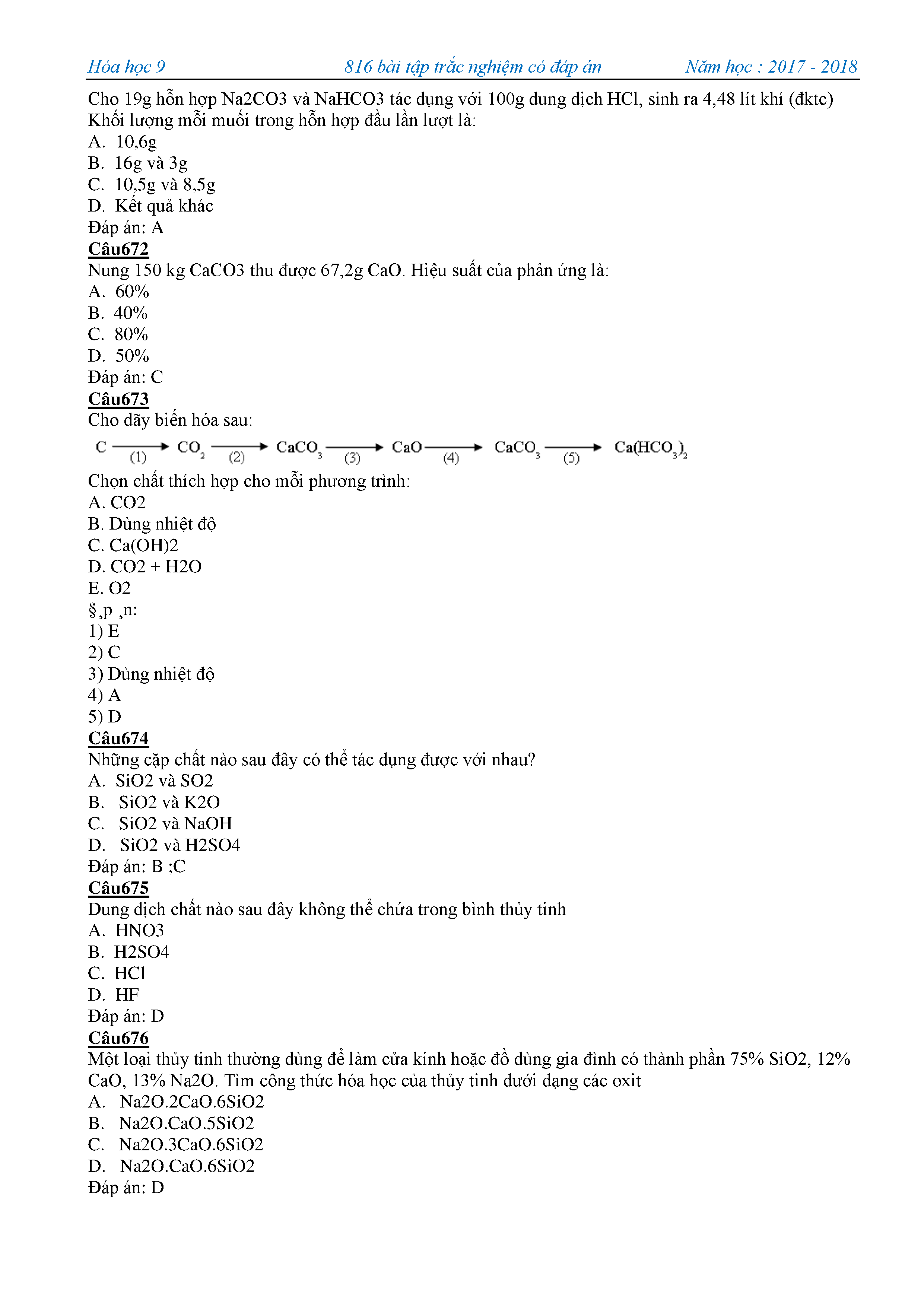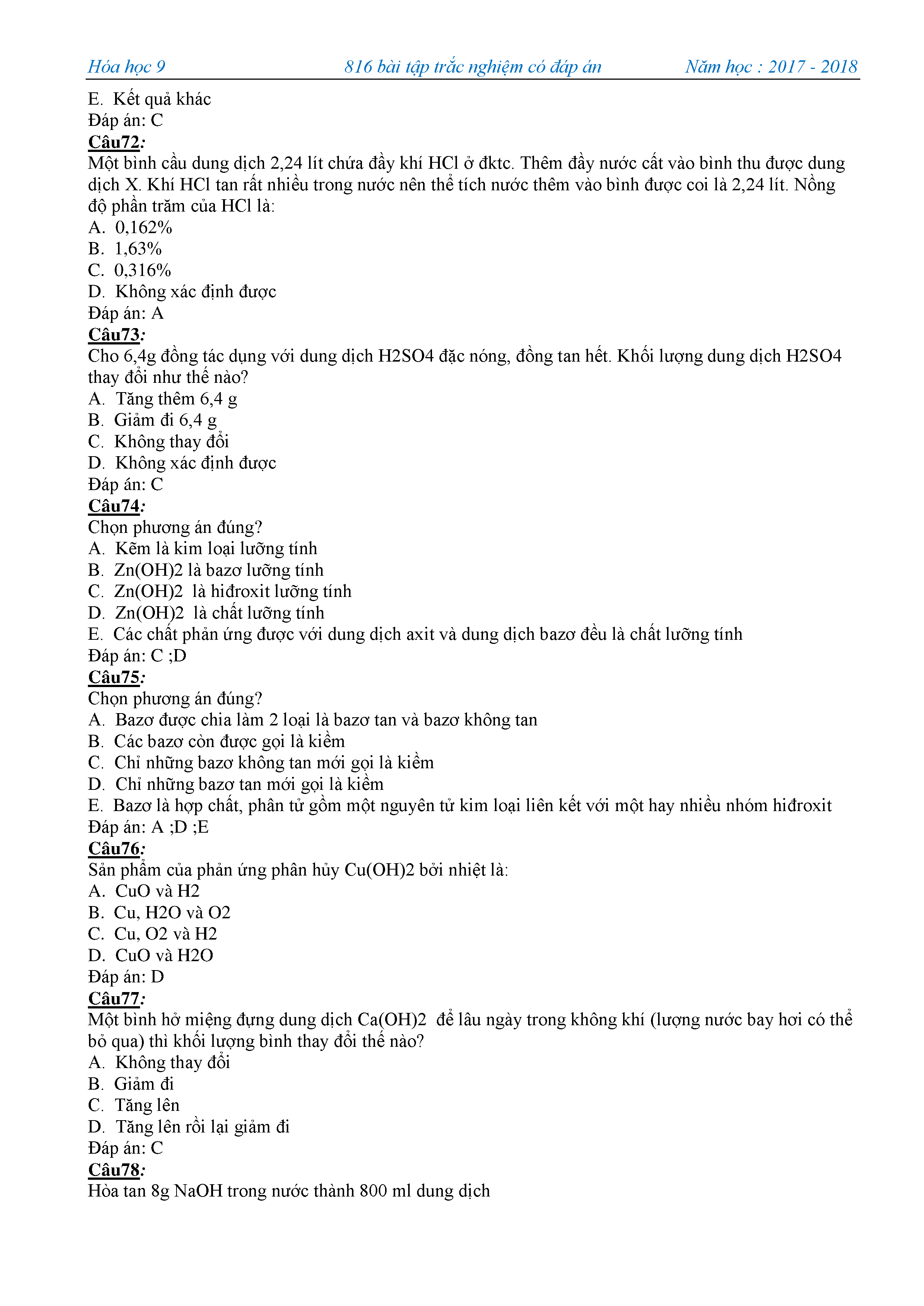 816 CÂU TRẮC NGHIỆM HÓA HỌC 9 (CÓ ĐÁP ÁN)