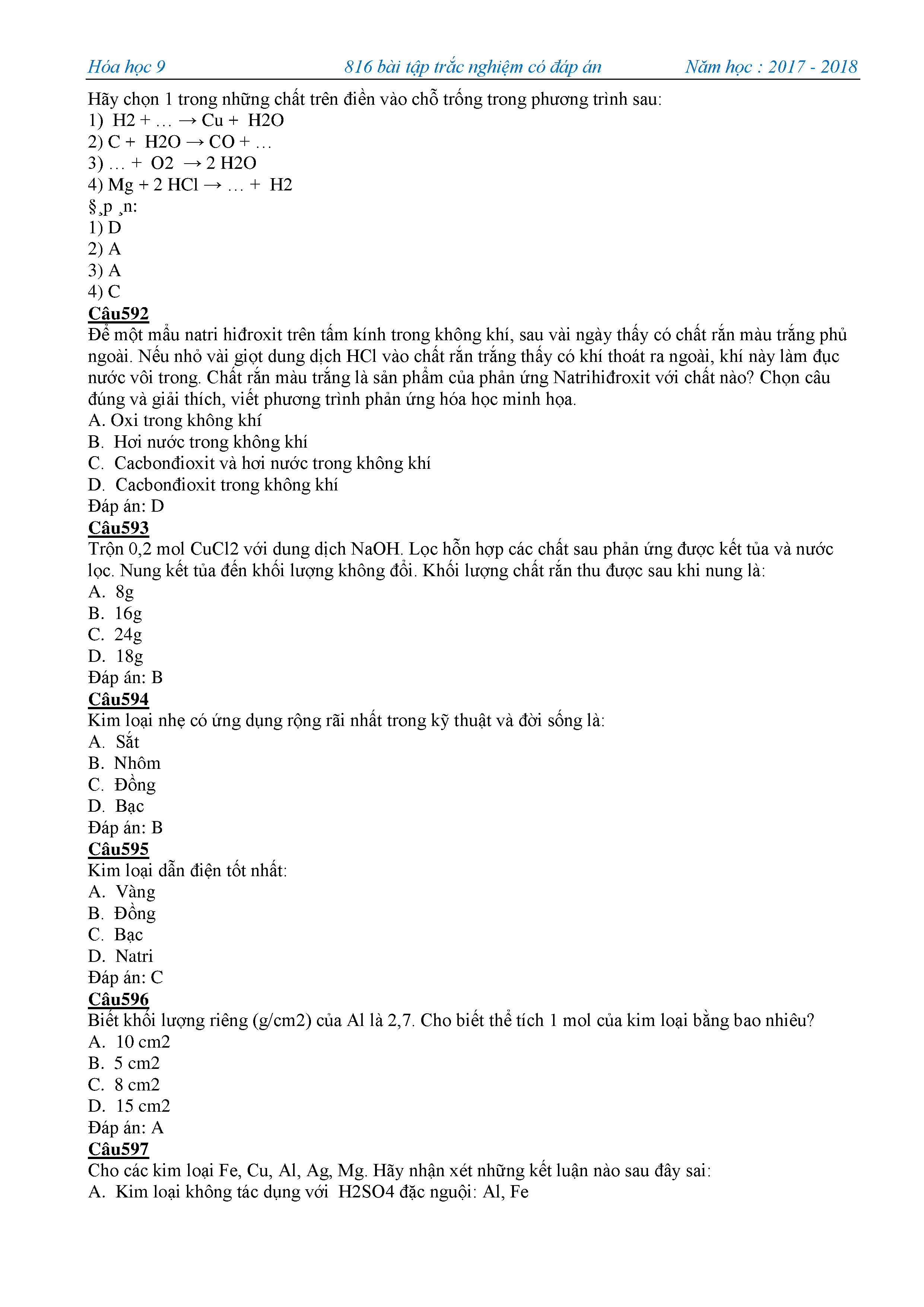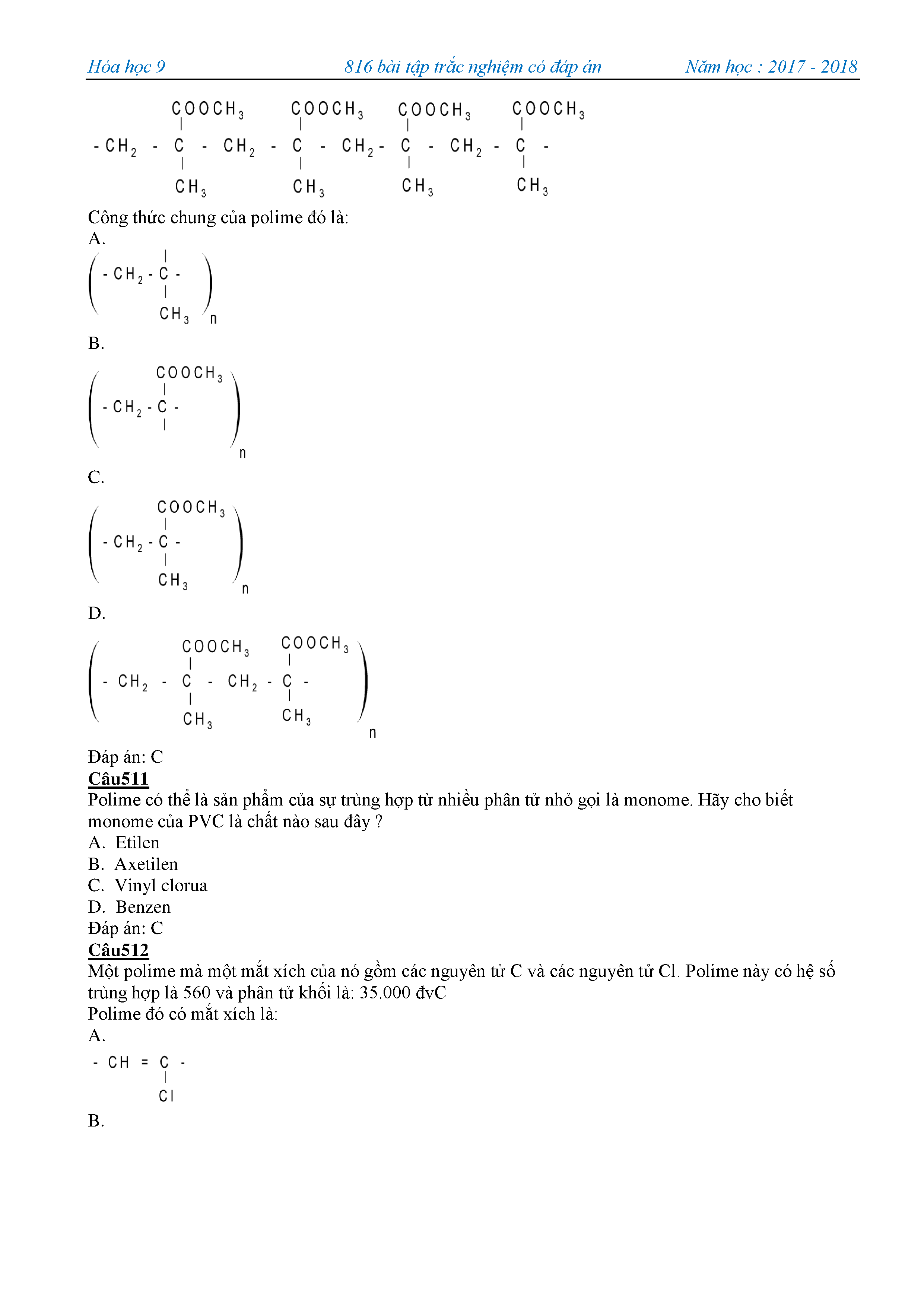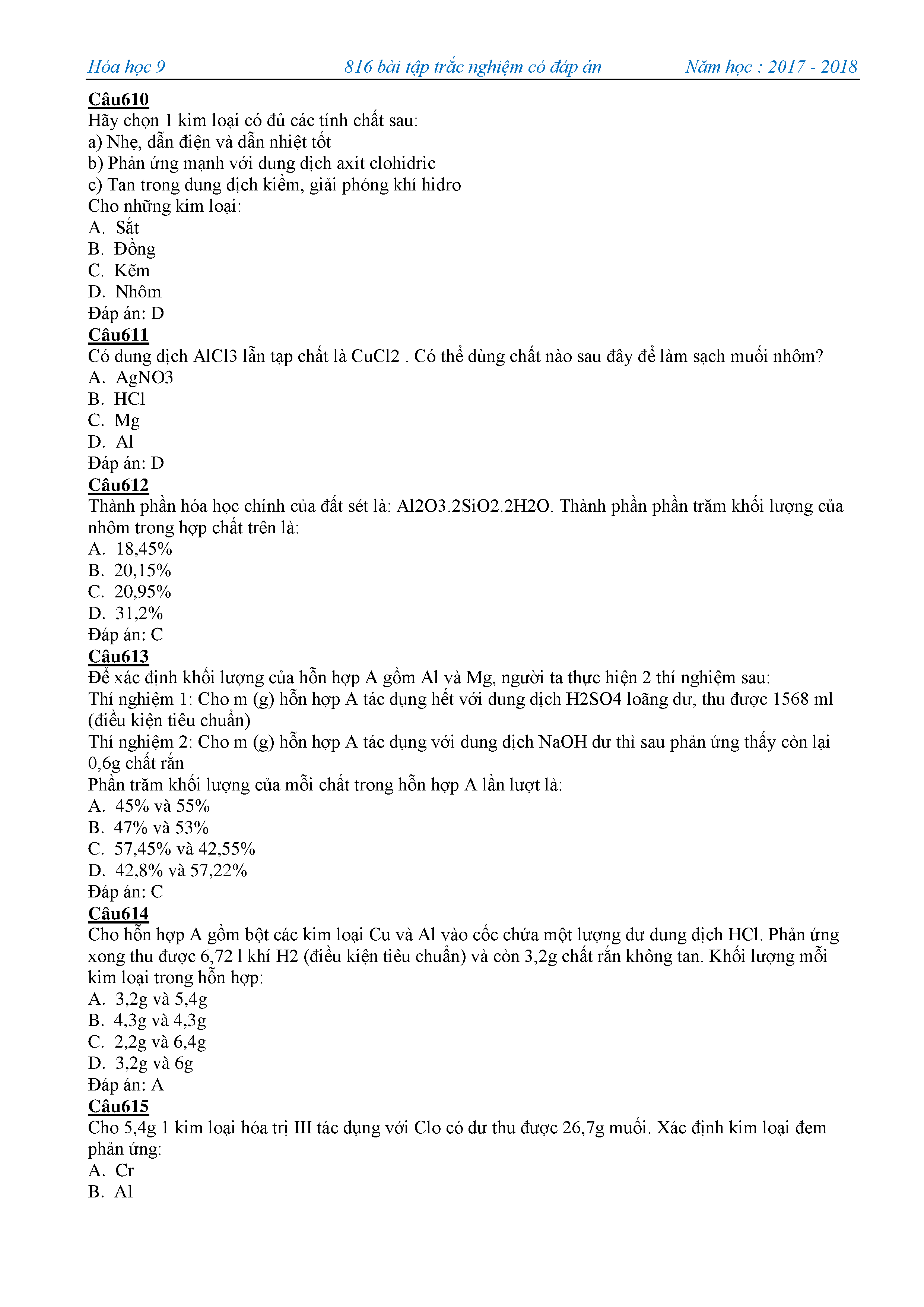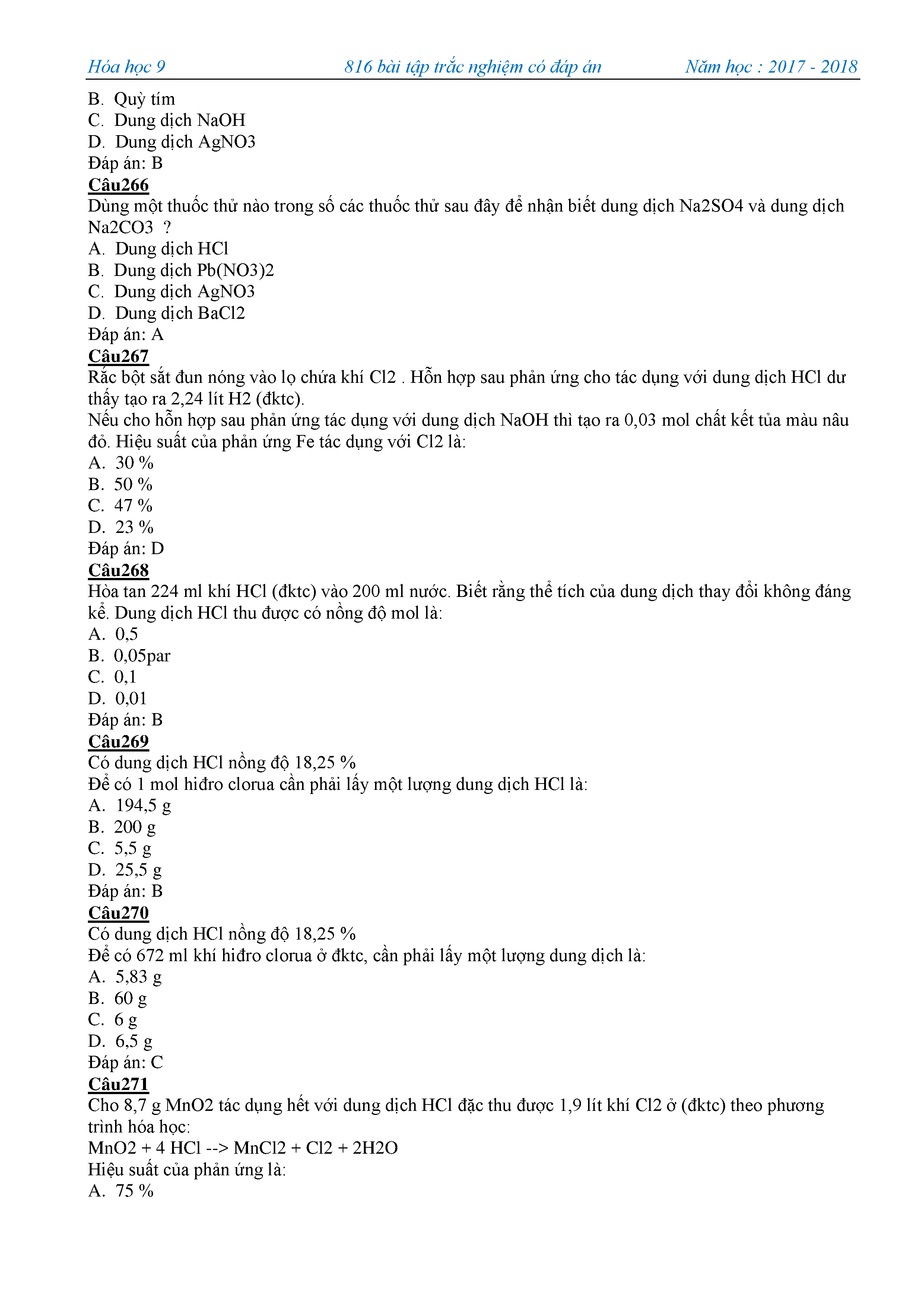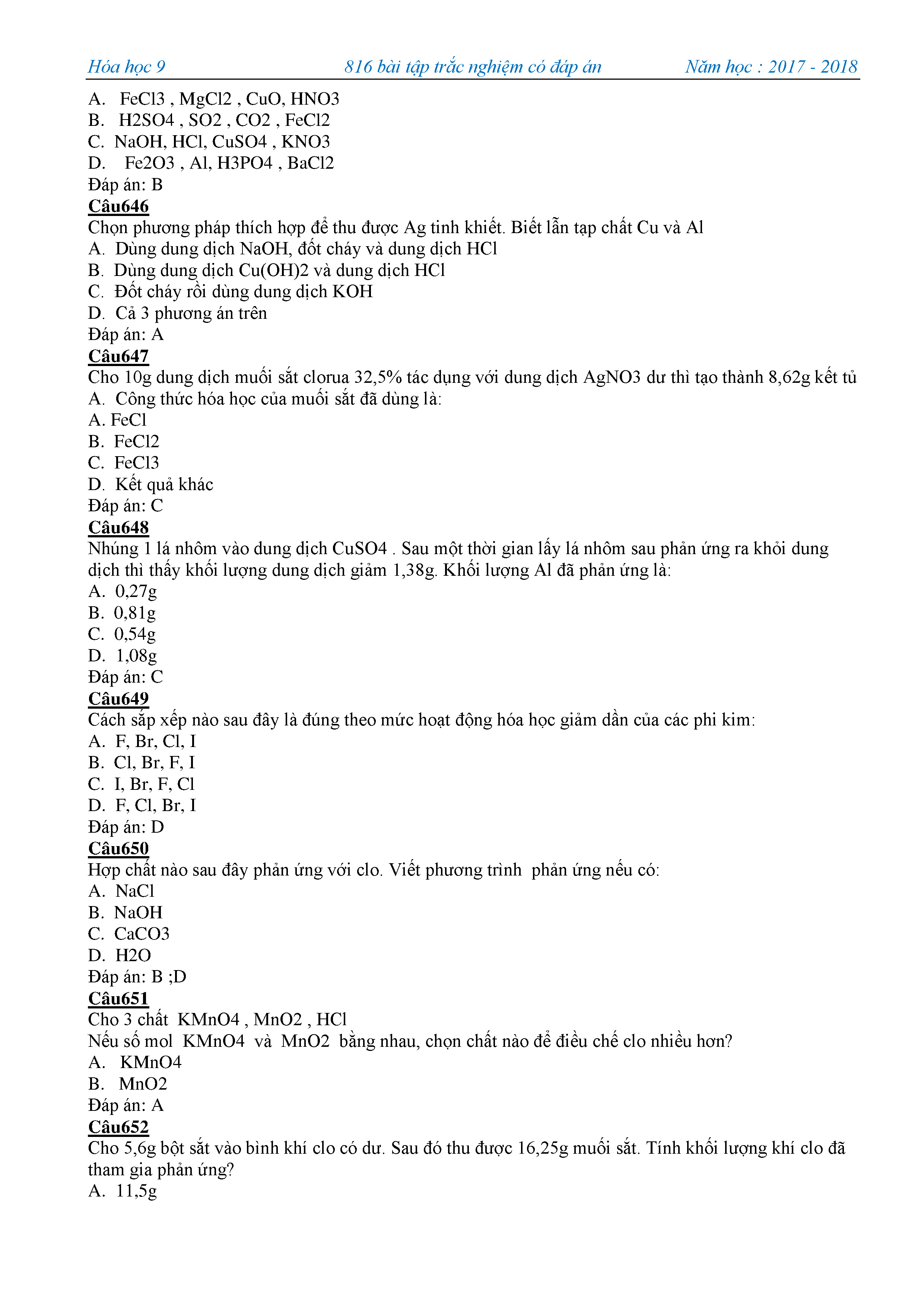 816 CÂU TRẮC NGHIỆM HÓA HỌC 9 (CÓ ĐÁP ÁN)