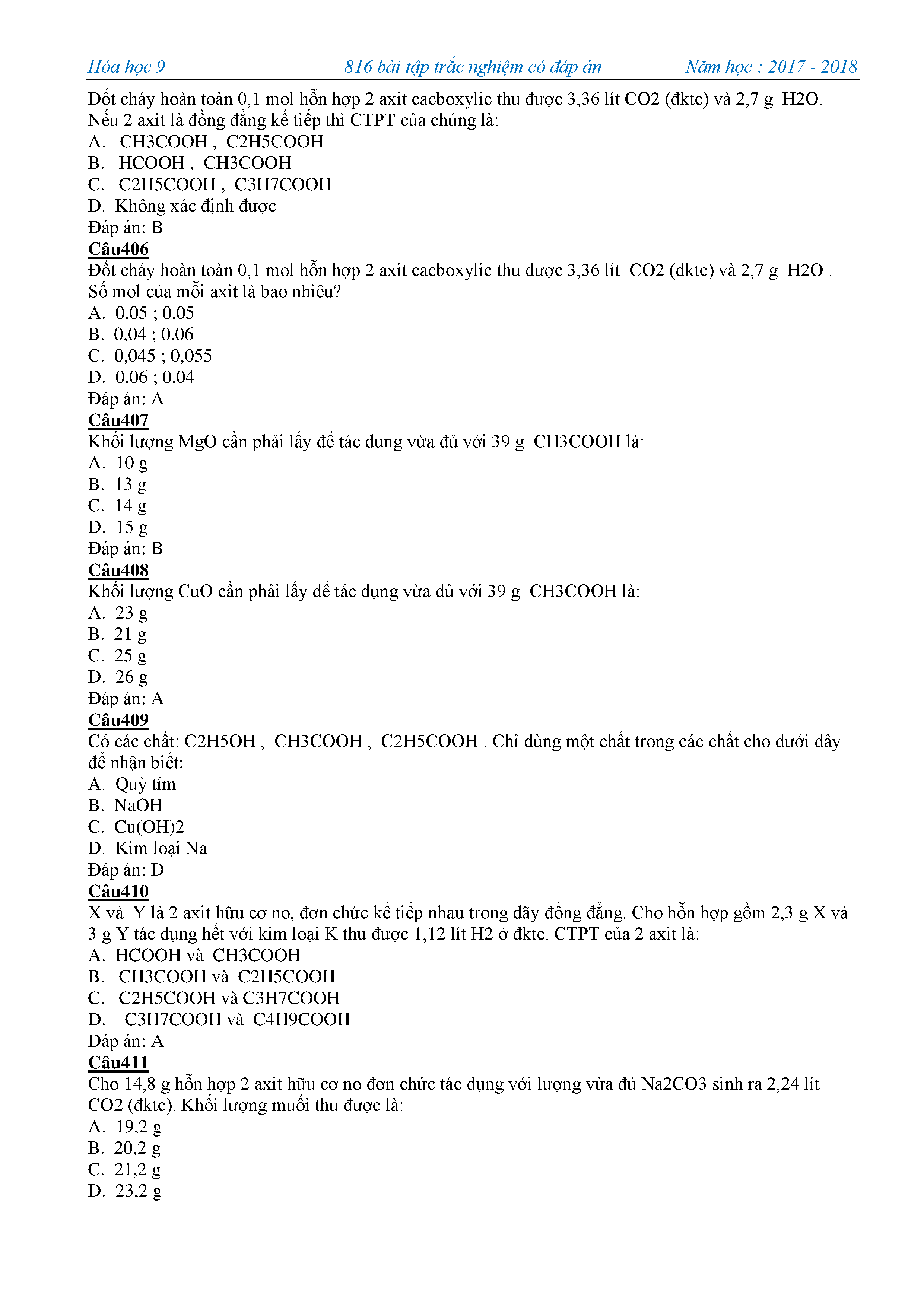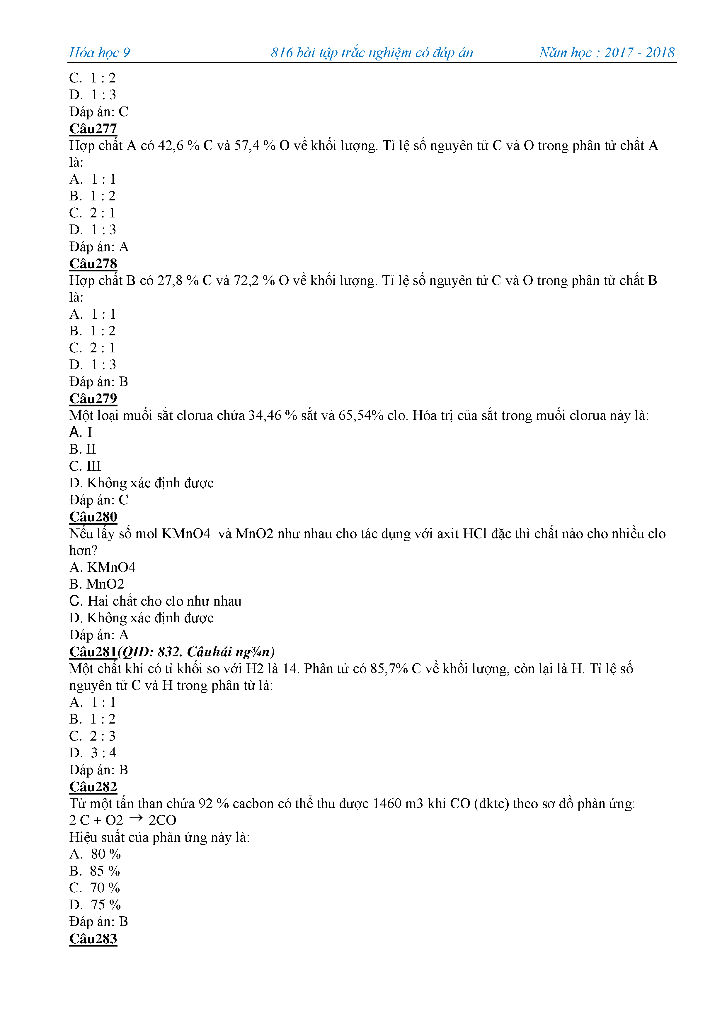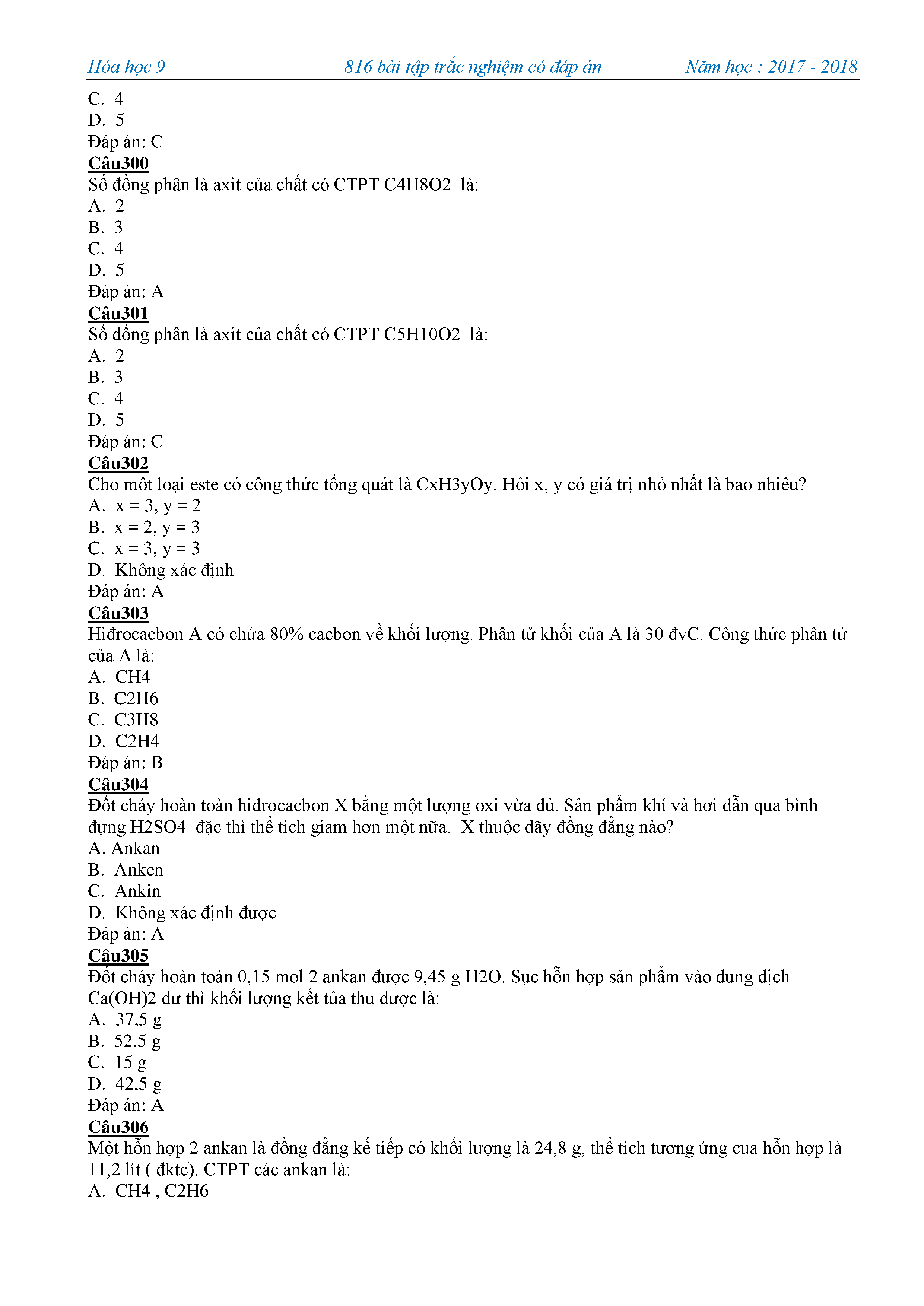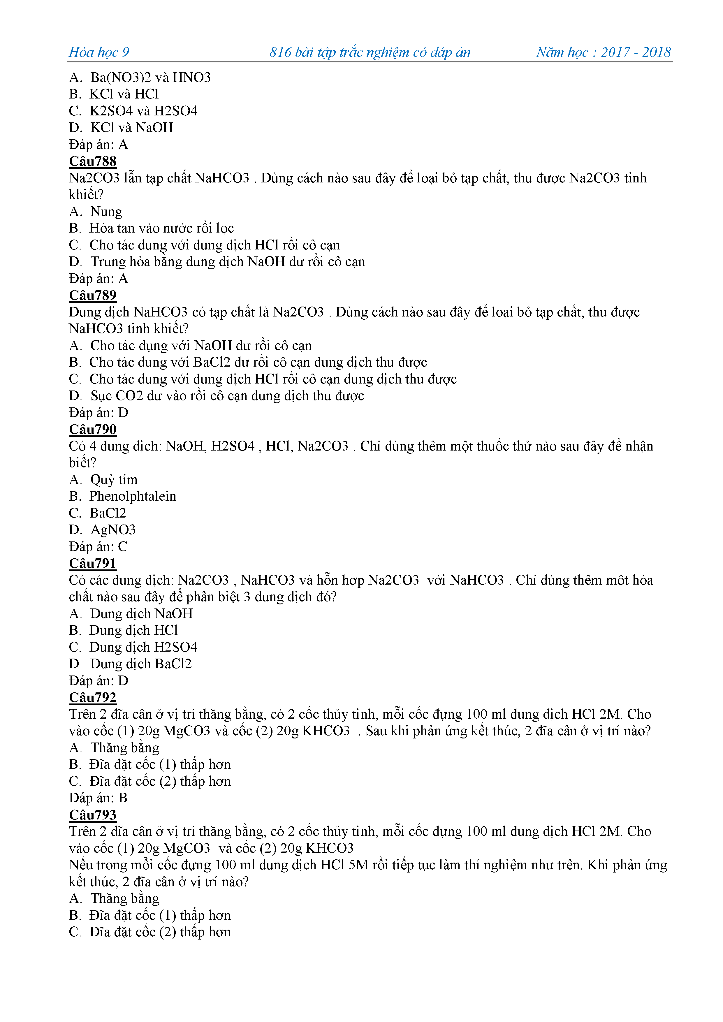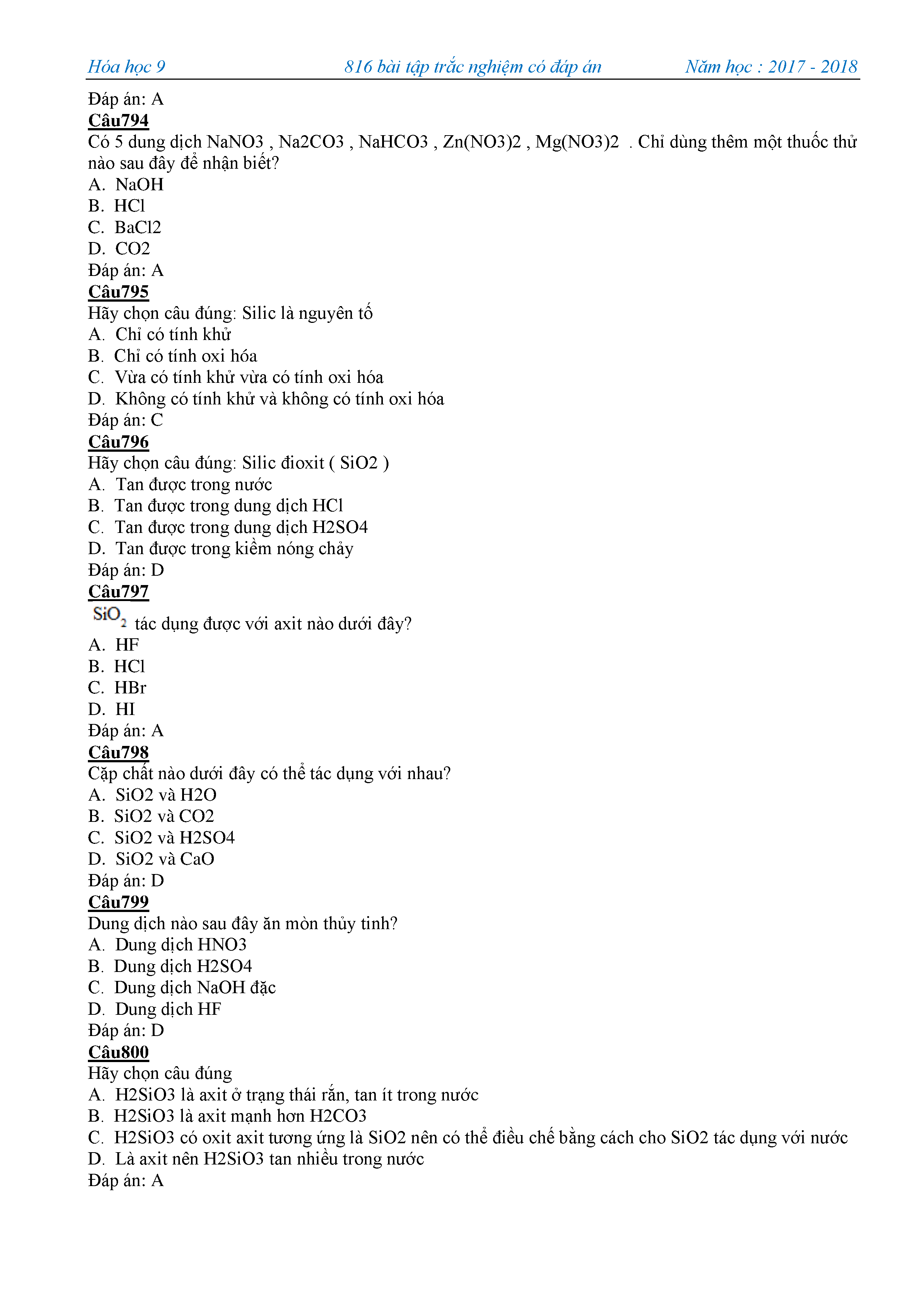 816 CÂU TRẮC NGHIỆM HÓA HỌC 9 (CÓ ĐÁP ÁN)