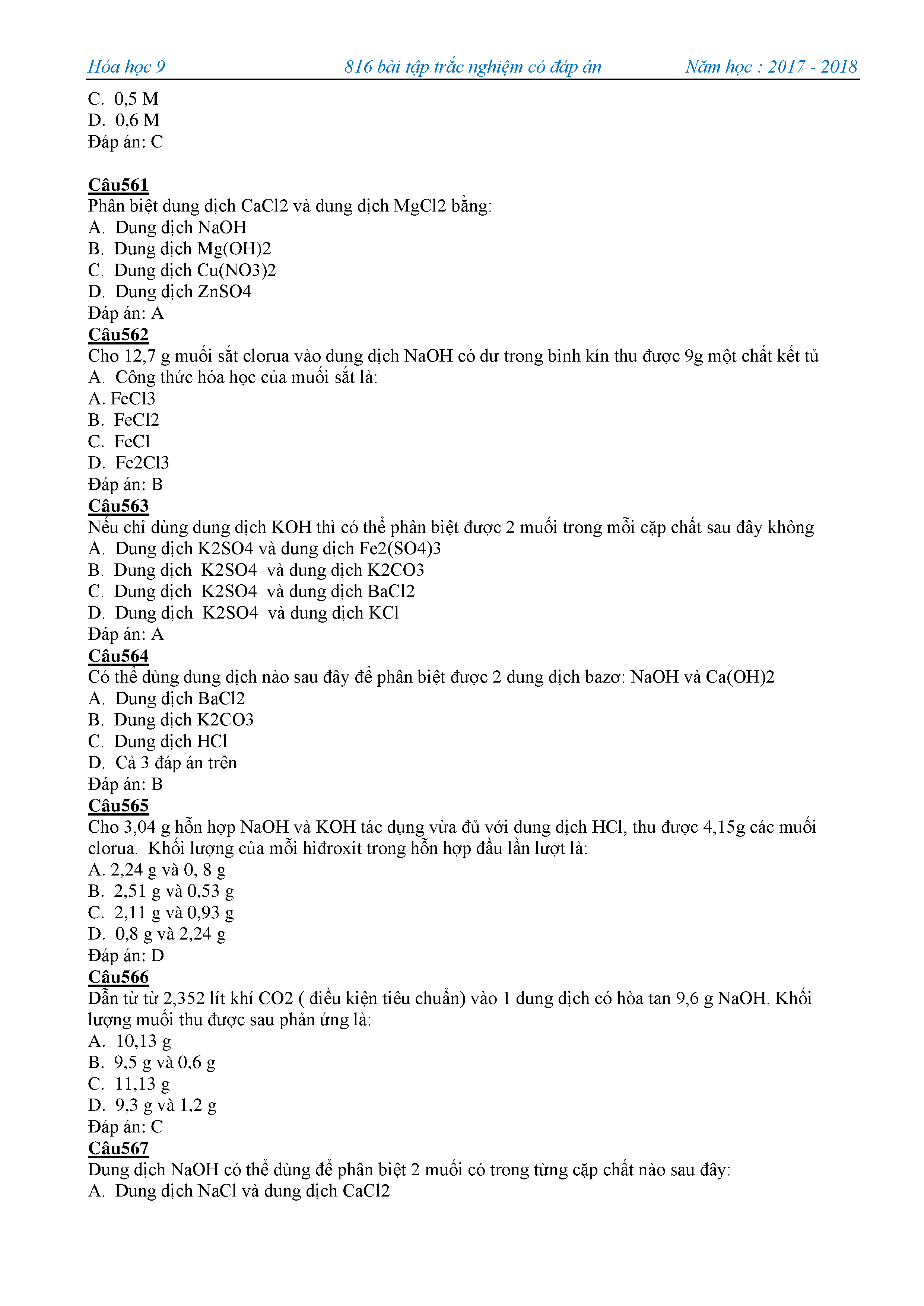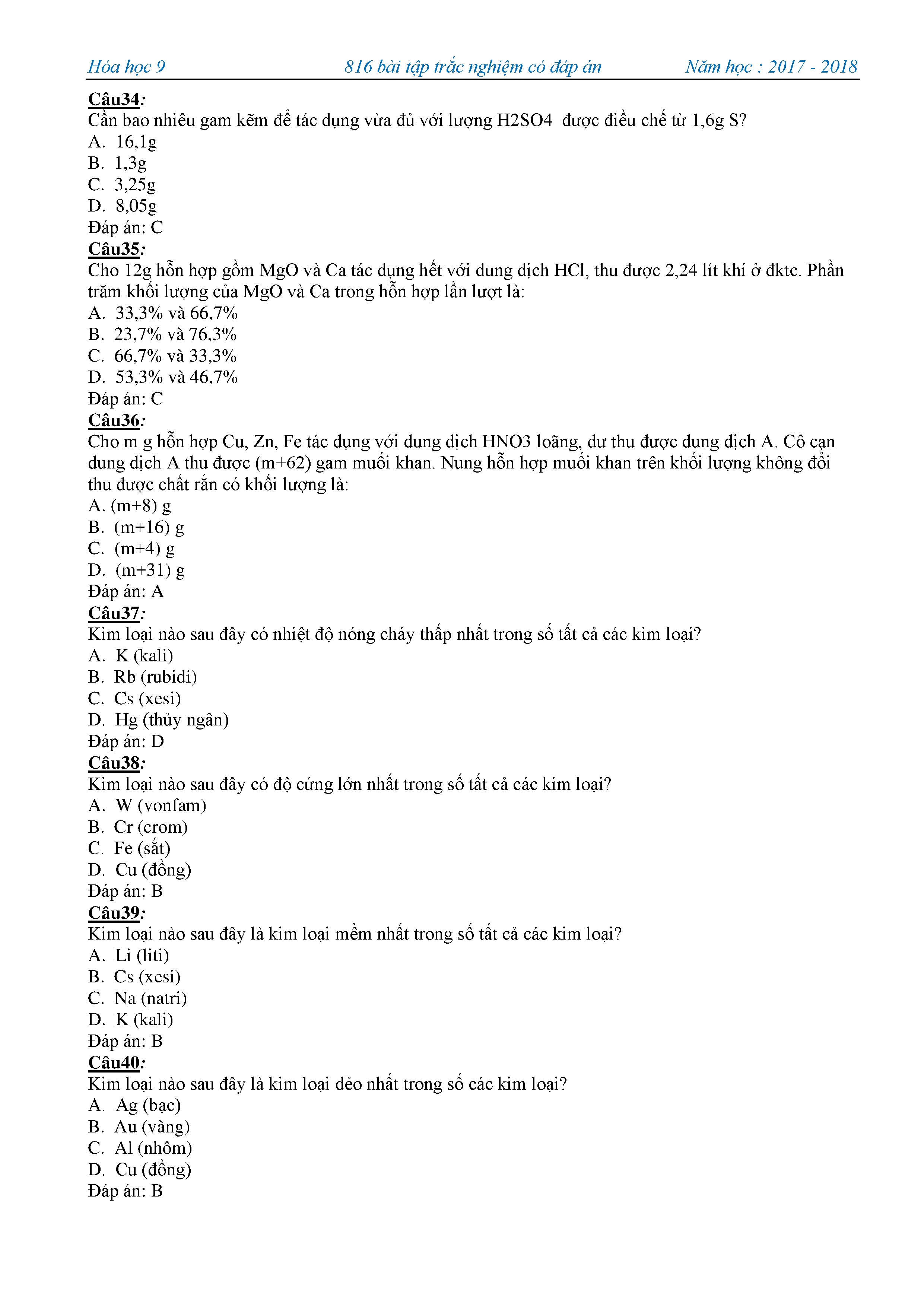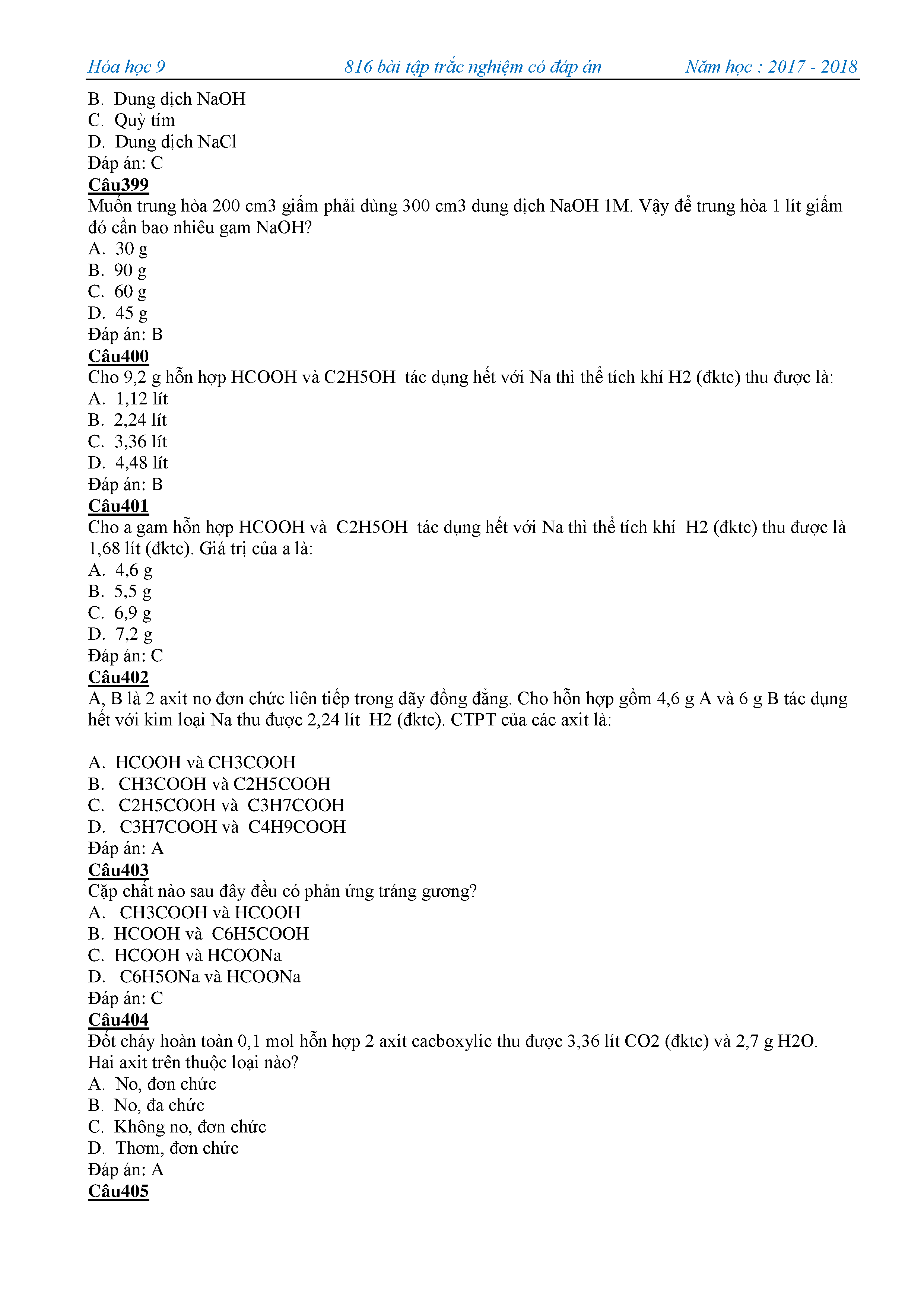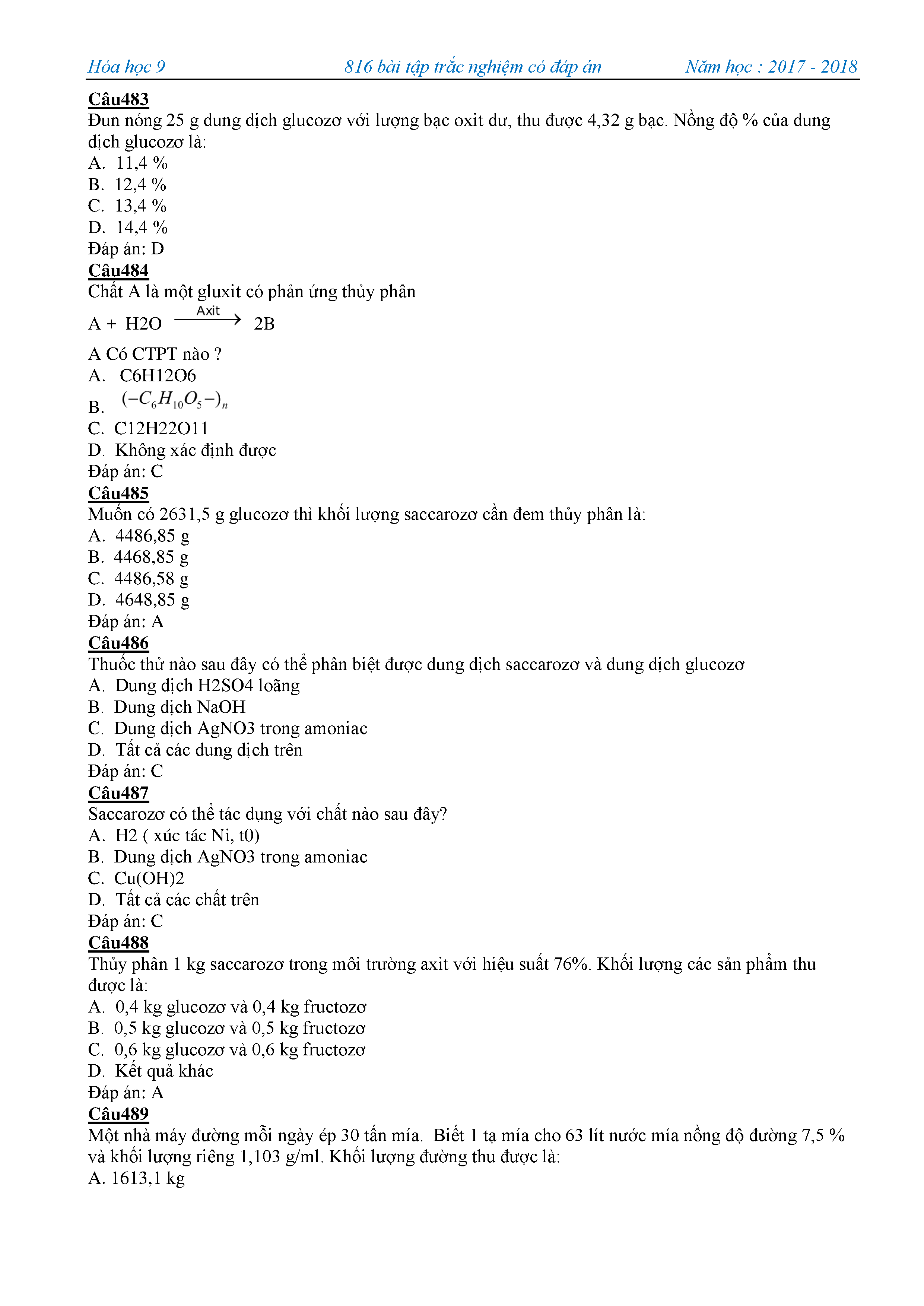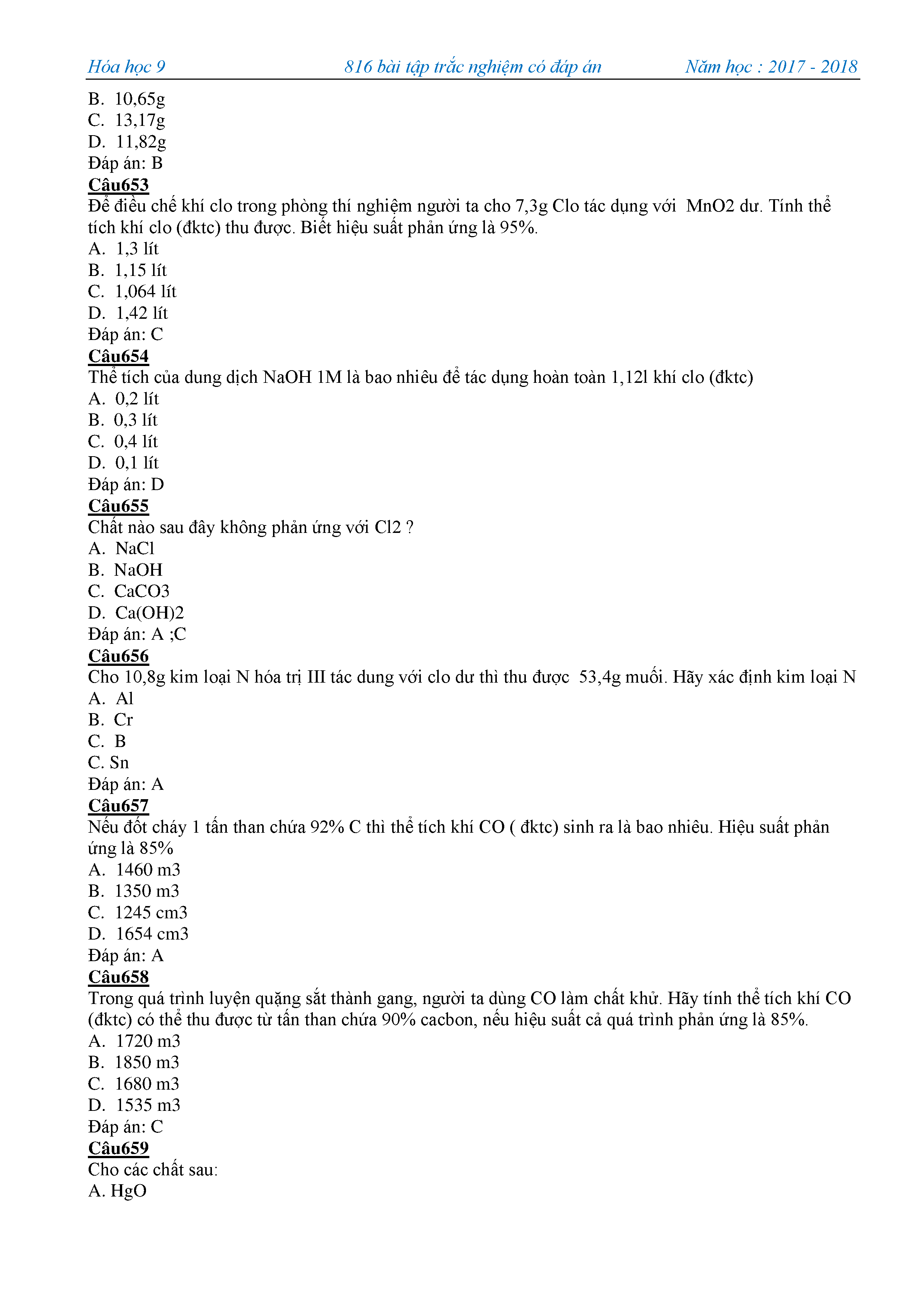 816 CÂU TRẮC NGHIỆM HÓA HỌC 9 (CÓ ĐÁP ÁN)