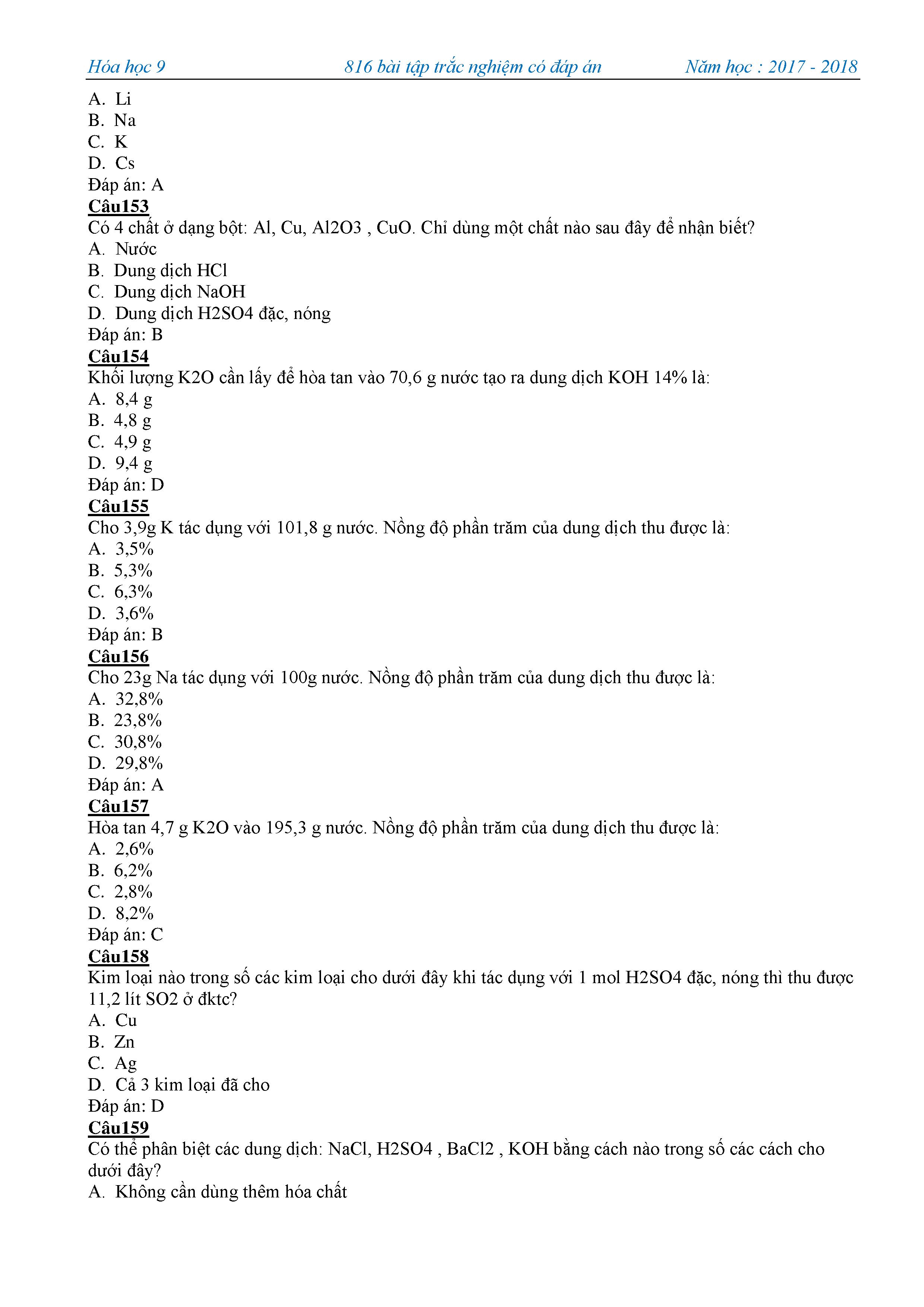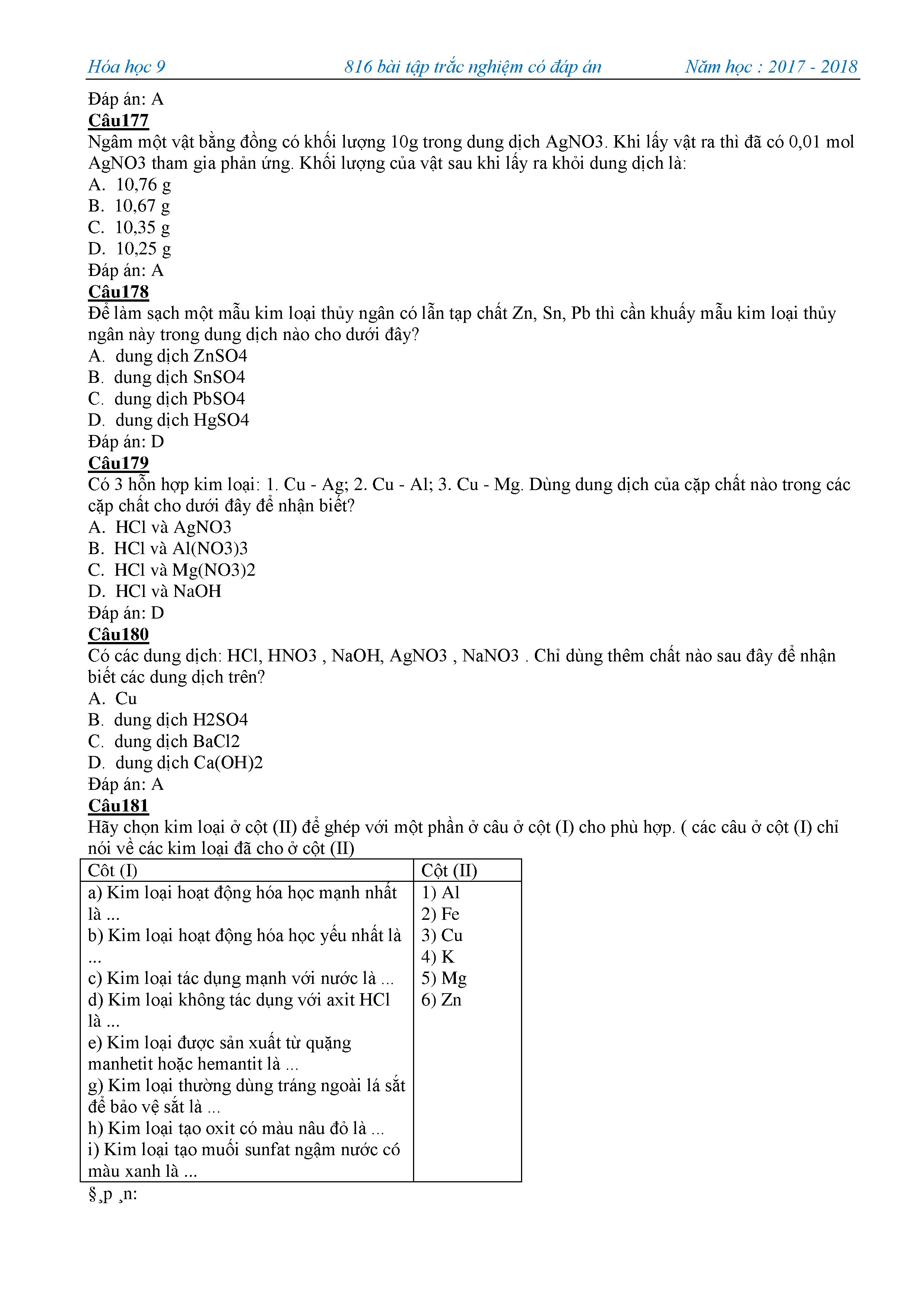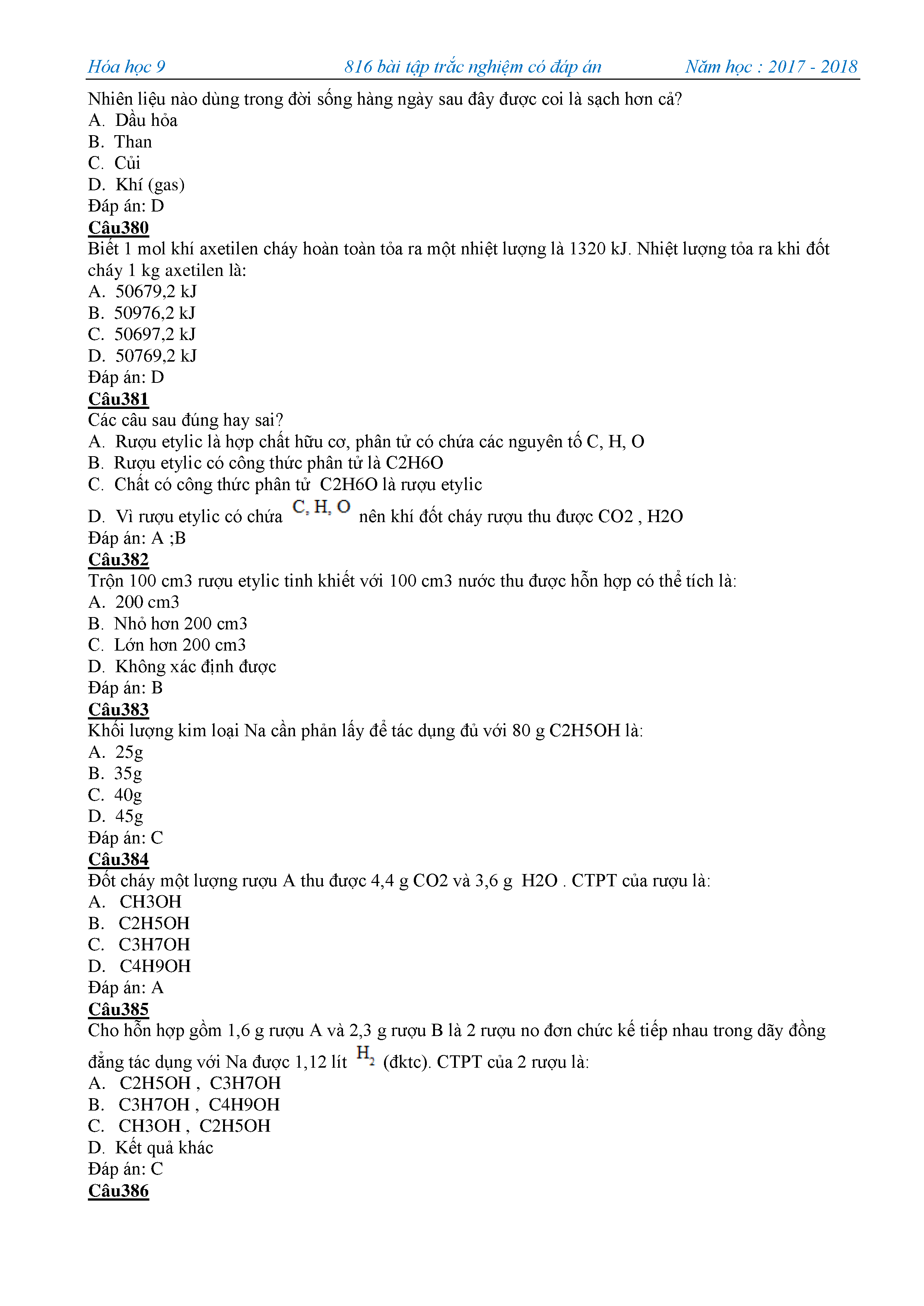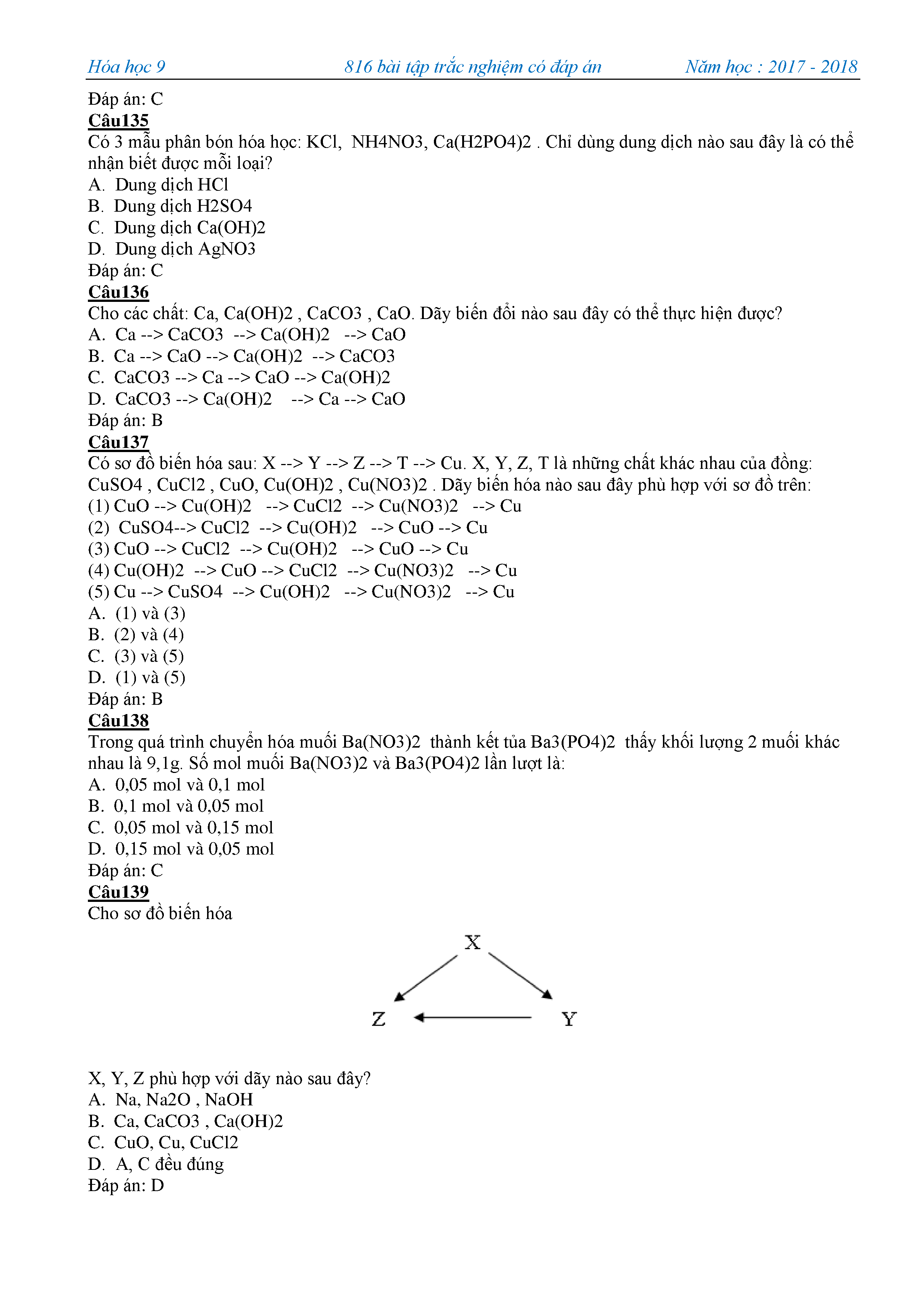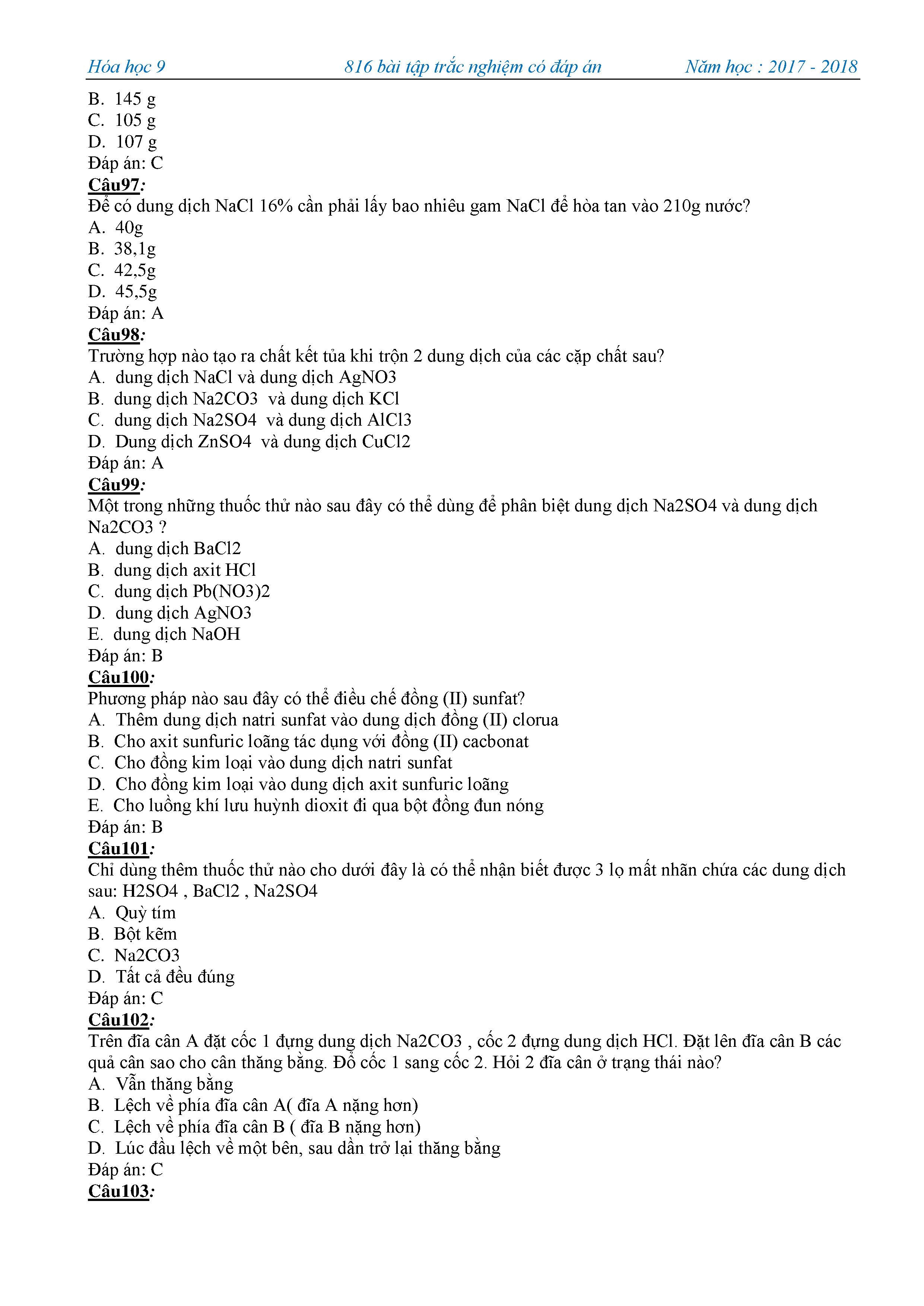 816 CÂU TRẮC NGHIỆM HÓA HỌC 9 (CÓ ĐÁP ÁN)