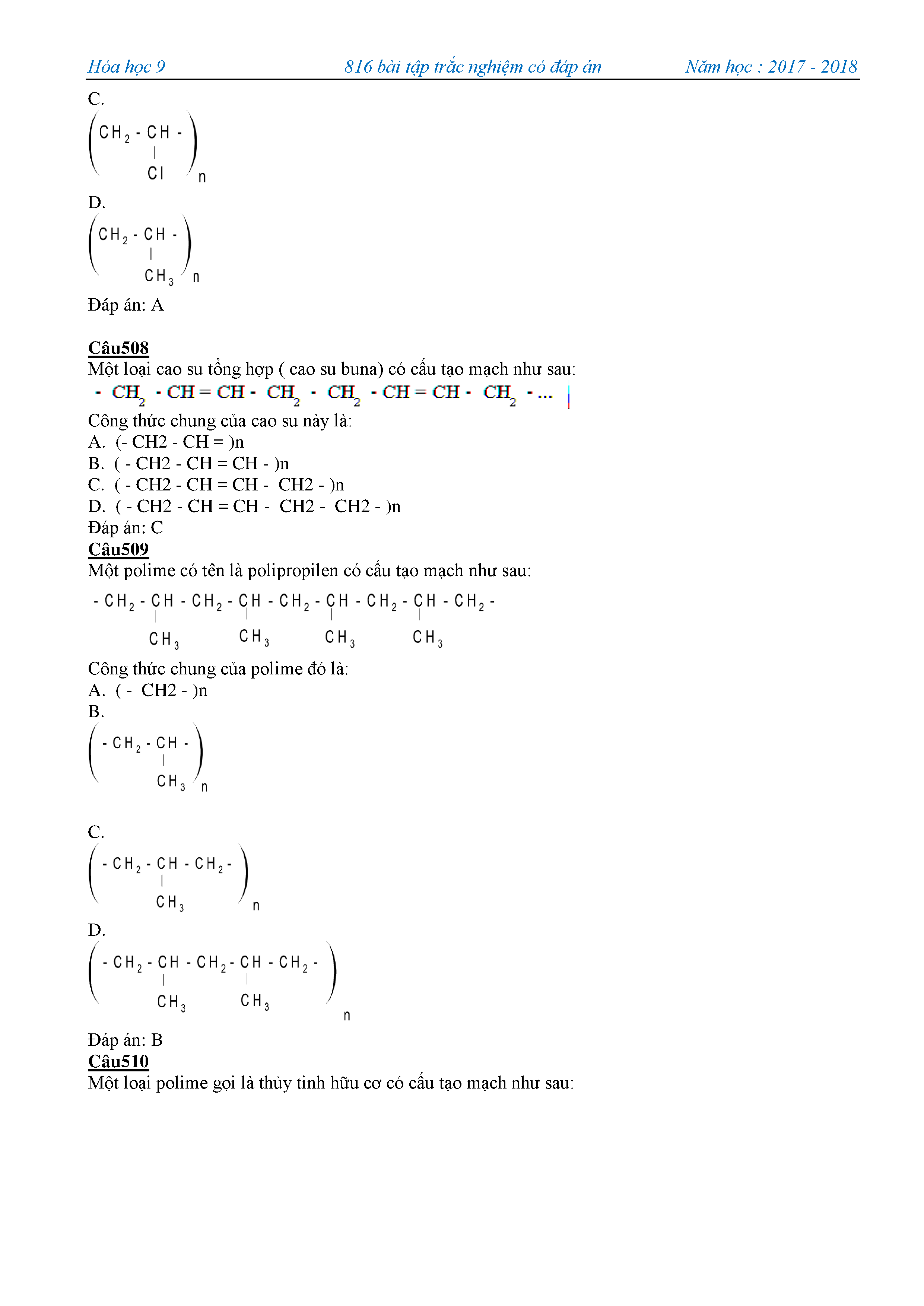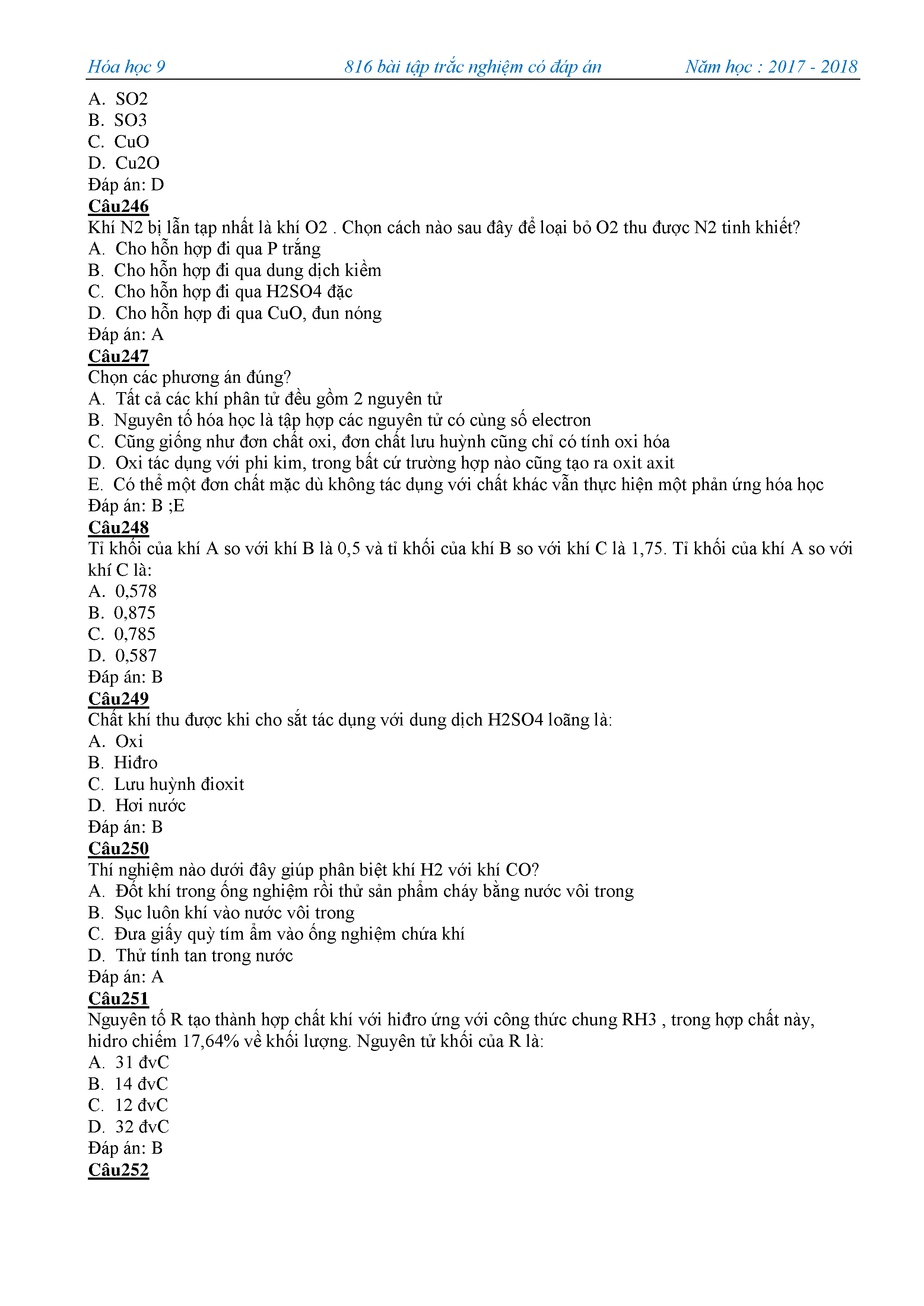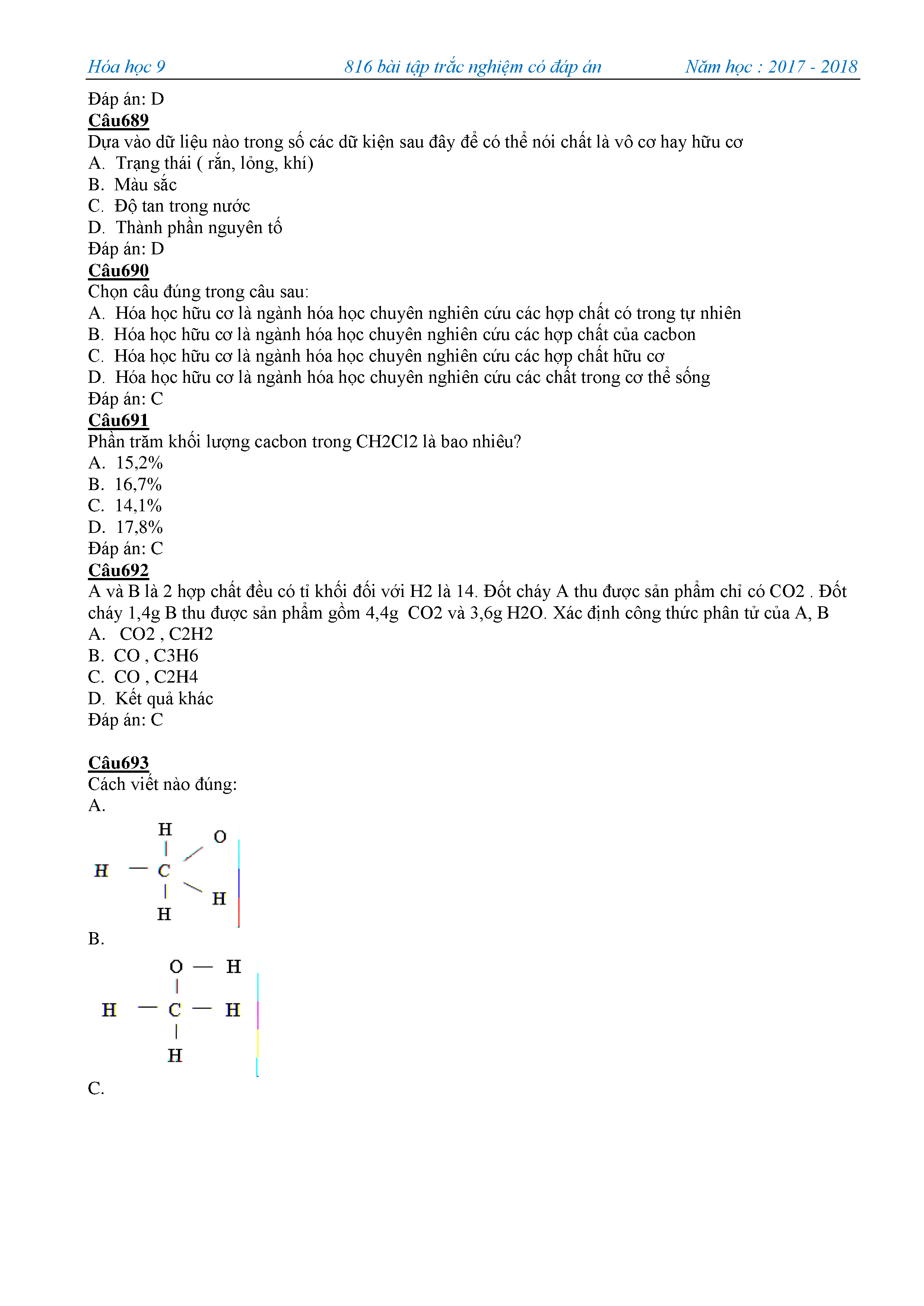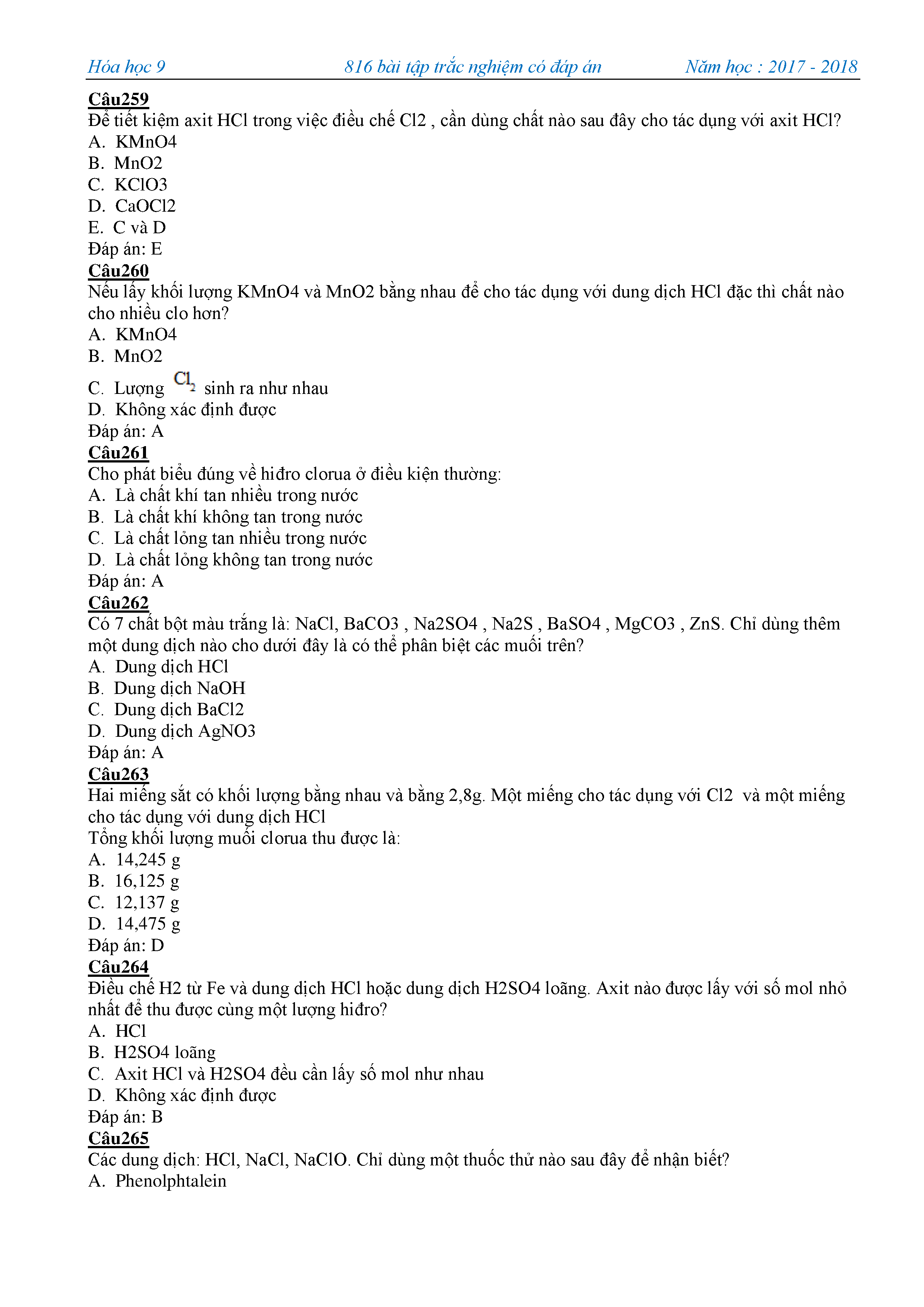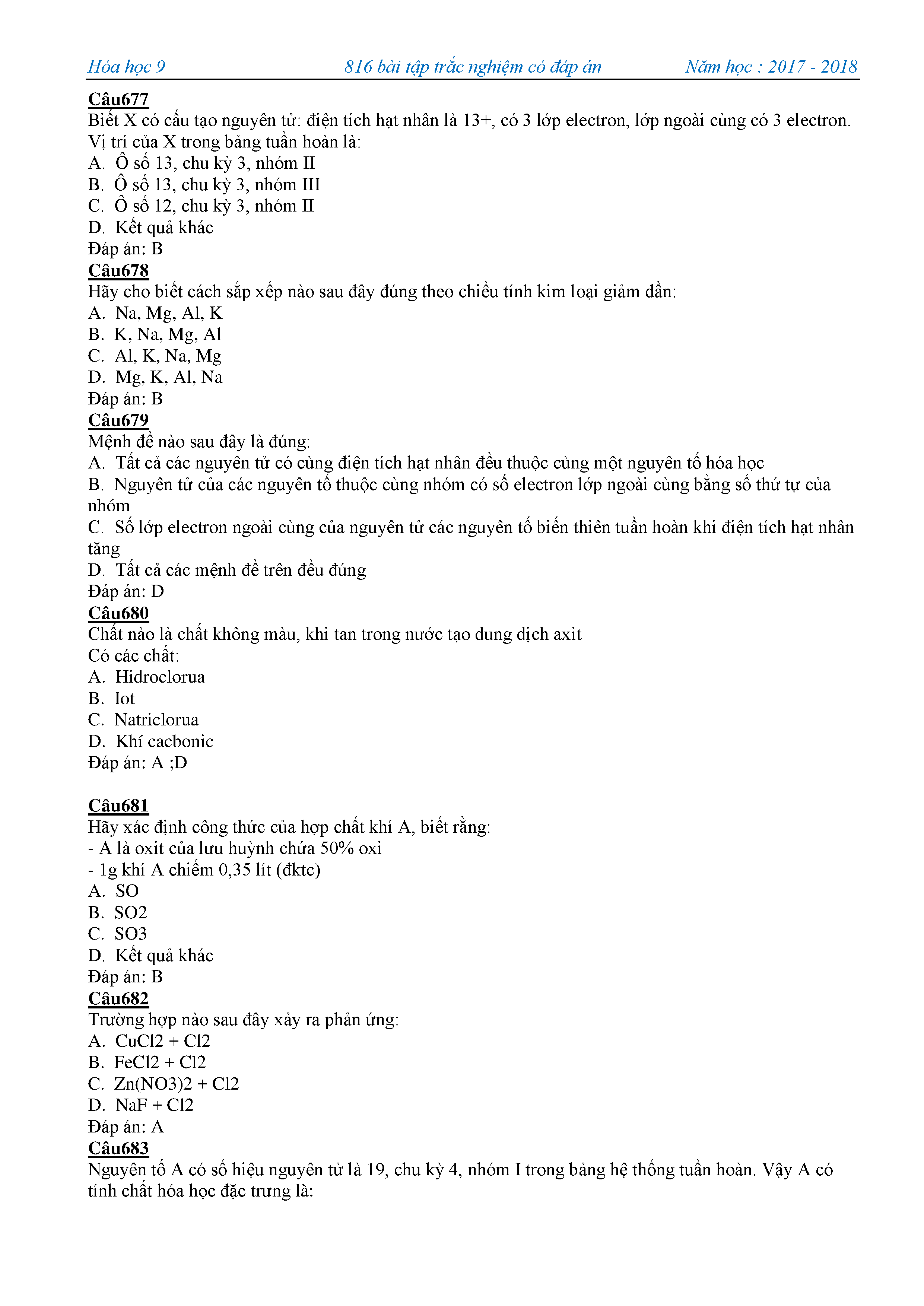 816 CÂU TRẮC NGHIỆM HÓA HỌC 9 (CÓ ĐÁP ÁN)