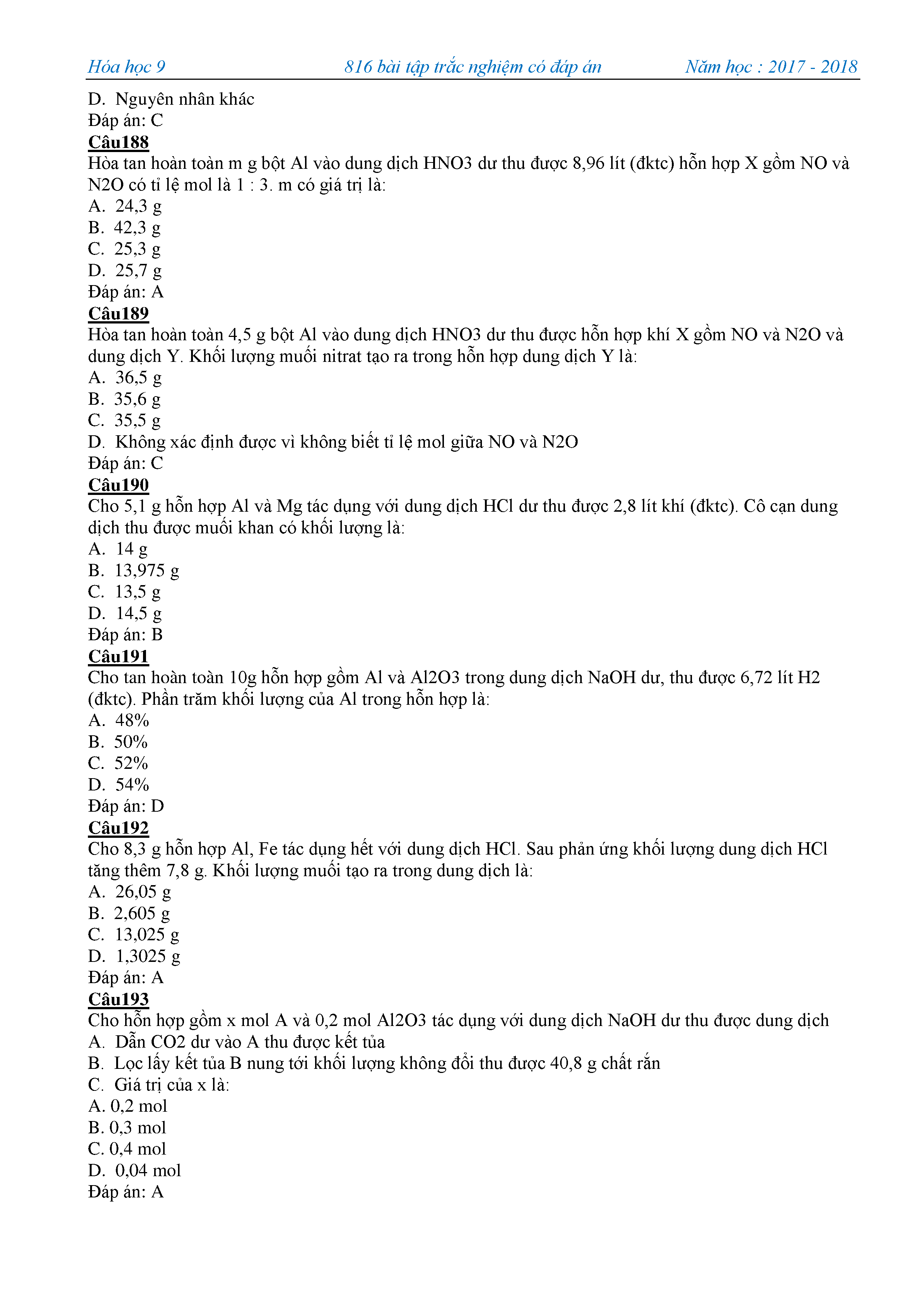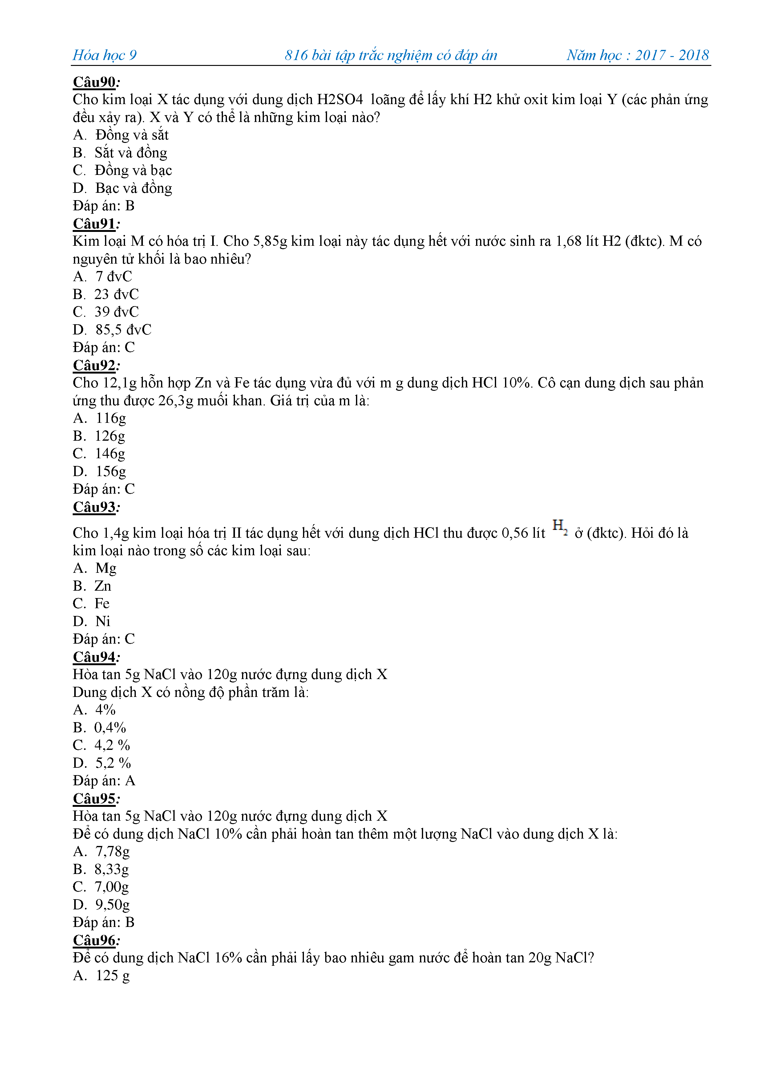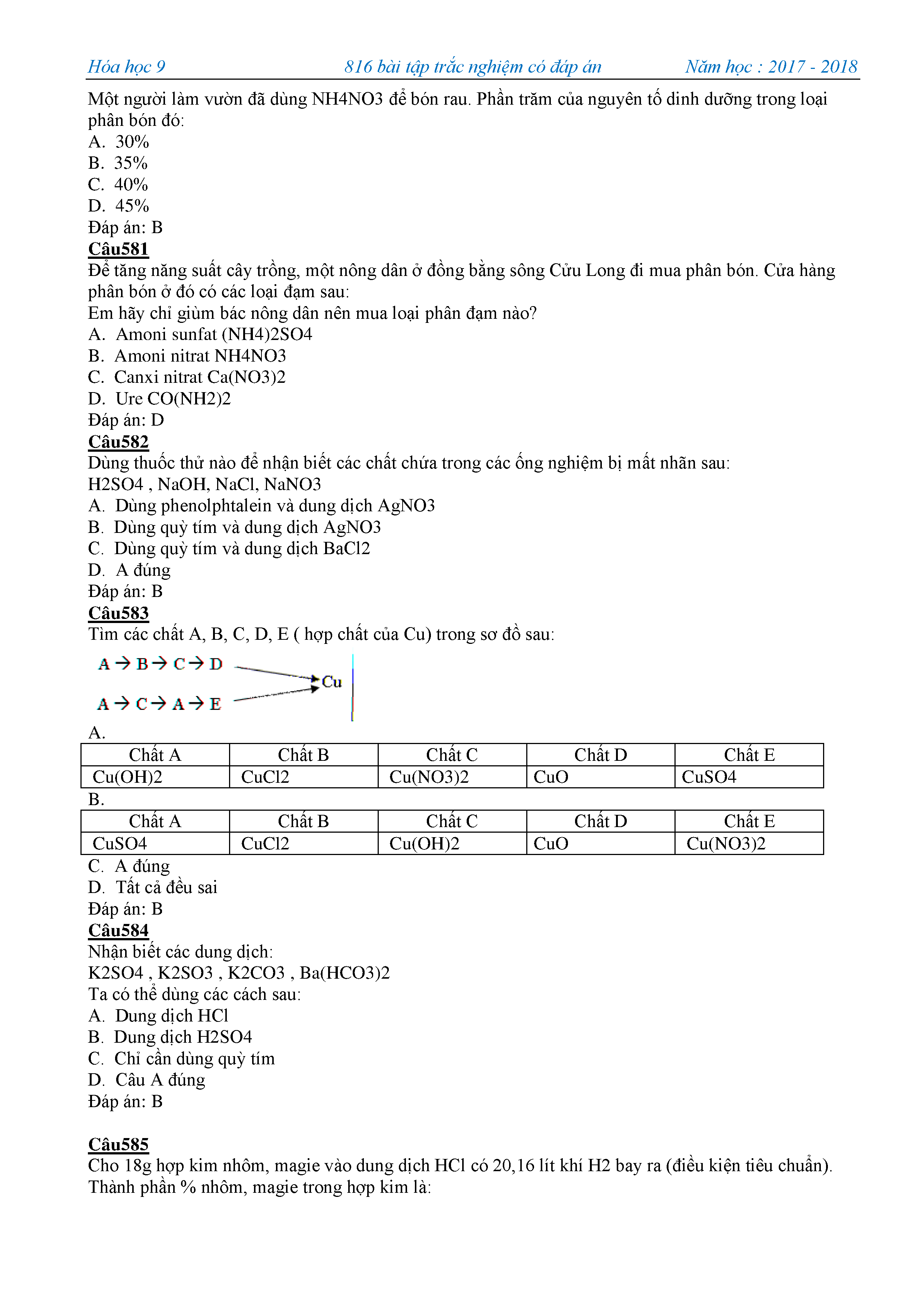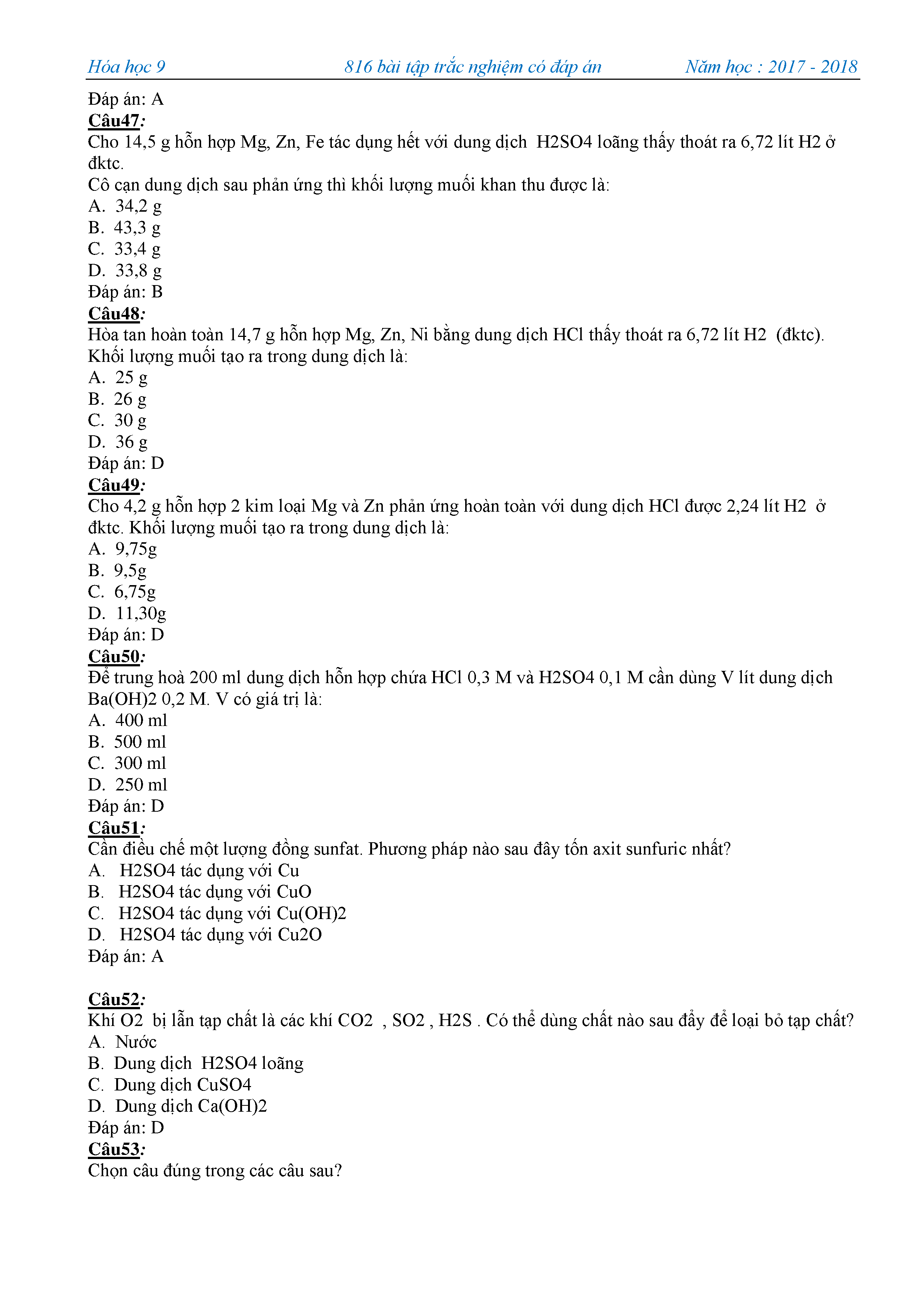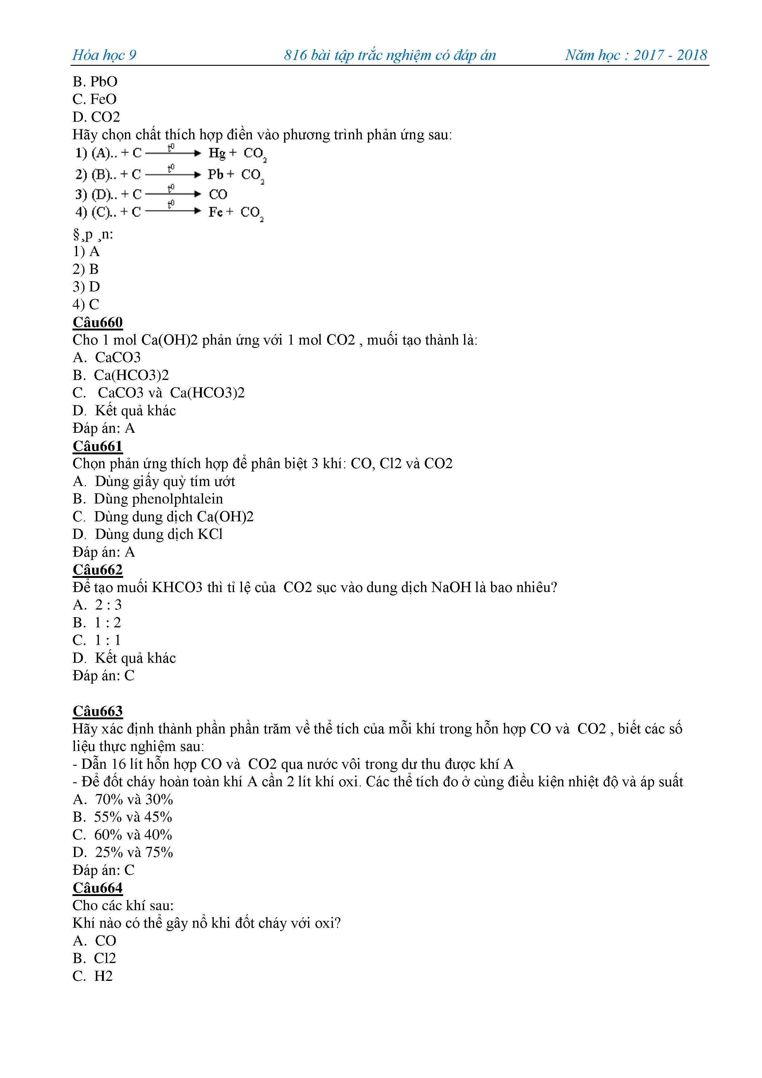 816 CÂU TRẮC NGHIỆM HÓA HỌC 9 (CÓ ĐÁP ÁN)