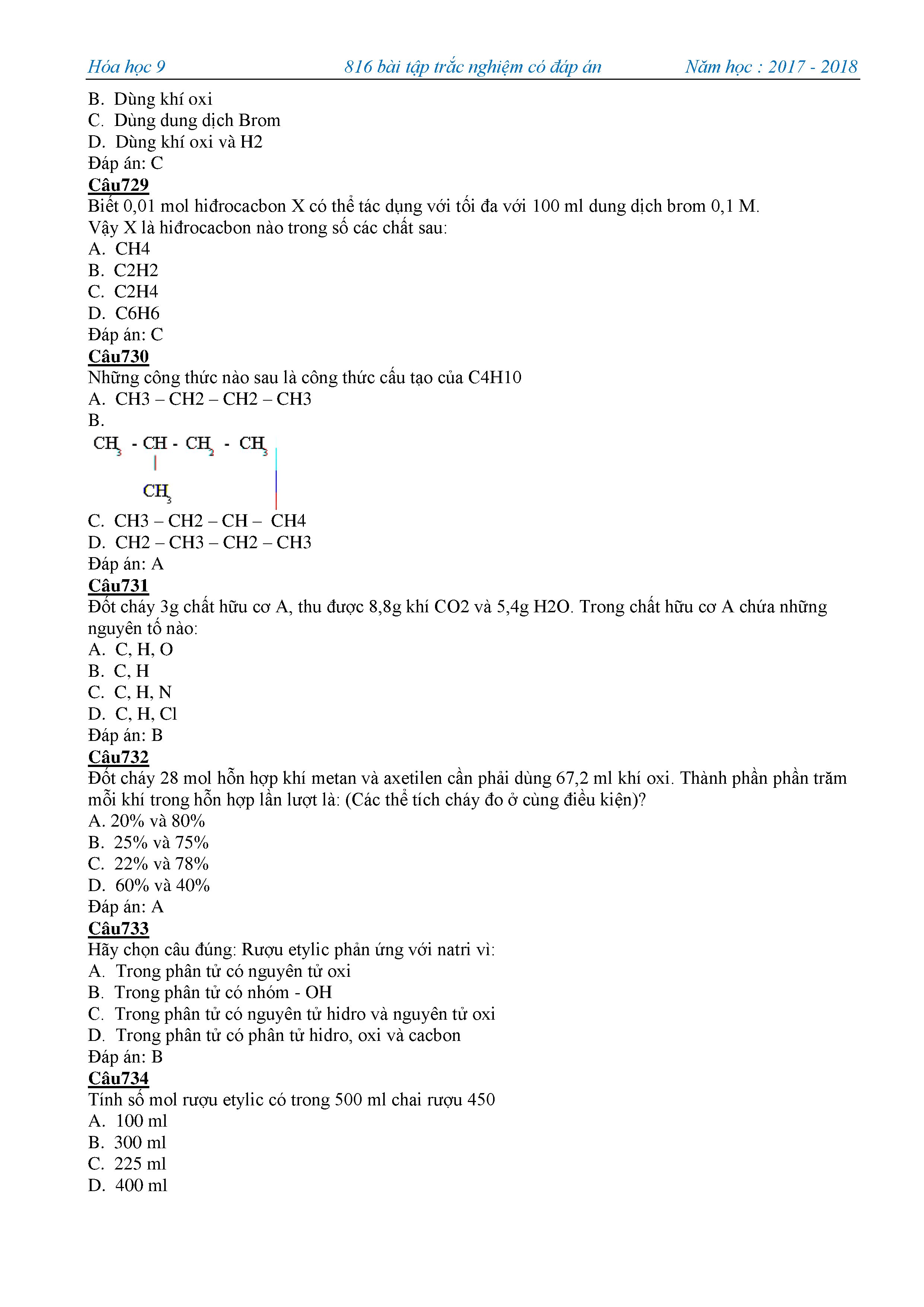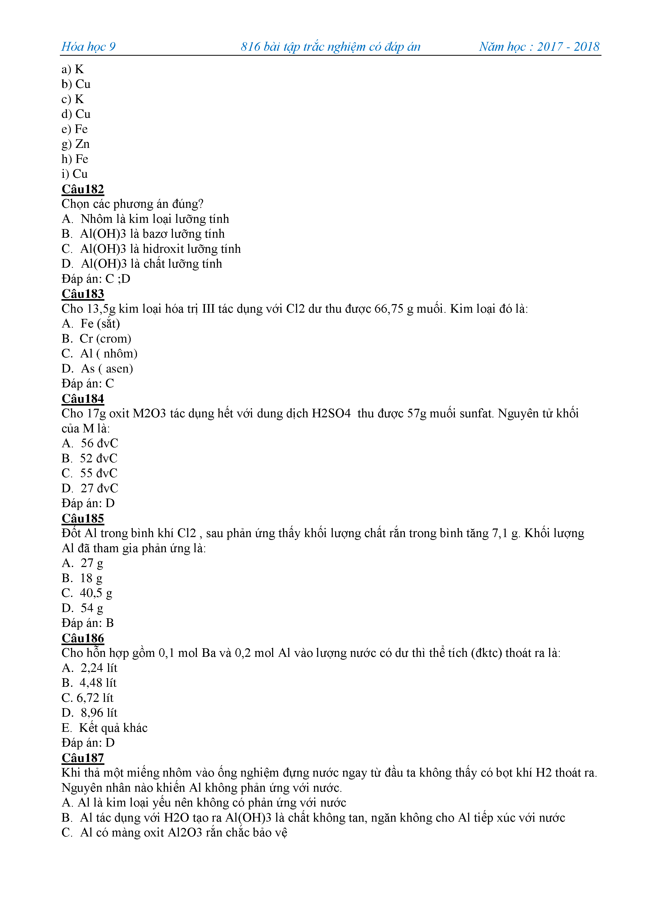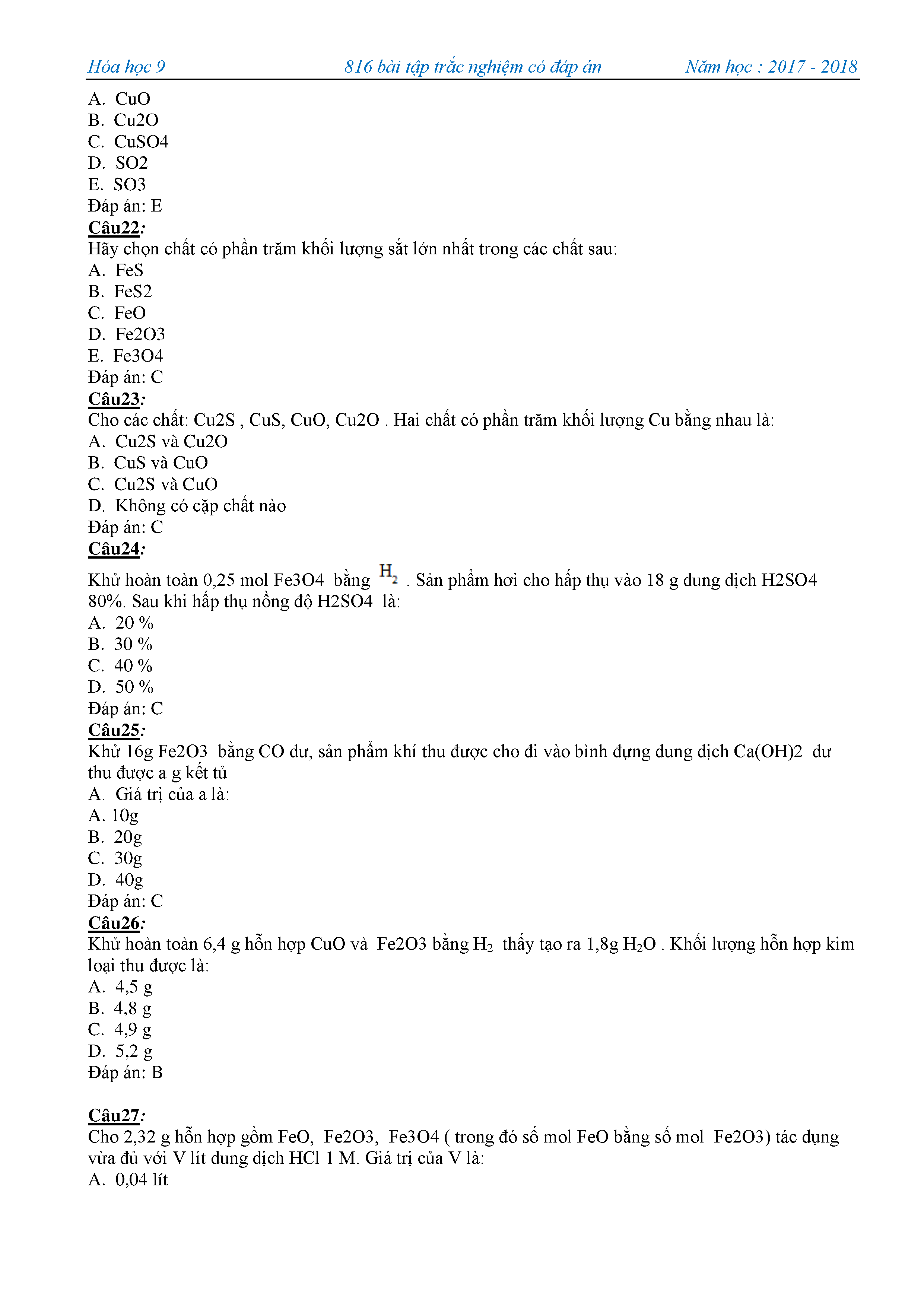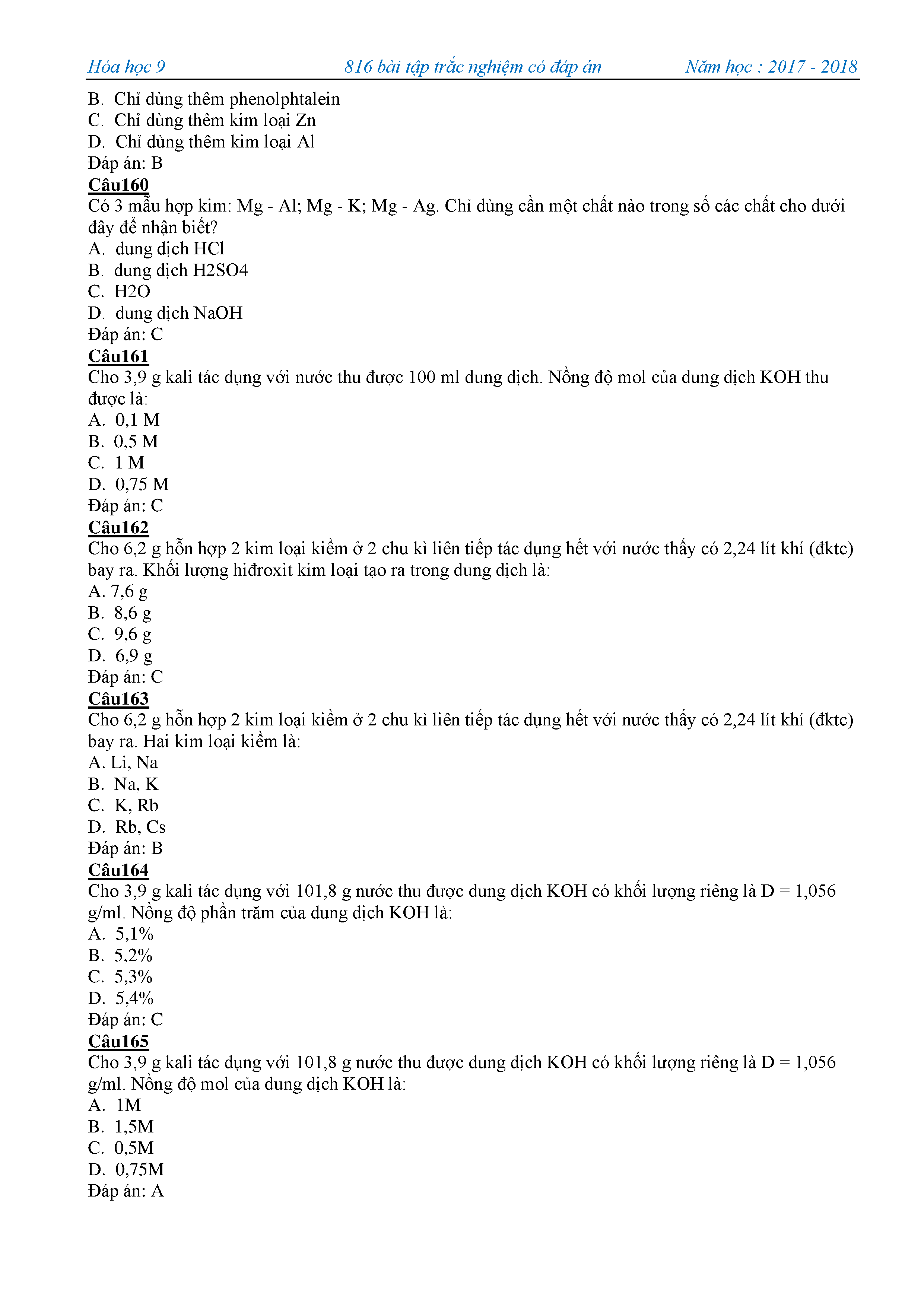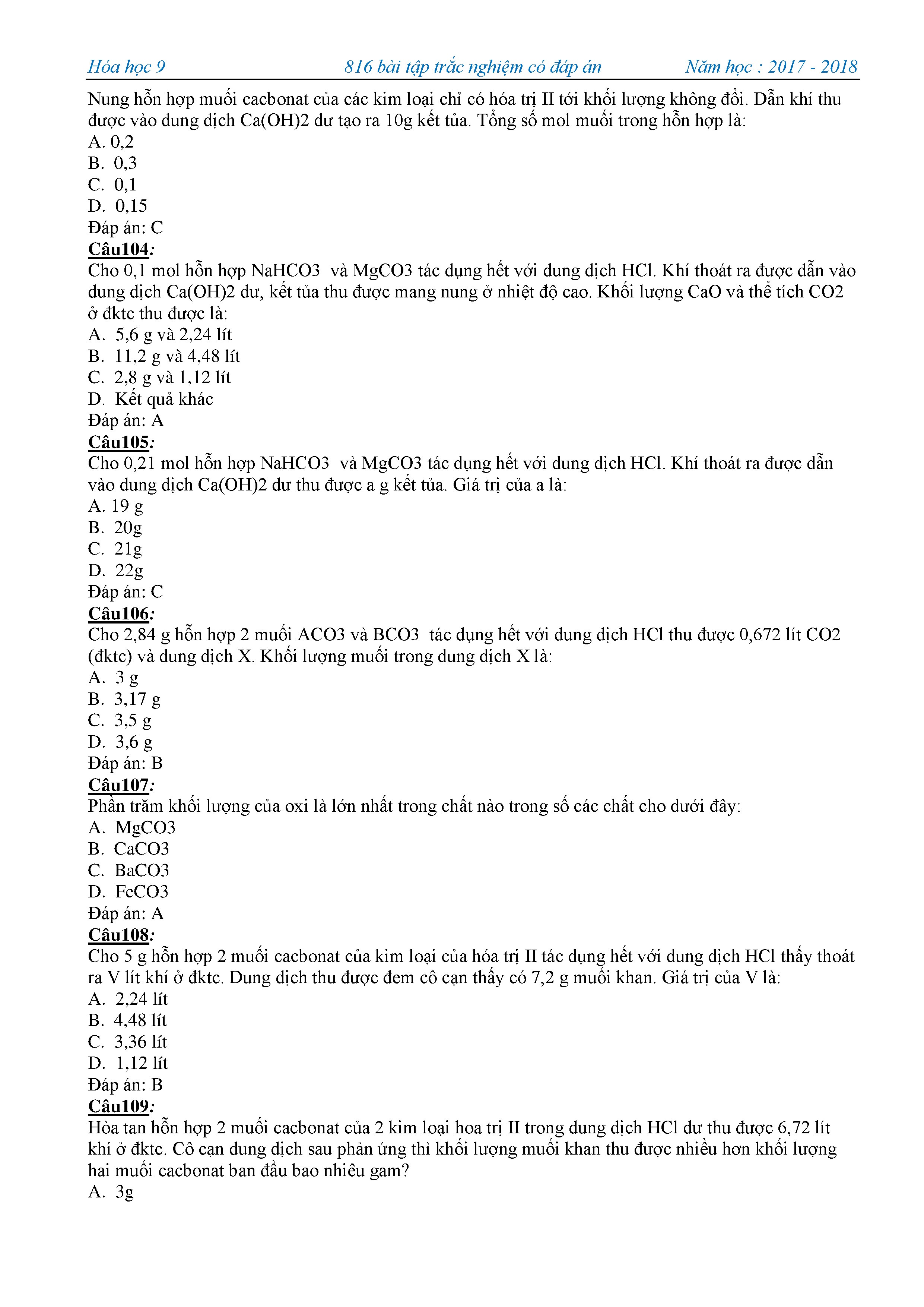 816 CÂU TRẮC NGHIỆM HÓA HỌC 9 (CÓ ĐÁP ÁN)