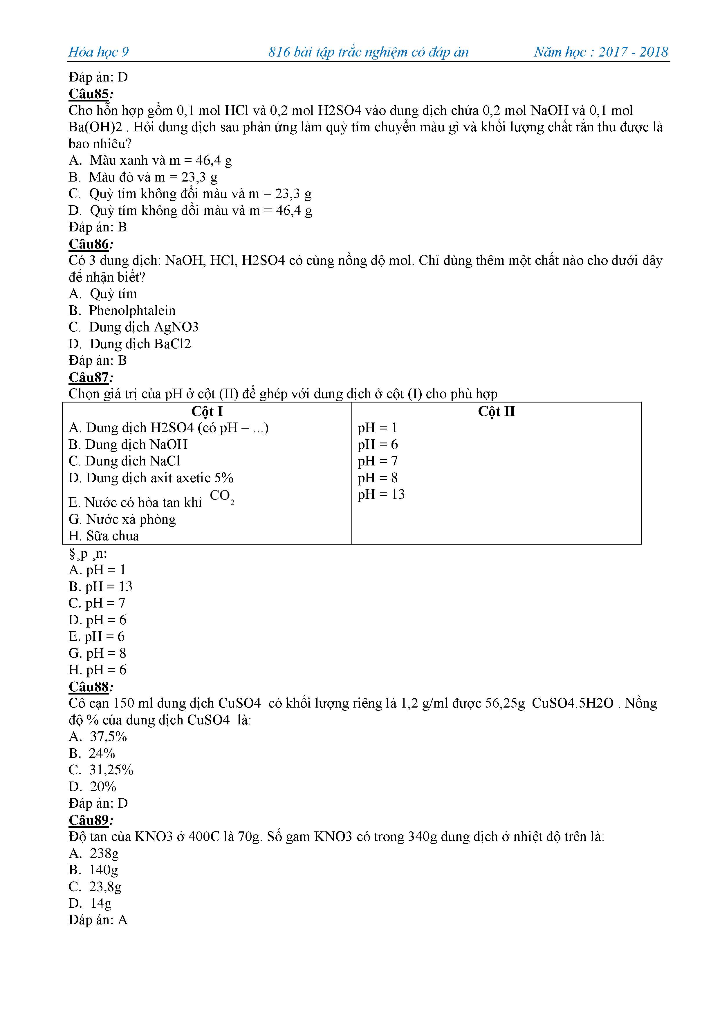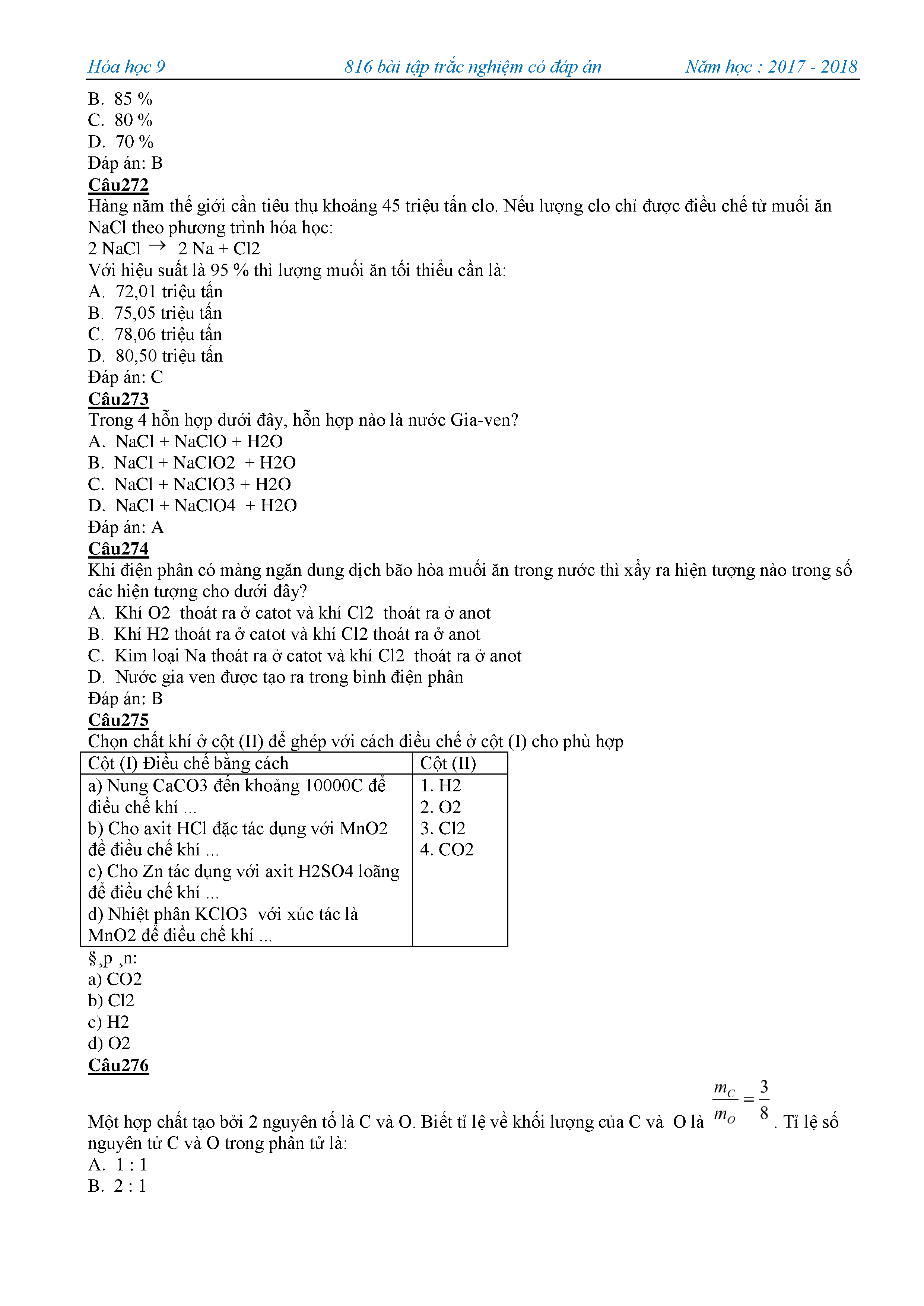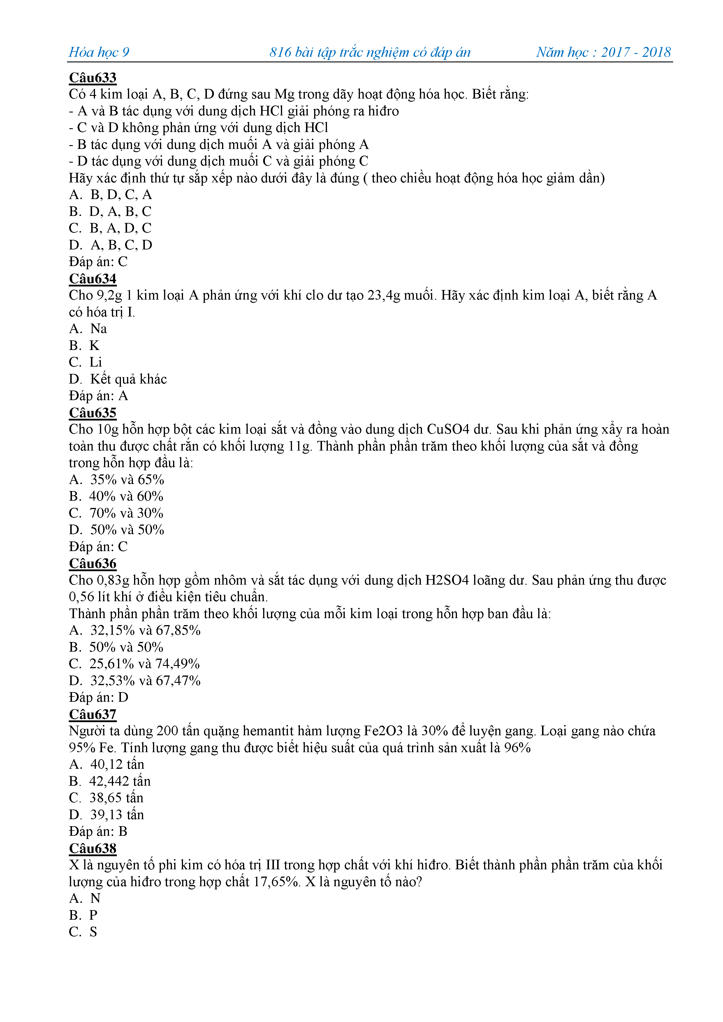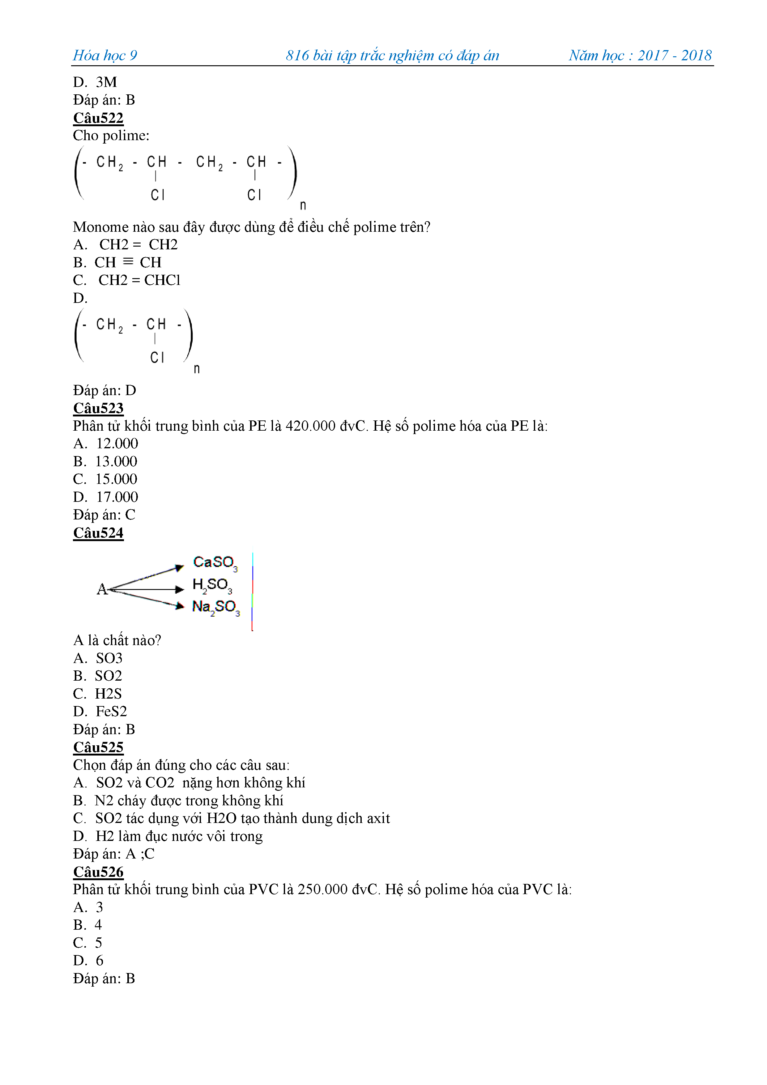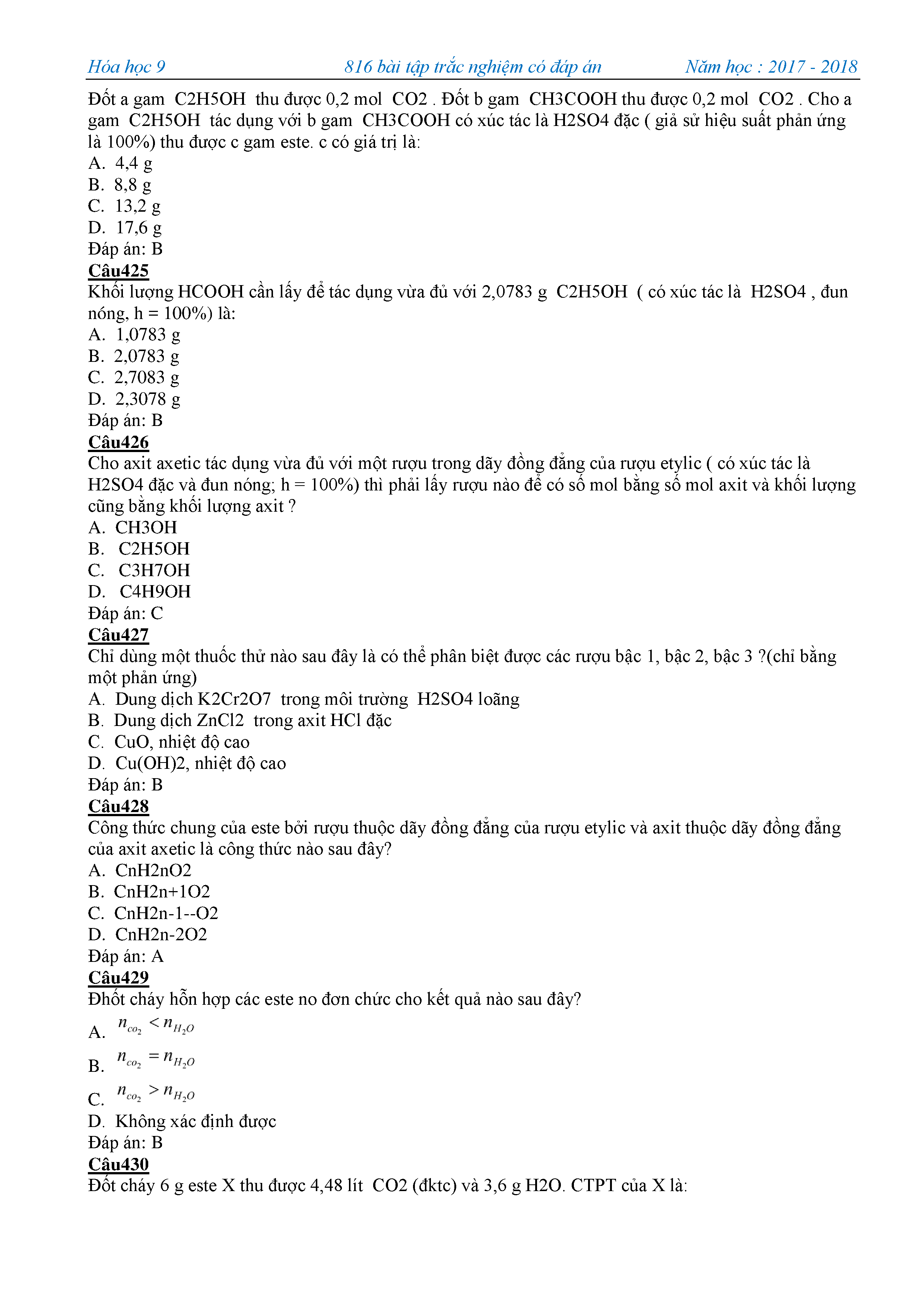 816 CÂU TRẮC NGHIỆM HÓA HỌC 9 (CÓ ĐÁP ÁN)