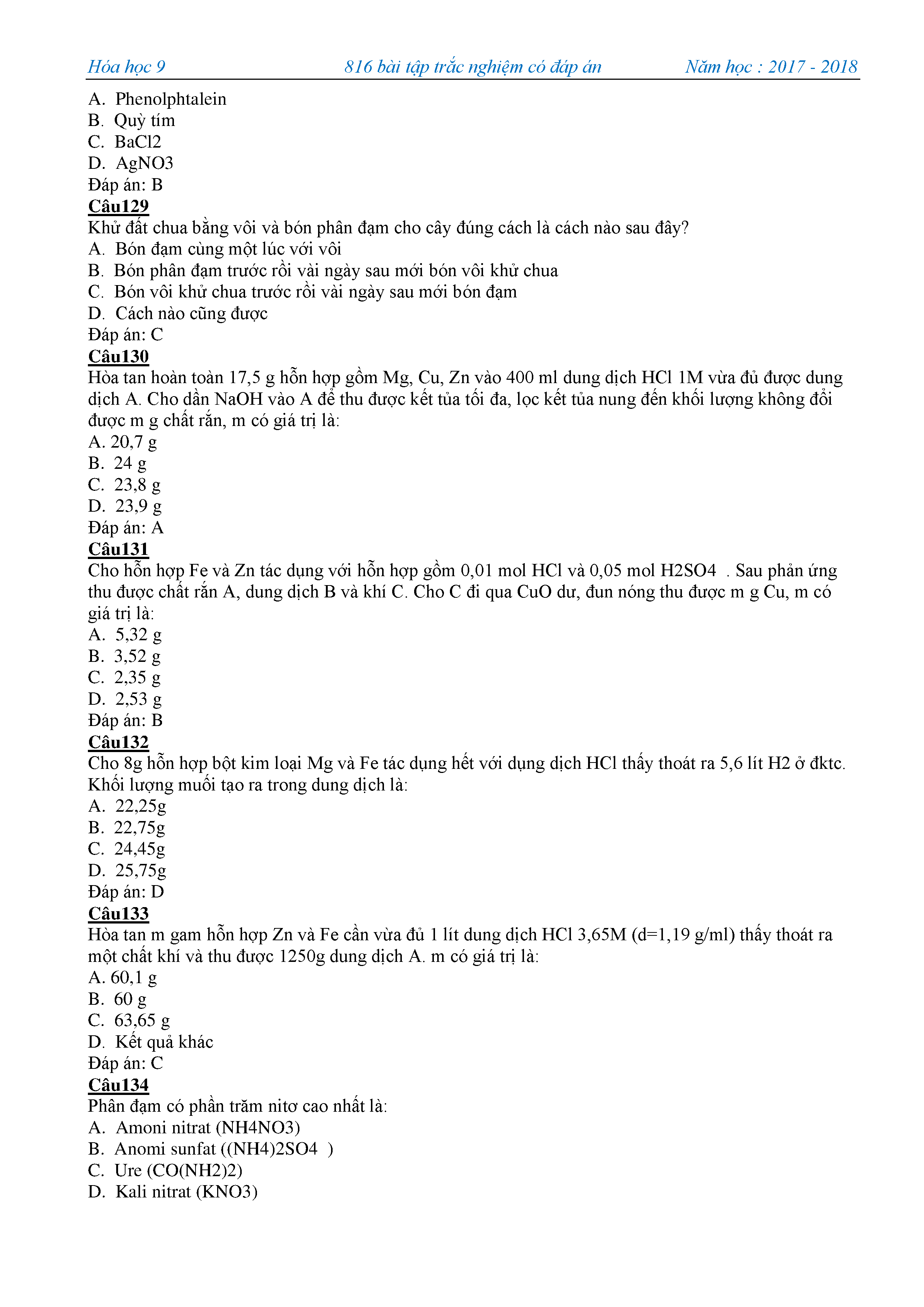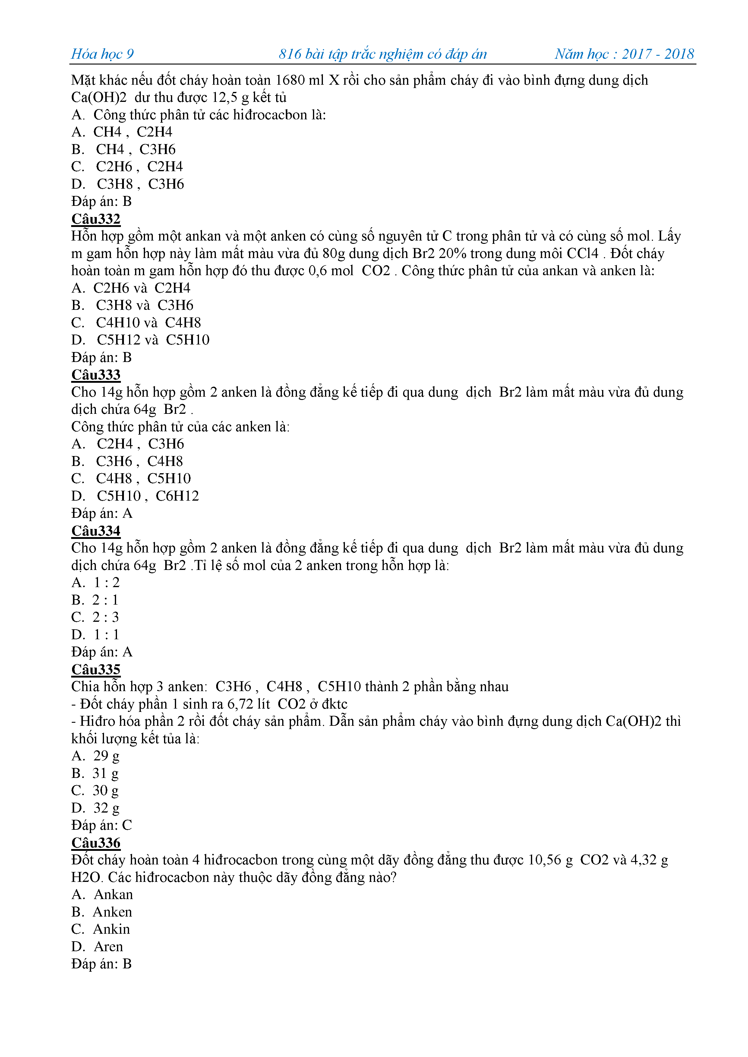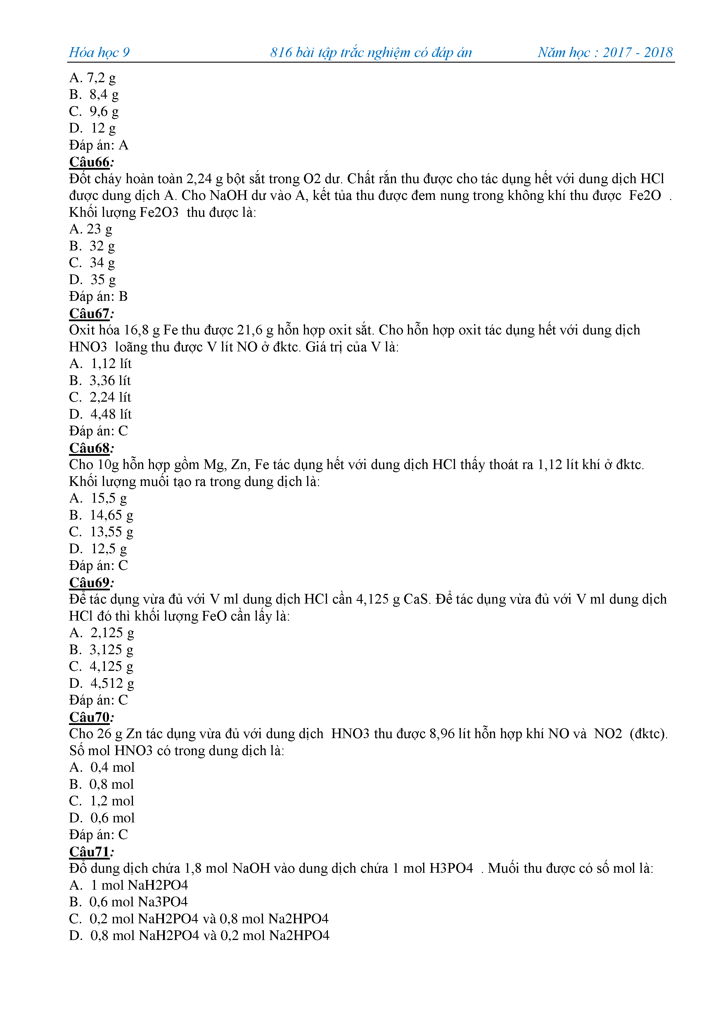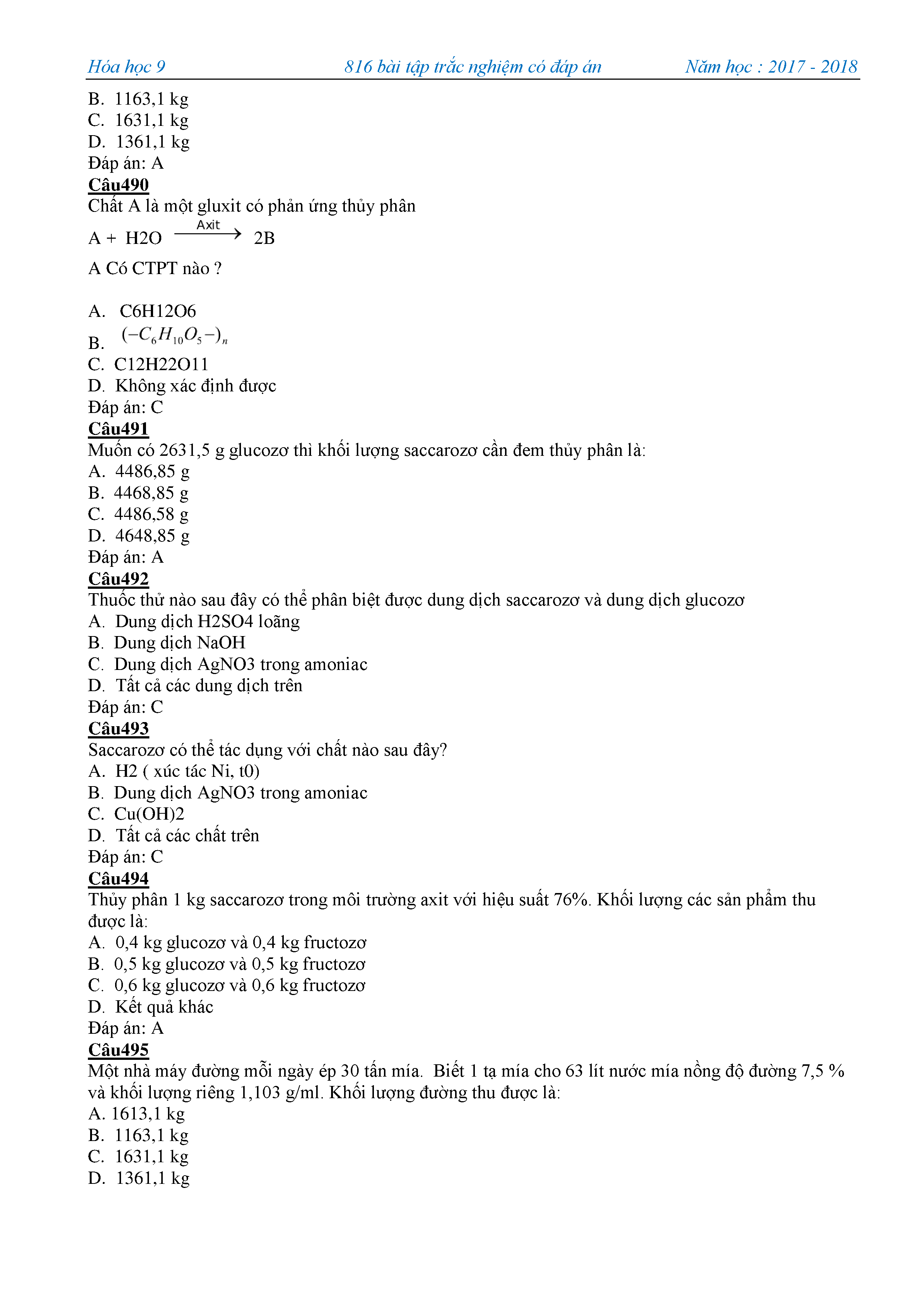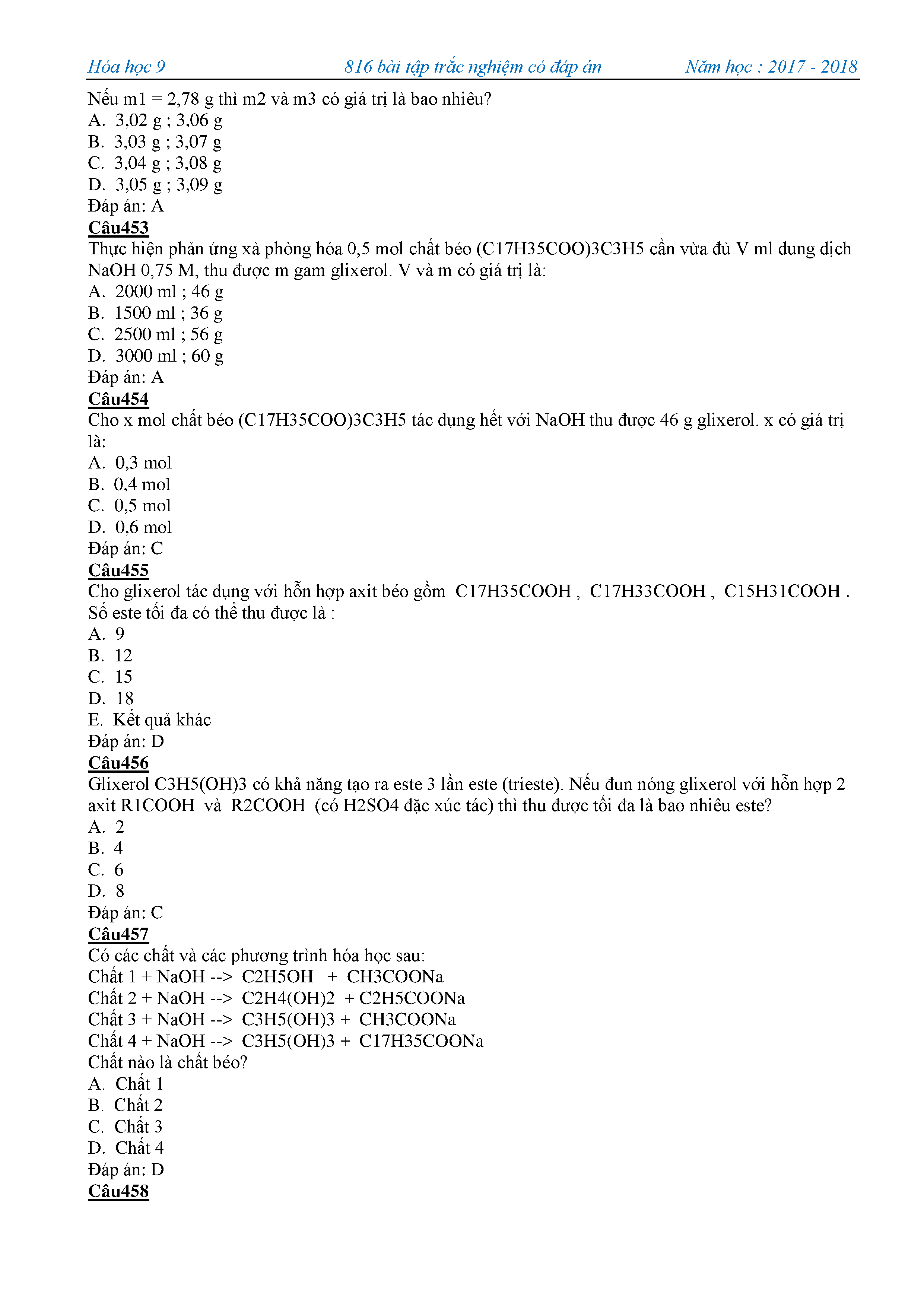 816 CÂU TRẮC NGHIỆM HÓA HỌC 9 (CÓ ĐÁP ÁN)