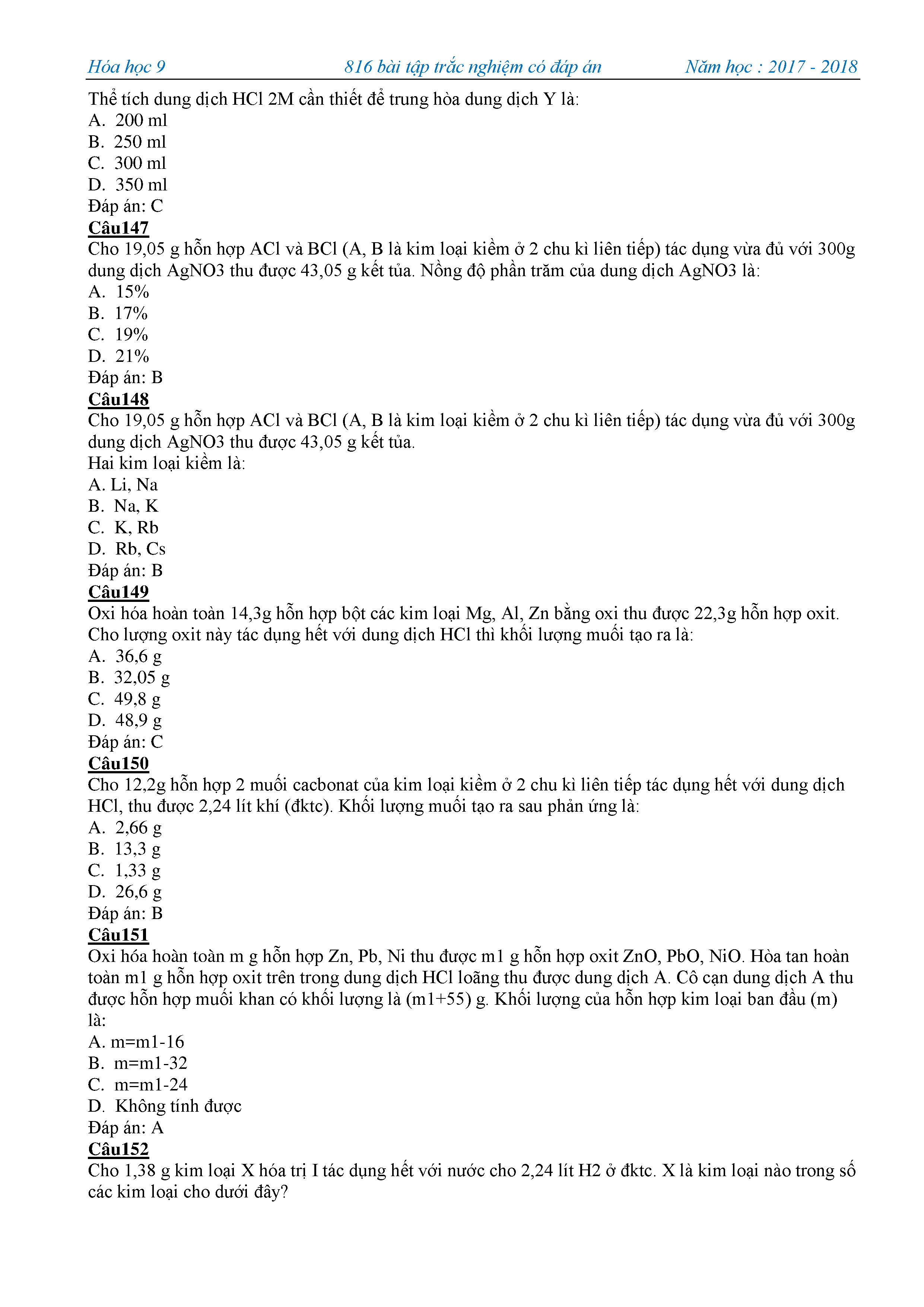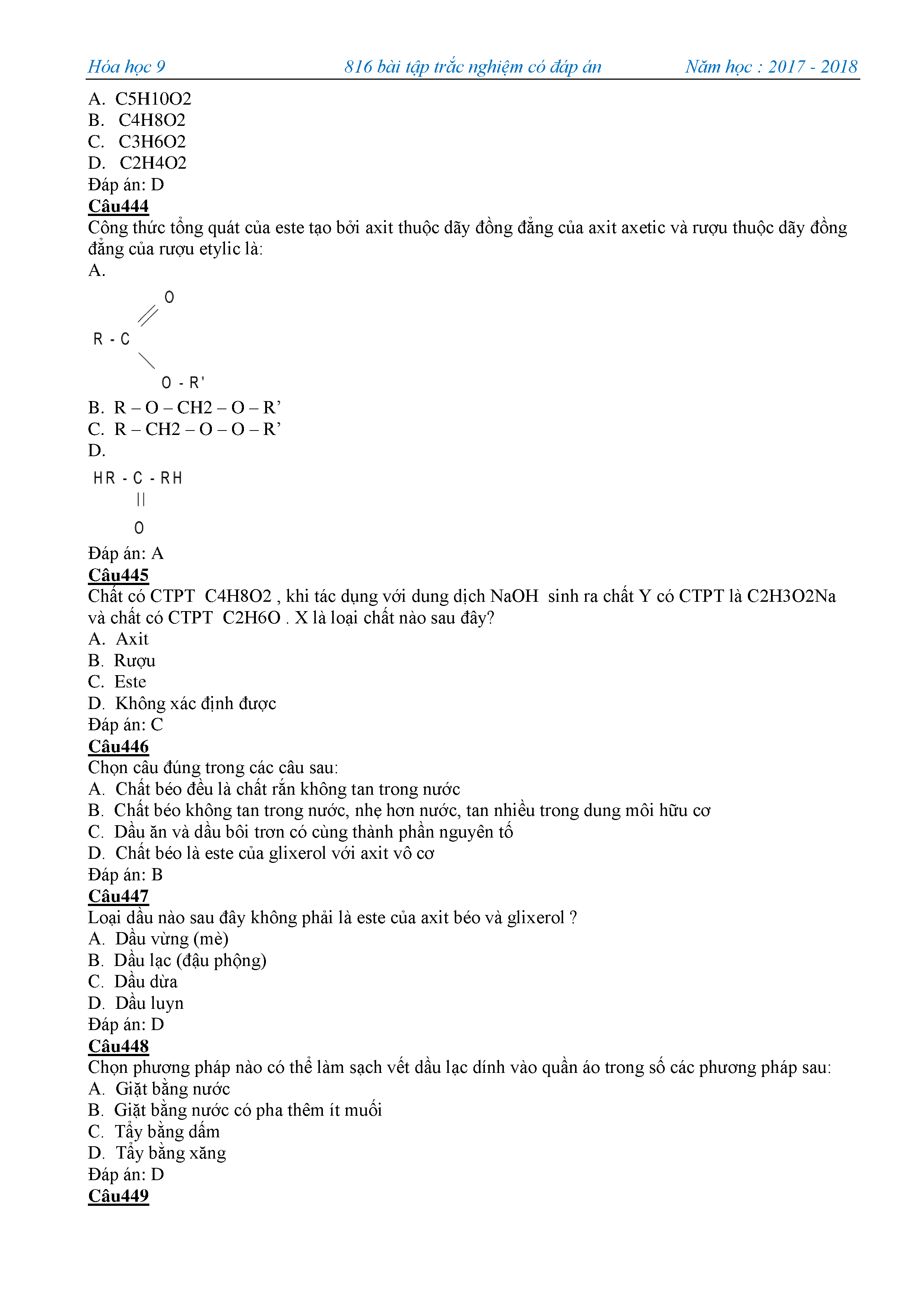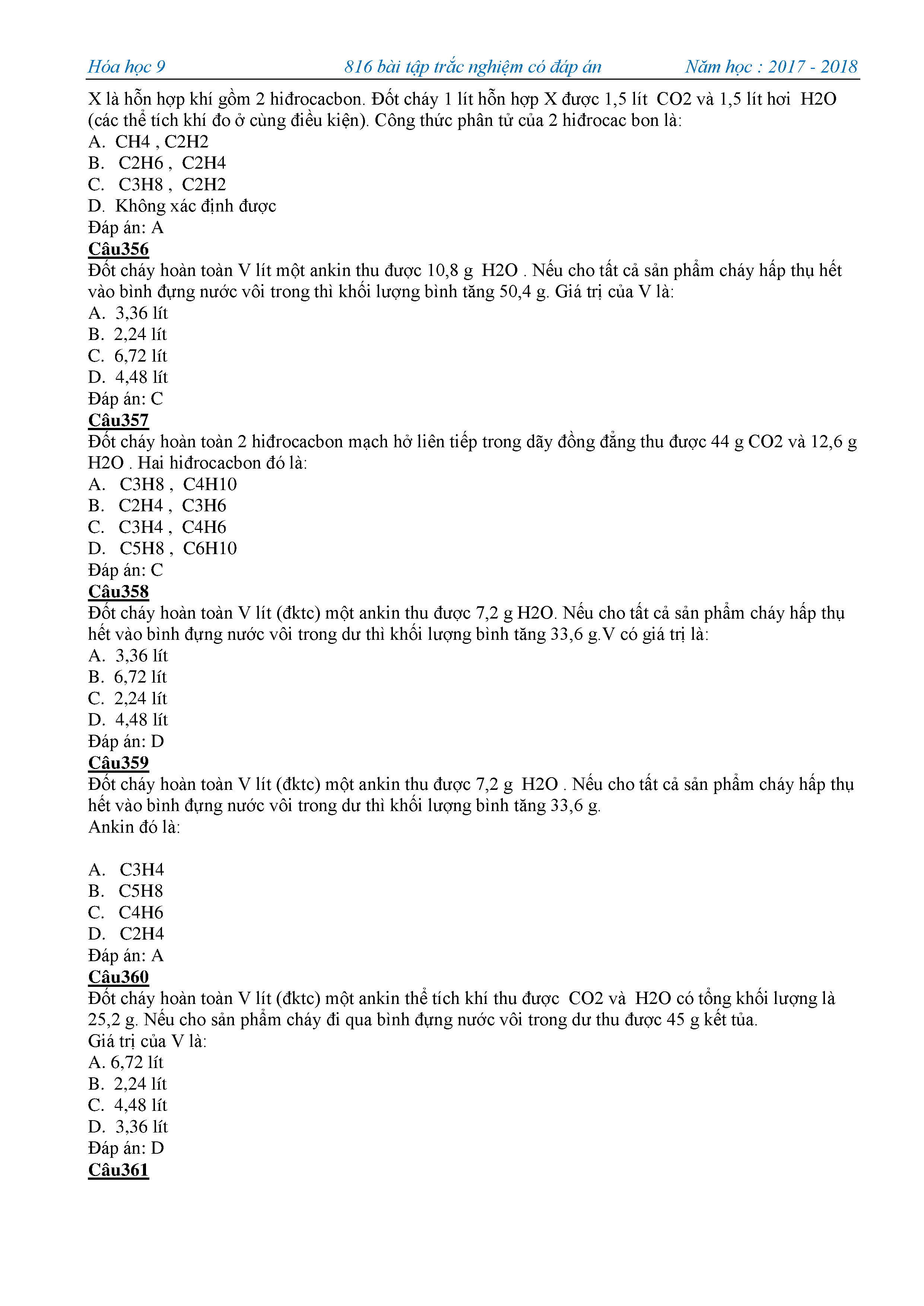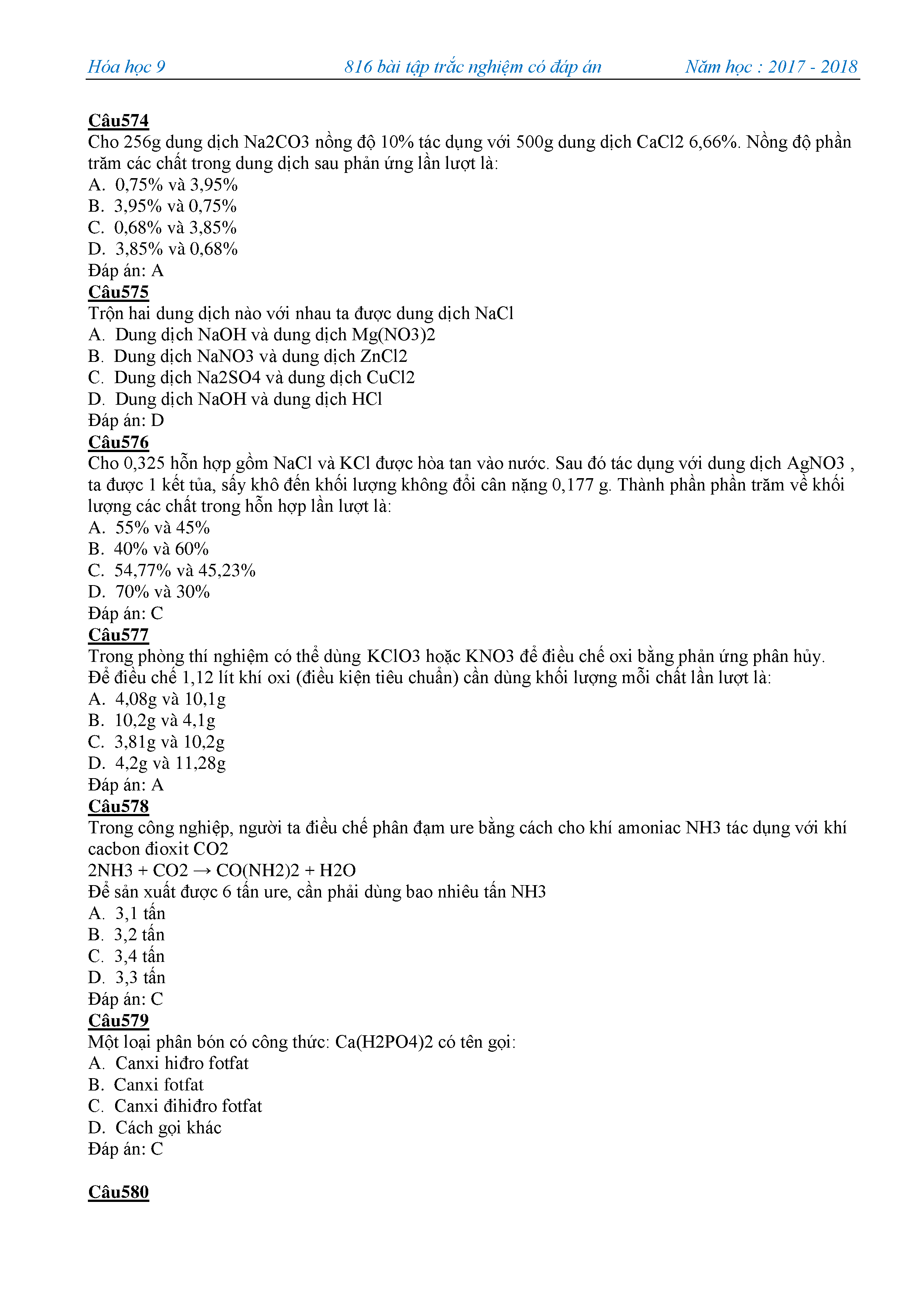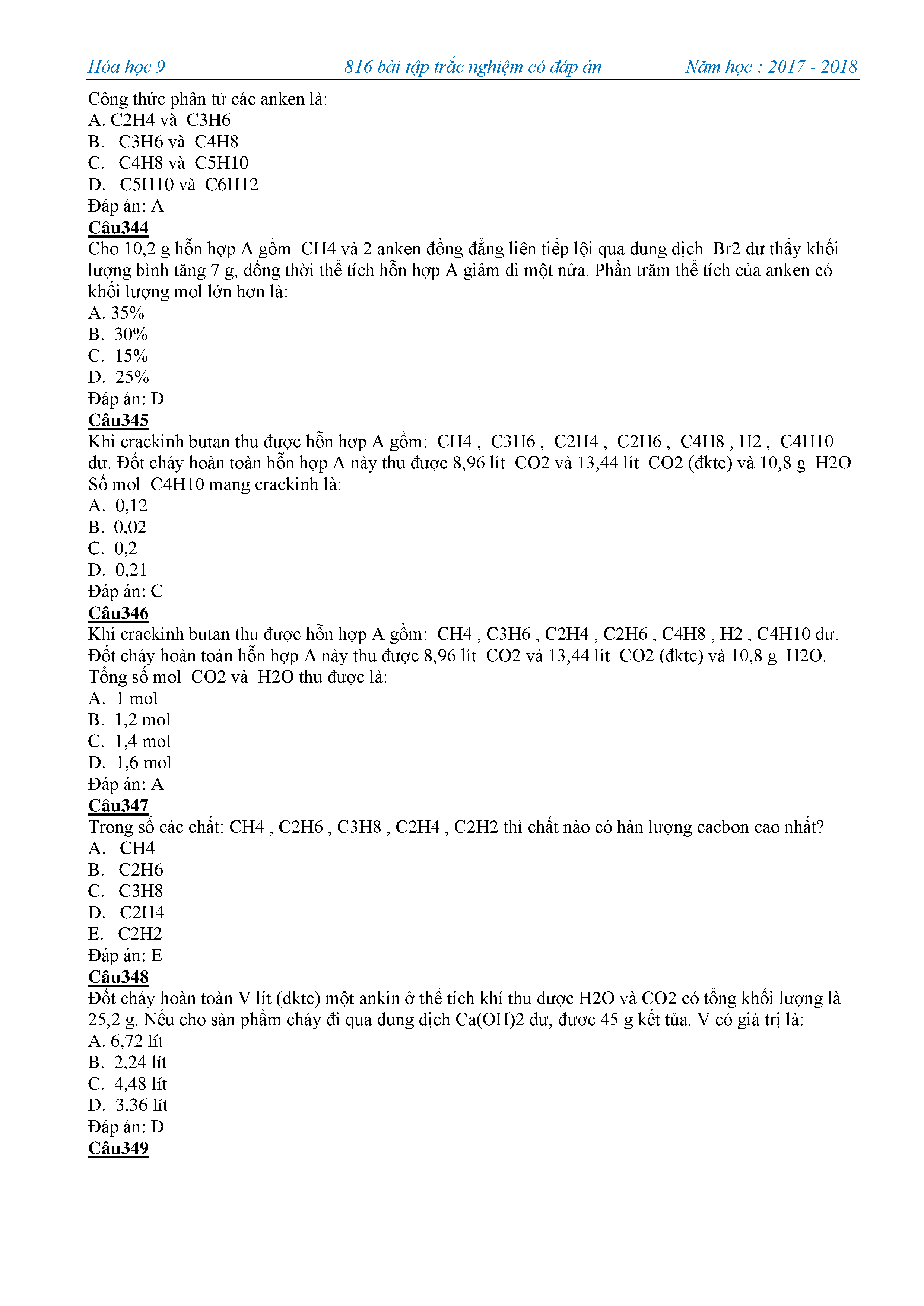 816 CÂU TRẮC NGHIỆM HÓA HỌC 9 (CÓ ĐÁP ÁN)